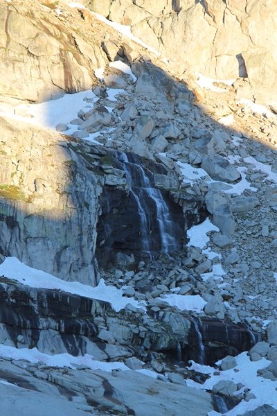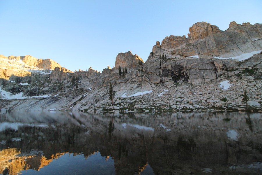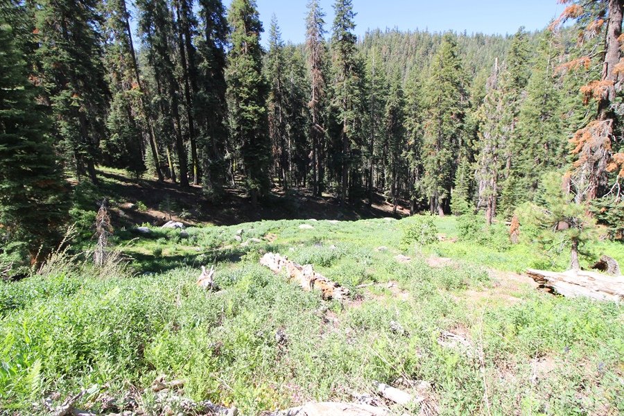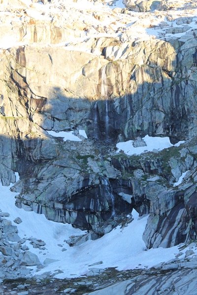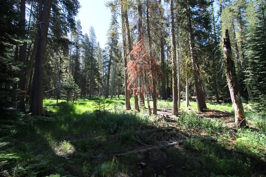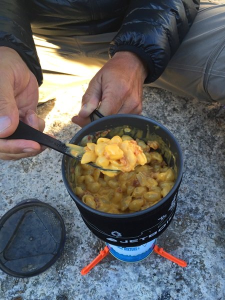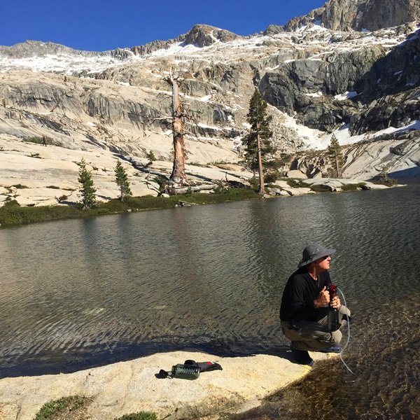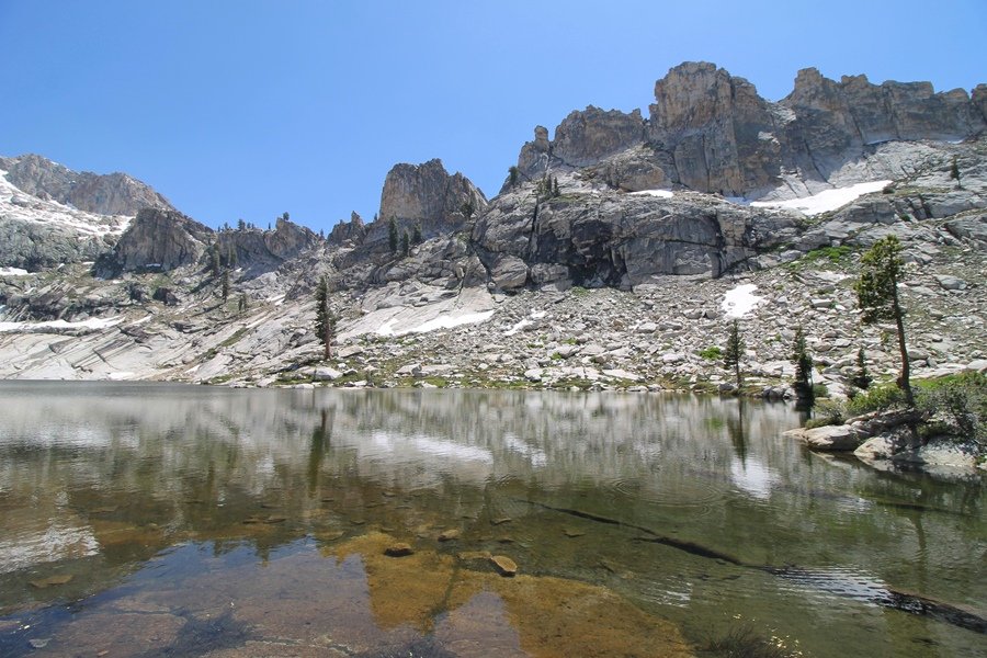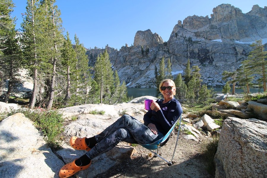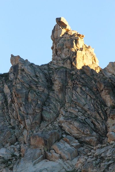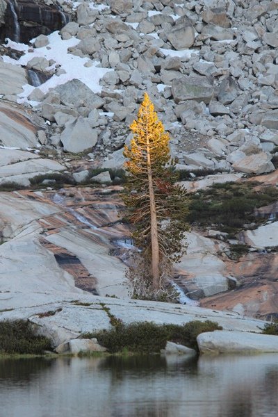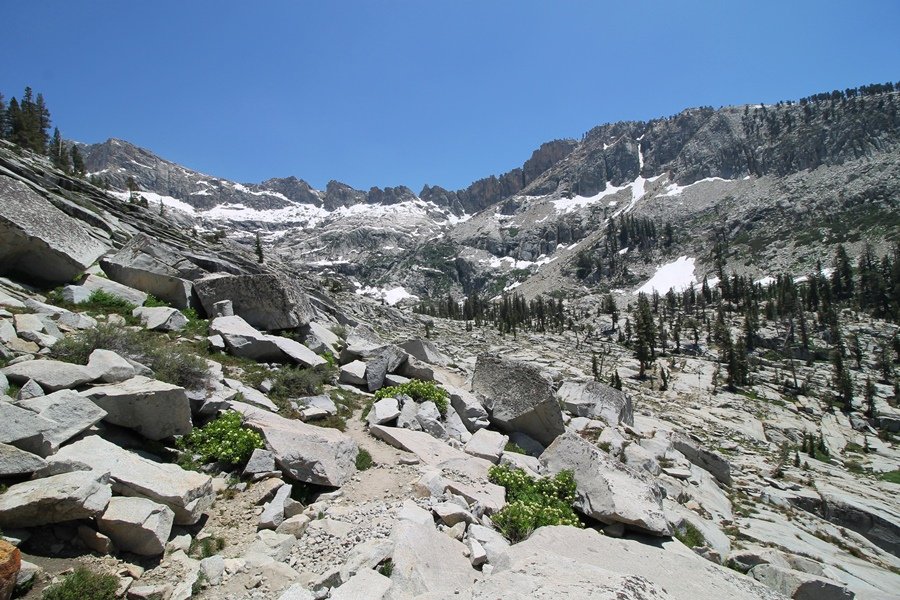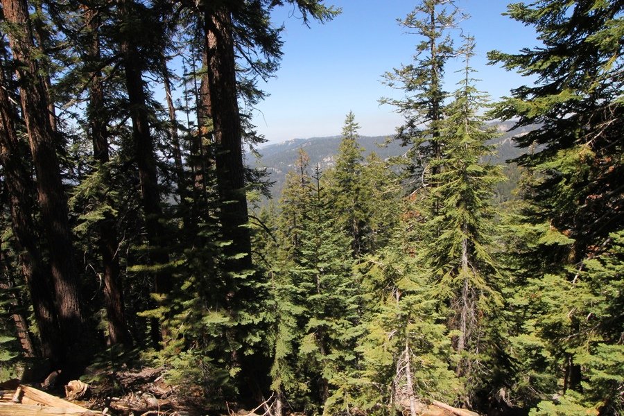 We’ve been hiking with full packs the past couple of months in preparation for our upcoming six-day backpack trip in Yosemite, and this particular weekend had long been slated for a shorter practice excursion, a shakedown cruise of sorts to prove out both our gear and our ability. We’ve had a wilderness permit since February to visit Little Lakes Valley near Bishop, but concerns about still-melting snow and associated clouds of mosquitos had us looking elsewhere for destinations. Pear Lake in Sequoia National Park has long been on our list of places to go, and it rather quickly sprung to the top of our list of possible trips for this weekend – since the park does not take permit reservations in advance for Pear Lake, we figured we could simply show up at the ranger station at first light Friday morning and not be at a disadvantage getting a last minute permit. So, after spending Thursday night in a pricey but convenient motel room in Three Rivers, we arrived at the Lodgepole visitor center at 6:15am Friday to find three other parties standing at the locked doors ahead of us – once the rangers opened up the facility at 7:00, we found out only one of those groups was headed to Pear Lake, and we got our permit without any trouble. By 8:30am, we were at the Wolverton trailhead and ready to head out. The Lakes trail heads east from Wolverton, first up a gentle ridgeline before bending southeast and climbing through the Panther Creek drainage. About two miles from Wolverton, the trail splits off northward, splitting again after a short distance into two parallel tracks, the left fork continuing north to a 1,000′-tall granite monolith called The Watchtower, the right fork climbing more earnestly eastward over The Hump, a ridge separating Panther Creek from the Heather Lake basin adjacent to the east – the two trails reunite at Heather Lake, which we had targeted as our likely lunch spot. Beyond Heather Lake, the trail ascends around another intervening ridge before dropping into the Emerald Lake cirque, then ascending again around a third ridge before making a final climb to Pear Lake at 9,500+’ – all told, the trail to Pear Lake is nominally 6.2 miles (although the Watchtower route adds about 0.3 miles to the total distance) with some 2,500′ of elevation gain. Leaving Wolverton, we immediately felt the increased weight of our packs – the additions of food and extra clothing meant both our packs were now over 30 lbs., and we necessarily shifted our respective loads around within the first half mile, leaving Jane with about 28 lbs. while Chris carried about 35. Luckily, the trail gradient is quite moderate over the first few miles through very pretty forest. There were lots of hikers on this popular trail, most folks with day packs who were going further up the Alta trail to Panther Gap or Mehrten Meadow located south and east of our turnoff up the Lakes trail. We passed a nonchalant doe grazing along the trail, entirely undisturbed by the curious bipeds wandering by – she must be used to us. After turning north, the Lakes trail steepens a bit as it gradually climbs for a mile, emerging after two short switchbacks at the top of The Watchtower – its rounded crown, which is a steep scramble from below the trail to the west, appears as just a minor outcropping, until one realizes the vertigo-inducing sheerness of the drop on its north and east sides. Some other hikers took our photo here, and it was one of the most photogenic spots of the whole hike – this trail closes whenever ice and snow are present, so it’s a must-do in the summer. We continued east and south, first along the clifftops and then across more moderate slopes into the Heather Lake basin – we ate our salami-and-cheese lunch admiring the reflection in the water of the mountains above. We had taken our time on this hike so far as it was about 12:30pm when we got to Heather Lake – leaving about 1pm, we went even slower up to Emerald Lake (the trail passes below the lake to the north, but the views over the smaller Aster Lake further down the basin are marvelous) before exiting that cirque northward and rounding the ridge into the Pear Lake bowl. Here, the views east opened up and the last few hundred yards, though tiring at the end of our long climb under heavy loads, were some of the most enjoyable of the day. Camping at Pear Lake is limited to the ten numbered sites only – four are located west of the lake’s outlet while the balance are on the far side. Stopping briefly near the outlet for pictures of the stunning scenery, we wandered past and found only one site already occupied – having been told by the rangers to expect a full campground, we were astonished that we were the first party to arrive that day, given our very slow pace, but that left us with a number of campsite choices. We found #8 most to our liking – the furthest east, we were separated from the other eastern sites by some large rocks, and yet had a nice view of the lake below and some connecting slabs down which we could walk for water (the vault toilets are also conveniently nearby). A ranger was in residence at the station a few hundred yards down the slope, and she came by to check our permit, noting that the pesky marmots has already gnawed the grips of our trekking poles which we had left laying against a log while we had scouted campsites – we made sure to hang our gear 3-4 feet off the ground after that. After setting up camp, we lounged for a bit before cooking our dinner of mac-and-cheese with bacon bits added – it was heavenly, no lie. As the sun set later in the evening, the alpenglow lit up the walls of the cirque behind our camp and the east side of the bowl to the south, making for a glorious display of color to close out the day. A wonderful Day One of three…