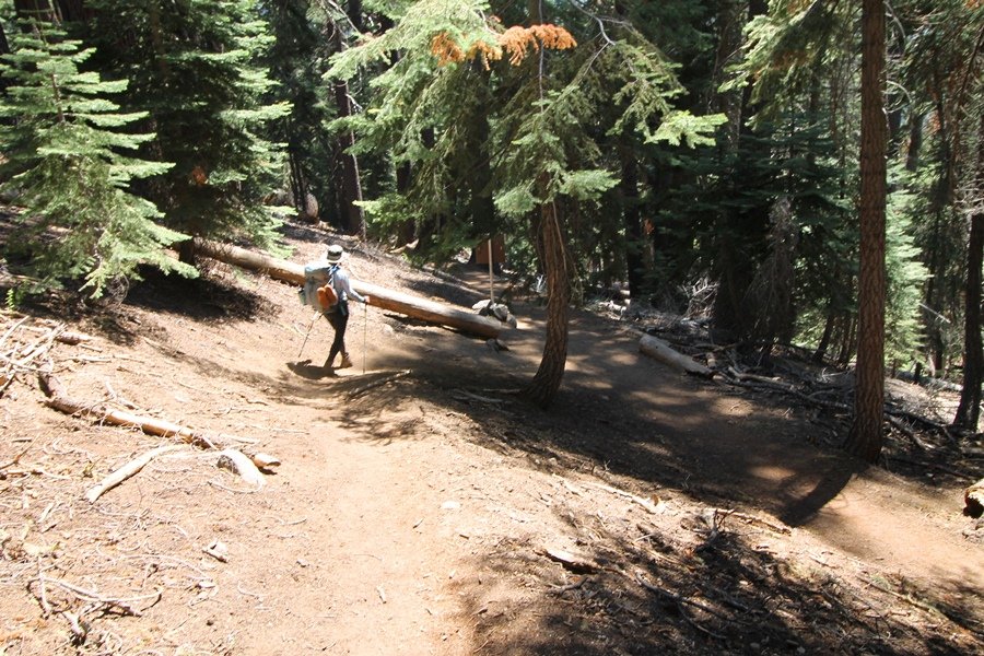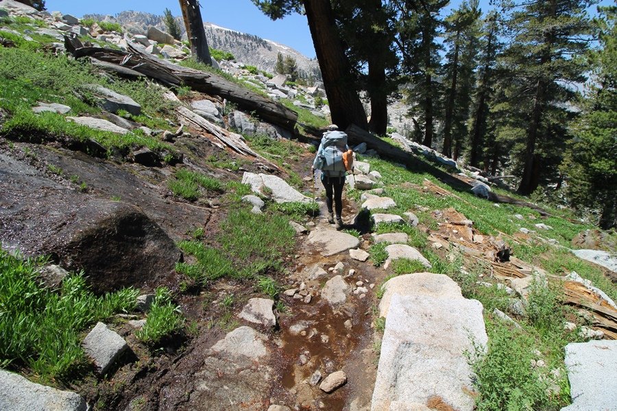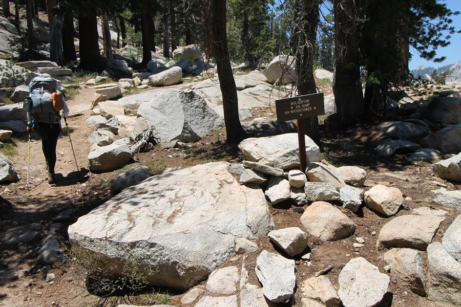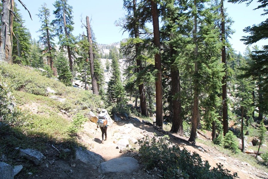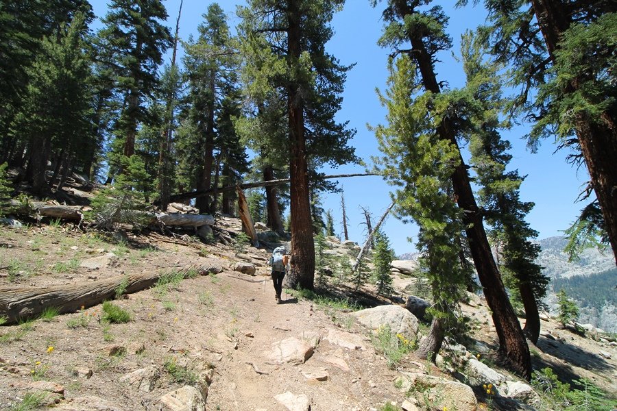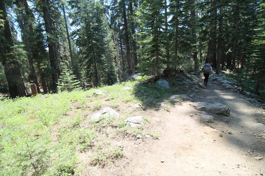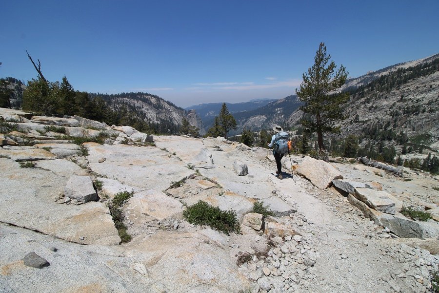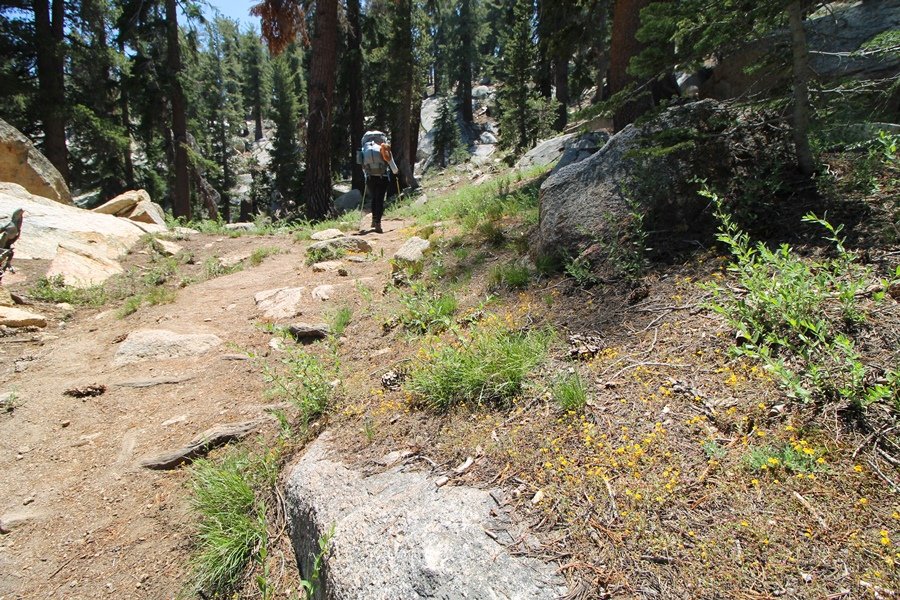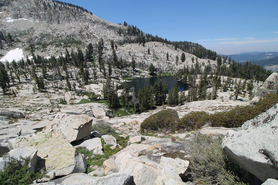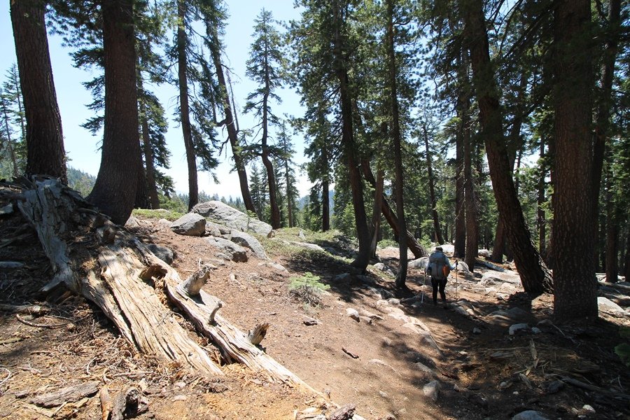 We’ve been gradually accumulating our backpacking gear over the last couple of years, and one of our first purchases we made were sleeping bags – they have down tops but synthetic bottoms, the idea being that down loses its insulating value when compressed whereas synthetics do so less. Our pads are lightweight air mattresses filled with fist sized holes and are designed for use inside one’s sleeping bag, again the idea being that the bottom insulation will loft through the holes and the pad will be as warm as the bag’s interior. Nice ideas, these, and we’re sure they work for some – however, they did not work well at all for us. Side sleepers we are, and our hips bottomed out through the pads unless we were on back or belly, and the thin synthetic undersides of our bags did not insulate well if, in our stirrings to find comfort on our pads, we exposed the bag bottoms to the nighttime air by twisting to any position but a horizontal plane. Long story short, both nights at Pear Lake were not at all comfortable, so now gear-junkie Chris has Jane’s approval to improve our sleep systems post-haste – a nice problem to have in the end. We took our time packing up camp, so long in fact that we were the last party to leave, save one other couple – taking some final photos at the water’s edge, we bade farewell to Pear Lake about 11:30am, proceeding north and west down the gentle grade and exiting the cirque. Our backs, of course, had been to the west on our way up Friday, and it was striking to see the western views now to our front – we had similar vistas yesterday on our way back from Moose Lake, but these seemed much more up-close-and-personal. We followed the trail as it rounded Pear Lake bowl’s west ridge, dropping southward into the Emerald Lake basin and exactly retracing our steps eastward from Friday afternoon. We passed a handful of day hikers and two backpackers heading up to Pear, and we soon found ourselves at Heather Lake again – we had planned only energy bars for lunch and we considered stopping at Heather to eat, but, once there, we met an eastbound solo hiker who reported seeing two bears on the trail near Wolverton. That news put Jane on high alert and killed her appetite, so we kept going, choosing to follow The Hump trail back west out of the Heather Lake basin. This trail, although lacking the grand views of The Watchtower trail, offered plenty of shady forest to walk through – the gradient on the west side of The Hump, however, was steep enough going downhill that we were happy we had chosen The Watchtower trail as our eastbound, uphill route. Other than being on bear alert, the trip west passed without much sensation – we crossed a spring-fed creek before dropping further south down the mountain, and we took an extended break and ate our light lunch at the edge of some large open meadows. Resuming our walk, we dropped further down, crossing another creek and rejoining The Watchtower trail – now on familiar ground, we picked up the pace a bit and finished the trip back to Wolverton without seeing any wildlife at all, much less any bears. Despite the sleep deprivation, our first backpack trip together was a great success – Jane got to visit some of the remote alpine country to which it’s really quite difficult to day hike, and we both completely enjoyed the experience of hanging out in the high country, cooking our simple meals and taking in the stunning scenery. A couple of our pack items are not worth the weight and will not be making any weekend trips in the future, namely our battery pack (device batteries easily lasted all weekend and did not require recharging), extra food that we didn’t eat, and a paperback book we brought but didn’t read. That said, a couple of other items were well worth their weight – our Alite Monarch chairs (a pound apiece) were awesome to have in camp, our Crocs were super-comfortable, lightweight but durable camp shoes (Jane’s been wearing them for years, but Chris is a more recent convert), and our Snow Peak titanium double-wall cups kept coffee hot for 45 minutes on 45 degree mornings. We’re already talking about adding another weekend trip to our summer itinerary, so hopefully we’ll have much more to write about here in the near future. In any event, we can attest to how Pear Lake stands out as a wonderful destination, whether visited by longtime trekkers or newbies – a fantastic trip.