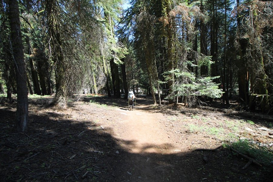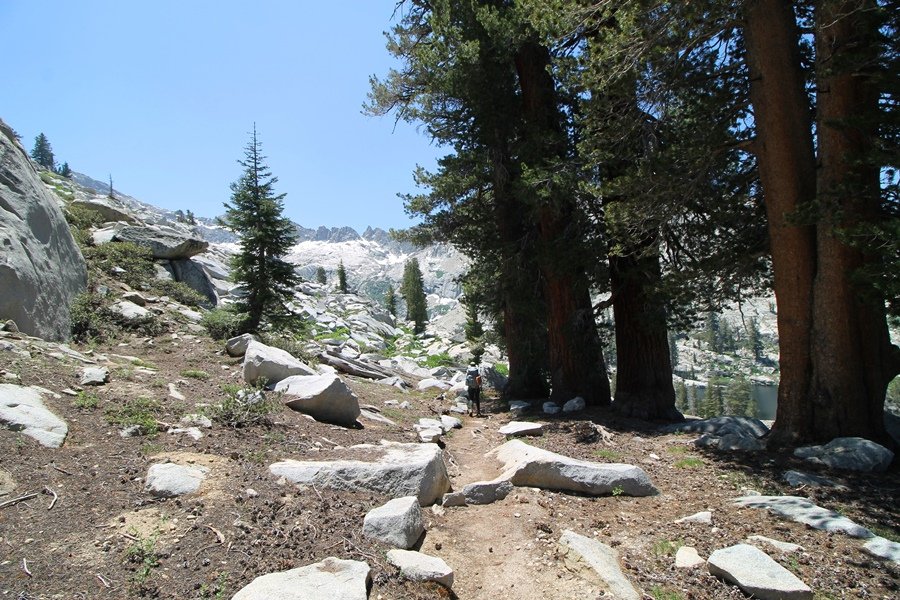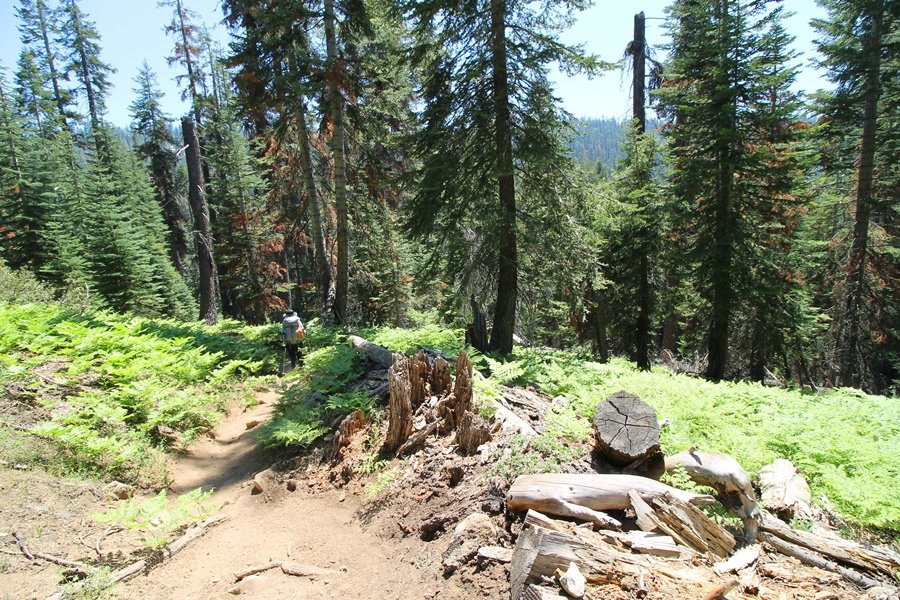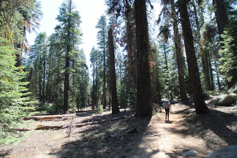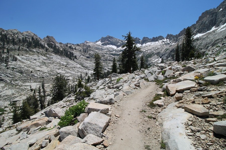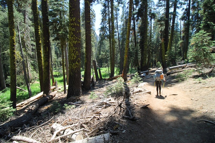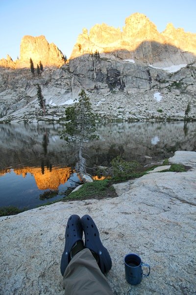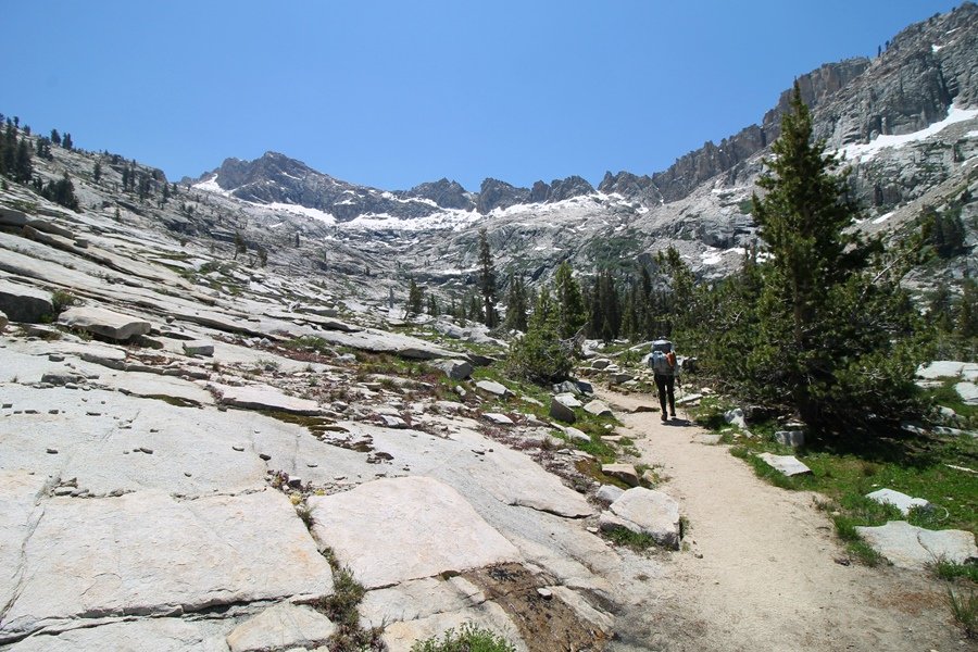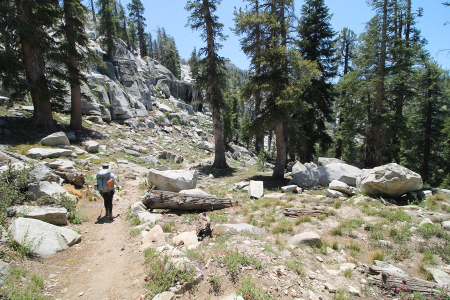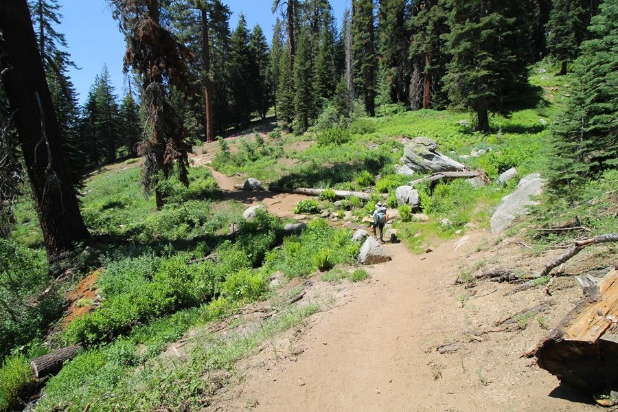 We’ve been gradually accumulating our backpacking gear over the last couple of years, and one of our first purchases we made were sleeping bags – they have down tops but synthetic bottoms, the idea being that down loses its insulating value when compressed whereas synthetics do so less. Our pads are lightweight air mattresses filled with fist sized holes and are designed for use inside one’s sleeping bag, again the idea being that the bottom insulation will loft through the holes and the pad will be as warm as the bag’s interior. Nice ideas, these, and we’re sure they work for some – however, they did not work well at all for us. Side sleepers we are, and our hips bottomed out through the pads unless we were on back or belly, and the thin synthetic undersides of our bags did not insulate well if, in our stirrings to find comfort on our pads, we exposed the bag bottoms to the nighttime air by twisting to any position but a horizontal plane. Long story short, both nights at Pear Lake were not at all comfortable, so now gear-junkie Chris has Jane’s approval to improve our sleep systems post-haste – a nice problem to have in the end. We took our time packing up camp, so long in fact that we were the last party to leave, save one other couple – taking some final photos at the water’s edge, we bade farewell to Pear Lake about 11:30am, proceeding north and west down the gentle grade and exiting the cirque. Our backs, of course, had been to the west on our way up Friday, and it was striking to see the western views now to our front – we had similar vistas yesterday on our way back from Moose Lake, but these seemed much more up-close-and-personal. We followed the trail as it rounded Pear Lake bowl’s west ridge, dropping southward into the Emerald Lake basin and exactly retracing our steps eastward from Friday afternoon. We passed a handful of day hikers and two backpackers heading up to Pear, and we soon found ourselves at Heather Lake again – we had planned only energy bars for lunch and we considered stopping at Heather to eat, but, once there, we met an eastbound solo hiker who reported seeing two bears on the trail near Wolverton. That news put Jane on high alert and killed her appetite, so we kept going, choosing to follow The Hump trail back west out of the Heather Lake basin. This trail, although lacking the grand views of The Watchtower trail, offered plenty of shady forest to walk through – the gradient on the west side of The Hump, however, was steep enough going downhill that we were happy we had chosen The Watchtower trail as our eastbound, uphill route. Other than being on bear alert, the trip west passed without much sensation – we crossed a spring-fed creek before dropping further south down the mountain, and we took an extended break and ate our light lunch at the edge of some large open meadows. Resuming our walk, we dropped further down, crossing another creek and rejoining The Watchtower trail – now on familiar ground, we picked up the pace a bit and finished the trip back to Wolverton without seeing any wildlife at all, much less any bears. Despite the sleep deprivation, our first backpack trip together was a great success – Jane got to visit some of the remote alpine country to which it’s really quite difficult to day hike, and we both completely enjoyed the experience of hanging out in the high country, cooking our simple meals and taking in the stunning scenery. A couple of our pack items are not worth the weight and will not be making any weekend trips in the future, namely our battery pack (device batteries easily lasted all weekend and did not require recharging), extra food that we didn’t eat, and a paperback book we brought but didn’t read. That said, a couple of other items were well worth their weight – our Alite Monarch chairs (a pound apiece) were awesome to have in camp, our Crocs were super-comfortable, lightweight but durable camp shoes (Jane’s been wearing them for years, but Chris is a more recent convert), and our Snow Peak titanium double-wall cups kept coffee hot for 45 minutes on 45 degree mornings. We’re already talking about adding another weekend trip to our summer itinerary, so hopefully we’ll have much more to write about here in the near future. In any event, we can attest to how Pear Lake stands out as a wonderful destination, whether visited by longtime trekkers or newbies – a fantastic trip.