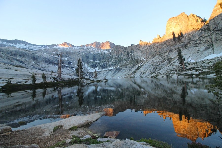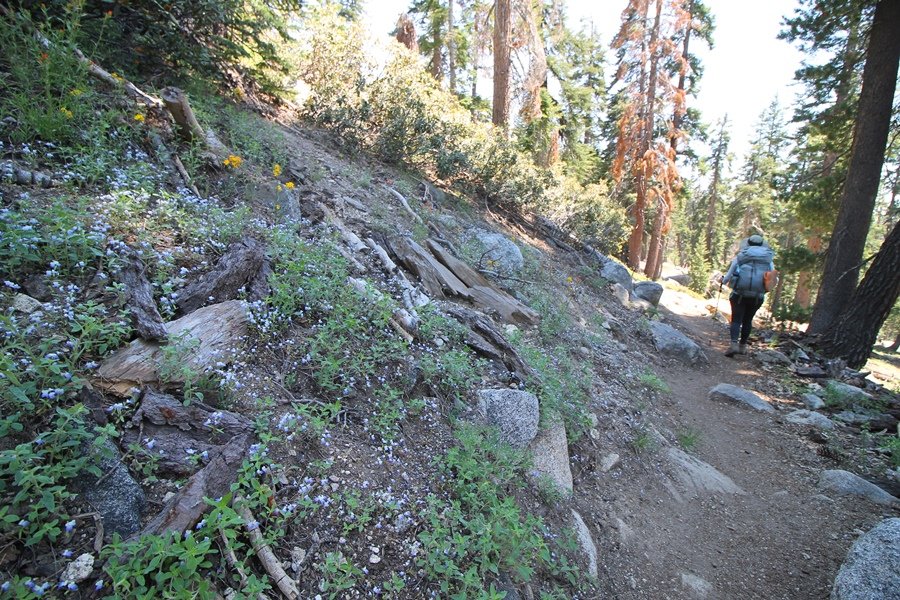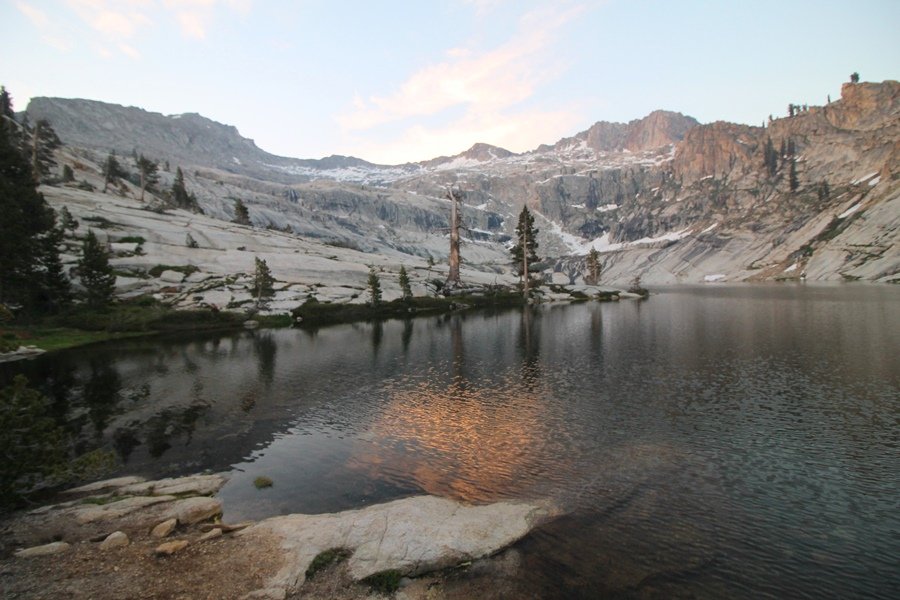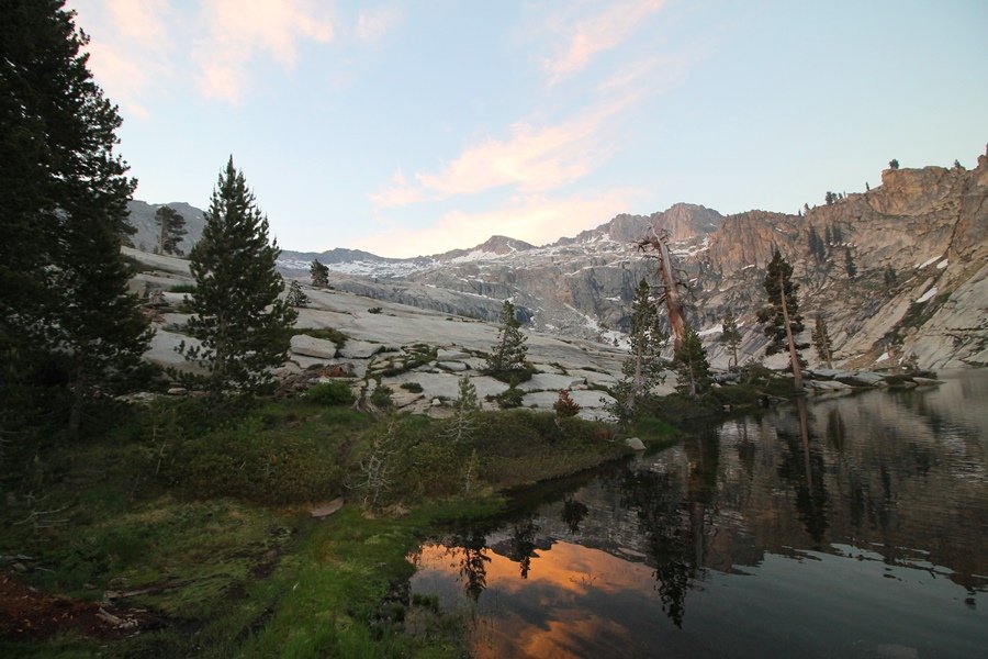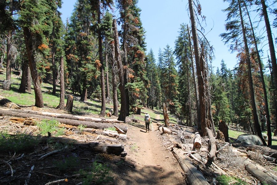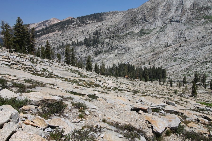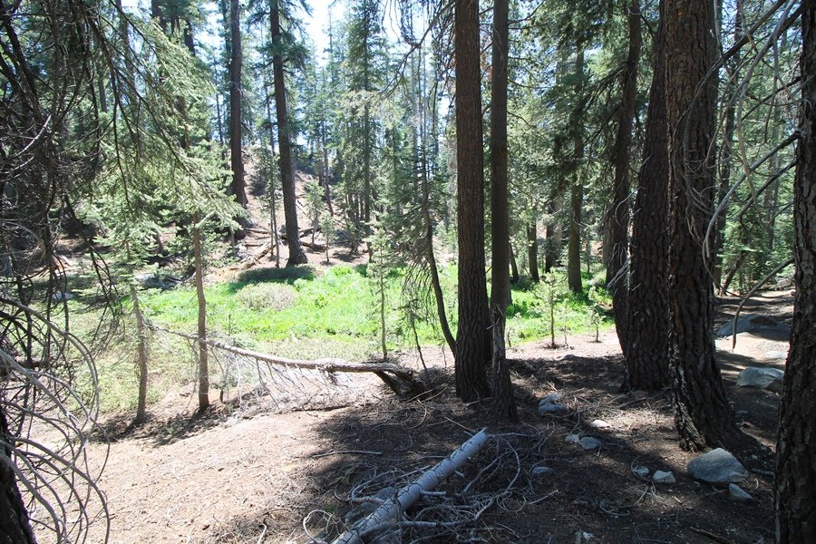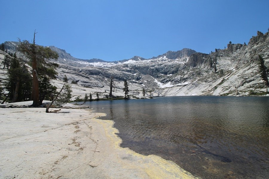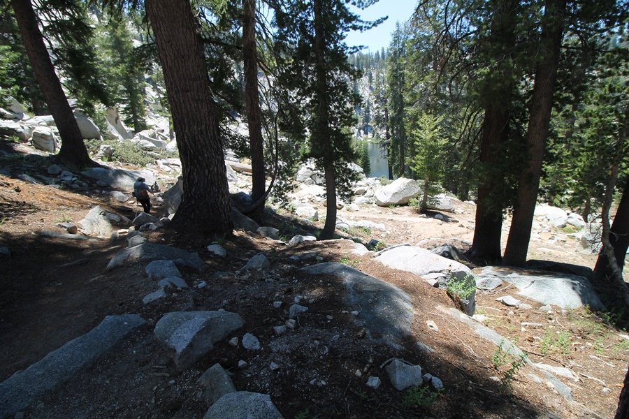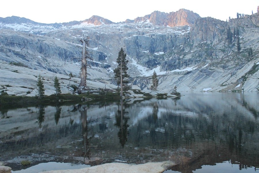 We’ve been gradually accumulating our backpacking gear over the last couple of years, and one of our first purchases we made were sleeping bags – they have down tops but synthetic bottoms, the idea being that down loses its insulating value when compressed whereas synthetics do so less. Our pads are lightweight air mattresses filled with fist sized holes and are designed for use inside one’s sleeping bag, again the idea being that the bottom insulation will loft through the holes and the pad will be as warm as the bag’s interior. Nice ideas, these, and we’re sure they work for some – however, they did not work well at all for us. Side sleepers we are, and our hips bottomed out through the pads unless we were on back or belly, and the thin synthetic undersides of our bags did not insulate well if, in our stirrings to find comfort on our pads, we exposed the bag bottoms to the nighttime air by twisting to any position but a horizontal plane. Long story short, both nights at Pear Lake were not at all comfortable, so now gear-junkie Chris has Jane’s approval to improve our sleep systems post-haste – a nice problem to have in the end. We took our time packing up camp, so long in fact that we were the last party to leave, save one other couple – taking some final photos at the water’s edge, we bade farewell to Pear Lake about 11:30am, proceeding north and west down the gentle grade and exiting the cirque. Our backs, of course, had been to the west on our way up Friday, and it was striking to see the western views now to our front – we had similar vistas yesterday on our way back from Moose Lake, but these seemed much more up-close-and-personal. We followed the trail as it rounded Pear Lake bowl’s west ridge, dropping southward into the Emerald Lake basin and exactly retracing our steps eastward from Friday afternoon. We passed a handful of day hikers and two backpackers heading up to Pear, and we soon found ourselves at Heather Lake again – we had planned only energy bars for lunch and we considered stopping at Heather to eat, but, once there, we met an eastbound solo hiker who reported seeing two bears on the trail near Wolverton. That news put Jane on high alert and killed her appetite, so we kept going, choosing to follow The Hump trail back west out of the Heather Lake basin. This trail, although lacking the grand views of The Watchtower trail, offered plenty of shady forest to walk through – the gradient on the west side of The Hump, however, was steep enough going downhill that we were happy we had chosen The Watchtower trail as our eastbound, uphill route. Other than being on bear alert, the trip west passed without much sensation – we crossed a spring-fed creek before dropping further south down the mountain, and we took an extended break and ate our light lunch at the edge of some large open meadows. Resuming our walk, we dropped further down, crossing another creek and rejoining The Watchtower trail – now on familiar ground, we picked up the pace a bit and finished the trip back to Wolverton without seeing any wildlife at all, much less any bears. Despite the sleep deprivation, our first backpack trip together was a great success – Jane got to visit some of the remote alpine country to which it’s really quite difficult to day hike, and we both completely enjoyed the experience of hanging out in the high country, cooking our simple meals and taking in the stunning scenery. A couple of our pack items are not worth the weight and will not be making any weekend trips in the future, namely our battery pack (device batteries easily lasted all weekend and did not require recharging), extra food that we didn’t eat, and a paperback book we brought but didn’t read. That said, a couple of other items were well worth their weight – our Alite Monarch chairs (a pound apiece) were awesome to have in camp, our Crocs were super-comfortable, lightweight but durable camp shoes (Jane’s been wearing them for years, but Chris is a more recent convert), and our Snow Peak titanium double-wall cups kept coffee hot for 45 minutes on 45 degree mornings. We’re already talking about adding another weekend trip to our summer itinerary, so hopefully we’ll have much more to write about here in the near future. In any event, we can attest to how Pear Lake stands out as a wonderful destination, whether visited by longtime trekkers or newbies – a fantastic trip.