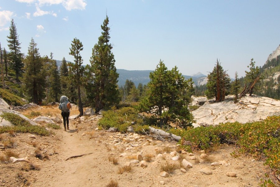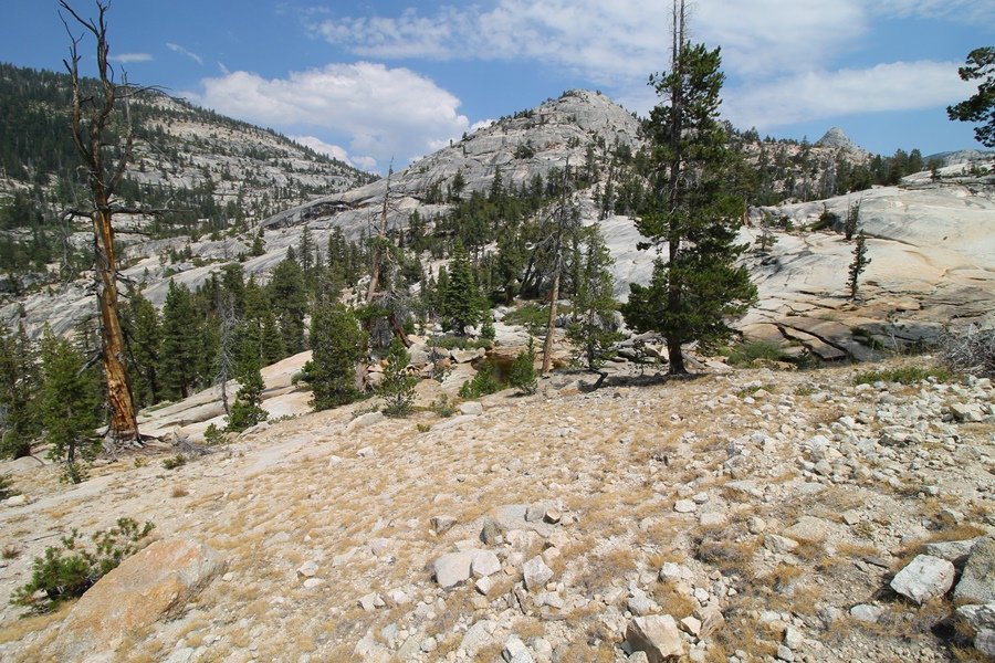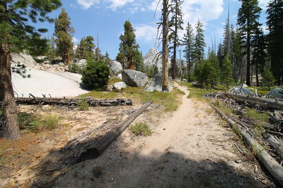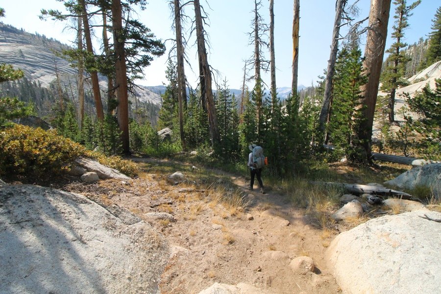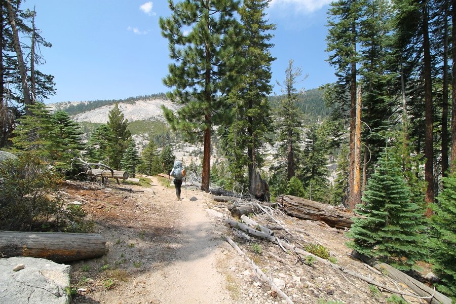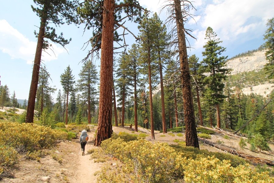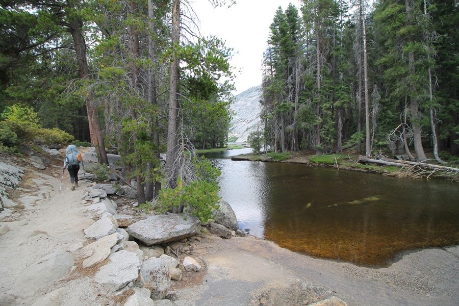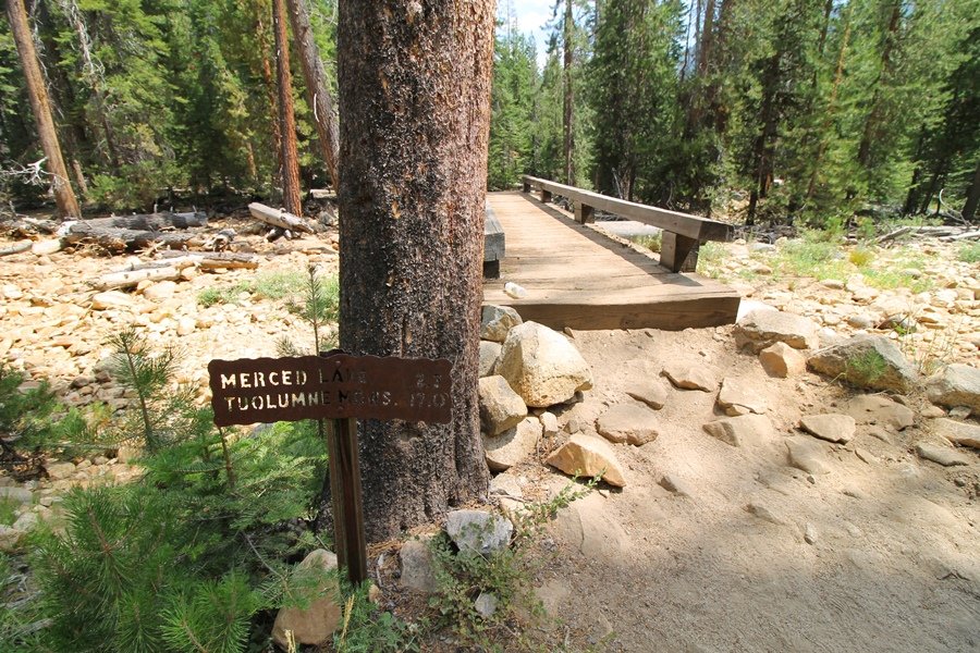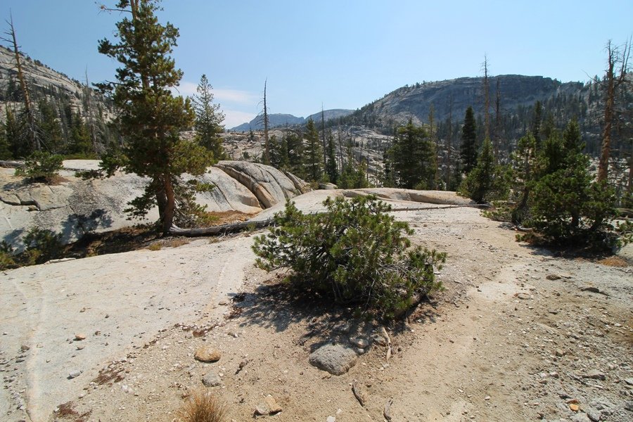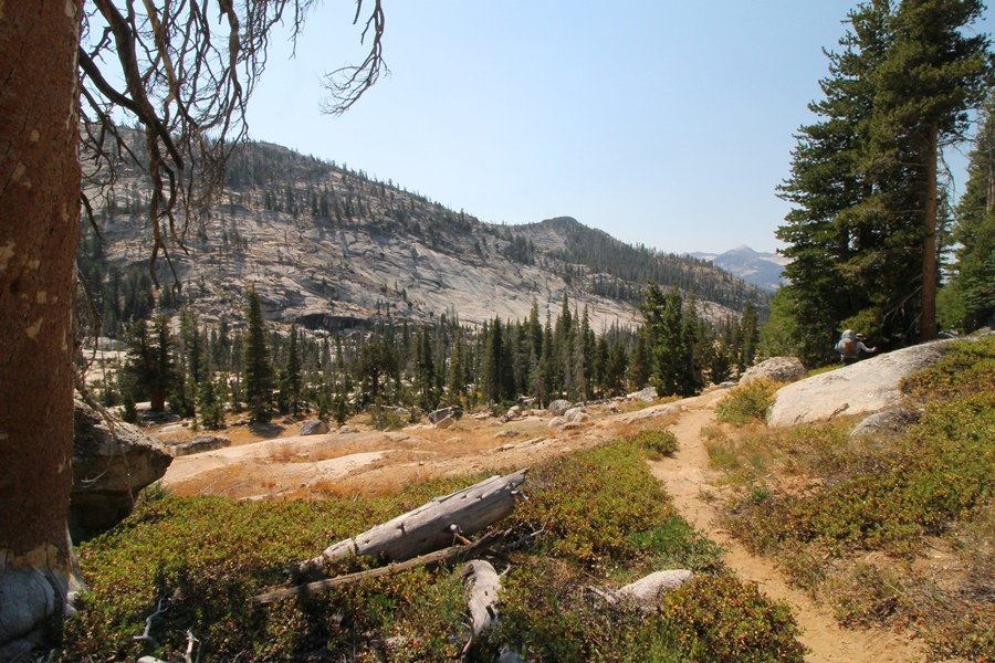 We again woke up pretty early, and we took advantage of our isolated camp site to start packing things up soon thereafter – so much for the best laid plans. As the sky started to brighten, we got up on some rocks above our home away from home for a clearer view of the meadow, expecting the sun to crest the shoulder of the dome to the east at any moment. Well, that process took nearly an hour from when we started watching it, leaving us about 30 minutes to pack up the balance of the camp before the breakfast call. It didn’t happen – we resigned ourselves to finishing our packing after breakfast, and we tromped our way up to the dining tent by about 7:15 to feast like kings. The latest fire news included a report that the flames had reached the easternmost end of the Wrightwood development, and at one point we got a report that a street near ours had burned – that turned out to be incorrect, thankfully, but we did in fact confirm that the flames had been stopped at the east edge of town. Our breakfast companions included a family from the San Diego area who were going to be hiking up the JMT and out to Tuolumne Meadows that day, and they offered to text the kids for us with a live report as they headed through Cajon Pass on their way home (which they in fact did). We ate a bit more lightly than we had at May Lake, mostly to get done earlier but also because we had a lot of ground to cover today. In our day-by-day plan, this was always going to be the longest single leg of the trip – we’d start at 9,300+’, head north on the JMT for about a mile, then east over a 200′-high ridge before dropping into Cathedral Fork canyon and losing over 2,500′ as we’d descend to the Merced River valley some 7+ miles distant. We’d head east up the river at that point, gaining another 250′ over two miles to the Merced Lake HSC – at 10+ miles total, it figured to be a long day. So, we hastily finished packing and left Sunrise by just after 9am, walking briskly (well, as briskly as our sore bodies would allow, which wasn’t really very brisk) east and then north on one of two single-mile segments of the John Muir Trail our route would share (the second would be in Lyell Canyon on our last day). The meadow was beautiful in the sunny-mid-morning and the level walking very easy – just what we needed after yesterday’s brutal climbing. That ended far too soon, for we quickly reached our turnoff and headed east, right away beginning to ascend the ridge separating Long Meadow from the Cathedral Fork drainage. The hike up the incline was cool and pretty, shadows and light comingling on the trail – although we paused a couple of times to rest, this segment was quite enjoyable. Once over the top, things got way more sunny and increasingly warm – the heat may well have been on the oppressive side were it not for a fairly steady breeze that blew up the valley all day long to cool us off. We’ve long considered downhills to be, in general, more difficult than uphills, and even more so under full loads. Having learned our lesson on water management on the way to May Lake (we had both run out of water within a 1/2-mile finishing that day), we both carried our full 3-liter complement today (about 6-1/2 lbs. each to start), and our steps weighed heavily on the trail as soon as we crested the ridge and entered Cathedral Fork canyon. It’s not that the gradient was too steep, for it’s quite gentle most places – however, seven miles of steady descent wears on the feet, always bearing not just the body’s weight but the forces of gravity and forward momentum. About halfway down the canyon, we would reach the first of three bridges across the Cathedral Fork of Echo Creek – our idea was to stop for 30 minutes at the first bridge and soak our feet while eating a snack, then doing the same at the last bridge at the end of the descent where we’d eat lunch, thus being rested for the gentle but continuous push eastward to Merced Lake. As we walked through the canyon, we noticed a high, thin dome on the canyon’s west wall that was unnamed on the map – we later decided to name such features for our grandsons, so that promontory has since been christened Jude’s Dome (maybe he’ll climb it someday). Passing below it, we dropped more sharply into a flat, wooded section that was immediately followed by a burn – the stark tree trunks were a somewhat somber reminder of the situation in Wrightwood (we had been talking about how, if indeed our cabin burned, we’d only be out our vacation/retirement home, but what about the 5,000 people who live there fulltime? – deep, sobering thoughts). We found our first bridge shortly after the burned area, but there was not very much water here – Jane proposed continuing to the next one, which we did. However, once we got there, we were kind of in the same “let’s get this hike over with” mode and, despite the burning sensations in all four of our feet, we decided to keep going to the third, especially since there was more water here. We had by this time lost enough elevation that the forest had changed dramatically – gone were the lodgepoles and tundra-like grasses of the high country, replaced by chinquapin, manzanita, and ponderosa pines. The ponderosas, in particular, were quite impressive, very tall and with massive bases. Past the second bridge, the descent eases a bit through a traverse west to a junction with a connector trail leading further west to the JMT – we would turn south here, losing another 500′ before reaching the Merced River in the valley below. That section, in fact, was about as bad as we had expected – another steep series of stair-stepped switchbacks, and our feet felt twice as bad by the time we hit the bottom of the grade. There in front of us was the third bridge, but there was not a drop of water in sight – crazy. We stopped here anyway and ate our lunch (which, by the way, were made to order each morning by t