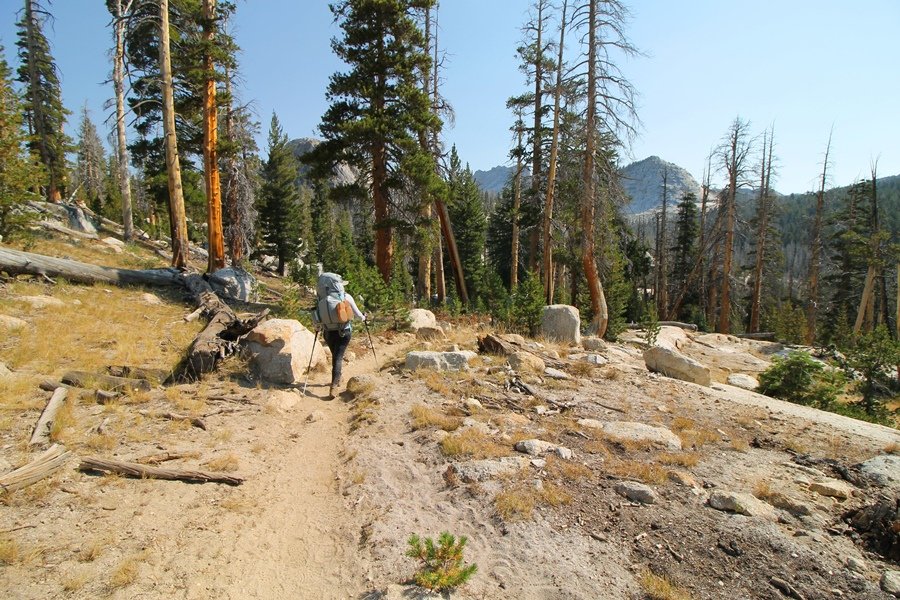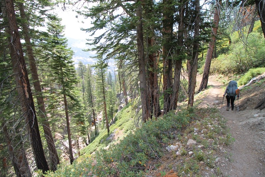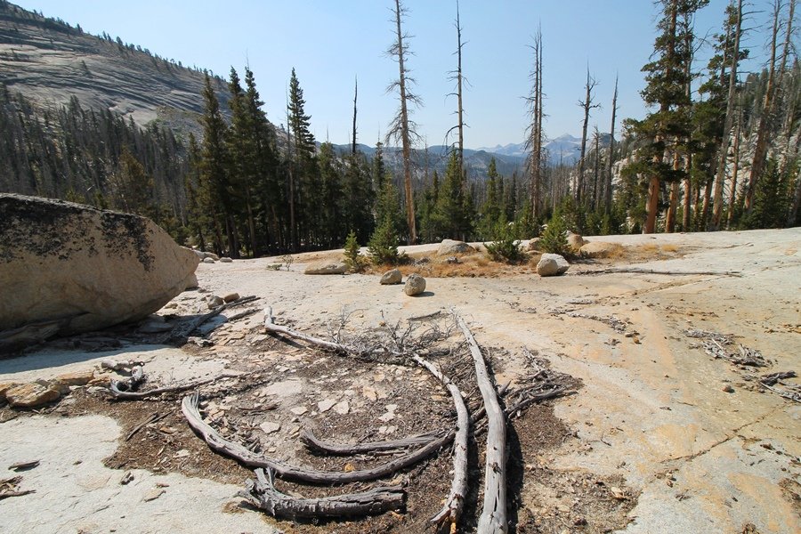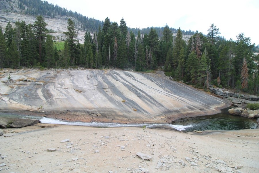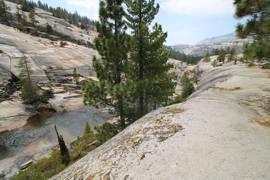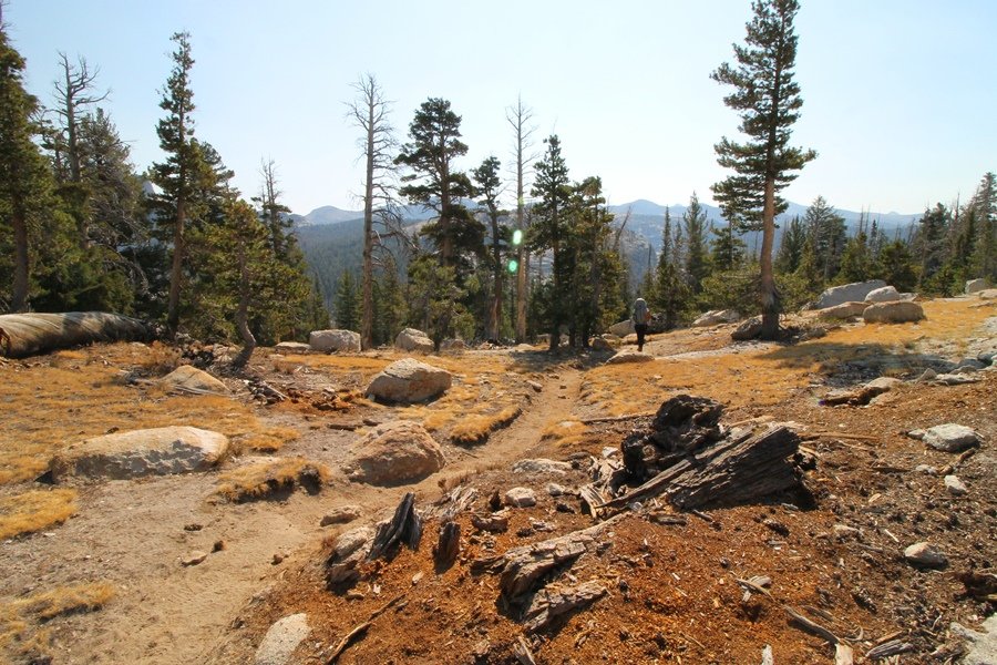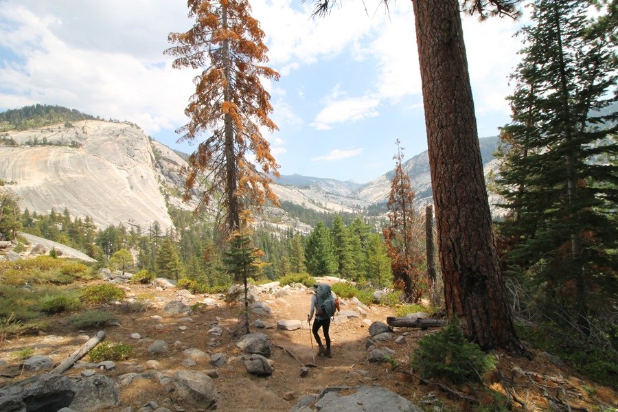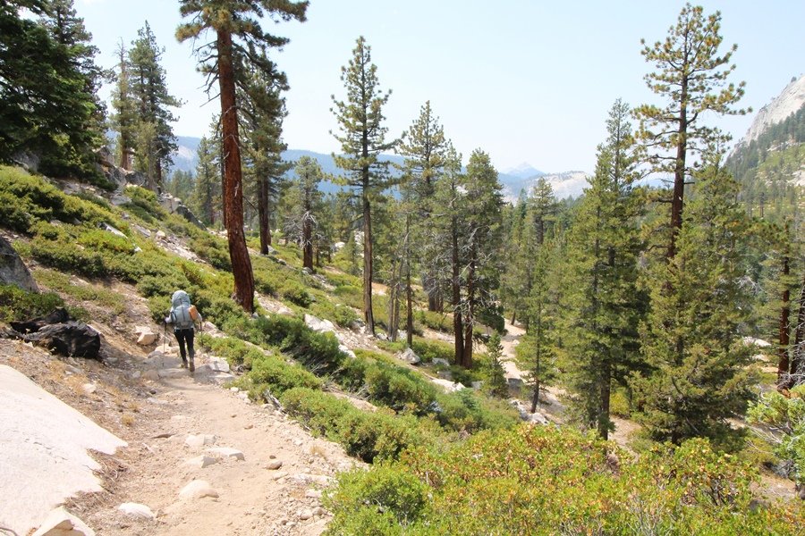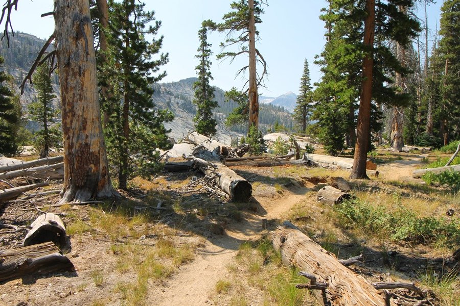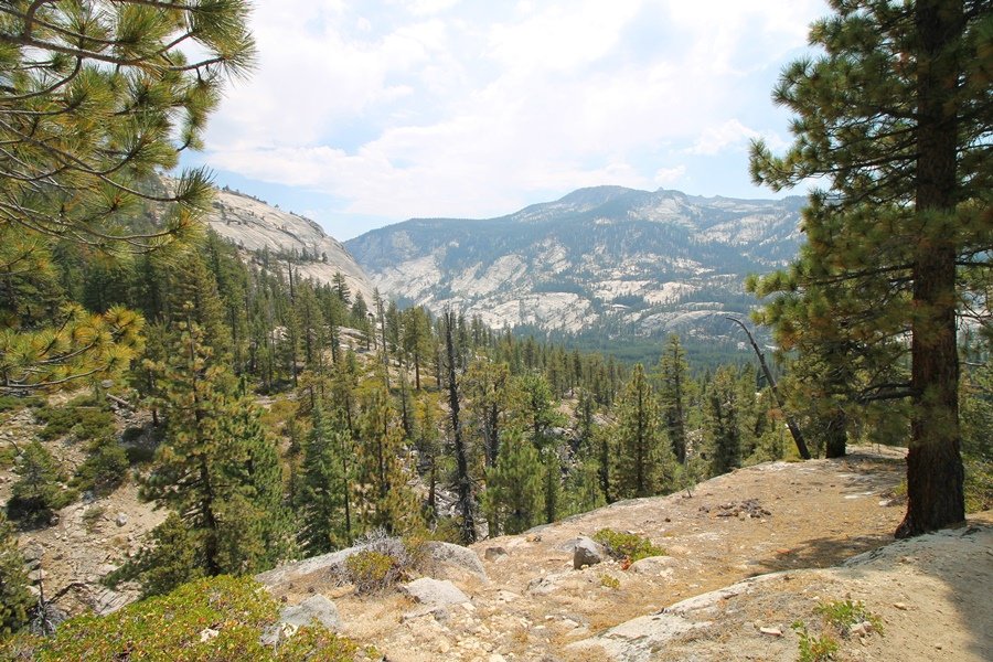We again woke up pretty early, and we took advantage of our isolated camp site to start packing things up soon thereafter – so much for the best laid plans. As the sky started to brighten, we got up on some rocks above our home away from home for a clearer view of the meadow, expecting the sun to crest the shoulder of the dome to the east at any moment. Well, that process took nearly an hour from when we started watching it, leaving us about 30 minutes to pack up the balance of the camp before the breakfast call. It didn’t happen – we resigned ourselves to finishing our packing after breakfast, and we tromped our way up to the dining tent by about 7:15 to feast like kings. The latest fire news included a report that the flames had reached the easternmost end of the Wrightwood development, and at one point we got a report that a street near ours had burned – that turned out to be incorrect, thankfully, but we did in fact confirm that the flames had been stopped at the east edge of town. Our breakfast companions included a family from the San Diego area who were going to be hiking up the JMT and out to Tuolumne Meadows that day, and they offered to text the kids for us with a live report as they headed through Cajon Pass on their way home (which they in fact did). We ate a bit more lightly than we had at May Lake, mostly to get done earlier but also because we had a lot of ground to cover today. In our day-by-day plan, this was always going to be the longest single leg of the trip – we’d start at 9,300+’, head north on the JMT for about a mile, then east over a 200′-high ridge before dropping into Cathedral Fork canyon and losing over 2,500′ as we’d descend to the Merced River valley some 7+ miles distant. We’d head east up the river at that point, gaining another 250′ over two miles to the Merced Lake HSC – at 10+ miles total, it figured to be a long day. So, we hastily finished packing and left Sunrise by just after 9am, walking briskly (well, as briskly as our sore bodies would allow, which wasn’t really very brisk) east and then north on one of two single-mile segments of the John Muir Trail our route would share (the second would be in Lyell Canyon on our last day). The meadow was beautiful in the sunny-mid-morning and the level walking very easy – just what we needed after yesterday’s brutal climbing. That ended far too soon, for we quickly reached our turnoff and headed east, right away beginning to ascend the ridge separating Long Meadow from the Cathedral Fork drainage. The hike up the incline was cool and pretty, shadows and light comingling on the trail – although we paused a couple of times to rest, this segment was quite enjoyable. Once over the top, things got way more sunny and increasingly warm – the heat may well have been on the oppressive side were it not for a fairly steady breeze that blew up the valley all day long to cool us off. We’ve long considered downhills to be, in general, more difficult than uphills, and even more so under full loads. Having learned our lesson on water management on the way to May Lake (we had both run out of water within a 1/2-mile finishing that day), we both carried our full 3-liter complement today (about 6-1/2 lbs. each to start), and our steps weighed heavily on the trail as soon as we crested the ridge and entered Cathedral Fork canyon. It’s not that the gradient was too steep, for it’s quite gentle most places – however, seven miles of steady descent wears on the feet, always bearing not just the body’s weight but the forces of gravity and forward momentum. About halfway down the canyon, we would reach the first of three bridges across the Cathedral Fork of Echo Creek – our idea was to stop for 30 minutes at the first bridge and soak our feet while eating a snack, then doing the same at the last bridge at the end of the descent where we’d eat lunch, thus being rested for the gentle but continuous push eastward to Merced Lake. As we walked through the canyon, we noticed a high, thin dome on the canyon’s west wall that was unnamed on the map – we later decided to name such features for our grandsons, so that promontory has since been christened Jude’s Dome (maybe he’ll climb it someday). Passing below it, we dropped more sharply into a flat, wooded section that was immediately followed by a burn – the stark tree trunks were a somewhat somber reminder of the situation in Wrightwood (we had been talking about how, if indeed our cabin burned, we’d only be out our vacation/retirement home, but what about the 5,000 people who live there fulltime? – deep, sobering thoughts). We found our first bridge shortly after the burned area, but there was not very much water here – Jane proposed continuing to the next one, which we did. However, once we got there, we were kind of in the same “let’s get this hike over with” mode and, despite the burning sensations in all four of our feet, we decided to keep going to the third, especially since there was more water here. We had by this time lost enough elevation that the forest had changed dramatically – gone were the lodgepoles and tundra-like grasses of the high country, replaced by chinquapin, manzanita, and ponderosa pines. The ponderosas, in particular, were quite impressive, very tall and with massive bases. Past the second bridge, the descent eases a bit through a traverse west to a junction with a connector trail leading further west to the JMT – we would turn south here, losing another 500′ before reaching the Merced River in the valley below. That section, in fact, was about as bad as we had expected – another steep series of stair-stepped switchbacks, and our feet felt twice as bad by the time we hit the bottom of the grade. There in front of us was the third bridge, but there was not a drop of water in sight – crazy. We stopped here anyway and ate our lunch (which, by the way, were made to order each morning by t