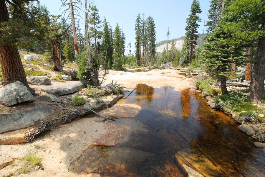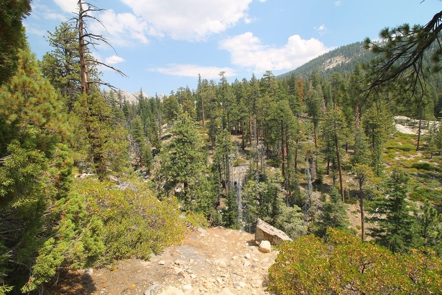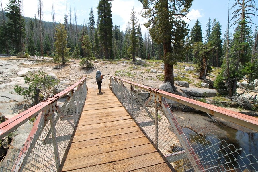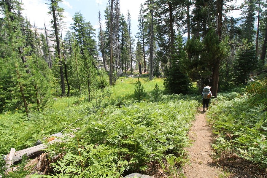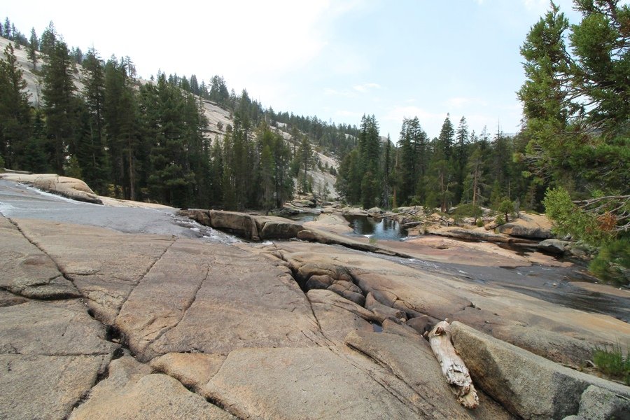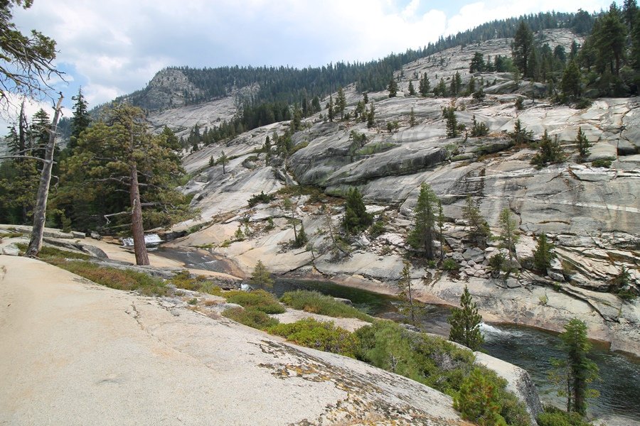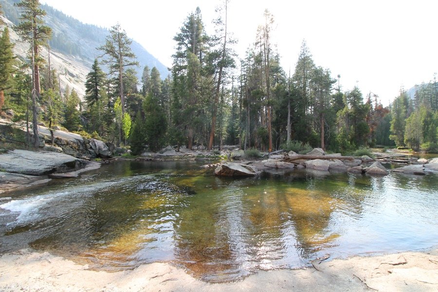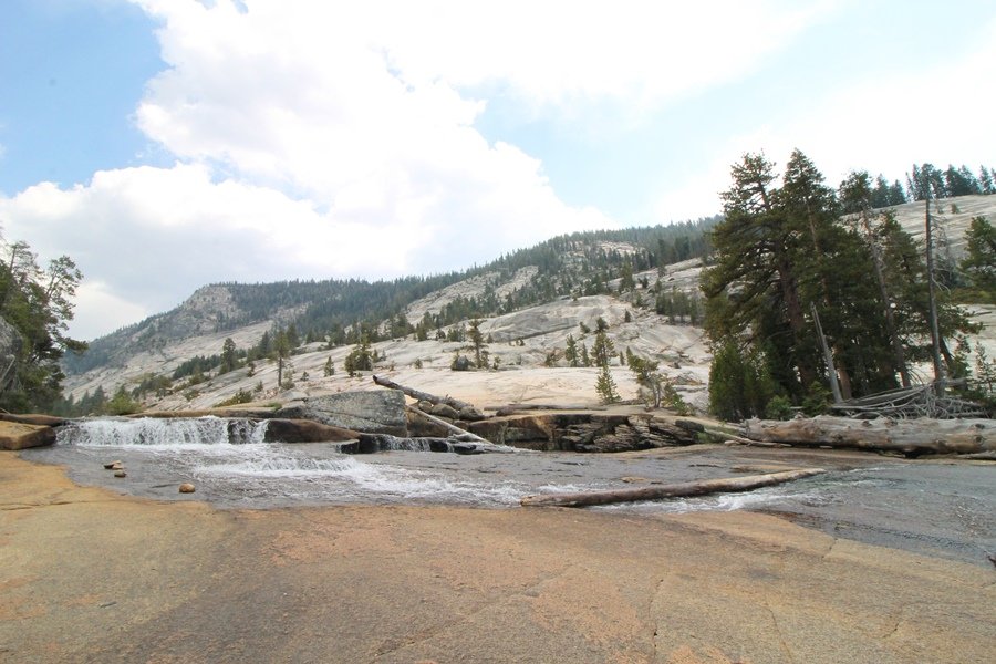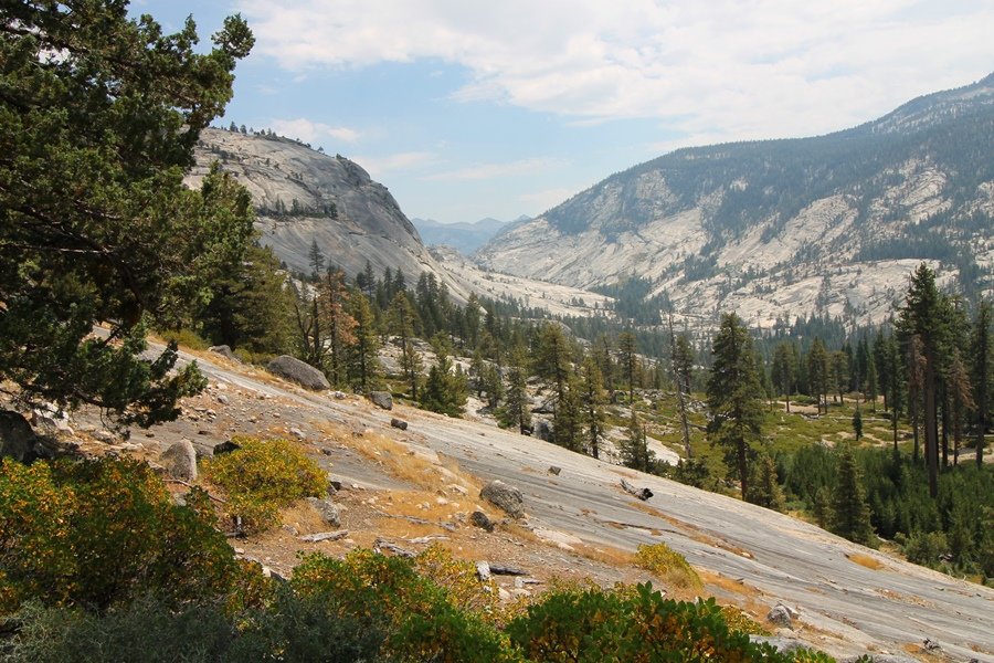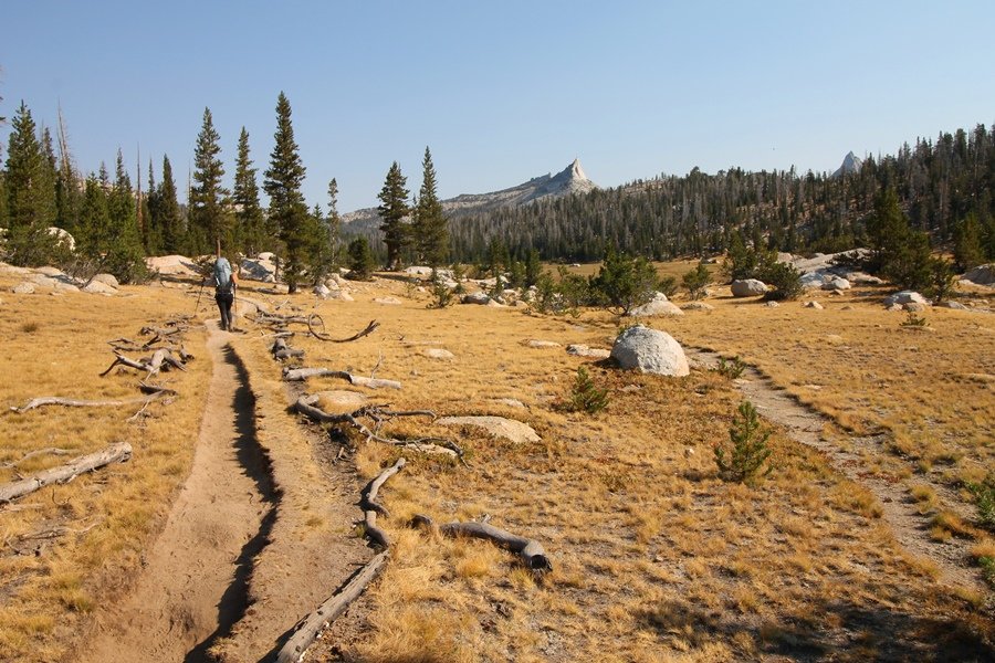We again woke up pretty early, and we took advantage of our isolated camp site to start packing things up soon thereafter – so much for the best laid plans. As the sky started to brighten, we got up on some rocks above our home away from home for a clearer view of the meadow, expecting the sun to crest the shoulder of the dome to the east at any moment. Well, that process took nearly an hour from when we started watching it, leaving us about 30 minutes to pack up the balance of the camp before the breakfast call. It didn’t happen – we resigned ourselves to finishing our packing after breakfast, and we tromped our way up to the dining tent by about 7:15 to feast like kings. The latest fire news included a report that the flames had reached the easternmost end of the Wrightwood development, and at one point we got a report that a street near ours had burned – that turned out to be incorrect, thankfully, but we did in fact confirm that the flames had been stopped at the east edge of town. Our breakfast companions included a family from the San Diego area who were going to be hiking up the JMT and out to Tuolumne Meadows that day, and they offered to text the kids for us with a live report as they headed through Cajon Pass on their way home (which they in fact did). We ate a bit more lightly than we had at May Lake, mostly to get done earlier but also because we had a lot of ground to cover today. In our day-by-day plan, this was always going to be the longest single leg of the trip – we’d start at 9,300+’, head north on the JMT for about a mile, then east over a 200′-high ridge before dropping into Cathedral Fork canyon and losing over 2,500′ as we’d descend to the Merced River valley some 7+ miles distant. We’d head east up the river at that point, gaining another 250′ over two miles to the Merced Lake HSC – at 10+ miles total, it figured to be a long day. So, we hastily finished packing and left Sunrise by just after 9am, walking briskly (well, as briskly as our sore bodies would allow, which wasn’t really very brisk) east and then north on one of two single-mile segments of the John Muir Trail our route would share (the second would be in Lyell Canyon on our last day). The meadow was beautiful in the sunny-mid-morning and the level walking very easy – just what we needed after yesterday’s brutal climbing. That ended far too soon, for we quickly reached our turnoff and headed east, right away beginning to ascend the ridge separating Long Meadow from the Cathedral Fork drainage. The hike up the incline was cool and pretty, shadows and light comingling on the trail – although we paused a couple of times to rest, this segment was quite enjoyable. Once over the top, things got way more sunny and increasingly warm – the heat may well have been on the oppressive side were it not for a fairly steady breeze that blew up the valley all day long to cool us off. We’ve long considered downhills to be, in general, more difficult than uphills, and even more so under full loads. Having learned our lesson on water management on the way to May Lake (we had both run out of water within a 1/2-mile finishing that day), we both carried our full 3-liter complement today (about 6-1/2 lbs. each to start), and our steps weighed heavily on the trail as soon as we crested the ridge and entered Cathedral Fork canyon. It’s not that the gradient was too steep, for it’s quite gentle most places – however, seven miles of steady descent wears on the feet, always bearing not just the body’s weight but the forces of gravity and forward momentum. About halfway down the canyon, we would reach the first of three bridges across the Cathedral Fork of Echo Creek – our idea was to stop for 30 minutes at the first bridge and soak our feet while eating a snack, then doing the same at the last bridge at the end of the descent where we’d eat lunch, thus being rested for the gentle but continuous push eastward to Merced Lake. As we walked through the canyon, we noticed a high, thin dome on the canyon’s west wall that was unnamed on the map – we later decided to name such features for our grandsons, so that promontory has since been christened Jude’s Dome (maybe he’ll climb it someday). Passing below it, we dropped more sharply into a flat, wooded section that was immediately followed by a burn – the stark tree trunks were a somewhat somber reminder of the situation in Wrightwood (we had been talking about how, if indeed our cabin burned, we’d only be out our vacation/retirement home, but what about the 5,000 people who live there fulltime? – deep, sobering thoughts). We found our first bridge shortly after the burned area, but there was not very much water here – Jane proposed continuing to the next one, which we did. However, once we got there, we were kind of in the same “let’s get this hike over with” mode and, despite the burning sensations in all four of our feet, we decided to keep going to the third, especially since there was more water here. We had by this time lost enough elevation that the forest had changed dramatically – gone were the lodgepoles and tundra-like grasses of the high country, replaced by chinquapin, manzanita, and ponderosa pines. The ponderosas, in particular, were quite impressive, very tall and with massive bases. Past the second bridge, the descent eases a bit through a traverse west to a junction with a connector trail leading further west to the JMT – we would turn south here, losing another 500′ before reaching the Merced River in the valley below. That section, in fact, was about as bad as we had expected – another steep series of stair-stepped switchbacks, and our feet felt twice as bad by the time we hit the bottom of the grade. There in front of us was the third bridge, but there was not a drop of water in sight – crazy. We stopped here anyway and ate our lunch (which, by the way, were made to order each morning by t