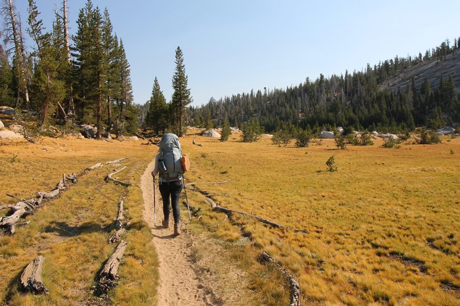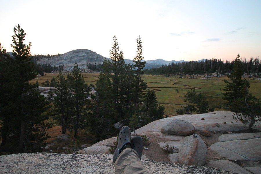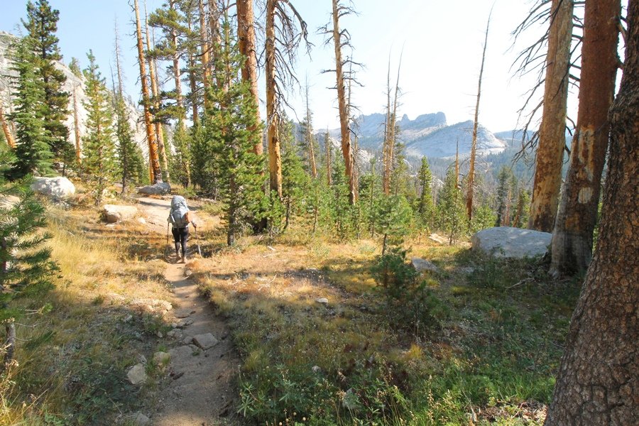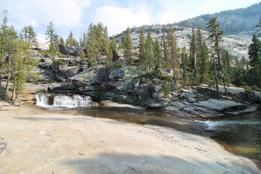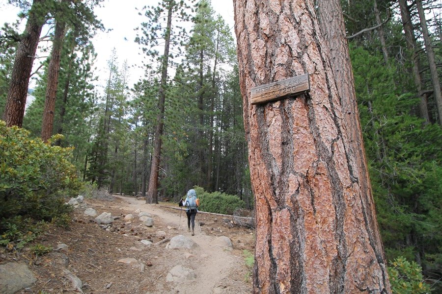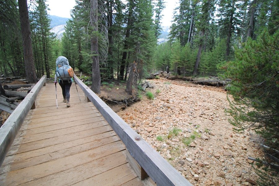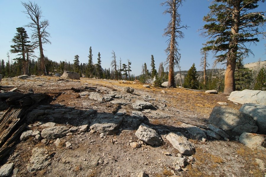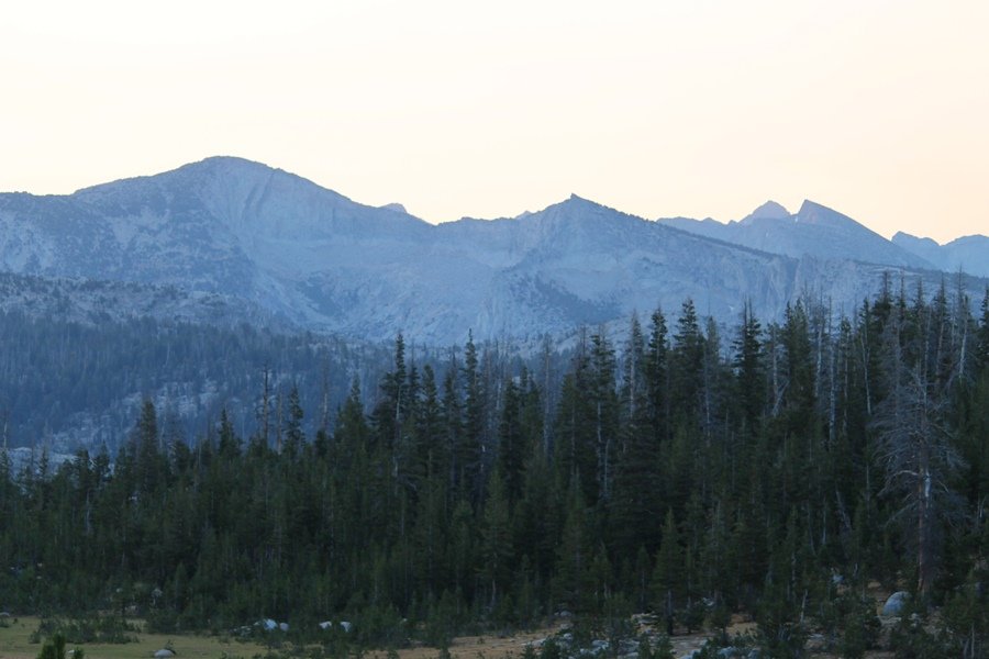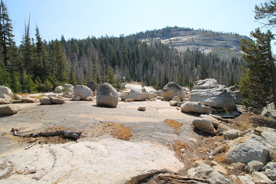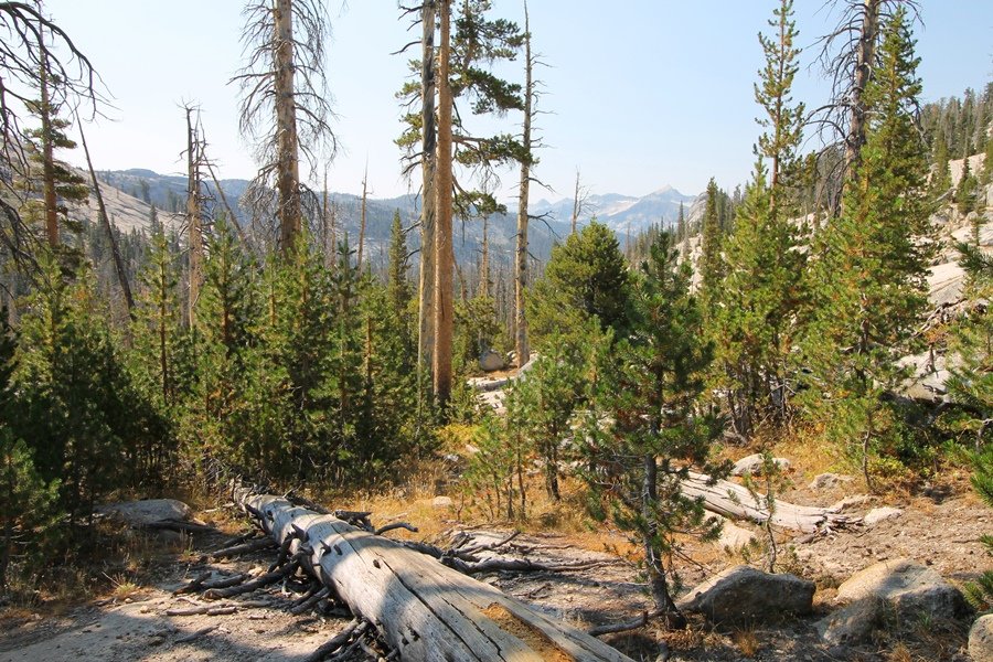 We again woke up pretty early, and we took advantage of our isolated camp site to start packing things up soon thereafter – so much for the best laid plans. As the sky started to brighten, we got up on some rocks above our home away from home for a clearer view of the meadow, expecting the sun to crest the shoulder of the dome to the east at any moment. Well, that process took nearly an hour from when we started watching it, leaving us about 30 minutes to pack up the balance of the camp before the breakfast call. It didn’t happen – we resigned ourselves to finishing our packing after breakfast, and we tromped our way up to the dining tent by about 7:15 to feast like kings. The latest fire news included a report that the flames had reached the easternmost end of the Wrightwood development, and at one point we got a report that a street near ours had burned – that turned out to be incorrect, thankfully, but we did in fact confirm that the flames had been stopped at the east edge of town. Our breakfast companions included a family from the San Diego area who were going to be hiking up the JMT and out to Tuolumne Meadows that day, and they offered to text the kids for us with a live report as they headed through Cajon Pass on their way home (which they in fact did). We ate a bit more lightly than we had at May Lake, mostly to get done earlier but also because we had a lot of ground to cover today. In our day-by-day plan, this was always going to be the longest single leg of the trip – we’d start at 9,300+’, head north on the JMT for about a mile, then east over a 200′-high ridge before dropping into Cathedral Fork canyon and losing over 2,500′ as we’d descend to the Merced River valley some 7+ miles distant. We’d head east up the river at that point, gaining another 250′ over two miles to the Merced Lake HSC – at 10+ miles total, it figured to be a long day. So, we hastily finished packing and left Sunrise by just after 9am, walking briskly (well, as briskly as our sore bodies would allow, which wasn’t really very brisk) east and then north on one of two single-mile segments of the John Muir Trail our route would share (the second would be in Lyell Canyon on our last day). The meadow was beautiful in the sunny-mid-morning and the level walking very easy – just what we needed after yesterday’s brutal climbing. That ended far too soon, for we quickly reached our turnoff and headed east, right away beginning to ascend the ridge separating Long Meadow from the Cathedral Fork drainage. The hike up the incline was cool and pretty, shadows and light comingling on the trail – although we paused a couple of times to rest, this segment was quite enjoyable. Once over the top, things got way more sunny and increasingly warm – the heat may well have been on the oppressive side were it not for a fairly steady breeze that blew up the valley all day long to cool us off. We’ve long considered downhills to be, in general, more difficult than uphills, and even more so under full loads. Having learned our lesson on water management on the way to May Lake (we had both run out of water within a 1/2-mile finishing that day), we both carried our full 3-liter complement today (about 6-1/2 lbs. each to start), and our steps weighed heavily on the trail as soon as we crested the ridge and entered Cathedral Fork canyon. It’s not that the gradient was too steep, for it’s quite gentle most places – however, seven miles of steady descent wears on the feet, always bearing not just the body’s weight but the forces of gravity and forward momentum. About halfway down the canyon, we would reach the first of three bridges across the Cathedral Fork of Echo Creek – our idea was to stop for 30 minutes at the first bridge and soak our feet while eating a snack, then doing the same at the last bridge at the end of the descent where we’d eat lunch, thus being rested for the gentle but continuous push eastward to Merced Lake. As we walked through the canyon, we noticed a high, thin dome on the canyon’s west wall that was unnamed on the map – we later decided to name such features for our grandsons, so that promontory has since been christened Jude’s Dome (maybe he’ll climb it someday). Passing below it, we dropped more sharply into a flat, wooded section that was immediately followed by a burn – the stark tree trunks were a somewhat somber reminder of the situation in Wrightwood (we had been talking about how, if indeed our cabin burned, we’d only be out our vacation/retirement home, but what about the 5,000 people who live there fulltime? – deep, sobering thoughts). We found our first bridge shortly after the burned area, but there was not very much water here – Jane proposed continuing to the next one, which we did. However, once we got there, we were kind of in the same “let’s get this hike over with” mode and, despite the burning sensations in all four of our feet, we decided to keep going to the third, especially since there was more water here. We had by this time lost enough elevation that the forest had changed dramatically – gone were the lodgepoles and tundra-like grasses of the high country, replaced by chinquapin, manzanita, and ponderosa pines. The ponderosas, in particular, were quite impressive, very tall and with massive bases. Past the second bridge, the descent eases a bit through a traverse west to a junction with a connector trail leading further west to the JMT – we would turn south here, losing another 500′ before reaching the Merced River in the valley below. That section, in fact, was about as bad as we had expected – another steep series of stair-stepped switchbacks, and our feet felt twice as bad by the time we hit the bottom of the grade. There in front of us was the third bridge, but there was not a drop of water in sight – crazy. We stopped here anyway and ate our lunch (which, by the way, were made to order each morning by t