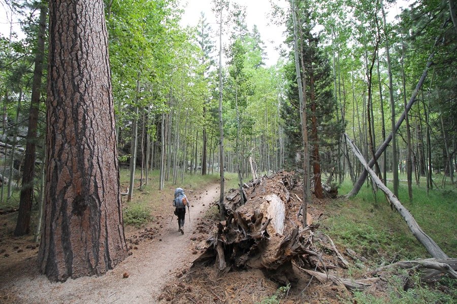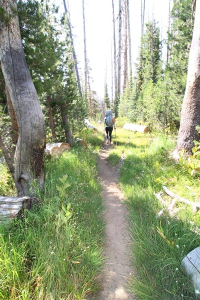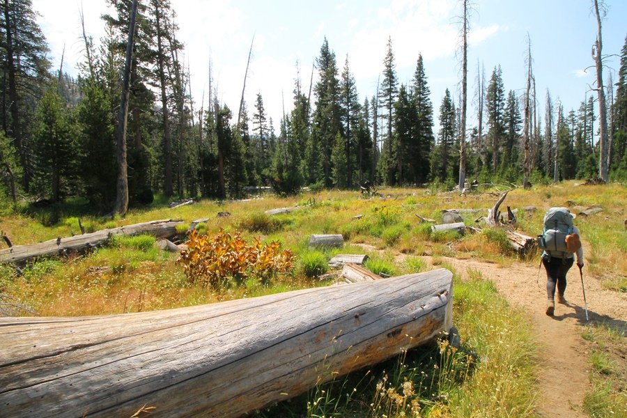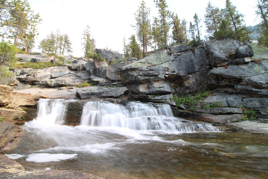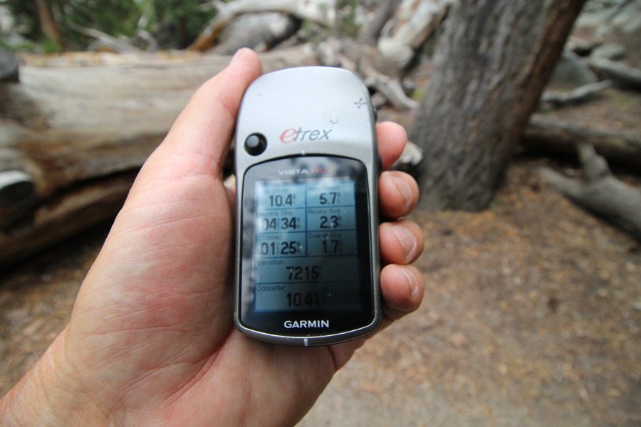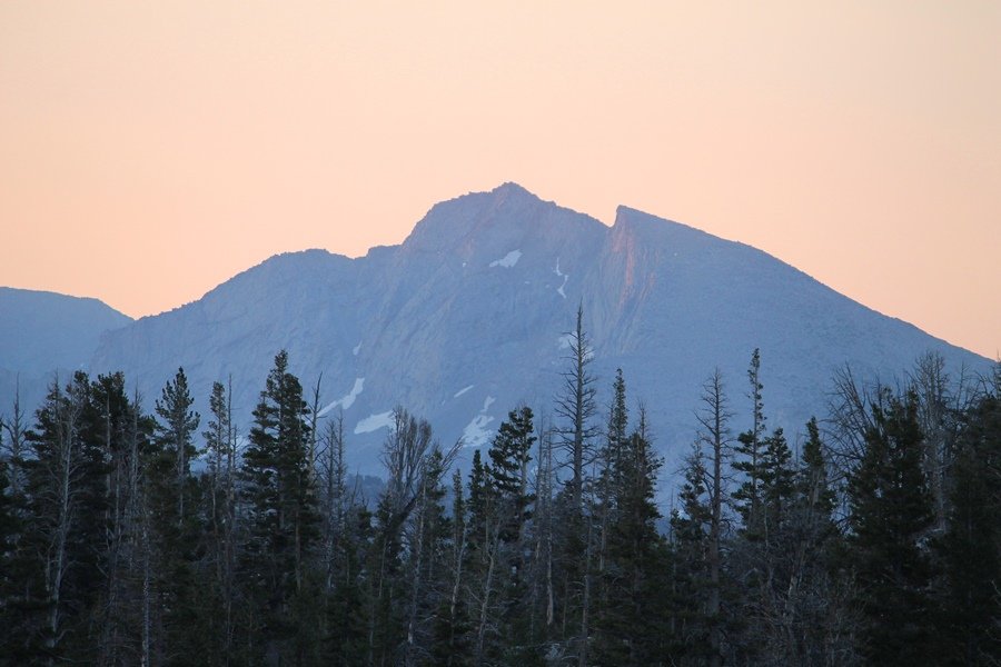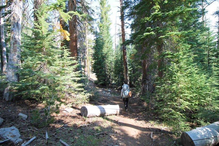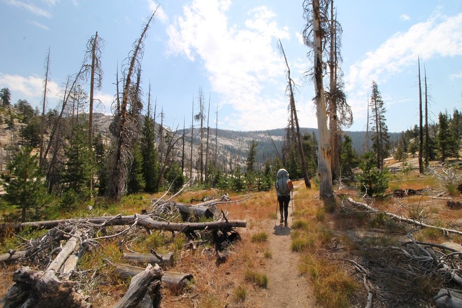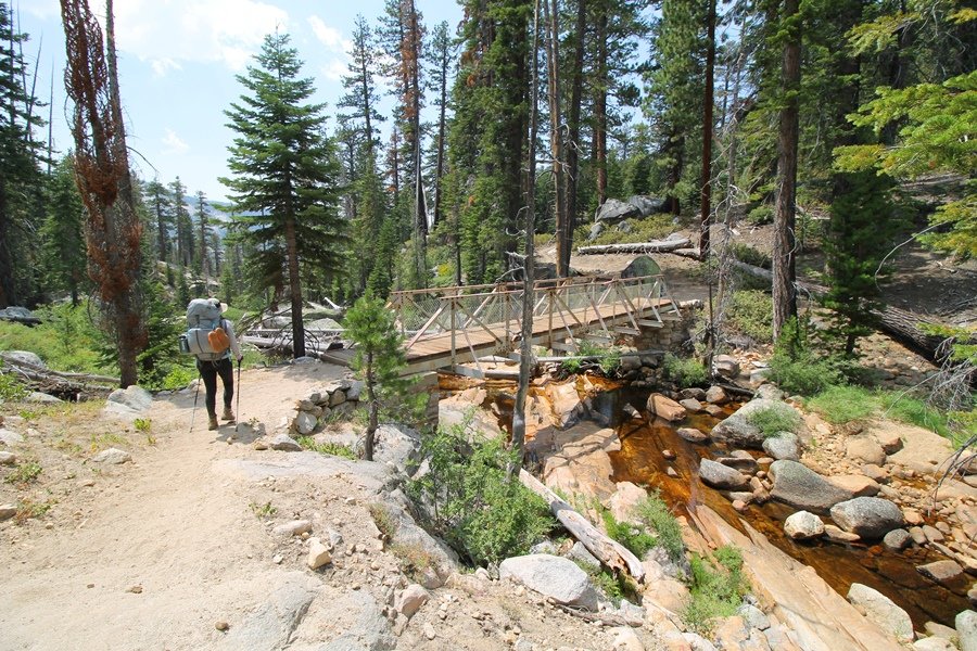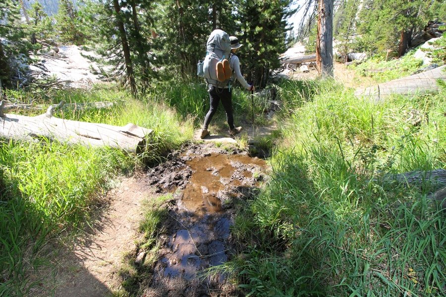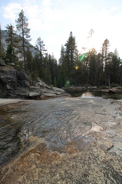 We again woke up pretty early, and we took advantage of our isolated camp site to start packing things up soon thereafter – so much for the best laid plans. As the sky started to brighten, we got up on some rocks above our home away from home for a clearer view of the meadow, expecting the sun to crest the shoulder of the dome to the east at any moment. Well, that process took nearly an hour from when we started watching it, leaving us about 30 minutes to pack up the balance of the camp before the breakfast call. It didn’t happen – we resigned ourselves to finishing our packing after breakfast, and we tromped our way up to the dining tent by about 7:15 to feast like kings. The latest fire news included a report that the flames had reached the easternmost end of the Wrightwood development, and at one point we got a report that a street near ours had burned – that turned out to be incorrect, thankfully, but we did in fact confirm that the flames had been stopped at the east edge of town. Our breakfast companions included a family from the San Diego area who were going to be hiking up the JMT and out to Tuolumne Meadows that day, and they offered to text the kids for us with a live report as they headed through Cajon Pass on their way home (which they in fact did). We ate a bit more lightly than we had at May Lake, mostly to get done earlier but also because we had a lot of ground to cover today. In our day-by-day plan, this was always going to be the longest single leg of the trip – we’d start at 9,300+’, head north on the JMT for about a mile, then east over a 200′-high ridge before dropping into Cathedral Fork canyon and losing over 2,500′ as we’d descend to the Merced River valley some 7+ miles distant. We’d head east up the river at that point, gaining another 250′ over two miles to the Merced Lake HSC – at 10+ miles total, it figured to be a long day. So, we hastily finished packing and left Sunrise by just after 9am, walking briskly (well, as briskly as our sore bodies would allow, which wasn’t really very brisk) east and then north on one of two single-mile segments of the John Muir Trail our route would share (the second would be in Lyell Canyon on our last day). The meadow was beautiful in the sunny-mid-morning and the level walking very easy – just what we needed after yesterday’s brutal climbing. That ended far too soon, for we quickly reached our turnoff and headed east, right away beginning to ascend the ridge separating Long Meadow from the Cathedral Fork drainage. The hike up the incline was cool and pretty, shadows and light comingling on the trail – although we paused a couple of times to rest, this segment was quite enjoyable. Once over the top, things got way more sunny and increasingly warm – the heat may well have been on the oppressive side were it not for a fairly steady breeze that blew up the valley all day long to cool us off. We’ve long considered downhills to be, in general, more difficult than uphills, and even more so under full loads. Having learned our lesson on water management on the way to May Lake (we had both run out of water within a 1/2-mile finishing that day), we both carried our full 3-liter complement today (about 6-1/2 lbs. each to start), and our steps weighed heavily on the trail as soon as we crested the ridge and entered Cathedral Fork canyon. It’s not that the gradient was too steep, for it’s quite gentle most places – however, seven miles of steady descent wears on the feet, always bearing not just the body’s weight but the forces of gravity and forward momentum. About halfway down the canyon, we would reach the first of three bridges across the Cathedral Fork of Echo Creek – our idea was to stop for 30 minutes at the first bridge and soak our feet while eating a snack, then doing the same at the last bridge at the end of the descent where we’d eat lunch, thus being rested for the gentle but continuous push eastward to Merced Lake. As we walked through the canyon, we noticed a high, thin dome on the canyon’s west wall that was unnamed on the map – we later decided to name such features for our grandsons, so that promontory has since been christened Jude’s Dome (maybe he’ll climb it someday). Passing below it, we dropped more sharply into a flat, wooded section that was immediately followed by a burn – the stark tree trunks were a somewhat somber reminder of the situation in Wrightwood (we had been talking about how, if indeed our cabin burned, we’d only be out our vacation/retirement home, but what about the 5,000 people who live there fulltime? – deep, sobering thoughts). We found our first bridge shortly after the burned area, but there was not very much water here – Jane proposed continuing to the next one, which we did. However, once we got there, we were kind of in the same “let’s get this hike over with” mode and, despite the burning sensations in all four of our feet, we decided to keep going to the third, especially since there was more water here. We had by this time lost enough elevation that the forest had changed dramatically – gone were the lodgepoles and tundra-like grasses of the high country, replaced by chinquapin, manzanita, and ponderosa pines. The ponderosas, in particular, were quite impressive, very tall and with massive bases. Past the second bridge, the descent eases a bit through a traverse west to a junction with a connector trail leading further west to the JMT – we would turn south here, losing another 500′ before reaching the Merced River in the valley below. That section, in fact, was about as bad as we had expected – another steep series of stair-stepped switchbacks, and our feet felt twice as bad by the time we hit the bottom of the grade. There in front of us was the third bridge, but there was not a drop of water in sight – crazy. We stopped here anyway and ate our lunch (which, by the way, were made to order each morning by t