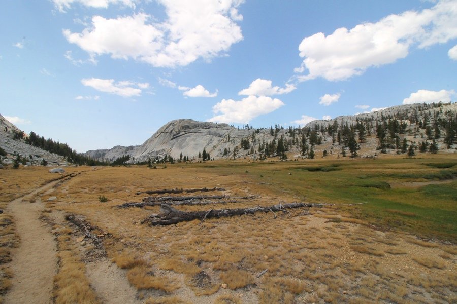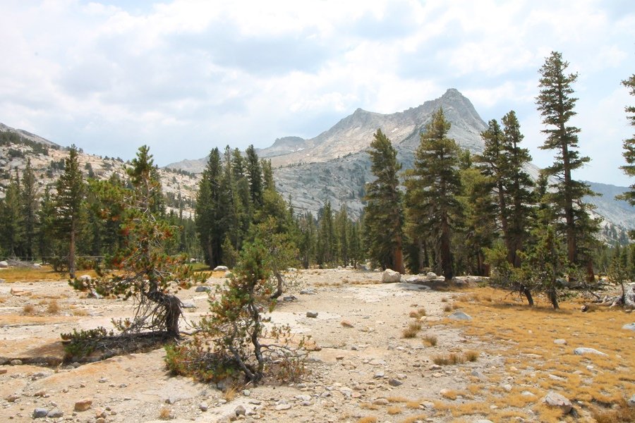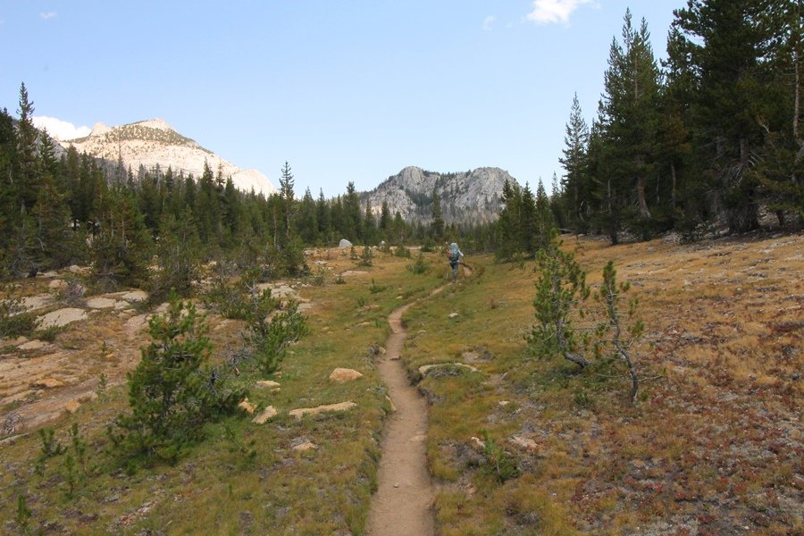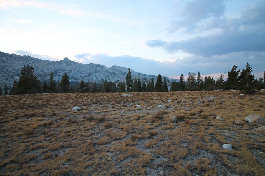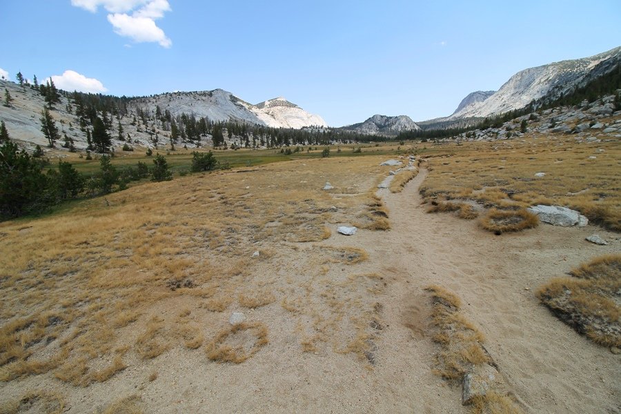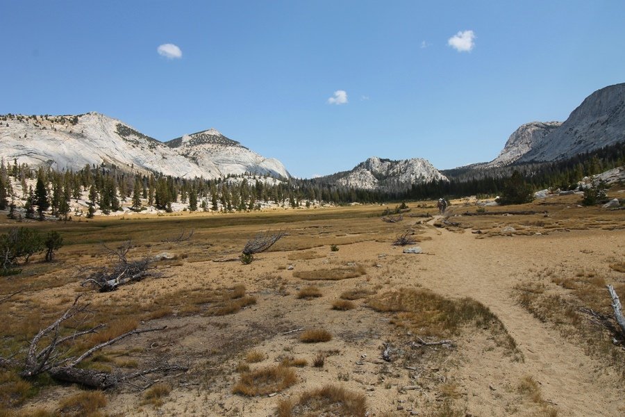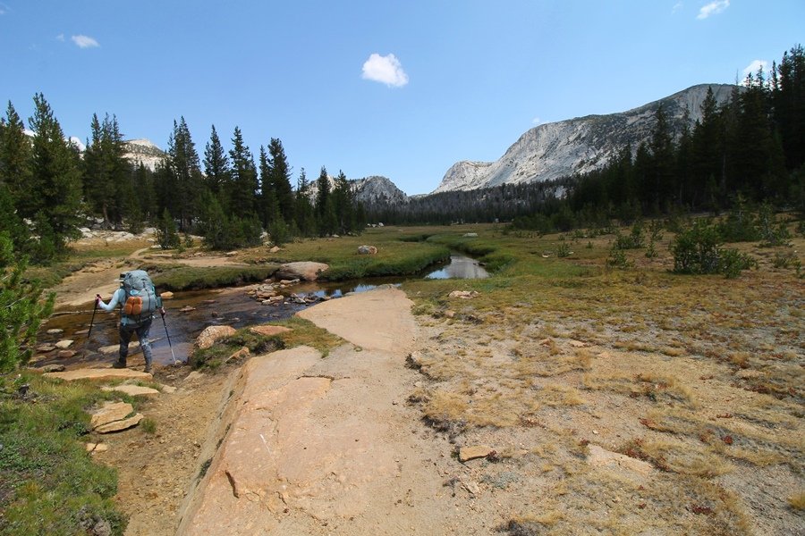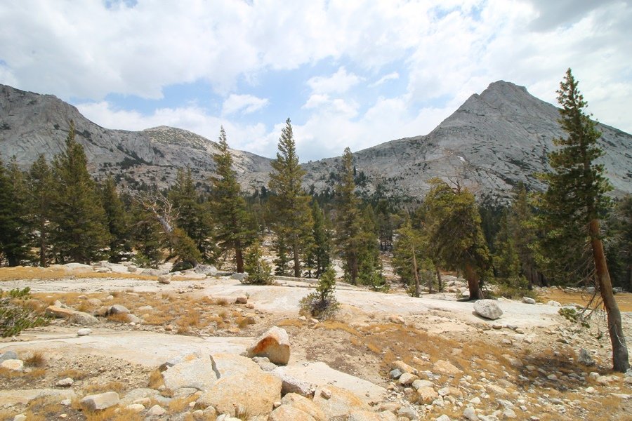 After our dinner at Merced Lake, we spent some time packing up our campsite – things were a little simpler since a) Jane had no wine left to stash in the campground bear box, and b) we had been allowed to get rid of at the HSC the small amount of garbage we’d been carrying, which also would have gone into the bear box. Thus, all our smelly stuff now fit into our personal bear canister, and we went to bed knowing all we’d have to pack in the morning was what was in our tent (plus the tent, naturally). The campground was already stirring when we awoke, and we got right to tearing things down – we were ready to go before we knew it, and we strutted with pride into the HSC, packs on our backs, just as they were calling guests to coffee at 7am – of course, everyone else was preoccupied with their coffee or tea and took no notice of our little personal achievement. No worries – we dropped our packs near the dining tent and joined the crowd. Breakfast was the typical spread, although the eggs were done in large frittatas and were delicious, as expected. Our breakfast companion was Ranger Adam Ramsey, who had been at Merced Lake for two nights leading a group of hiker/campers on a guided tour of the same loop as ours – one day ahead of us until now, his group had started as 10 people, but a family of four had dropped out the second day, another guy had dropped out ill a day later, so his band (whom we labeled The Tourists) was now five. Adam is a rock climber as well as a ranger/naturalist, and he flies up trails with the greatest of ease, as we later found out – a very interesting guy, he’s been a ranger for 7 years, the last four of which have been spent in Yosemite, stationed at Glacier Point above the Valley. We ate lightly for the second day in a row, as we wanted to get on the trail – today was the day, our big climb to Vogelsang. Leaving Merced Lake HSC, we’d head east for 0.8 miles on a gentle gradient to the Merced Lake ranger station, turning north onto the Lewis Creek trail, a steep set of switchbacks that gains 900′ over the next mile to a junction. Here we’d head north again to follow Fletcher Creek more gently for 0.6 miles before climbing another 700′ to a saddle adjacent to Babcock Dome. Once above the dome, the advice was “well now you’ll be in the meadows, and it’s easy from there” – “easy” in this case means 4.2 more miles and 1,200′ more gain to Vogelsang HSC, for a total of about 8.4 miles and ~2,800′ of gain. One of our dinner companions at Sunrise was a lady who had done the loop before, and she had stated that there was no more scenic leg of the loop than this one – effort-wise, we looked at it more in comparison with our familiar Mt Baden-Powell, the conventional ascent of which involves 2,800′ of gain in just 4 miles, so this should only be half as hard, right? We left the camp just after 8am, our earliest start of the trip, and walked sorely but steadily eastward – we were passed shortly thereafter by Ranger Adam and a couple of his charges, and we watched them float effortlessly up the switchbacks as we made the first turn. Still in shade at this hour, the switchbacks were not as bad as we expected – they bring pack trains up this way, so there were more cobbled ramps than stair steps. Plus, the views south and west improved with every step, first to Merced Lake and Half Dome and then to the Clark Range. Our pace was steady – we’d go for 100 or even 200 steps, take a breather for 30 seconds (ok, maybe 60) and start again. Ranger Adam’s strategy, it appears, was to go faster for longer and then take a longer break – his group and ours would leapfrog each other all day. Much the same with another group we had first met at Sunrise – we called them the Family Packers, six members who were also meals-only like us, and they’d pass us while we were resting so we could return the favor later. We were surprised to find a descent on the other side of the first climb – once past the Fletcher Creek junction, where we turned left, we actually dropped down a couple of switchbacks before crossing Lewis Creek and resuming our climb once more. The approach to Babcock Dome was impressive – treeless and immense, the dome literally blocks the Fletcher Creek drainage, creating a shallow valley behind it to its north (“the meadows”) and forcing the creek into a long series of cascades down the dome’s southern shoulder. Reaching the base of the dome, we started up another lengthy set of switchbacks, although these didn’t seem as taxing as the first ones today – soon enough, we were over the top, spurred on by the Family Packers whom we could see below us. We again dropped a little coming across the saddle into The Meadows, and the trail resumed its gradual ascent as we passed through pretty green grass interspersed with flowers. Ranger Adam passed us briskly again here, and Vivian also caught up with us (Len had chosen to stay on the Lewis Creek trail, an alternate route to Vogelsang that’s slightly longer but also involves an additional 600′ of gain over Vogelsang Pass) – she, too, passed us by, and we ascended up and out of the northeast end of the meadows past yet another set of Fletcher Creek cascades. At the top of this section was a large granite dome that was unnamed on the map – it’s now Ollie’s Dome – beyond which we entered a broad valley that was simply striking to behold. Lined north and south by steep granite ridges, the valley was carpeted with short tundra-like grass and dotted with stands of lodgepole pine – it was breathtaking, and it was also relatively flat (or at least a very gentle slope). We cruised up the valley to the day’s final junction, a fork where we’d stay right (south) to head up to Vogelsang while the left path went directly up to Tuolumne Pass and down eventually to Tuolumne Meadows. Just past the fork, we decided to sit and at least eat an energy bar – we h