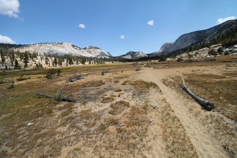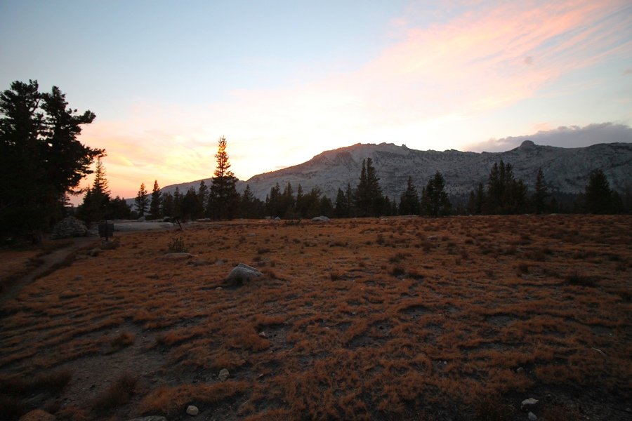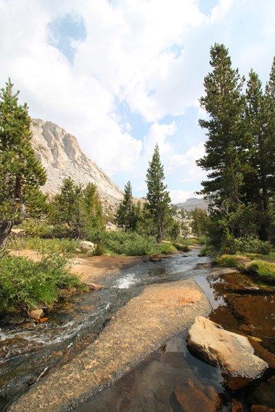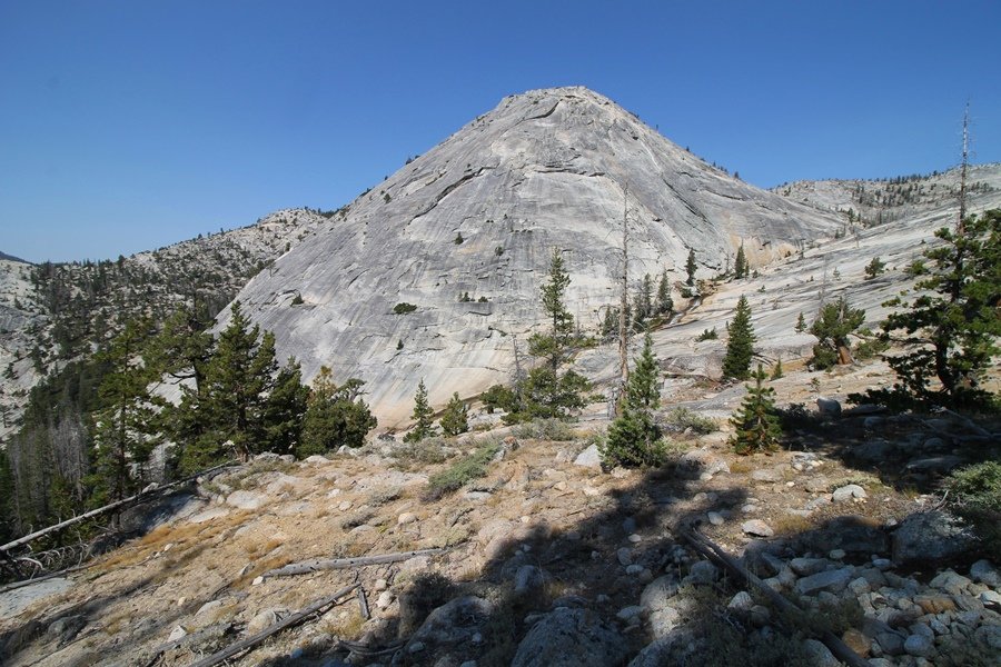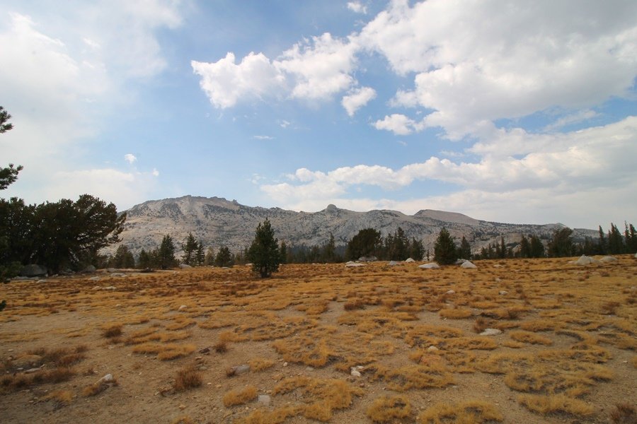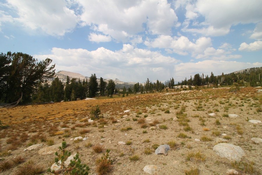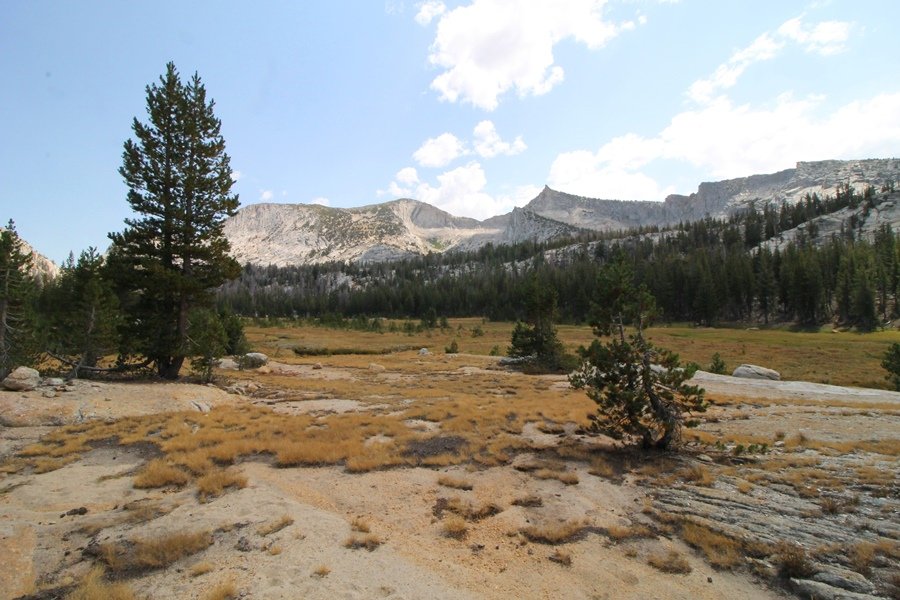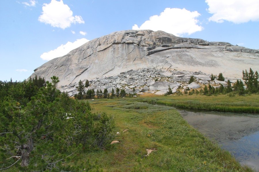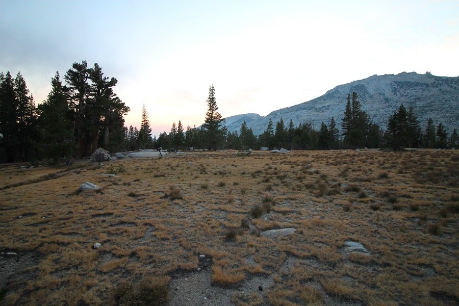 After our dinner at Merced Lake, we spent some time packing up our campsite – things were a little simpler since a) Jane had no wine left to stash in the campground bear box, and b) we had been allowed to get rid of at the HSC the small amount of garbage we’d been carrying, which also would have gone into the bear box. Thus, all our smelly stuff now fit into our personal bear canister, and we went to bed knowing all we’d have to pack in the morning was what was in our tent (plus the tent, naturally). The campground was already stirring when we awoke, and we got right to tearing things down – we were ready to go before we knew it, and we strutted with pride into the HSC, packs on our backs, just as they were calling guests to coffee at 7am – of course, everyone else was preoccupied with their coffee or tea and took no notice of our little personal achievement. No worries – we dropped our packs near the dining tent and joined the crowd. Breakfast was the typical spread, although the eggs were done in large frittatas and were delicious, as expected. Our breakfast companion was Ranger Adam Ramsey, who had been at Merced Lake for two nights leading a group of hiker/campers on a guided tour of the same loop as ours – one day ahead of us until now, his group had started as 10 people, but a family of four had dropped out the second day, another guy had dropped out ill a day later, so his band (whom we labeled The Tourists) was now five. Adam is a rock climber as well as a ranger/naturalist, and he flies up trails with the greatest of ease, as we later found out – a very interesting guy, he’s been a ranger for 7 years, the last four of which have been spent in Yosemite, stationed at Glacier Point above the Valley. We ate lightly for the second day in a row, as we wanted to get on the trail – today was the day, our big climb to Vogelsang. Leaving Merced Lake HSC, we’d head east for 0.8 miles on a gentle gradient to the Merced Lake ranger station, turning north onto the Lewis Creek trail, a steep set of switchbacks that gains 900′ over the next mile to a junction. Here we’d head north again to follow Fletcher Creek more gently for 0.6 miles before climbing another 700′ to a saddle adjacent to Babcock Dome. Once above the dome, the advice was “well now you’ll be in the meadows, and it’s easy from there” – “easy” in this case means 4.2 more miles and 1,200′ more gain to Vogelsang HSC, for a total of about 8.4 miles and ~2,800′ of gain. One of our dinner companions at Sunrise was a lady who had done the loop before, and she had stated that there was no more scenic leg of the loop than this one – effort-wise, we looked at it more in comparison with our familiar Mt Baden-Powell, the conventional ascent of which involves 2,800′ of gain in just 4 miles, so this should only be half as hard, right? We left the camp just after 8am, our earliest start of the trip, and walked sorely but steadily eastward – we were passed shortly thereafter by Ranger Adam and a couple of his charges, and we watched them float effortlessly up the switchbacks as we made the first turn. Still in shade at this hour, the switchbacks were not as bad as we expected – they bring pack trains up this way, so there were more cobbled ramps than stair steps. Plus, the views south and west improved with every step, first to Merced Lake and Half Dome and then to the Clark Range. Our pace was steady – we’d go for 100 or even 200 steps, take a breather for 30 seconds (ok, maybe 60) and start again. Ranger Adam’s strategy, it appears, was to go faster for longer and then take a longer break – his group and ours would leapfrog each other all day. Much the same with another group we had first met at Sunrise – we called them the Family Packers, six members who were also meals-only like us, and they’d pass us while we were resting so we could return the favor later. We were surprised to find a descent on the other side of the first climb – once past the Fletcher Creek junction, where we turned left, we actually dropped down a couple of switchbacks before crossing Lewis Creek and resuming our climb once more. The approach to Babcock Dome was impressive – treeless and immense, the dome literally blocks the Fletcher Creek drainage, creating a shallow valley behind it to its north (“the meadows”) and forcing the creek into a long series of cascades down the dome’s southern shoulder. Reaching the base of the dome, we started up another lengthy set of switchbacks, although these didn’t seem as taxing as the first ones today – soon enough, we were over the top, spurred on by the Family Packers whom we could see below us. We again dropped a little coming across the saddle into The Meadows, and the trail resumed its gradual ascent as we passed through pretty green grass interspersed with flowers. Ranger Adam passed us briskly again here, and Vivian also caught up with us (Len had chosen to stay on the Lewis Creek trail, an alternate route to Vogelsang that’s slightly longer but also involves an additional 600′ of gain over Vogelsang Pass) – she, too, passed us by, and we ascended up and out of the northeast end of the meadows past yet another set of Fletcher Creek cascades. At the top of this section was a large granite dome that was unnamed on the map – it’s now Ollie’s Dome – beyond which we entered a broad valley that was simply striking to behold. Lined north and south by steep granite ridges, the valley was carpeted with short tundra-like grass and dotted with stands of lodgepole pine – it was breathtaking, and it was also relatively flat (or at least a very gentle slope). We cruised up the valley to the day’s final junction, a fork where we’d stay right (south) to head up to Vogelsang while the left path went directly up to Tuolumne Pass and down eventually to Tuolumne Meadows. Just past the fork, we decided to sit and at least eat an energy bar – we h