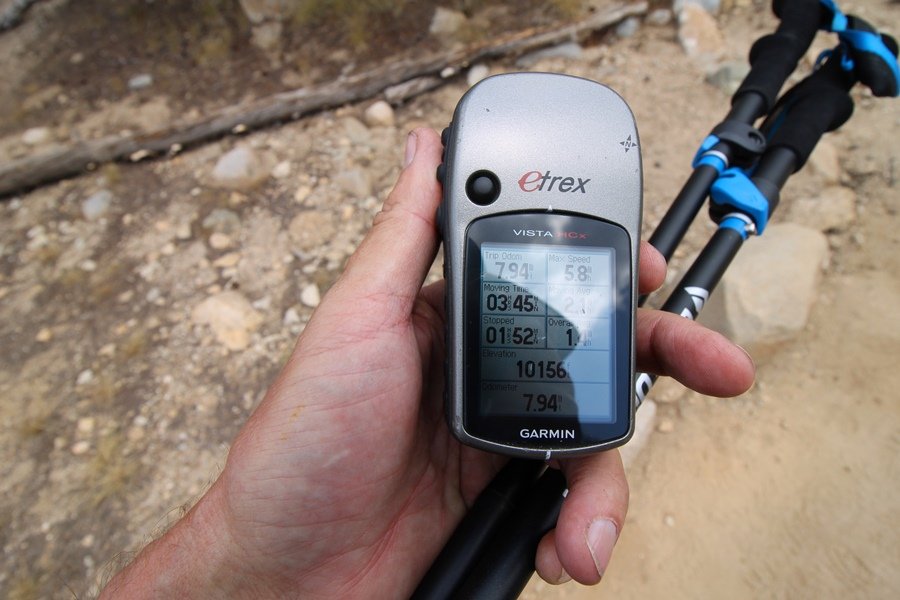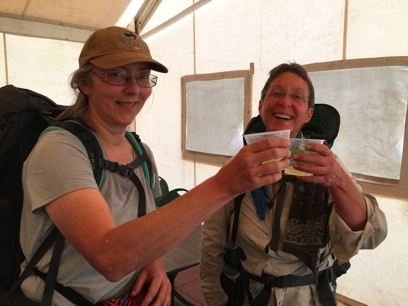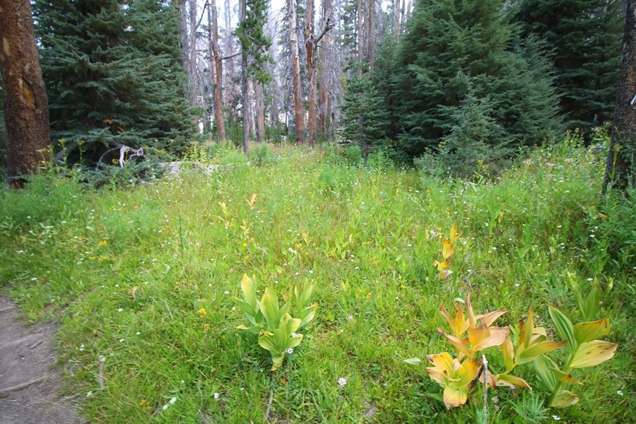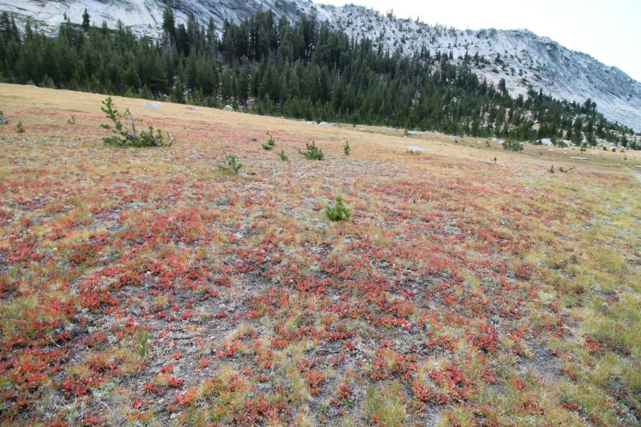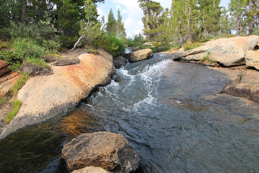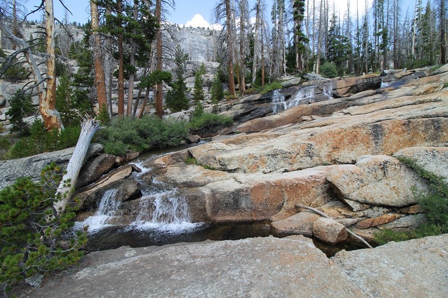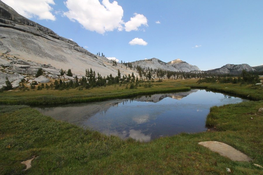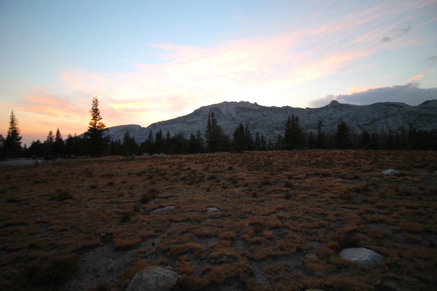 After our dinner at Merced Lake, we spent some time packing up our campsite – things were a little simpler since a) Jane had no wine left to stash in the campground bear box, and b) we had been allowed to get rid of at the HSC the small amount of garbage we’d been carrying, which also would have gone into the bear box. Thus, all our smelly stuff now fit into our personal bear canister, and we went to bed knowing all we’d have to pack in the morning was what was in our tent (plus the tent, naturally). The campground was already stirring when we awoke, and we got right to tearing things down – we were ready to go before we knew it, and we strutted with pride into the HSC, packs on our backs, just as they were calling guests to coffee at 7am – of course, everyone else was preoccupied with their coffee or tea and took no notice of our little personal achievement. No worries – we dropped our packs near the dining tent and joined the crowd. Breakfast was the typical spread, although the eggs were done in large frittatas and were delicious, as expected. Our breakfast companion was Ranger Adam Ramsey, who had been at Merced Lake for two nights leading a group of hiker/campers on a guided tour of the same loop as ours – one day ahead of us until now, his group had started as 10 people, but a family of four had dropped out the second day, another guy had dropped out ill a day later, so his band (whom we labeled The Tourists) was now five. Adam is a rock climber as well as a ranger/naturalist, and he flies up trails with the greatest of ease, as we later found out – a very interesting guy, he’s been a ranger for 7 years, the last four of which have been spent in Yosemite, stationed at Glacier Point above the Valley. We ate lightly for the second day in a row, as we wanted to get on the trail – today was the day, our big climb to Vogelsang. Leaving Merced Lake HSC, we’d head east for 0.8 miles on a gentle gradient to the Merced Lake ranger station, turning north onto the Lewis Creek trail, a steep set of switchbacks that gains 900′ over the next mile to a junction. Here we’d head north again to follow Fletcher Creek more gently for 0.6 miles before climbing another 700′ to a saddle adjacent to Babcock Dome. Once above the dome, the advice was “well now you’ll be in the meadows, and it’s easy from there” – “easy” in this case means 4.2 more miles and 1,200′ more gain to Vogelsang HSC, for a total of about 8.4 miles and ~2,800′ of gain. One of our dinner companions at Sunrise was a lady who had done the loop before, and she had stated that there was no more scenic leg of the loop than this one – effort-wise, we looked at it more in comparison with our familiar Mt Baden-Powell, the conventional ascent of which involves 2,800′ of gain in just 4 miles, so this should only be half as hard, right? We left the camp just after 8am, our earliest start of the trip, and walked sorely but steadily eastward – we were passed shortly thereafter by Ranger Adam and a couple of his charges, and we watched them float effortlessly up the switchbacks as we made the first turn. Still in shade at this hour, the switchbacks were not as bad as we expected – they bring pack trains up this way, so there were more cobbled ramps than stair steps. Plus, the views south and west improved with every step, first to Merced Lake and Half Dome and then to the Clark Range. Our pace was steady – we’d go for 100 or even 200 steps, take a breather for 30 seconds (ok, maybe 60) and start again. Ranger Adam’s strategy, it appears, was to go faster for longer and then take a longer break – his group and ours would leapfrog each other all day. Much the same with another group we had first met at Sunrise – we called them the Family Packers, six members who were also meals-only like us, and they’d pass us while we were resting so we could return the favor later. We were surprised to find a descent on the other side of the first climb – once past the Fletcher Creek junction, where we turned left, we actually dropped down a couple of switchbacks before crossing Lewis Creek and resuming our climb once more. The approach to Babcock Dome was impressive – treeless and immense, the dome literally blocks the Fletcher Creek drainage, creating a shallow valley behind it to its north (“the meadows”) and forcing the creek into a long series of cascades down the dome’s southern shoulder. Reaching the base of the dome, we started up another lengthy set of switchbacks, although these didn’t seem as taxing as the first ones today – soon enough, we were over the top, spurred on by the Family Packers whom we could see below us. We again dropped a little coming across the saddle into The Meadows, and the trail resumed its gradual ascent as we passed through pretty green grass interspersed with flowers. Ranger Adam passed us briskly again here, and Vivian also caught up with us (Len had chosen to stay on the Lewis Creek trail, an alternate route to Vogelsang that’s slightly longer but also involves an additional 600′ of gain over Vogelsang Pass) – she, too, passed us by, and we ascended up and out of the northeast end of the meadows past yet another set of Fletcher Creek cascades. At the top of this section was a large granite dome that was unnamed on the map – it’s now Ollie’s Dome – beyond which we entered a broad valley that was simply striking to behold. Lined north and south by steep granite ridges, the valley was carpeted with short tundra-like grass and dotted with stands of lodgepole pine – it was breathtaking, and it was also relatively flat (or at least a very gentle slope). We cruised up the valley to the day’s final junction, a fork where we’d stay right (south) to head up to Vogelsang while the left path went directly up to Tuolumne Pass and down eventually to Tuolumne Meadows. Just past the fork, we decided to sit and at least eat an energy bar – we h