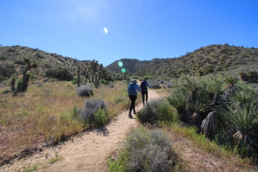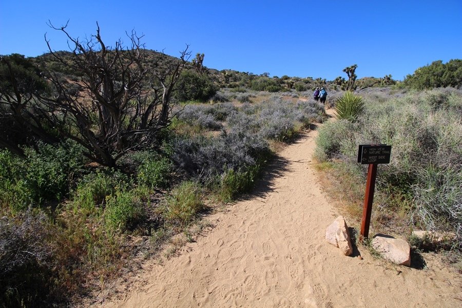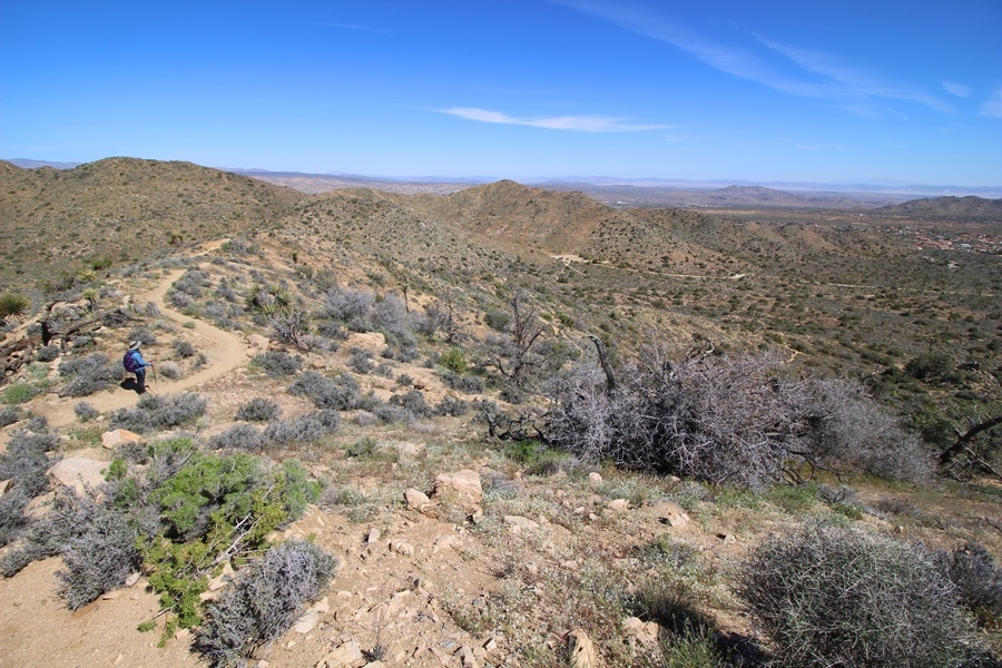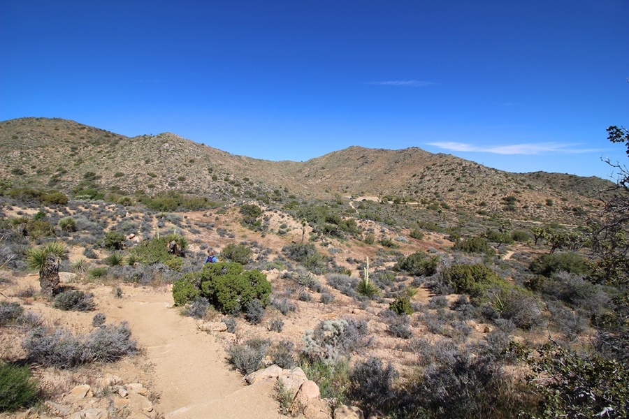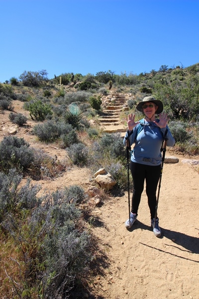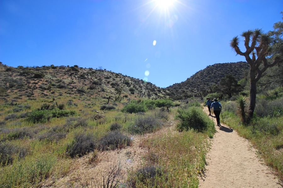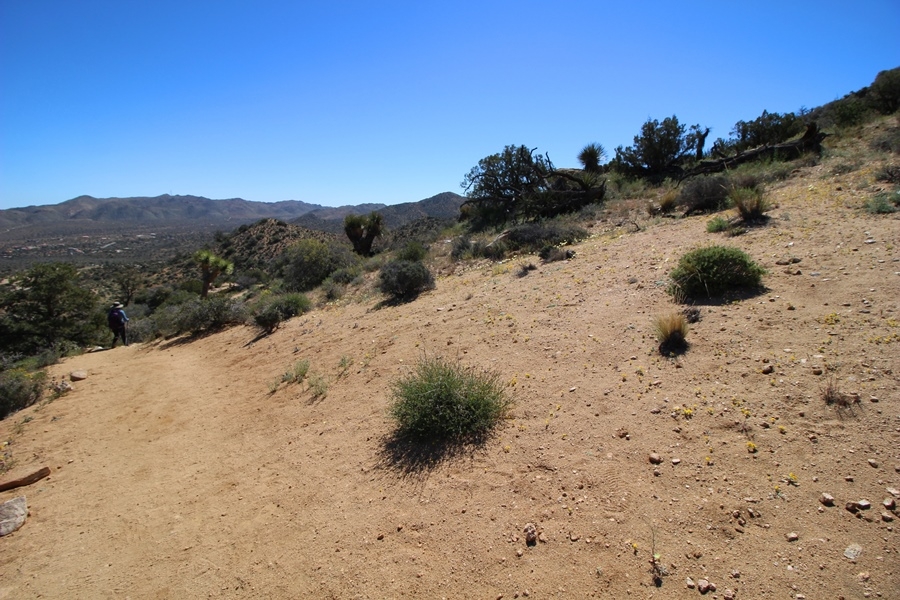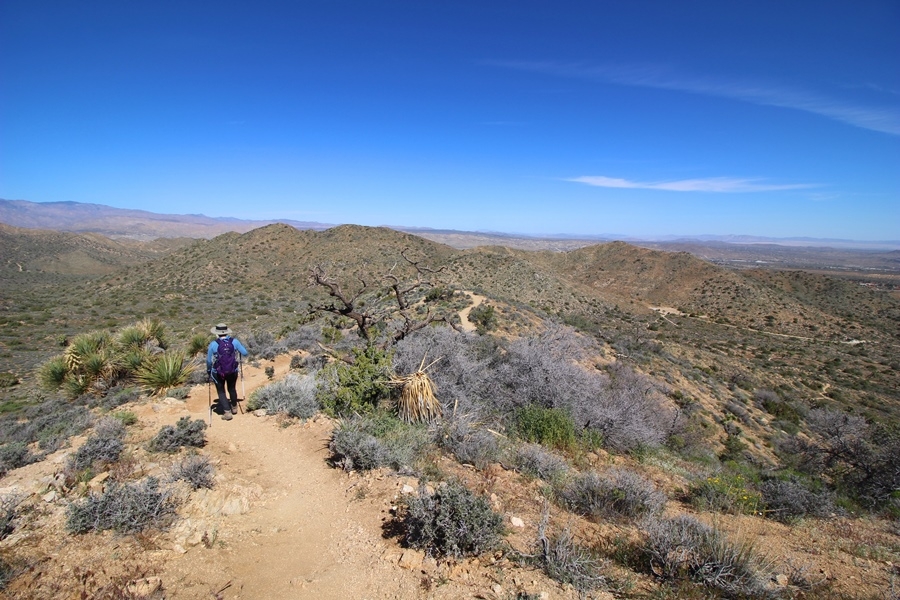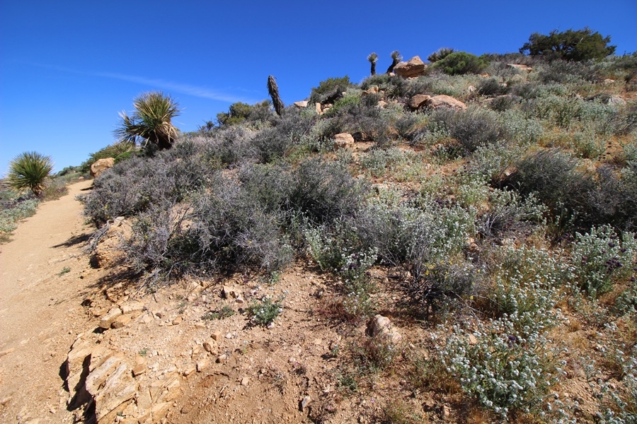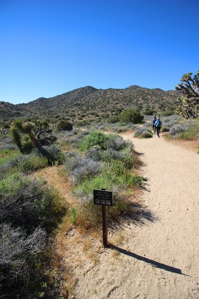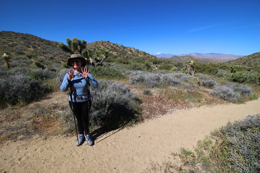 Up early this Sunday morning, we decided to visit the park’s extreme western end and take in some final sights before heading for home. We originally had on our radar a steep-ish hike to Warren Peak, a prominent summit that dominates this area, but, wanting now to save some miles for an alternate stop at the Poppy Reserve on our way back, we chose instead to do a shorter, scenic loop on the High View Nature Trail – we didn’t know quite what to expect given our limited research of this particular hike, and we were pleasantly surprised with a most enjoyable little trip. We found the trailhead easily enough at the end of a smooth dirt road west of the popular Blackrock Campground, and we instinctively chose the higher west fork of the trail when the handful of others there were going east – not at all sure why we headed this direction, but it was, we think, a fortunate choice. The loop is about 1.4 miles long, and it climbs to a high overlook at its midpoint (thus the trail’s name) – however, the eastern trail is steeper while the western is more gradual, although we had yet to realize this. Our track led southward up a gentle grade and into a box canyon, really beautiful in the morning sunlight. At the end of the canyon, we ascended up some short switchbacks to a saddle, there turning north to the high point – there was a steel podium here with a register inside, and we signed in before descending northward down the ridge, passing other parties heading up and crossing the flats at the bottom back to the Jeep. Cynthia completed Mile 9 on the way up and Mile 10 on our return, and we returned to Yucca Valley for some antiquing before turning up Hwy 247 for the long drive back through the desert to the Antelope Valley. A very pleasant tour of the desert this whole weekend with fantastic weather, great company, and beautiful scenery.