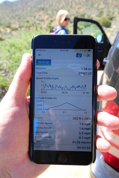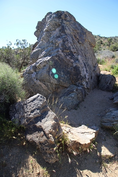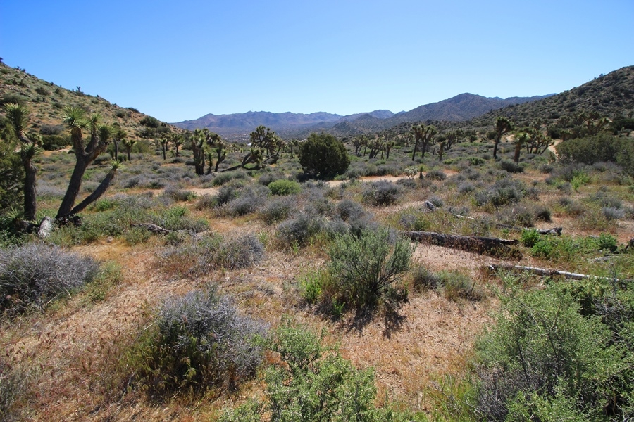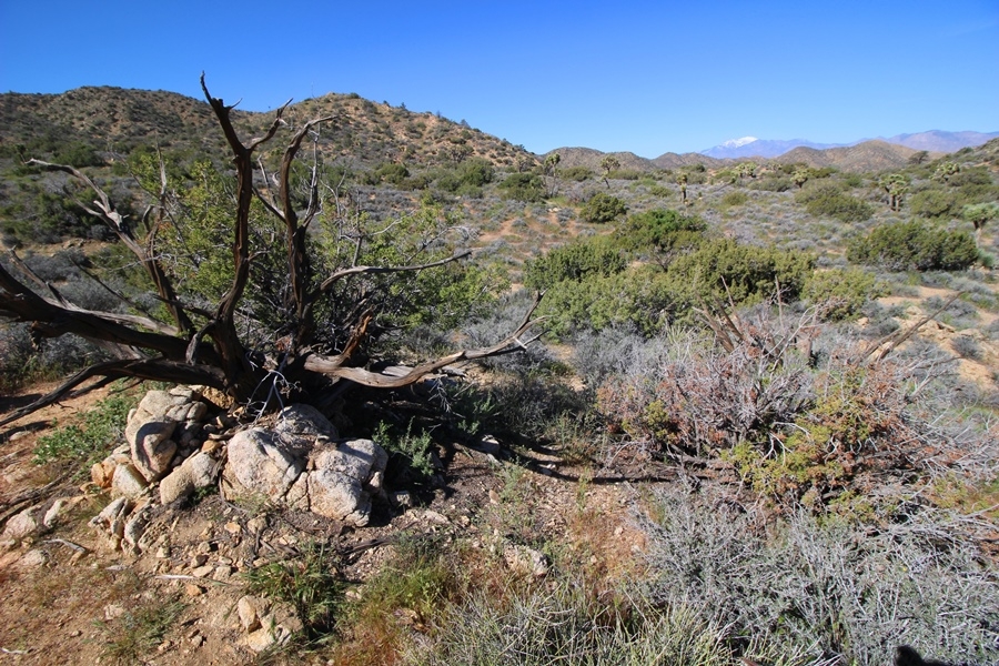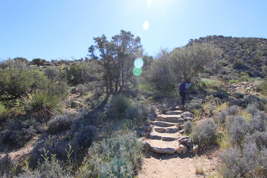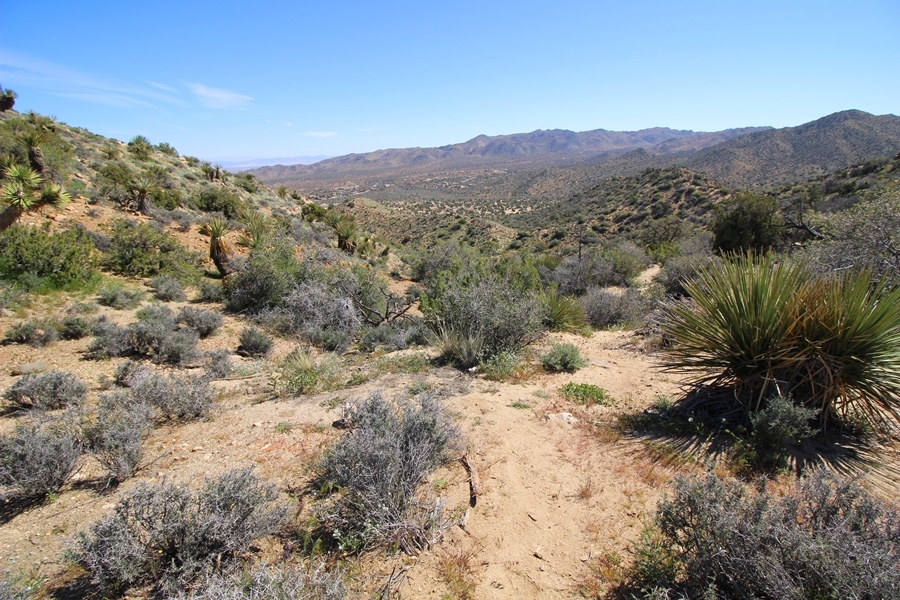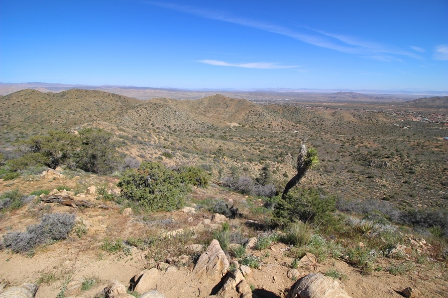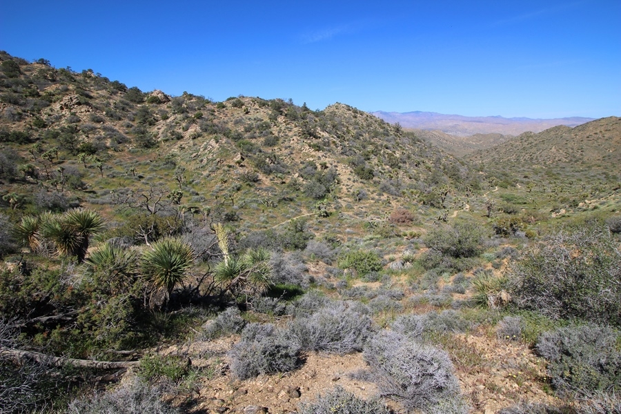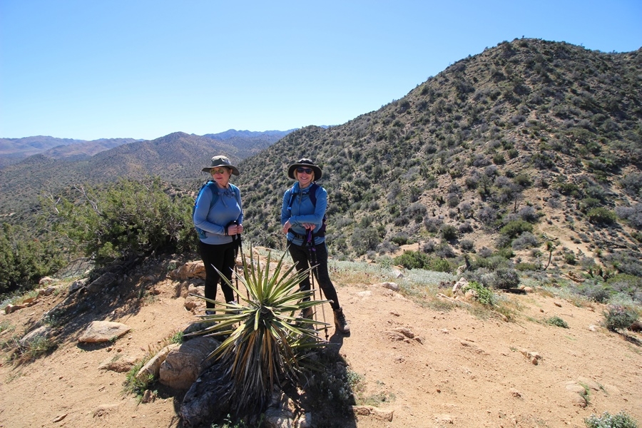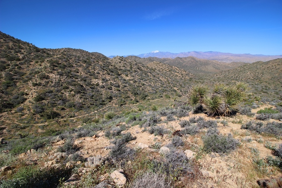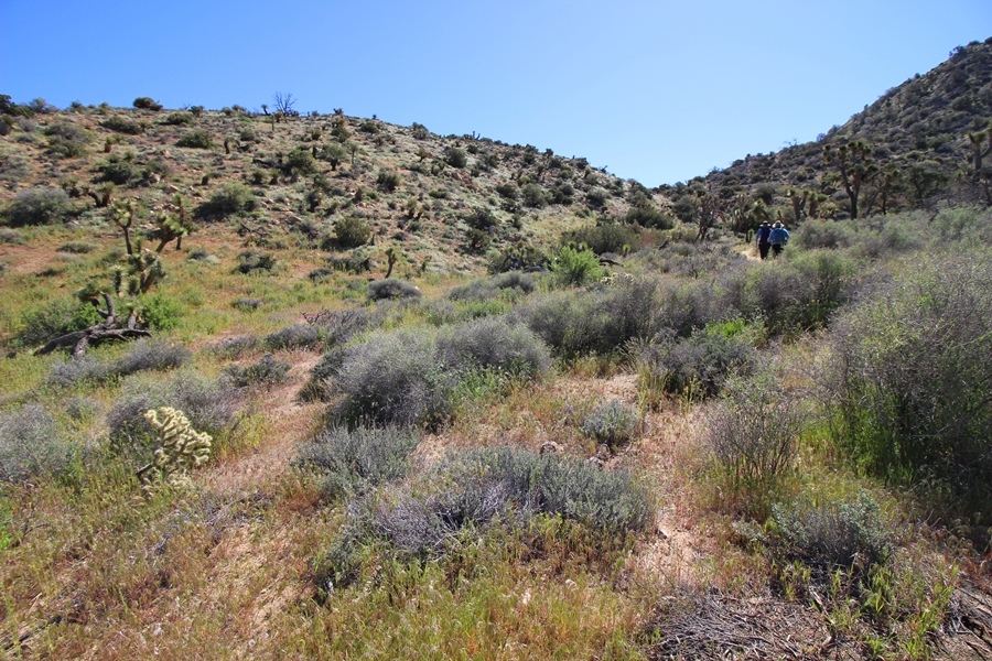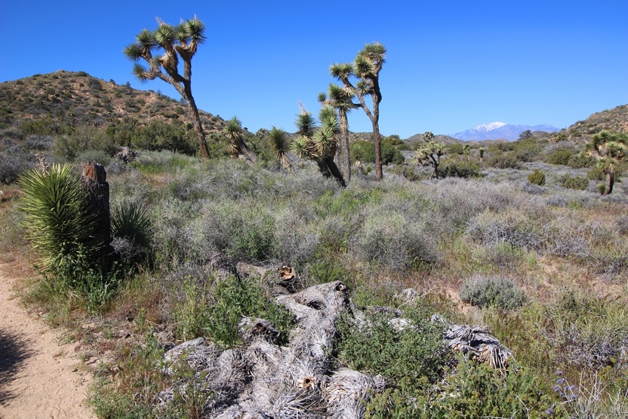 Up early this Sunday morning, we decided to visit the park’s extreme western end and take in some final sights before heading for home. We originally had on our radar a steep-ish hike to Warren Peak, a prominent summit that dominates this area, but, wanting now to save some miles for an alternate stop at the Poppy Reserve on our way back, we chose instead to do a shorter, scenic loop on the High View Nature Trail – we didn’t know quite what to expect given our limited research of this particular hike, and we were pleasantly surprised with a most enjoyable little trip. We found the trailhead easily enough at the end of a smooth dirt road west of the popular Blackrock Campground, and we instinctively chose the higher west fork of the trail when the handful of others there were going east – not at all sure why we headed this direction, but it was, we think, a fortunate choice. The loop is about 1.4 miles long, and it climbs to a high overlook at its midpoint (thus the trail’s name) – however, the eastern trail is steeper while the western is more gradual, although we had yet to realize this. Our track led southward up a gentle grade and into a box canyon, really beautiful in the morning sunlight. At the end of the canyon, we ascended up some short switchbacks to a saddle, there turning north to the high point – there was a steel podium here with a register inside, and we signed in before descending northward down the ridge, passing other parties heading up and crossing the flats at the bottom back to the Jeep. Cynthia completed Mile 9 on the way up and Mile 10 on our return, and we returned to Yucca Valley for some antiquing before turning up Hwy 247 for the long drive back through the desert to the Antelope Valley. A very pleasant tour of the desert this whole weekend with fantastic weather, great company, and beautiful scenery.