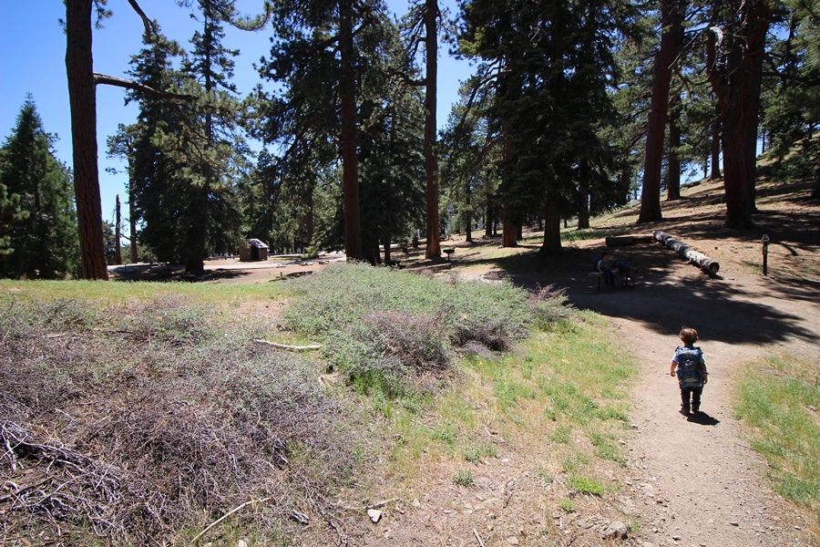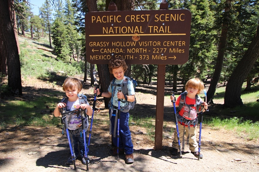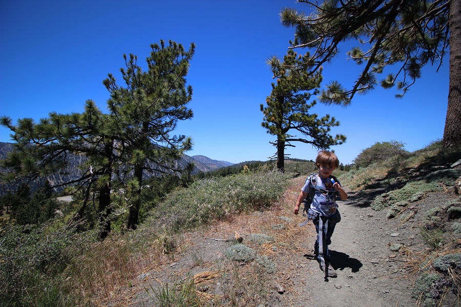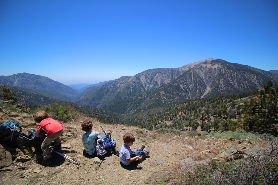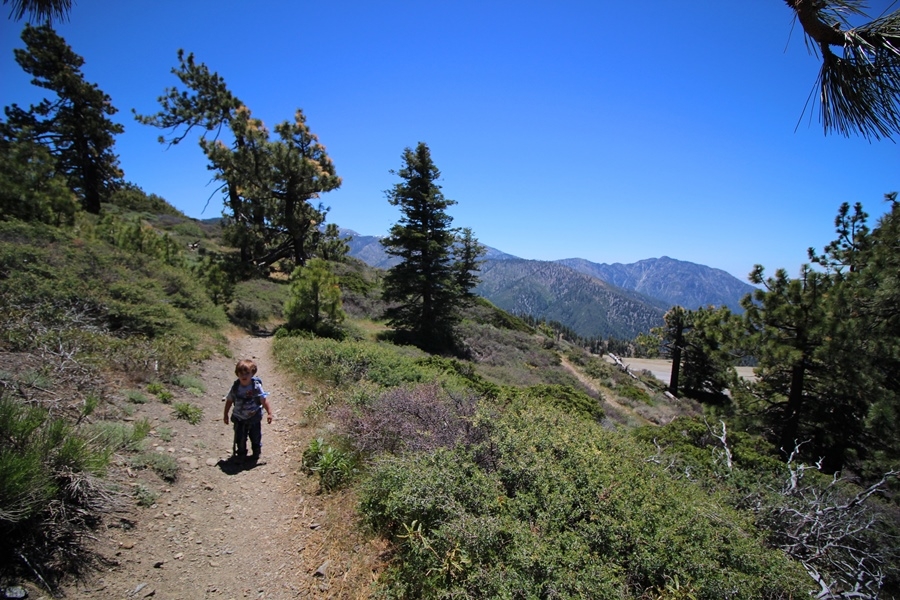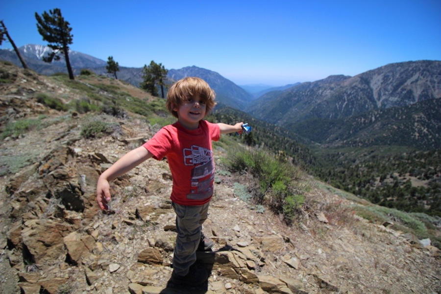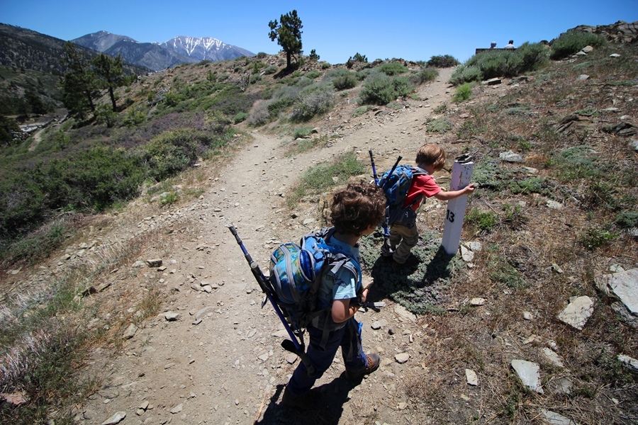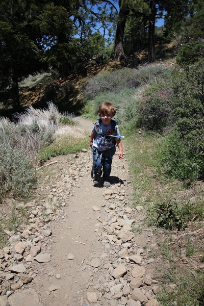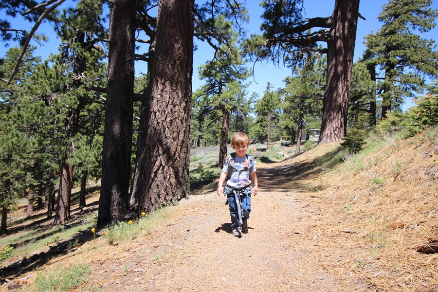 One of the long-standing Wrightwood traditions is having garage sales on Memorial Day weekend, such that people come from all over to shop for treasures at several hundred simultaneous yard sales. While Jane and Chelsea ventured out with the crowds, Chris took all three boys on a hike. The plan was to start at Grassy Hollow and head east up the PCT – unsure of how far we’d get, we packed the boys’ new hydration backpacks with a liter of water each and some lunch and headed out, arriving at Grassy Hollow by about 10:30am. After a pass through the visitor center that is always a treat, the guys were ready to hit the trail, so Chris herded the cats and led them military-patrol style through the day use area and onto the PCT. The trail leads eastward up a short, moderate hill for about 200 yards, then levels out for the next quarter mile – right away, the boys were interested in little else than eating lunch, so we started looking for a break spot, eventually choosing to just plop down next to the trail under the shade of some trees. Jude asked how many miles we had walked to that point, and Chris noted we had covered about 1,900 feet, per the GPS – funny how that seems so far to these little men. Freshly fueled, we set out again, soon reaching the vale below the west side of Lightning Ridge – after another rest break, we started climbing through the pair of switchbacks up to another level traverse across the south face of the ridge, Ollie quietly protesting that this hike was taking forever, his observation affirming our predictably slow pace so far. We soon we passed the high point of this trail section and arrived at the bench above Inspiration Point, finding another couple there ahead of us – the boys enjoyed an extended break here, eating fruit snacks and wondering how long it would take us to get back to the car (Chris wondered that too). After placing rocks atop the PCT milepost near the bench, we headed back west, retracing our steps and arriving back at Grassy Hollow about 2:15pm, 2-year-old Beckett walking the whole way on his own (with some hand-held encouragement from Chris to keep moving at times). A good time was had by all, even Ollie admitting “it was a little fun” to be out on a hike with Pop – the first of many such adventures to come.