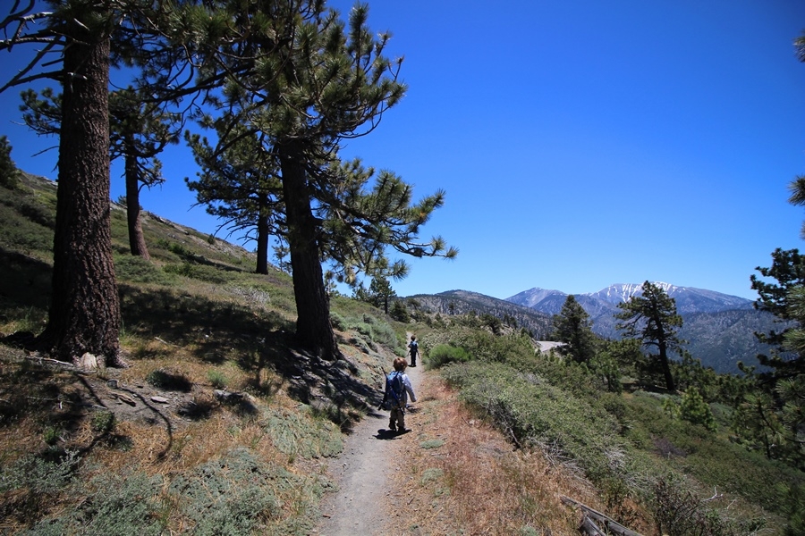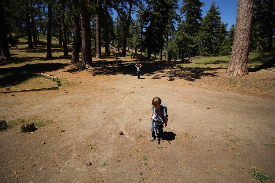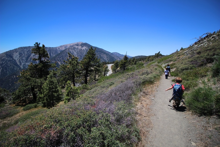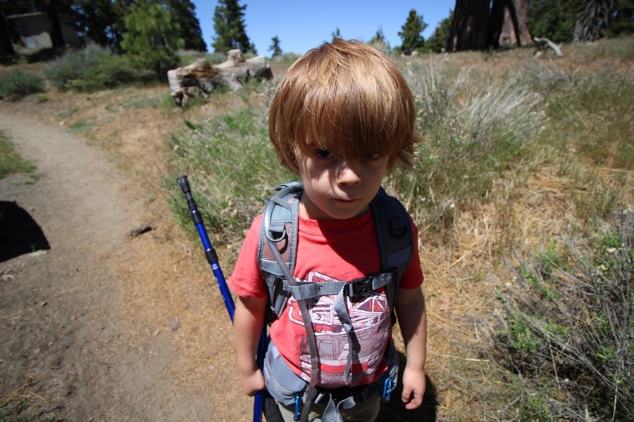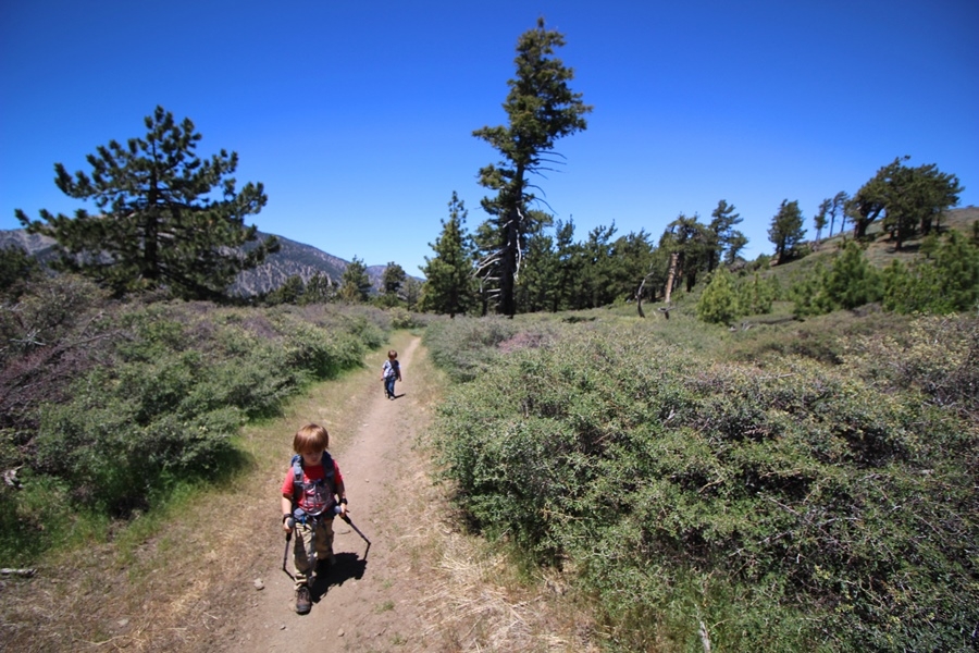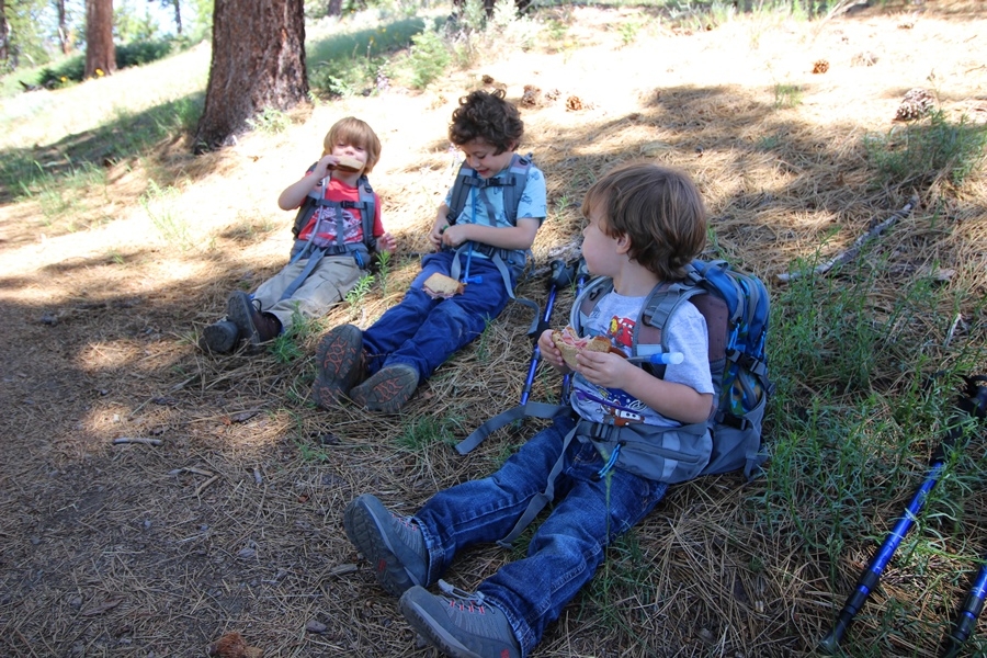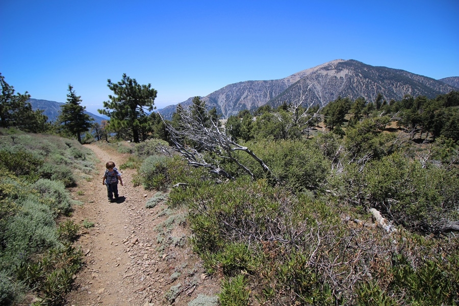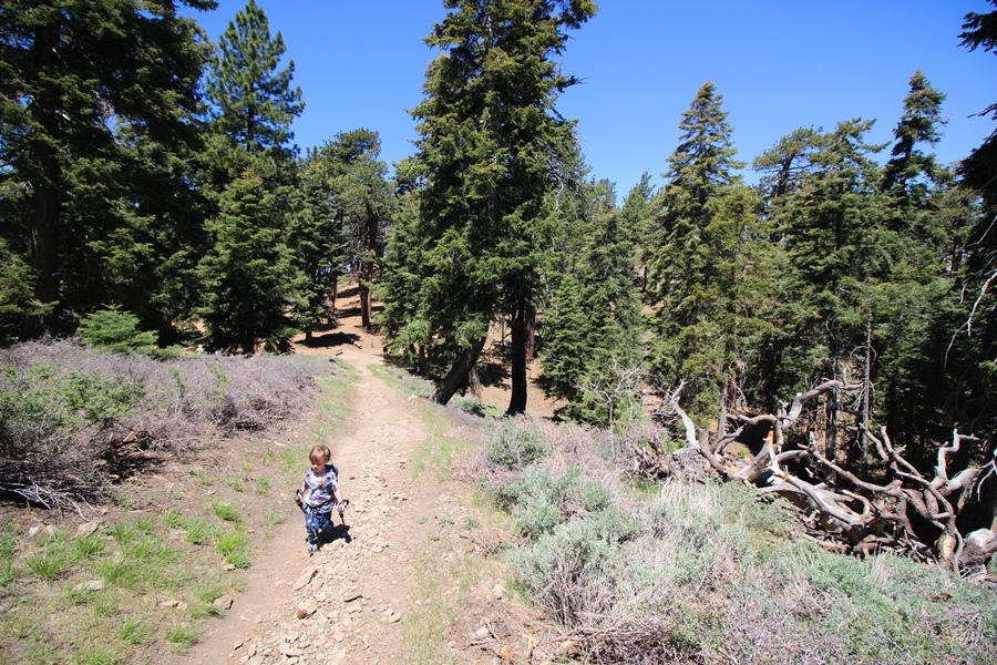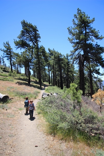 One of the long-standing Wrightwood traditions is having garage sales on Memorial Day weekend, such that people come from all over to shop for treasures at several hundred simultaneous yard sales. While Jane and Chelsea ventured out with the crowds, Chris took all three boys on a hike. The plan was to start at Grassy Hollow and head east up the PCT – unsure of how far we’d get, we packed the boys’ new hydration backpacks with a liter of water each and some lunch and headed out, arriving at Grassy Hollow by about 10:30am. After a pass through the visitor center that is always a treat, the guys were ready to hit the trail, so Chris herded the cats and led them military-patrol style through the day use area and onto the PCT. The trail leads eastward up a short, moderate hill for about 200 yards, then levels out for the next quarter mile – right away, the boys were interested in little else than eating lunch, so we started looking for a break spot, eventually choosing to just plop down next to the trail under the shade of some trees. Jude asked how many miles we had walked to that point, and Chris noted we had covered about 1,900 feet, per the GPS – funny how that seems so far to these little men. Freshly fueled, we set out again, soon reaching the vale below the west side of Lightning Ridge – after another rest break, we started climbing through the pair of switchbacks up to another level traverse across the south face of the ridge, Ollie quietly protesting that this hike was taking forever, his observation affirming our predictably slow pace so far. We soon we passed the high point of this trail section and arrived at the bench above Inspiration Point, finding another couple there ahead of us – the boys enjoyed an extended break here, eating fruit snacks and wondering how long it would take us to get back to the car (Chris wondered that too). After placing rocks atop the PCT milepost near the bench, we headed back west, retracing our steps and arriving back at Grassy Hollow about 2:15pm, 2-year-old Beckett walking the whole way on his own (with some hand-held encouragement from Chris to keep moving at times). A good time was had by all, even Ollie admitting “it was a little fun” to be out on a hike with Pop – the first of many such adventures to come.