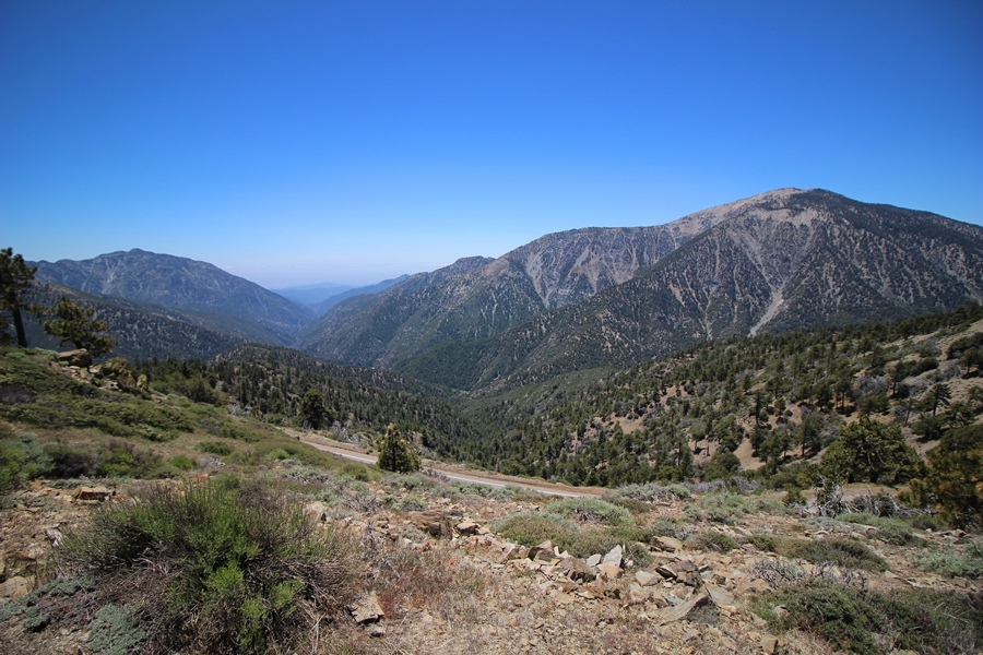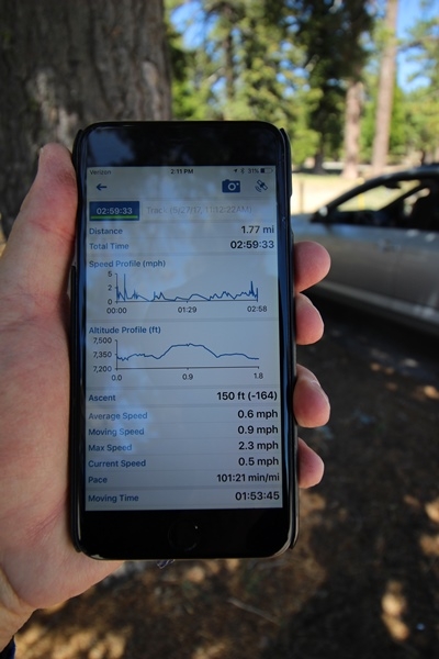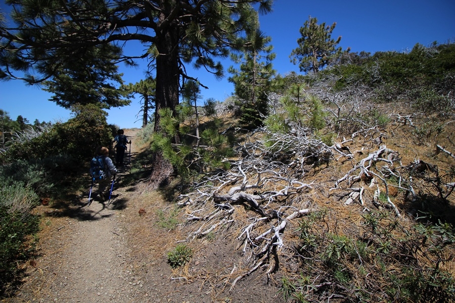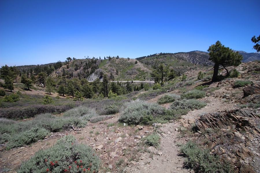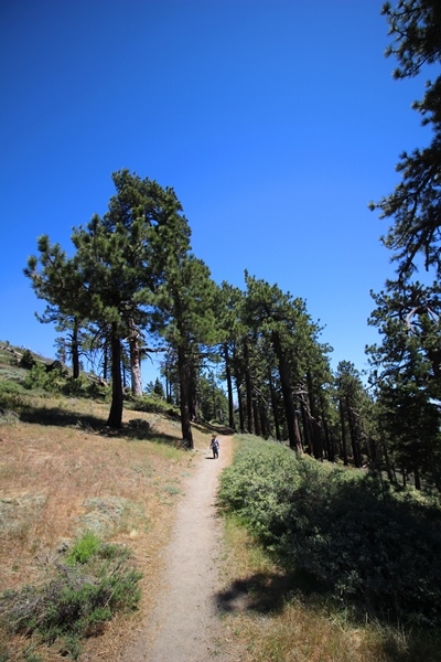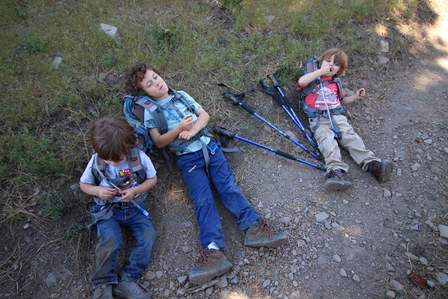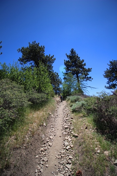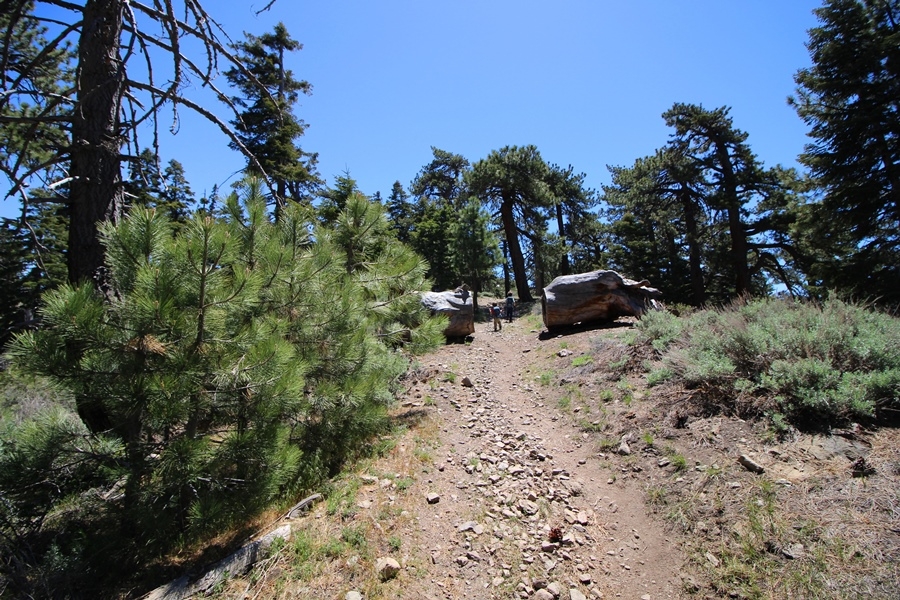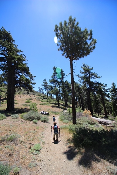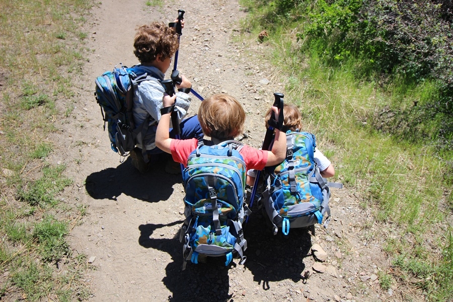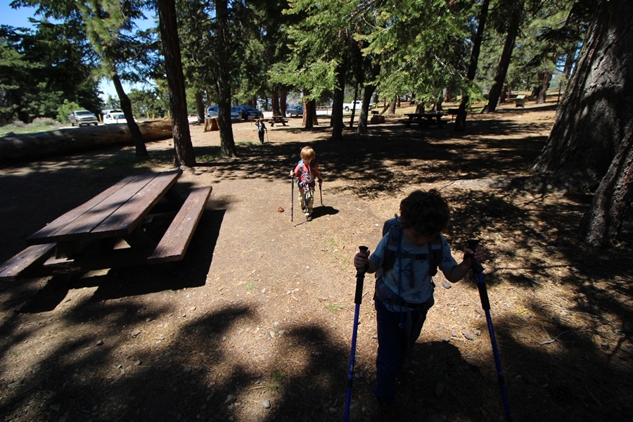 One of the long-standing Wrightwood traditions is having garage sales on Memorial Day weekend, such that people come from all over to shop for treasures at several hundred simultaneous yard sales. While Jane and Chelsea ventured out with the crowds, Chris took all three boys on a hike. The plan was to start at Grassy Hollow and head east up the PCT – unsure of how far we’d get, we packed the boys’ new hydration backpacks with a liter of water each and some lunch and headed out, arriving at Grassy Hollow by about 10:30am. After a pass through the visitor center that is always a treat, the guys were ready to hit the trail, so Chris herded the cats and led them military-patrol style through the day use area and onto the PCT. The trail leads eastward up a short, moderate hill for about 200 yards, then levels out for the next quarter mile – right away, the boys were interested in little else than eating lunch, so we started looking for a break spot, eventually choosing to just plop down next to the trail under the shade of some trees. Jude asked how many miles we had walked to that point, and Chris noted we had covered about 1,900 feet, per the GPS – funny how that seems so far to these little men. Freshly fueled, we set out again, soon reaching the vale below the west side of Lightning Ridge – after another rest break, we started climbing through the pair of switchbacks up to another level traverse across the south face of the ridge, Ollie quietly protesting that this hike was taking forever, his observation affirming our predictably slow pace so far. We soon we passed the high point of this trail section and arrived at the bench above Inspiration Point, finding another couple there ahead of us – the boys enjoyed an extended break here, eating fruit snacks and wondering how long it would take us to get back to the car (Chris wondered that too). After placing rocks atop the PCT milepost near the bench, we headed back west, retracing our steps and arriving back at Grassy Hollow about 2:15pm, 2-year-old Beckett walking the whole way on his own (with some hand-held encouragement from Chris to keep moving at times). A good time was had by all, even Ollie admitting “it was a little fun” to be out on a hike with Pop – the first of many such adventures to come.