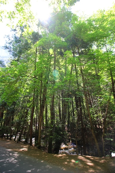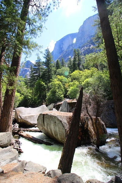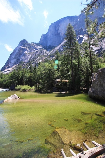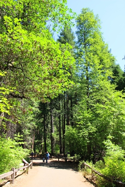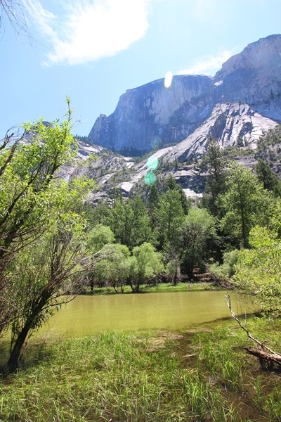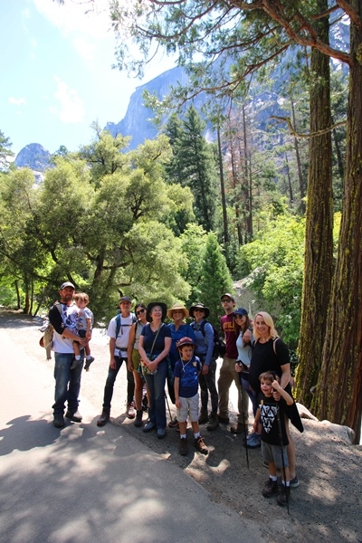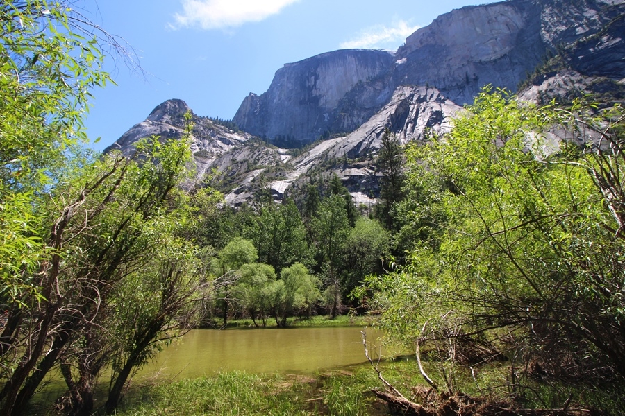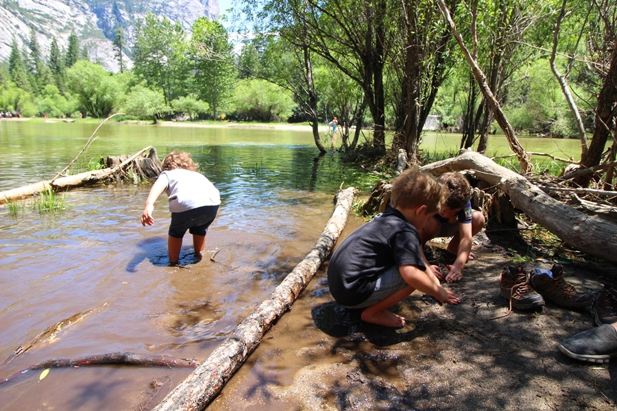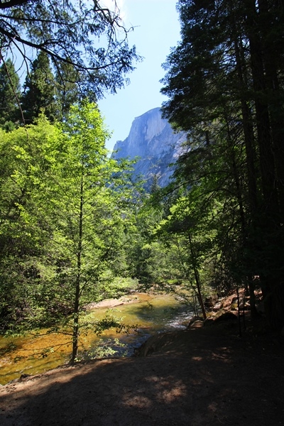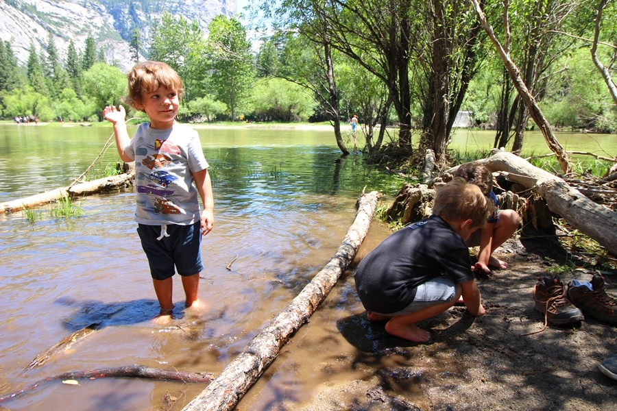 As planned, we all got on the same bus at Happy Isles and got off again two minutes later at the Mirror Lake trailhead – for some reason, we were expecting this hike to be in open sun for most of its one-mile length (wrong) and completely flat (also wrong). Right away, we were presented with a choice of staying left on the paved bike path or going right on a dirt foot trail. A hiker passing the opposite way advised staying left as the foot trail did not connect back to the bike path side until far beyond Mirror Lake, making the round trip five miles instead of two – we went left. Despite the day warming into the 90s in the late morning, the heat was quite bearable in the shade of the trees lining the path – however, the last few hundred yards of the trail involve an 80′ ascent, not a real big deal but enough to warm us up and make us hungry. Most of us had never been to the lake before – Chris recalls just seeing a mud hole on his one visit here as a kid, and the lake does tend to dry out even in the early season. This year, that’s not the case at all – a beautiful still pool about two feet deep beckoned to be stepped into, and many there ahead of us were taking advantage of the opportunity. We plopped down on some nearby rocks and ate a leisurely lunch we had packed in from the cabin, and the boys all shed their shoes for some wading of their own. After lunch, we decided to split up, Barbara and the Arredondos all heading back the way we came to catch the shuttle over to Yosemite Village, the rest of us choosing to hike there instead on the Valley Loop trail. GPS noted 1.2 miles from the bus stop to our lunch spot at Mirror Lake.