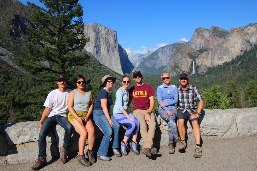 Since our route back to Wawona passed directly by, we decided to stop at Bridalveil Fall on our way out of the valley. Not much of a hike at all, taking just 18 minutes to wander up the 1/4-mile-long paved trail to the fall, snap some photos, and walk back. When honeymooning here 32 years ago, we had taken a self-portrait somewhere along this trail – a favorite photo that still graces a shelf at home – where we had placed Jane’s Canon AE-1 on a rock, set the self-timer, and rushed to the front of the camera before the shutter snapped. It’s a funny picture in that all the trees in the background are leaning, since the rock upon which the camera sat was not at all level. Anyway, we found what we think is the same rock, although the forest area behind it has obviously changed a bit since 1985. We stopped at the east end of the Wawona tunnel to enjoy the grand view into the valley in the late afternoon sun, and we realized Cynthia was within a few steps of completing 20 miles – we called that close enough, and a passerby took a group photo of us to mark the milestone.
