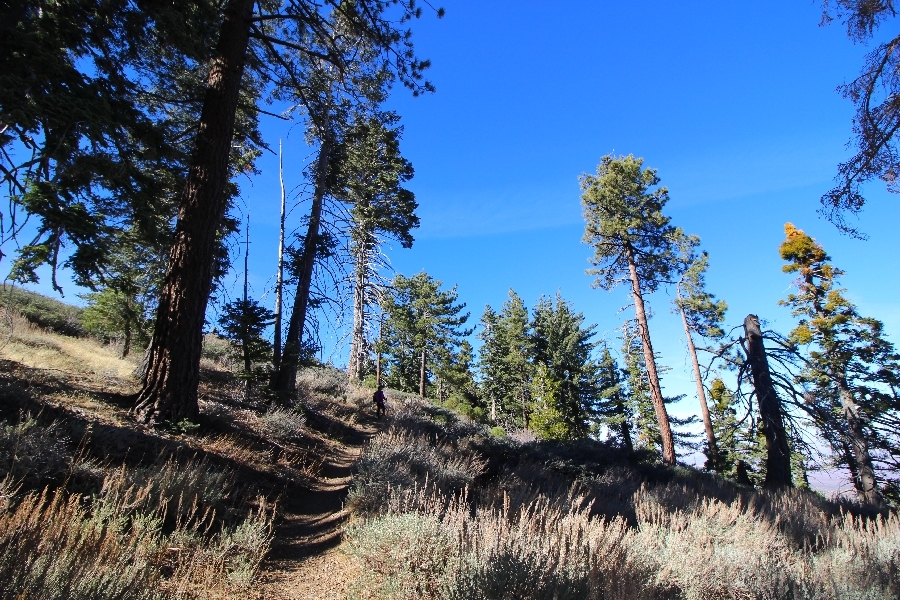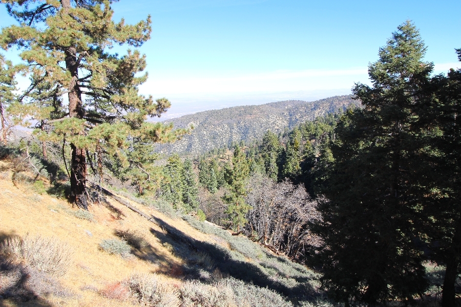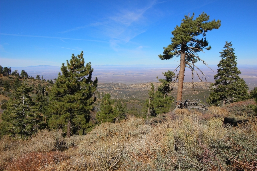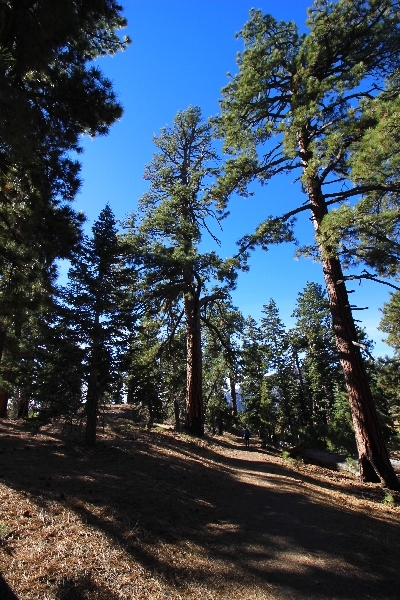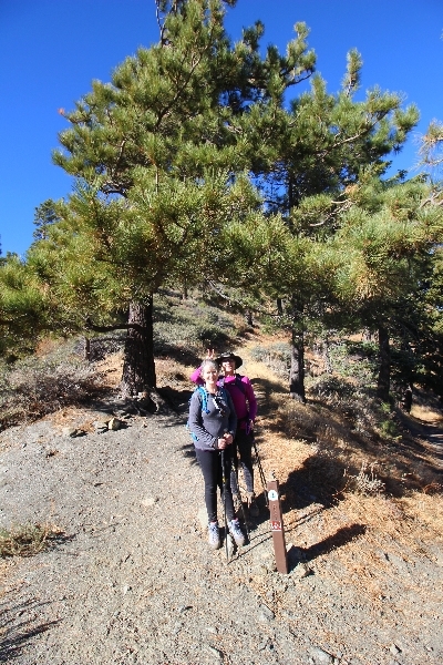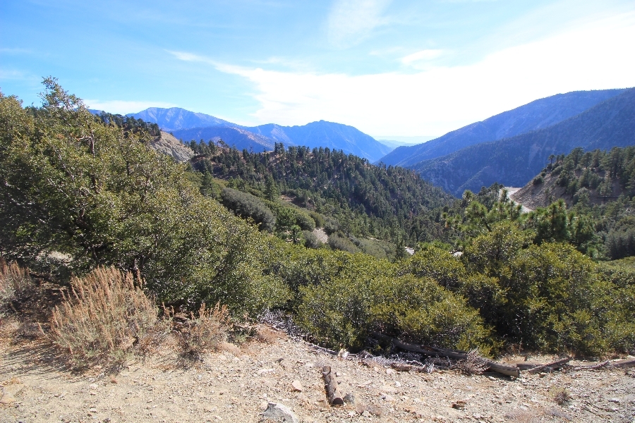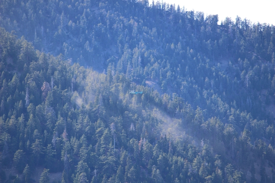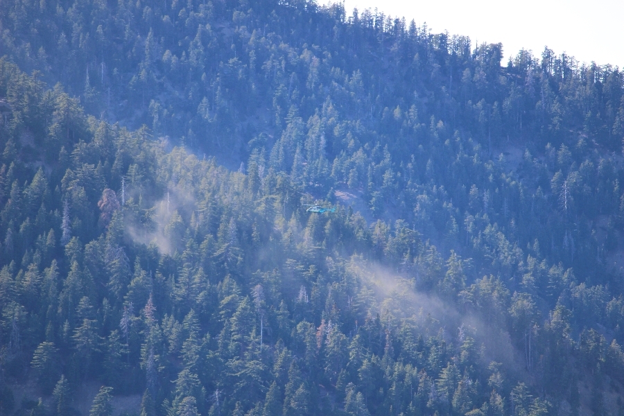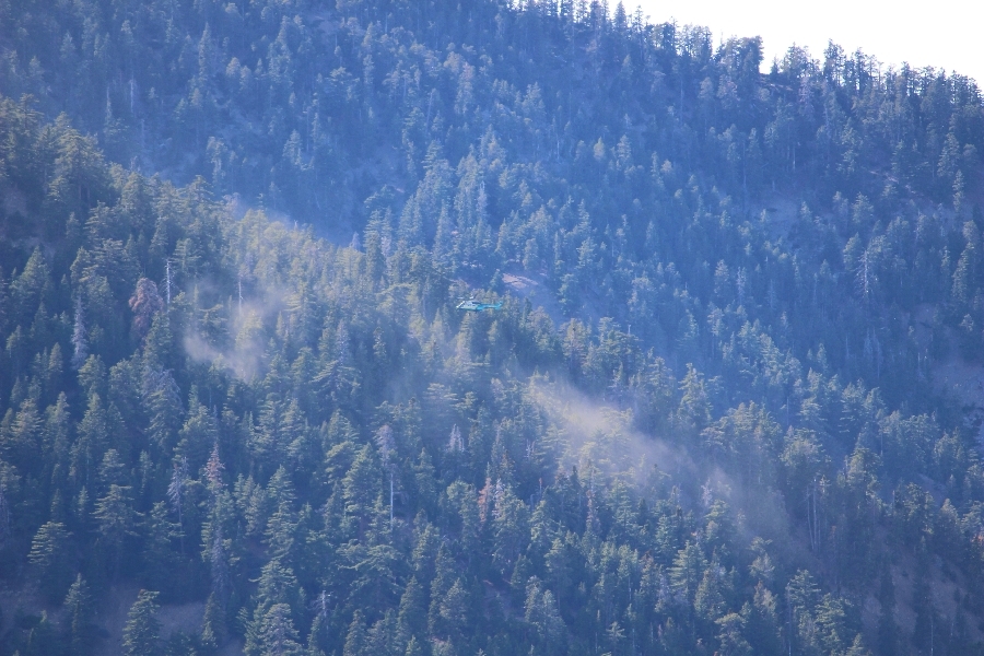 After yesterday’s hike over Throop Peak to Mt. Hawkins and back, we were looking Sunday for something a little lower impact on our sore muscles – Cynthia hadn’t yet been to the Grassy Hollow visitor center, so we dropped into the facility at about 10am before heading west on the PCT. We’ve hiked this section of the trail what seems like dozens of times now, and we decided to simply walk westward for about two miles before turning around, getting Cynthia to Mile 50 in the round trip process. The views over the desert were even clearer than the day before with near zero haze to hinder the grand vistas northward. We climbed up to the trail’s high point near Jackson Flat campground, descending gently past the facility and passing the enormous sugar pine that stands in a vale below to the north. Surprisingly, a quarter mile later we passed a new track dropping steeply into the PCT from the campground above, and its arcing form suggested it was made by mountain bikes, which are not allowed on the PCT – shortly past this intersection, several cyclists came up quickly behind us on a blind curve, only one of whom had a bell on his bike. Collisions were luckily avoided, and the riders disappeared in a cloud of dust to the west. Shortly before the junction with the Jackson Lake trail, we reached our two-mile mark, Jane deciding to continue on westward 1-1/2 miles to Vincent Gap on her own while Chris and Cynthia retraced their steps to Grassy Hollow. The return trip was uneventful, save noticing bicycle tracks on the trail continuously to the first road junction west of the visitor center (incidentally, there are small signs at all the road junctions noting no cyclists allowed – maybe more prominent signs are in order). As Chris and Cynthia were ascending the final knoll near Grassy Hollow, they spied a helicopter hovering high on the north slope of Mt. Baden-Powell. Chris switched to his long lens and was able to capture the aircraft moving in close to the hillside and presumably airlifting someone out – the whole process took just a few minutes, and the chopper quickly zoomed off to the south down the San Gabriel River gorge. Jane, who by this time had arrived at Vincent Gap, got the story from other hikers there – a woman had fallen on the trail, badly cut her knee, and was unable to walk out on her own. Pretty amazing that search and rescue was able to respond so quickly and transport her out for treatment. Cynthia indeed completed Mile 50 at the Grassy Hollow trailhead, and we picked up Jane a few minutes’ drive west on Hwy 2. Lunch at the Wrightwood Brewing Company followed, making a nice relaxing finish to the weekend.