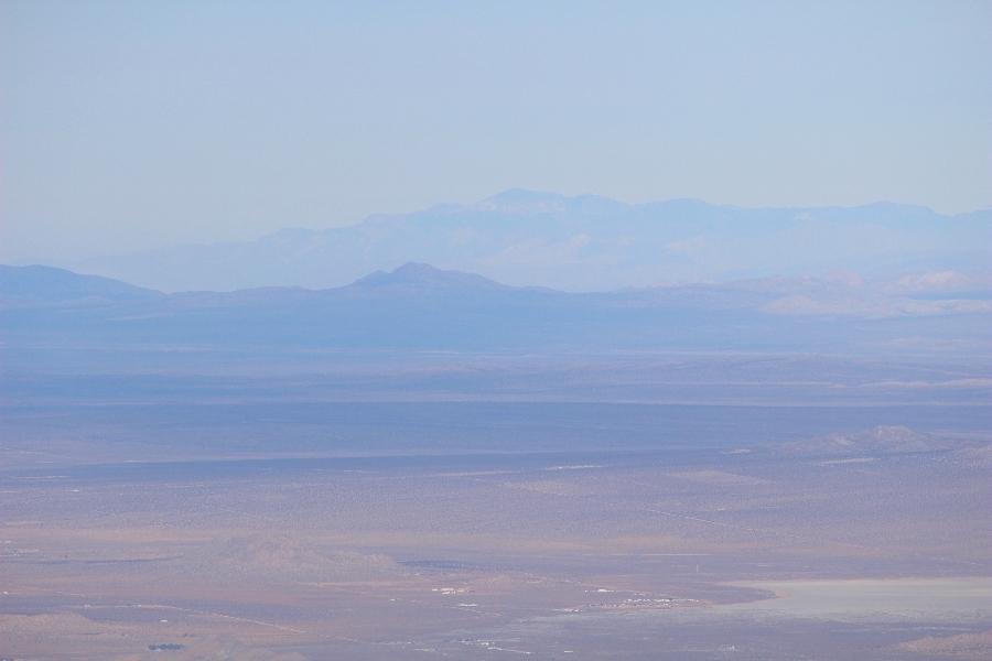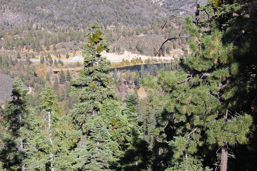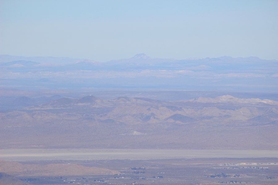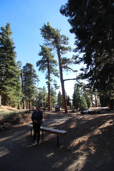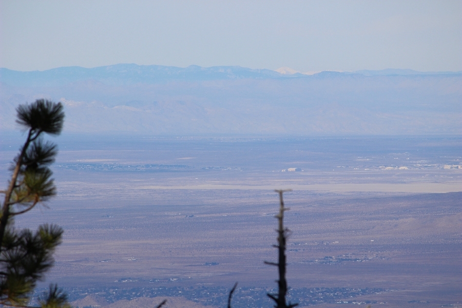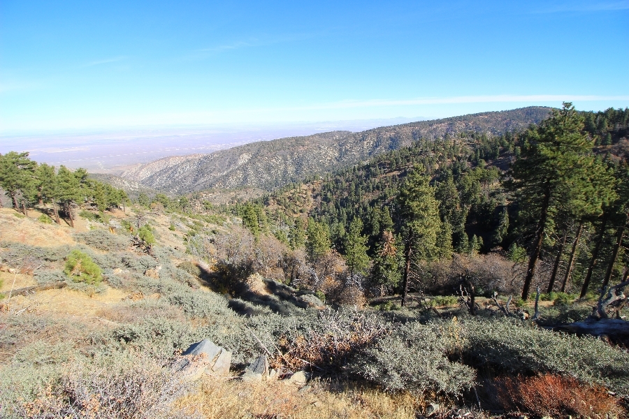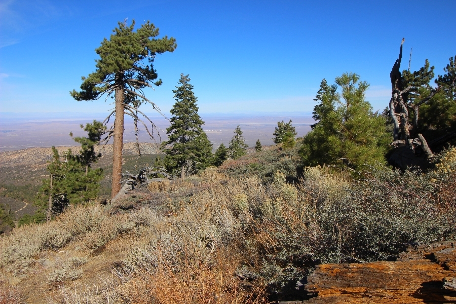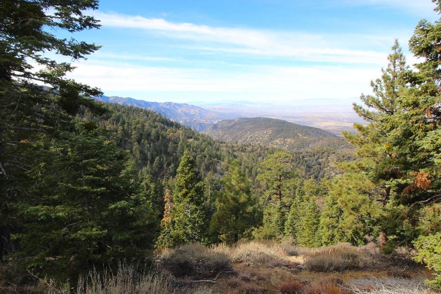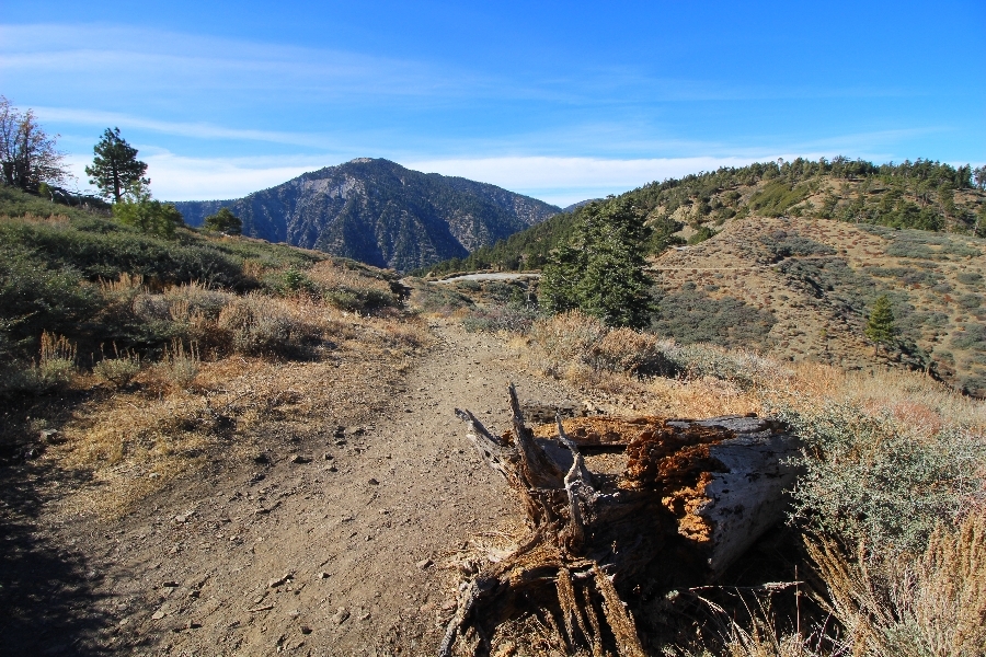 After yesterday’s hike over Throop Peak to Mt. Hawkins and back, we were looking Sunday for something a little lower impact on our sore muscles – Cynthia hadn’t yet been to the Grassy Hollow visitor center, so we dropped into the facility at about 10am before heading west on the PCT. We’ve hiked this section of the trail what seems like dozens of times now, and we decided to simply walk westward for about two miles before turning around, getting Cynthia to Mile 50 in the round trip process. The views over the desert were even clearer than the day before with near zero haze to hinder the grand vistas northward. We climbed up to the trail’s high point near Jackson Flat campground, descending gently past the facility and passing the enormous sugar pine that stands in a vale below to the north. Surprisingly, a quarter mile later we passed a new track dropping steeply into the PCT from the campground above, and its arcing form suggested it was made by mountain bikes, which are not allowed on the PCT – shortly past this intersection, several cyclists came up quickly behind us on a blind curve, only one of whom had a bell on his bike. Collisions were luckily avoided, and the riders disappeared in a cloud of dust to the west. Shortly before the junction with the Jackson Lake trail, we reached our two-mile mark, Jane deciding to continue on westward 1-1/2 miles to Vincent Gap on her own while Chris and Cynthia retraced their steps to Grassy Hollow. The return trip was uneventful, save noticing bicycle tracks on the trail continuously to the first road junction west of the visitor center (incidentally, there are small signs at all the road junctions noting no cyclists allowed – maybe more prominent signs are in order). As Chris and Cynthia were ascending the final knoll near Grassy Hollow, they spied a helicopter hovering high on the north slope of Mt. Baden-Powell. Chris switched to his long lens and was able to capture the aircraft moving in close to the hillside and presumably airlifting someone out – the whole process took just a few minutes, and the chopper quickly zoomed off to the south down the San Gabriel River gorge. Jane, who by this time had arrived at Vincent Gap, got the story from other hikers there – a woman had fallen on the trail, badly cut her knee, and was unable to walk out on her own. Pretty amazing that search and rescue was able to respond so quickly and transport her out for treatment. Cynthia indeed completed Mile 50 at the Grassy Hollow trailhead, and we picked up Jane a few minutes’ drive west on Hwy 2. Lunch at the Wrightwood Brewing Company followed, making a nice relaxing finish to the weekend.