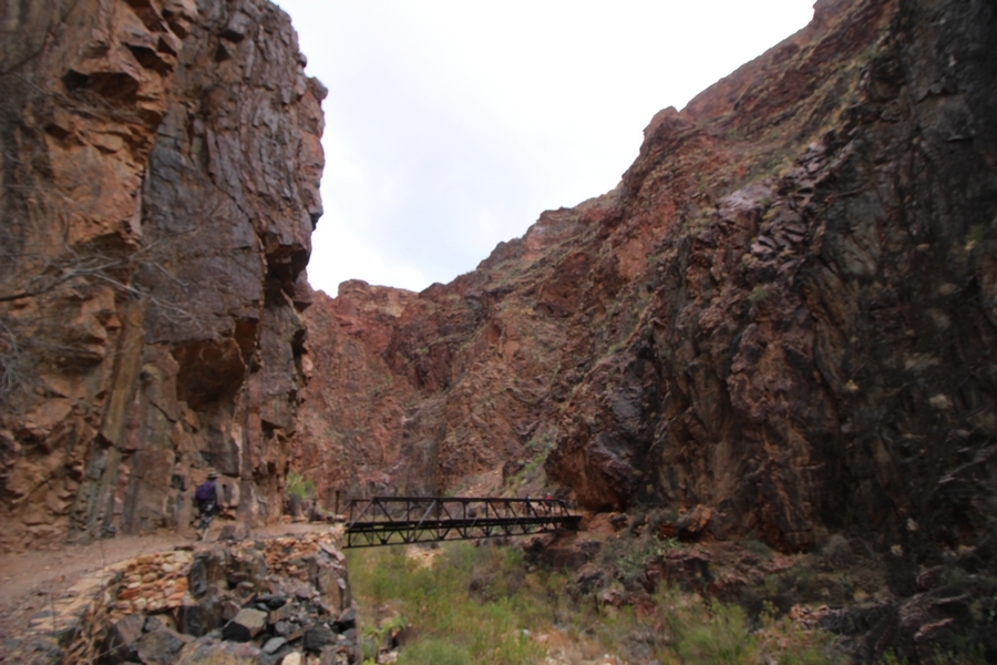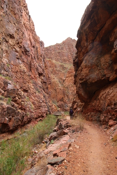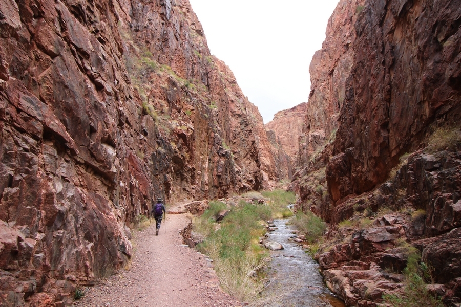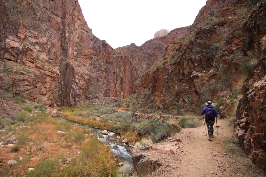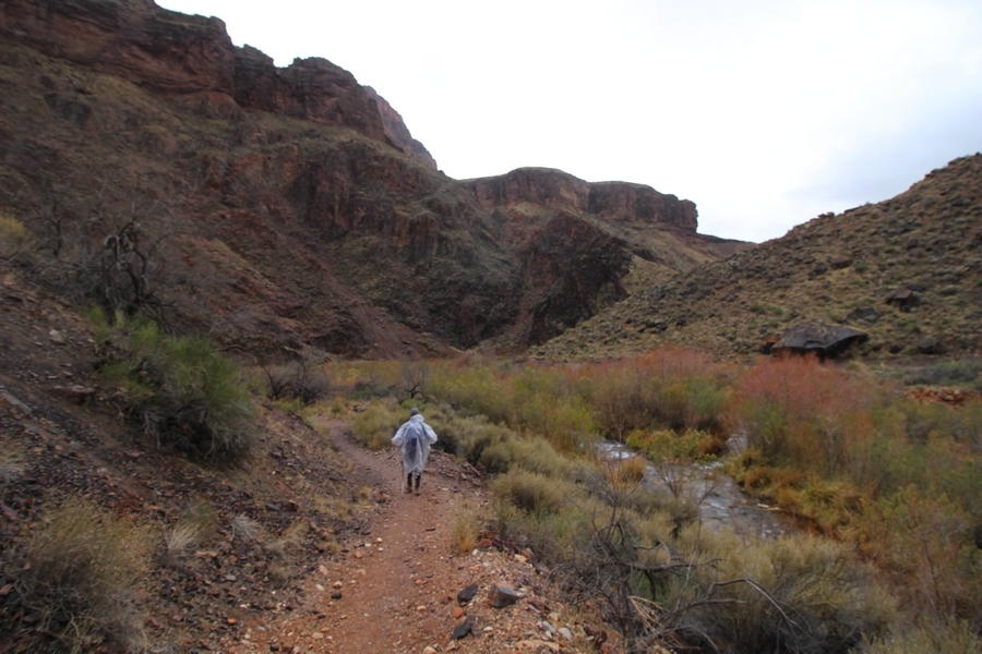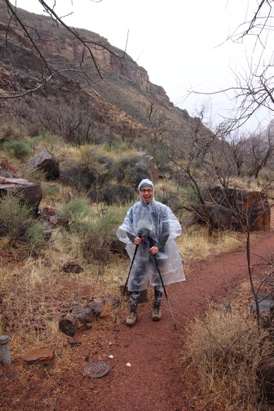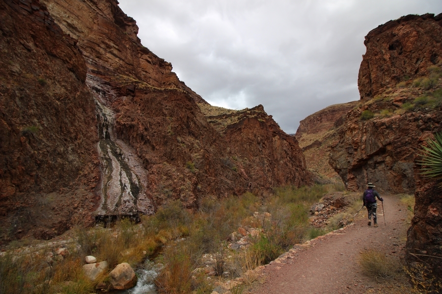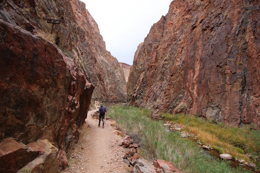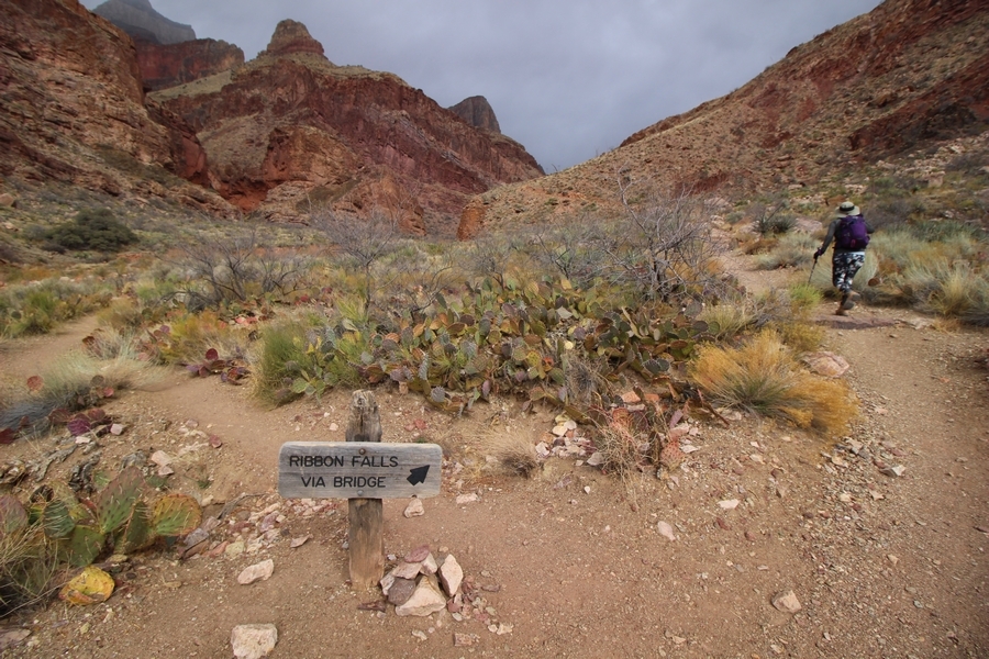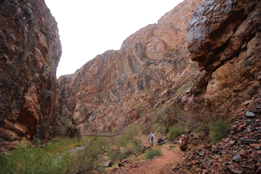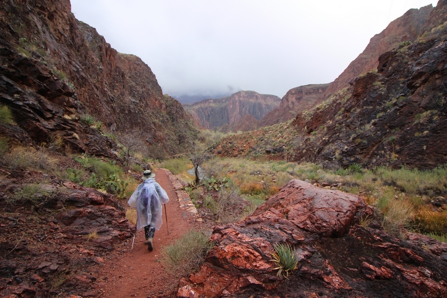 After a mostly-sleepless night in our tent, we showed up for breakfast at Phantom Ranch thinking that we’d perhaps get lucky – we had inquired the night before if any cabin space was available, and they told us it was possible for our second night but they wouldn’t know until morning. So, we were super jazzed when we were told at breakfast we’d have a cabin that night and, oh, would a queen bed be OK? Uh, yeah, that would be fine, and we happily paid another $160 for the privilege – the only catch was that the room wouldn’t be ready until after lunch, so that left us with a handful of choices for what to do with our day. We walked back to the campground to at least pack up our things there, and of course it started to rain just as we did so – just a few sprinkles at this point, but it looked like it could definitely get worse, so we got things ready in a hurry and headed back to Phantom Ranch. Once there, we were told we could stash our stuff in a corner of the dining hall, so we dropped our gear and started discussing where to go on a “short” day hike. We could head east up the Clear Creek Trail for some new views down the river gorge, but a 1,500′ up-and-down over 2.5 one-way miles didn’t sound very appealing – nor did walking back to the river and exploring various use trails there, since we’d be walking out that way tomorrow. That left walking northward up Bright Angel Canyon on the North Kaibab trail, the main route to reach the North Rim some 14 miles away. About six miles upcanyon was the popular destination of Ribbon Falls, one of the few perennial falls in the park, but Chris’ ankles and hips were quite sore from yesterday’s descent, and he didn’t want to walk 12 miles today, even though the hike was described by other guests as “flat”. We were told there was a series of bridges over Bright Angel Creek up that way, and we agreed we’d at least check those out and walk until we felt like heading back – we left under high cloudy skies, Chris knowing in his gut that we’d be walking the full 12 miles today, despite his protests. Immediately north of Phantom Ranch is The Box, a narrow stretch of the canyon that twists and turns, known for its absence of wind and its resulting unbearable heat during the summer. Heat would not be an issue for us today, although it was not too cold that we had to wear jackets – our wool midlayers were fine. The trail was indeed a very mild gradient, and we made good time through The Box and across the first two bridges. About two miles separate the second and third spans, and this stretch of trail was an interesting but repetitive series of cliffs and creek bends, the firm trail winding its way northward never more than a few yards from the creek. Past the third and fourth bridges, the canyon began to widen, offering better views both to the surrounding clifftops and upper terrain features as well as to the North Rim well off in the distance. The high sky also began to give way to rolling cloud cover as the weather indeed took a turn, although the intermittent sprinkles were never constant enough for us to pull out our rain gear. At 5.5 miles out, Chris began to look for the side canyon to the west within which lies Ribbon Falls – the most prominent one held no fall, nor did the one after, and he began to think this would be an even longer outing that he had dreaded. We soon came to a sign indicating that the Ribbon Falls bridge was ahead, but it was also clear that the route to the bridge entailed what looked to be a steep climb up and over a tall shelf extending into the canyon – alternatively, we could see a use trail leading left into the brush, presumably to a bridgeless crossing of Bright Angel Creek. We prudently but reluctantly chose the bridge option – the climb wasn’t bad, but we added at least a mile round trip distance by pushing north, then backtracking south and west over the bridge. At least we could see the fall from the shelf, and we entered the side canyon, picking our way up various use trail threads to the base of the cascades. It was quite the sight – the main fall dropped directly down onto a large rock platform, most of the flow dropping further down the rock face and watering the mossy surface there, while the remainder of the water flowed down the back of the platform and down around the sides into the main pool below. Jane had been told to explore all the way up in back of the fall, so up she went with Chris following – it was very cool, and definitely worth the effort to get here. After some pictures, we made our way out to a rock ledge just southeast of the fall, where we had a full view of the fall from its top to its pool, and ate some lunch that the Ranch had packed for us. The clouds had started to thicken and darken by this time, so we made our way east back into the main canyon, choosing to follow a shortcut use trail that indeed led back to the bridgeless creek crossing we had suspected was there. The creek was more than a little swollen, although it looked possible to get across using some larger rocks – Jane went first, her trekking poles in about 18″ of water as she steadied herself. The crux of her passage came as she had to make two quick and long steps on three successive rocks, which she did in a most precarious fashion – she was saved from a certain dunking when her pole caught up in a tree branch on the far bank, giving her enough stability to fortunately regain her balance. Super lucky. Chris learned a lesson or two from her example on which rocks were more stable, and he was able to get across the rushing water without incident. Now on the east bank, we quickly found the main trail ahead and started the long walk back. The rain got steadily worse over the next 30 minutes, and we ultimately resorted to breaking out the plastic ponchos Jane had insisted on buying when we arrived on the South Rim two days earlier (we both have nice, breathable rain ja