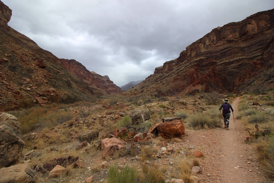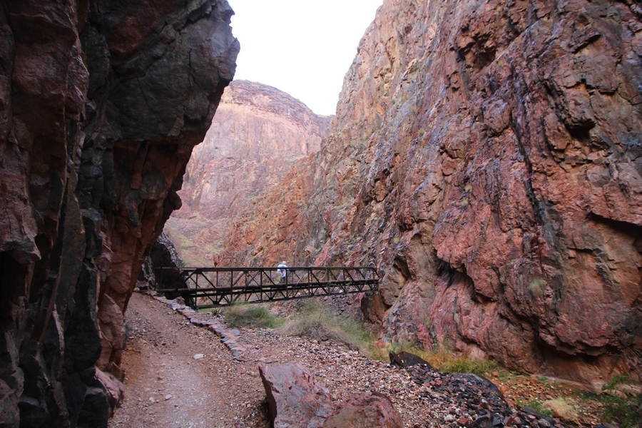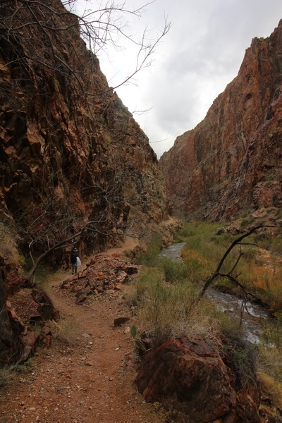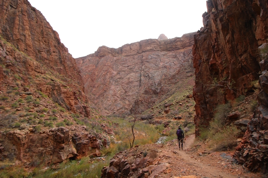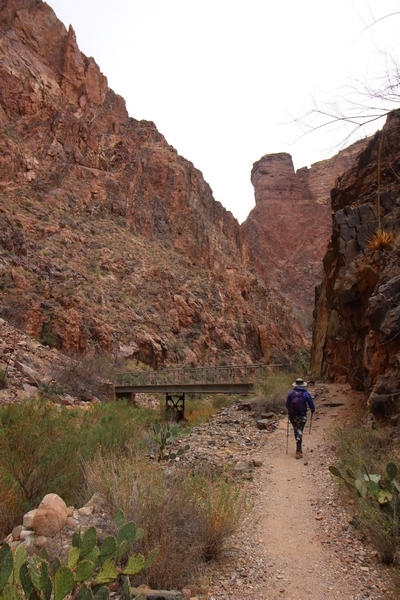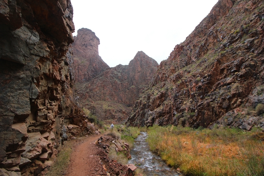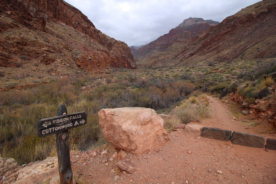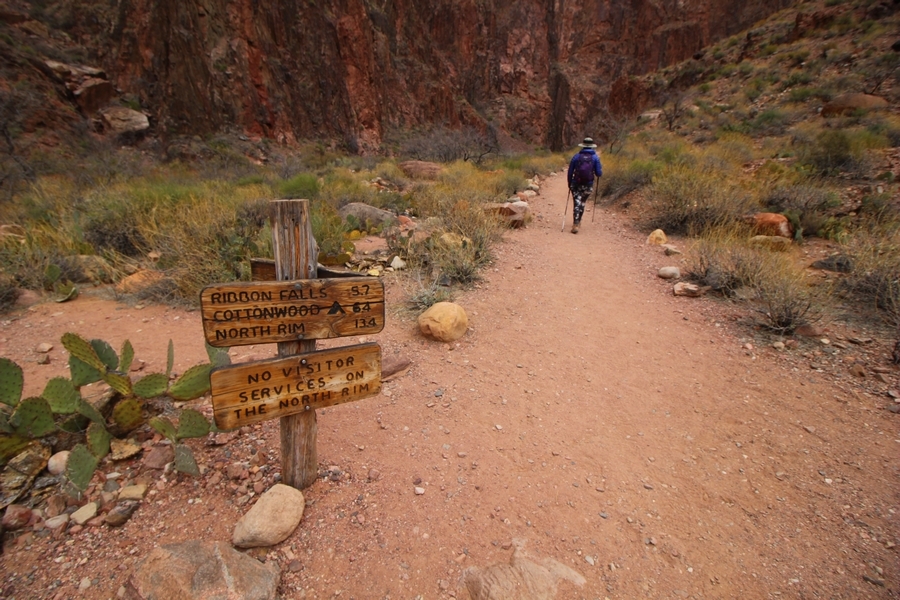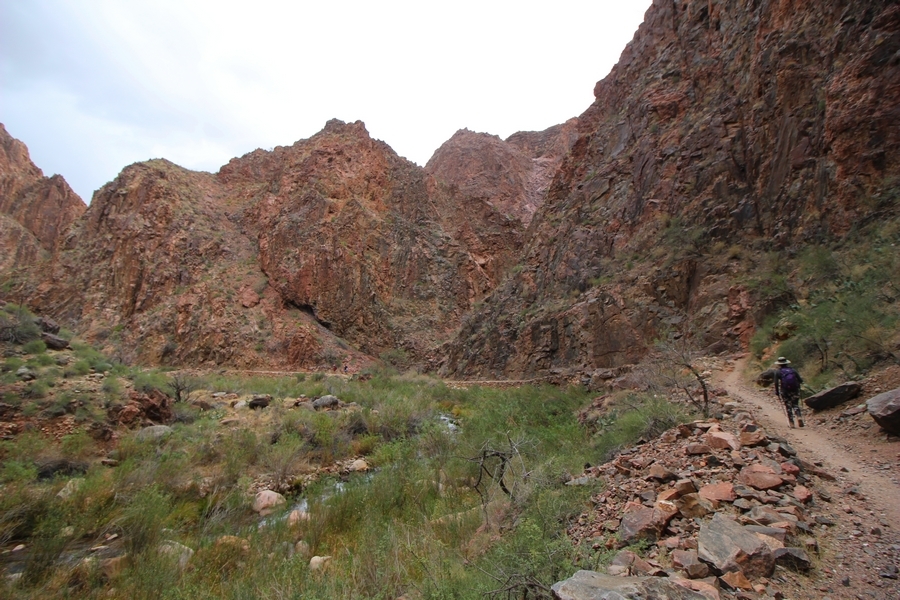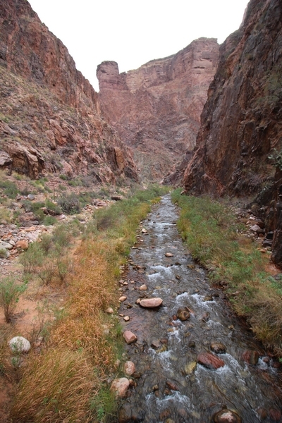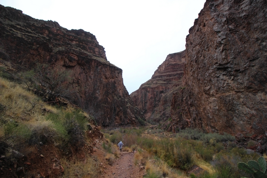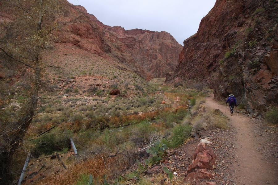 After a mostly-sleepless night in our tent, we showed up for breakfast at Phantom Ranch thinking that we’d perhaps get lucky – we had inquired the night before if any cabin space was available, and they told us it was possible for our second night but they wouldn’t know until morning. So, we were super jazzed when we were told at breakfast we’d have a cabin that night and, oh, would a queen bed be OK? Uh, yeah, that would be fine, and we happily paid another $160 for the privilege – the only catch was that the room wouldn’t be ready until after lunch, so that left us with a handful of choices for what to do with our day. We walked back to the campground to at least pack up our things there, and of course it started to rain just as we did so – just a few sprinkles at this point, but it looked like it could definitely get worse, so we got things ready in a hurry and headed back to Phantom Ranch. Once there, we were told we could stash our stuff in a corner of the dining hall, so we dropped our gear and started discussing where to go on a “short” day hike. We could head east up the Clear Creek Trail for some new views down the river gorge, but a 1,500′ up-and-down over 2.5 one-way miles didn’t sound very appealing – nor did walking back to the river and exploring various use trails there, since we’d be walking out that way tomorrow. That left walking northward up Bright Angel Canyon on the North Kaibab trail, the main route to reach the North Rim some 14 miles away. About six miles upcanyon was the popular destination of Ribbon Falls, one of the few perennial falls in the park, but Chris’ ankles and hips were quite sore from yesterday’s descent, and he didn’t want to walk 12 miles today, even though the hike was described by other guests as “flat”. We were told there was a series of bridges over Bright Angel Creek up that way, and we agreed we’d at least check those out and walk until we felt like heading back – we left under high cloudy skies, Chris knowing in his gut that we’d be walking the full 12 miles today, despite his protests. Immediately north of Phantom Ranch is The Box, a narrow stretch of the canyon that twists and turns, known for its absence of wind and its resulting unbearable heat during the summer. Heat would not be an issue for us today, although it was not too cold that we had to wear jackets – our wool midlayers were fine. The trail was indeed a very mild gradient, and we made good time through The Box and across the first two bridges. About two miles separate the second and third spans, and this stretch of trail was an interesting but repetitive series of cliffs and creek bends, the firm trail winding its way northward never more than a few yards from the creek. Past the third and fourth bridges, the canyon began to widen, offering better views both to the surrounding clifftops and upper terrain features as well as to the North Rim well off in the distance. The high sky also began to give way to rolling cloud cover as the weather indeed took a turn, although the intermittent sprinkles were never constant enough for us to pull out our rain gear. At 5.5 miles out, Chris began to look for the side canyon to the west within which lies Ribbon Falls – the most prominent one held no fall, nor did the one after, and he began to think this would be an even longer outing that he had dreaded. We soon came to a sign indicating that the Ribbon Falls bridge was ahead, but it was also clear that the route to the bridge entailed what looked to be a steep climb up and over a tall shelf extending into the canyon – alternatively, we could see a use trail leading left into the brush, presumably to a bridgeless crossing of Bright Angel Creek. We prudently but reluctantly chose the bridge option – the climb wasn’t bad, but we added at least a mile round trip distance by pushing north, then backtracking south and west over the bridge. At least we could see the fall from the shelf, and we entered the side canyon, picking our way up various use trail threads to the base of the cascades. It was quite the sight – the main fall dropped directly down onto a large rock platform, most of the flow dropping further down the rock face and watering the mossy surface there, while the remainder of the water flowed down the back of the platform and down around the sides into the main pool below. Jane had been told to explore all the way up in back of the fall, so up she went with Chris following – it was very cool, and definitely worth the effort to get here. After some pictures, we made our way out to a rock ledge just southeast of the fall, where we had a full view of the fall from its top to its pool, and ate some lunch that the Ranch had packed for us. The clouds had started to thicken and darken by this time, so we made our way east back into the main canyon, choosing to follow a shortcut use trail that indeed led back to the bridgeless creek crossing we had suspected was there. The creek was more than a little swollen, although it looked possible to get across using some larger rocks – Jane went first, her trekking poles in about 18″ of water as she steadied herself. The crux of her passage came as she had to make two quick and long steps on three successive rocks, which she did in a most precarious fashion – she was saved from a certain dunking when her pole caught up in a tree branch on the far bank, giving her enough stability to fortunately regain her balance. Super lucky. Chris learned a lesson or two from her example on which rocks were more stable, and he was able to get across the rushing water without incident. Now on the east bank, we quickly found the main trail ahead and started the long walk back. The rain got steadily worse over the next 30 minutes, and we ultimately resorted to breaking out the plastic ponchos Jane had insisted on buying when we arrived on the South Rim two days earlier (we both have nice, breathable rain ja