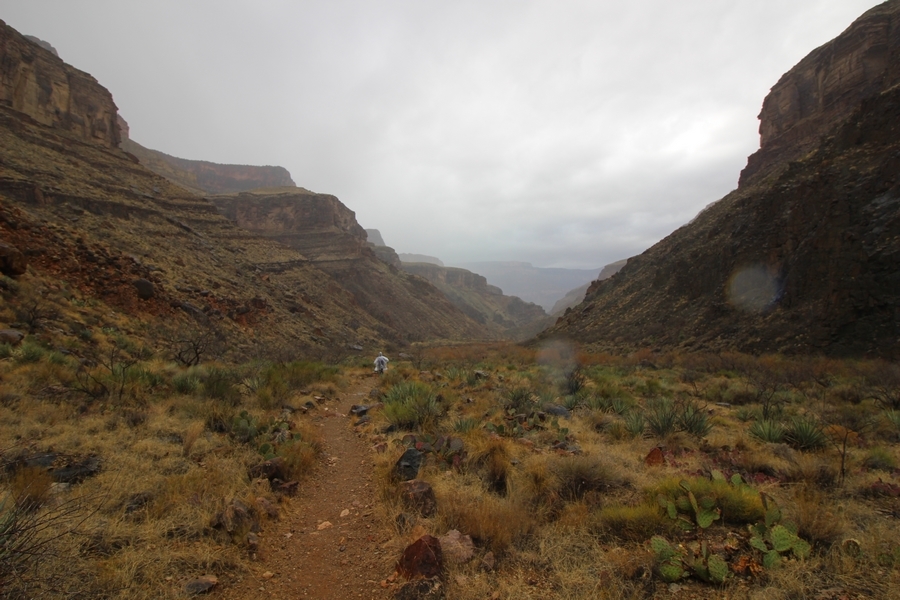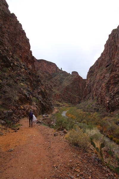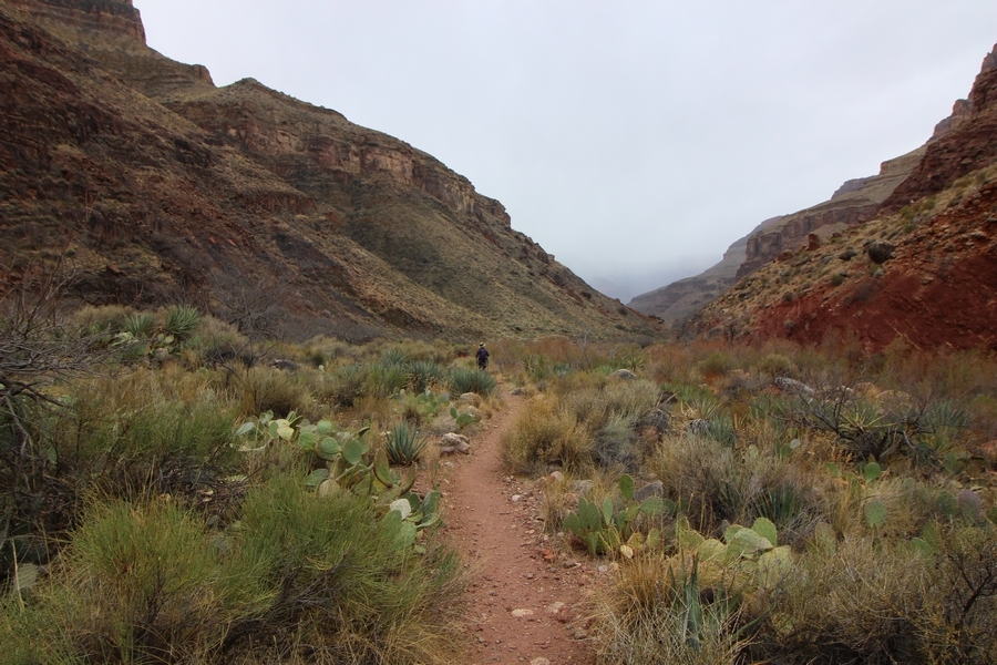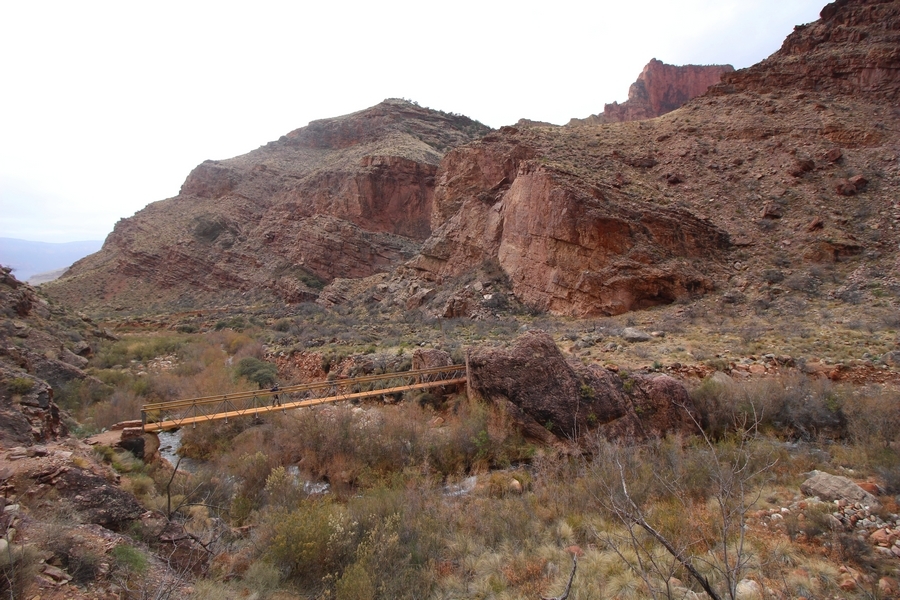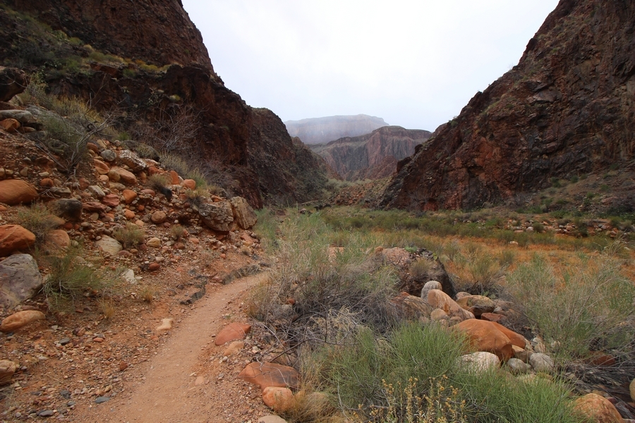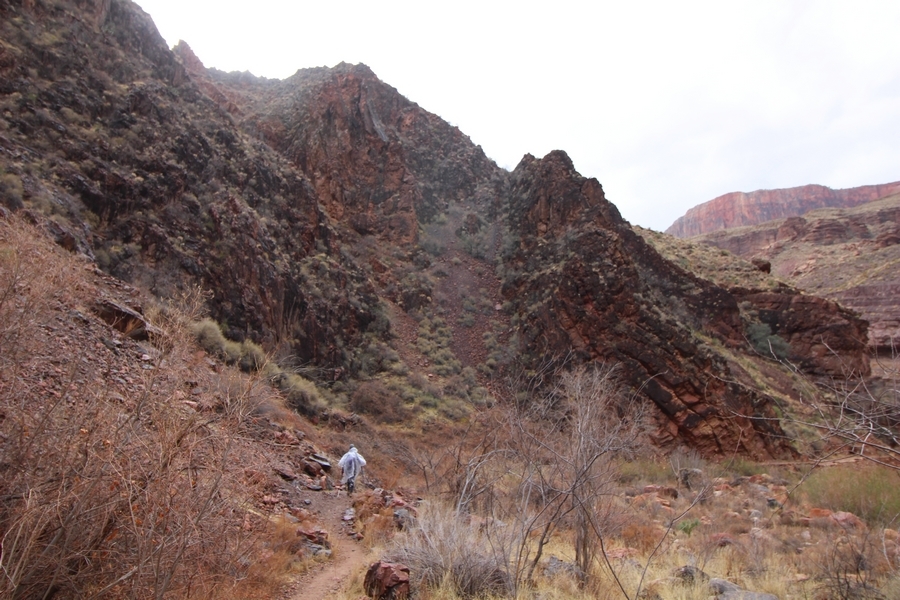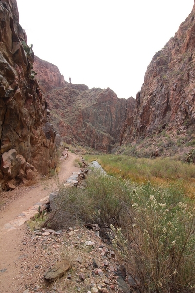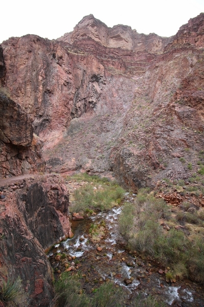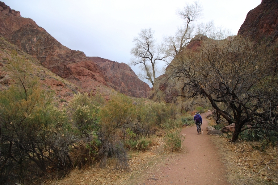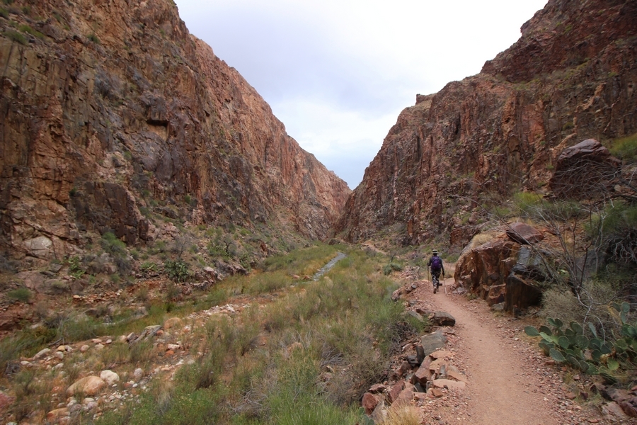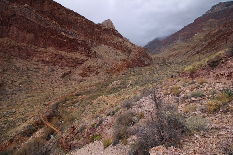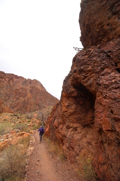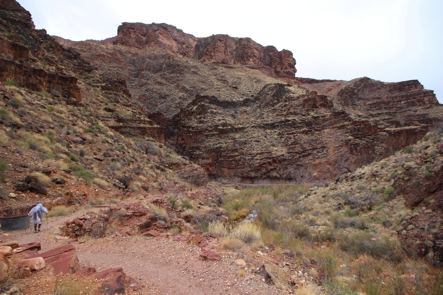 After a mostly-sleepless night in our tent, we showed up for breakfast at Phantom Ranch thinking that we’d perhaps get lucky – we had inquired the night before if any cabin space was available, and they told us it was possible for our second night but they wouldn’t know until morning. So, we were super jazzed when we were told at breakfast we’d have a cabin that night and, oh, would a queen bed be OK? Uh, yeah, that would be fine, and we happily paid another $160 for the privilege – the only catch was that the room wouldn’t be ready until after lunch, so that left us with a handful of choices for what to do with our day. We walked back to the campground to at least pack up our things there, and of course it started to rain just as we did so – just a few sprinkles at this point, but it looked like it could definitely get worse, so we got things ready in a hurry and headed back to Phantom Ranch. Once there, we were told we could stash our stuff in a corner of the dining hall, so we dropped our gear and started discussing where to go on a “short” day hike. We could head east up the Clear Creek Trail for some new views down the river gorge, but a 1,500′ up-and-down over 2.5 one-way miles didn’t sound very appealing – nor did walking back to the river and exploring various use trails there, since we’d be walking out that way tomorrow. That left walking northward up Bright Angel Canyon on the North Kaibab trail, the main route to reach the North Rim some 14 miles away. About six miles upcanyon was the popular destination of Ribbon Falls, one of the few perennial falls in the park, but Chris’ ankles and hips were quite sore from yesterday’s descent, and he didn’t want to walk 12 miles today, even though the hike was described by other guests as “flat”. We were told there was a series of bridges over Bright Angel Creek up that way, and we agreed we’d at least check those out and walk until we felt like heading back – we left under high cloudy skies, Chris knowing in his gut that we’d be walking the full 12 miles today, despite his protests. Immediately north of Phantom Ranch is The Box, a narrow stretch of the canyon that twists and turns, known for its absence of wind and its resulting unbearable heat during the summer. Heat would not be an issue for us today, although it was not too cold that we had to wear jackets – our wool midlayers were fine. The trail was indeed a very mild gradient, and we made good time through The Box and across the first two bridges. About two miles separate the second and third spans, and this stretch of trail was an interesting but repetitive series of cliffs and creek bends, the firm trail winding its way northward never more than a few yards from the creek. Past the third and fourth bridges, the canyon began to widen, offering better views both to the surrounding clifftops and upper terrain features as well as to the North Rim well off in the distance. The high sky also began to give way to rolling cloud cover as the weather indeed took a turn, although the intermittent sprinkles were never constant enough for us to pull out our rain gear. At 5.5 miles out, Chris began to look for the side canyon to the west within which lies Ribbon Falls – the most prominent one held no fall, nor did the one after, and he began to think this would be an even longer outing that he had dreaded. We soon came to a sign indicating that the Ribbon Falls bridge was ahead, but it was also clear that the route to the bridge entailed what looked to be a steep climb up and over a tall shelf extending into the canyon – alternatively, we could see a use trail leading left into the brush, presumably to a bridgeless crossing of Bright Angel Creek. We prudently but reluctantly chose the bridge option – the climb wasn’t bad, but we added at least a mile round trip distance by pushing north, then backtracking south and west over the bridge. At least we could see the fall from the shelf, and we entered the side canyon, picking our way up various use trail threads to the base of the cascades. It was quite the sight – the main fall dropped directly down onto a large rock platform, most of the flow dropping further down the rock face and watering the mossy surface there, while the remainder of the water flowed down the back of the platform and down around the sides into the main pool below. Jane had been told to explore all the way up in back of the fall, so up she went with Chris following – it was very cool, and definitely worth the effort to get here. After some pictures, we made our way out to a rock ledge just southeast of the fall, where we had a full view of the fall from its top to its pool, and ate some lunch that the Ranch had packed for us. The clouds had started to thicken and darken by this time, so we made our way east back into the main canyon, choosing to follow a shortcut use trail that indeed led back to the bridgeless creek crossing we had suspected was there. The creek was more than a little swollen, although it looked possible to get across using some larger rocks – Jane went first, her trekking poles in about 18″ of water as she steadied herself. The crux of her passage came as she had to make two quick and long steps on three successive rocks, which she did in a most precarious fashion – she was saved from a certain dunking when her pole caught up in a tree branch on the far bank, giving her enough stability to fortunately regain her balance. Super lucky. Chris learned a lesson or two from her example on which rocks were more stable, and he was able to get across the rushing water without incident. Now on the east bank, we quickly found the main trail ahead and started the long walk back. The rain got steadily worse over the next 30 minutes, and we ultimately resorted to breaking out the plastic ponchos Jane had insisted on buying when we arrived on the South Rim two days earlier (we both have nice, breathable rain ja