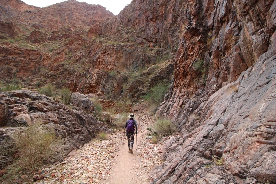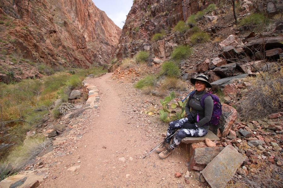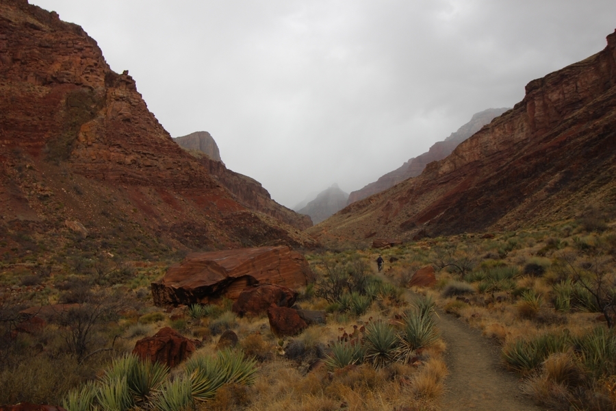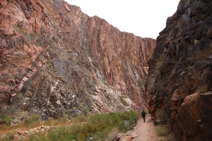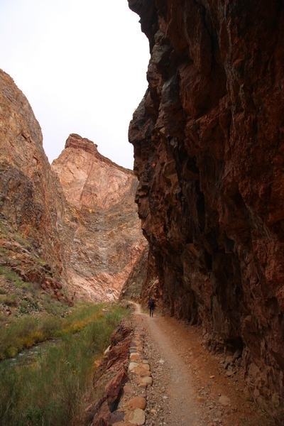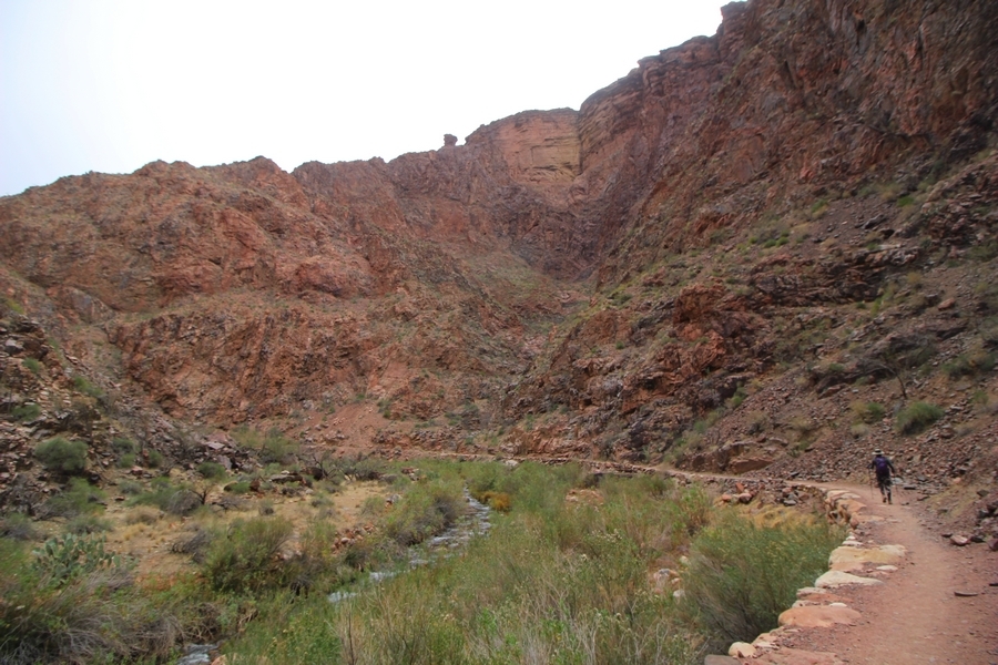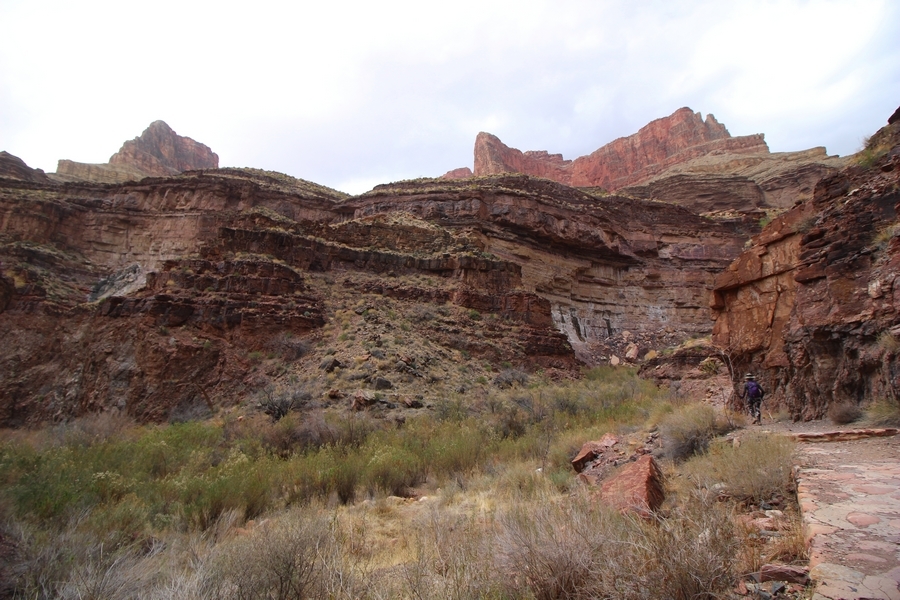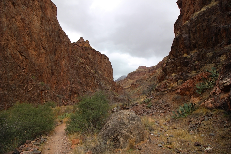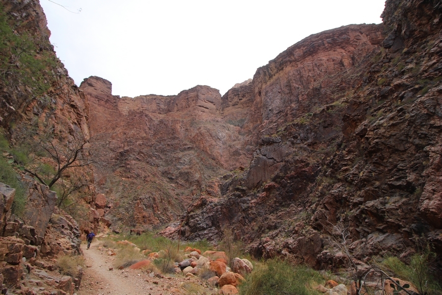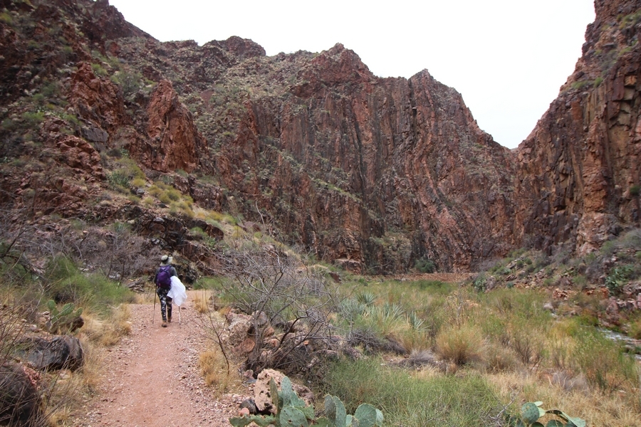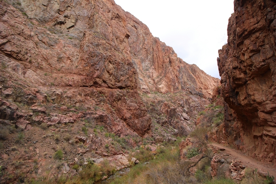 After a mostly-sleepless night in our tent, we showed up for breakfast at Phantom Ranch thinking that we’d perhaps get lucky – we had inquired the night before if any cabin space was available, and they told us it was possible for our second night but they wouldn’t know until morning. So, we were super jazzed when we were told at breakfast we’d have a cabin that night and, oh, would a queen bed be OK? Uh, yeah, that would be fine, and we happily paid another $160 for the privilege – the only catch was that the room wouldn’t be ready until after lunch, so that left us with a handful of choices for what to do with our day. We walked back to the campground to at least pack up our things there, and of course it started to rain just as we did so – just a few sprinkles at this point, but it looked like it could definitely get worse, so we got things ready in a hurry and headed back to Phantom Ranch. Once there, we were told we could stash our stuff in a corner of the dining hall, so we dropped our gear and started discussing where to go on a “short” day hike. We could head east up the Clear Creek Trail for some new views down the river gorge, but a 1,500′ up-and-down over 2.5 one-way miles didn’t sound very appealing – nor did walking back to the river and exploring various use trails there, since we’d be walking out that way tomorrow. That left walking northward up Bright Angel Canyon on the North Kaibab trail, the main route to reach the North Rim some 14 miles away. About six miles upcanyon was the popular destination of Ribbon Falls, one of the few perennial falls in the park, but Chris’ ankles and hips were quite sore from yesterday’s descent, and he didn’t want to walk 12 miles today, even though the hike was described by other guests as “flat”. We were told there was a series of bridges over Bright Angel Creek up that way, and we agreed we’d at least check those out and walk until we felt like heading back – we left under high cloudy skies, Chris knowing in his gut that we’d be walking the full 12 miles today, despite his protests. Immediately north of Phantom Ranch is The Box, a narrow stretch of the canyon that twists and turns, known for its absence of wind and its resulting unbearable heat during the summer. Heat would not be an issue for us today, although it was not too cold that we had to wear jackets – our wool midlayers were fine. The trail was indeed a very mild gradient, and we made good time through The Box and across the first two bridges. About two miles separate the second and third spans, and this stretch of trail was an interesting but repetitive series of cliffs and creek bends, the firm trail winding its way northward never more than a few yards from the creek. Past the third and fourth bridges, the canyon began to widen, offering better views both to the surrounding clifftops and upper terrain features as well as to the North Rim well off in the distance. The high sky also began to give way to rolling cloud cover as the weather indeed took a turn, although the intermittent sprinkles were never constant enough for us to pull out our rain gear. At 5.5 miles out, Chris began to look for the side canyon to the west within which lies Ribbon Falls – the most prominent one held no fall, nor did the one after, and he began to think this would be an even longer outing that he had dreaded. We soon came to a sign indicating that the Ribbon Falls bridge was ahead, but it was also clear that the route to the bridge entailed what looked to be a steep climb up and over a tall shelf extending into the canyon – alternatively, we could see a use trail leading left into the brush, presumably to a bridgeless crossing of Bright Angel Creek. We prudently but reluctantly chose the bridge option – the climb wasn’t bad, but we added at least a mile round trip distance by pushing north, then backtracking south and west over the bridge. At least we could see the fall from the shelf, and we entered the side canyon, picking our way up various use trail threads to the base of the cascades. It was quite the sight – the main fall dropped directly down onto a large rock platform, most of the flow dropping further down the rock face and watering the mossy surface there, while the remainder of the water flowed down the back of the platform and down around the sides into the main pool below. Jane had been told to explore all the way up in back of the fall, so up she went with Chris following – it was very cool, and definitely worth the effort to get here. After some pictures, we made our way out to a rock ledge just southeast of the fall, where we had a full view of the fall from its top to its pool, and ate some lunch that the Ranch had packed for us. The clouds had started to thicken and darken by this time, so we made our way east back into the main canyon, choosing to follow a shortcut use trail that indeed led back to the bridgeless creek crossing we had suspected was there. The creek was more than a little swollen, although it looked possible to get across using some larger rocks – Jane went first, her trekking poles in about 18″ of water as she steadied herself. The crux of her passage came as she had to make two quick and long steps on three successive rocks, which she did in a most precarious fashion – she was saved from a certain dunking when her pole caught up in a tree branch on the far bank, giving her enough stability to fortunately regain her balance. Super lucky. Chris learned a lesson or two from her example on which rocks were more stable, and he was able to get across the rushing water without incident. Now on the east bank, we quickly found the main trail ahead and started the long walk back. The rain got steadily worse over the next 30 minutes, and we ultimately resorted to breaking out the plastic ponchos Jane had insisted on buying when we arrived on the South Rim two days earlier (we both have nice, breathable rain ja