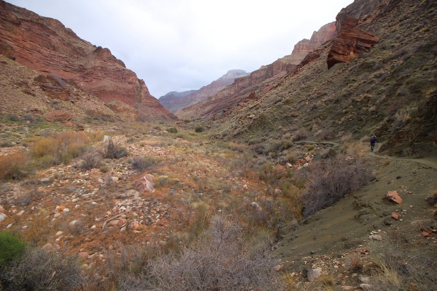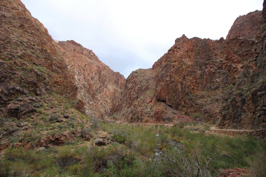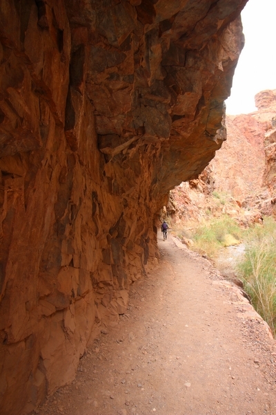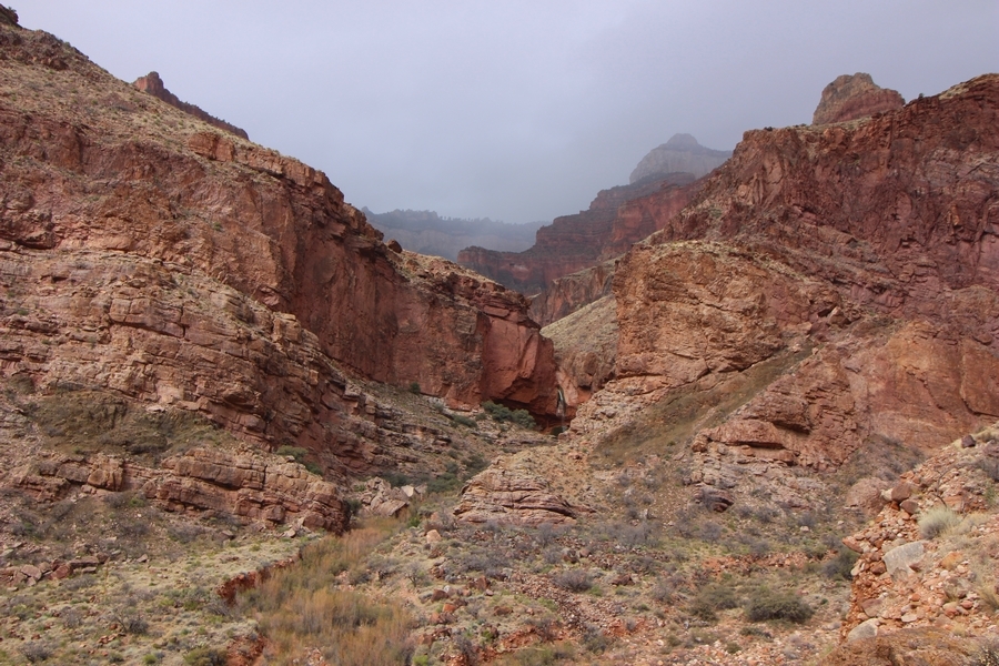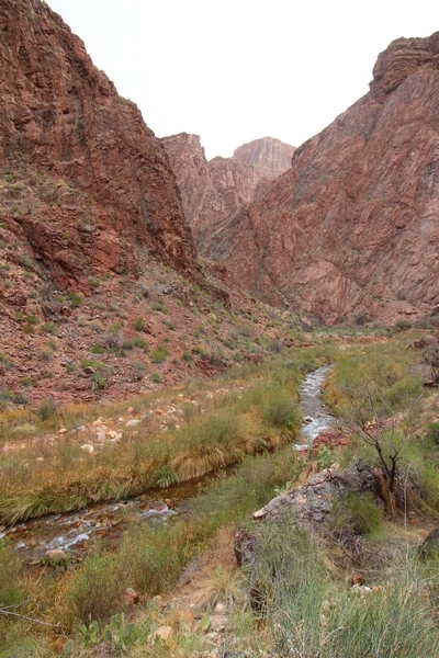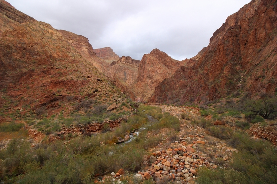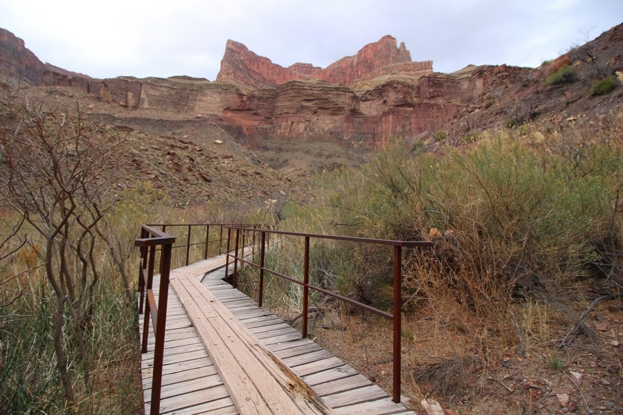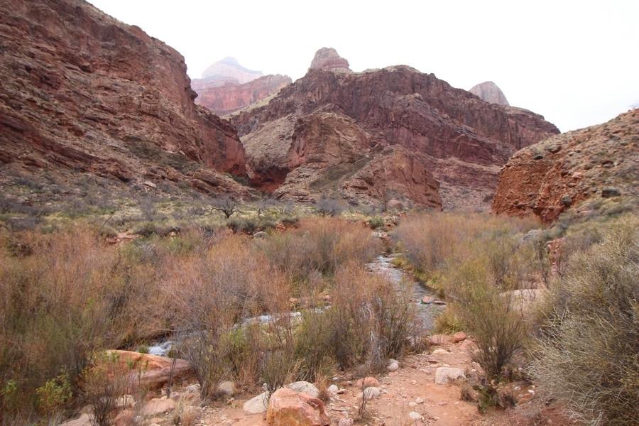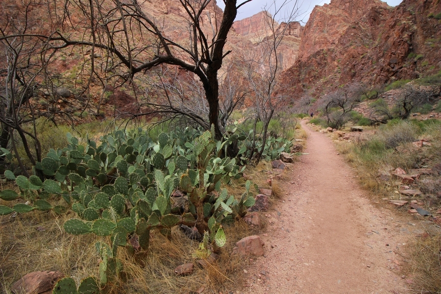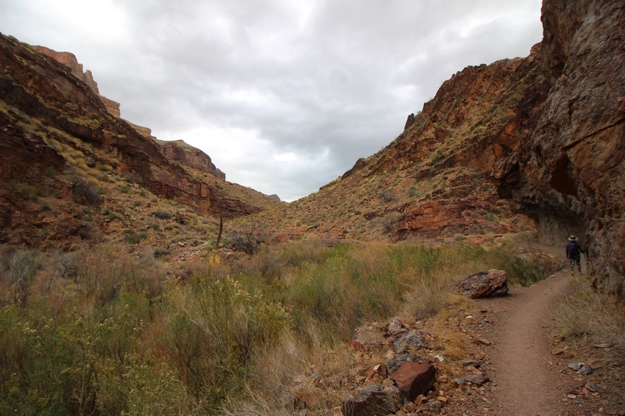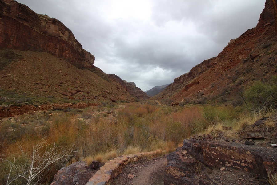 After a mostly-sleepless night in our tent, we showed up for breakfast at Phantom Ranch thinking that we’d perhaps get lucky – we had inquired the night before if any cabin space was available, and they told us it was possible for our second night but they wouldn’t know until morning. So, we were super jazzed when we were told at breakfast we’d have a cabin that night and, oh, would a queen bed be OK? Uh, yeah, that would be fine, and we happily paid another $160 for the privilege – the only catch was that the room wouldn’t be ready until after lunch, so that left us with a handful of choices for what to do with our day. We walked back to the campground to at least pack up our things there, and of course it started to rain just as we did so – just a few sprinkles at this point, but it looked like it could definitely get worse, so we got things ready in a hurry and headed back to Phantom Ranch. Once there, we were told we could stash our stuff in a corner of the dining hall, so we dropped our gear and started discussing where to go on a “short” day hike. We could head east up the Clear Creek Trail for some new views down the river gorge, but a 1,500′ up-and-down over 2.5 one-way miles didn’t sound very appealing – nor did walking back to the river and exploring various use trails there, since we’d be walking out that way tomorrow. That left walking northward up Bright Angel Canyon on the North Kaibab trail, the main route to reach the North Rim some 14 miles away. About six miles upcanyon was the popular destination of Ribbon Falls, one of the few perennial falls in the park, but Chris’ ankles and hips were quite sore from yesterday’s descent, and he didn’t want to walk 12 miles today, even though the hike was described by other guests as “flat”. We were told there was a series of bridges over Bright Angel Creek up that way, and we agreed we’d at least check those out and walk until we felt like heading back – we left under high cloudy skies, Chris knowing in his gut that we’d be walking the full 12 miles today, despite his protests. Immediately north of Phantom Ranch is The Box, a narrow stretch of the canyon that twists and turns, known for its absence of wind and its resulting unbearable heat during the summer. Heat would not be an issue for us today, although it was not too cold that we had to wear jackets – our wool midlayers were fine. The trail was indeed a very mild gradient, and we made good time through The Box and across the first two bridges. About two miles separate the second and third spans, and this stretch of trail was an interesting but repetitive series of cliffs and creek bends, the firm trail winding its way northward never more than a few yards from the creek. Past the third and fourth bridges, the canyon began to widen, offering better views both to the surrounding clifftops and upper terrain features as well as to the North Rim well off in the distance. The high sky also began to give way to rolling cloud cover as the weather indeed took a turn, although the intermittent sprinkles were never constant enough for us to pull out our rain gear. At 5.5 miles out, Chris began to look for the side canyon to the west within which lies Ribbon Falls – the most prominent one held no fall, nor did the one after, and he began to think this would be an even longer outing that he had dreaded. We soon came to a sign indicating that the Ribbon Falls bridge was ahead, but it was also clear that the route to the bridge entailed what looked to be a steep climb up and over a tall shelf extending into the canyon – alternatively, we could see a use trail leading left into the brush, presumably to a bridgeless crossing of Bright Angel Creek. We prudently but reluctantly chose the bridge option – the climb wasn’t bad, but we added at least a mile round trip distance by pushing north, then backtracking south and west over the bridge. At least we could see the fall from the shelf, and we entered the side canyon, picking our way up various use trail threads to the base of the cascades. It was quite the sight – the main fall dropped directly down onto a large rock platform, most of the flow dropping further down the rock face and watering the mossy surface there, while the remainder of the water flowed down the back of the platform and down around the sides into the main pool below. Jane had been told to explore all the way up in back of the fall, so up she went with Chris following – it was very cool, and definitely worth the effort to get here. After some pictures, we made our way out to a rock ledge just southeast of the fall, where we had a full view of the fall from its top to its pool, and ate some lunch that the Ranch had packed for us. The clouds had started to thicken and darken by this time, so we made our way east back into the main canyon, choosing to follow a shortcut use trail that indeed led back to the bridgeless creek crossing we had suspected was there. The creek was more than a little swollen, although it looked possible to get across using some larger rocks – Jane went first, her trekking poles in about 18″ of water as she steadied herself. The crux of her passage came as she had to make two quick and long steps on three successive rocks, which she did in a most precarious fashion – she was saved from a certain dunking when her pole caught up in a tree branch on the far bank, giving her enough stability to fortunately regain her balance. Super lucky. Chris learned a lesson or two from her example on which rocks were more stable, and he was able to get across the rushing water without incident. Now on the east bank, we quickly found the main trail ahead and started the long walk back. The rain got steadily worse over the next 30 minutes, and we ultimately resorted to breaking out the plastic ponchos Jane had insisted on buying when we arrived on the South Rim two days earlier (we both have nice, breathable rain ja