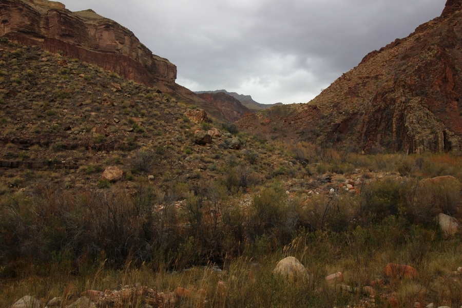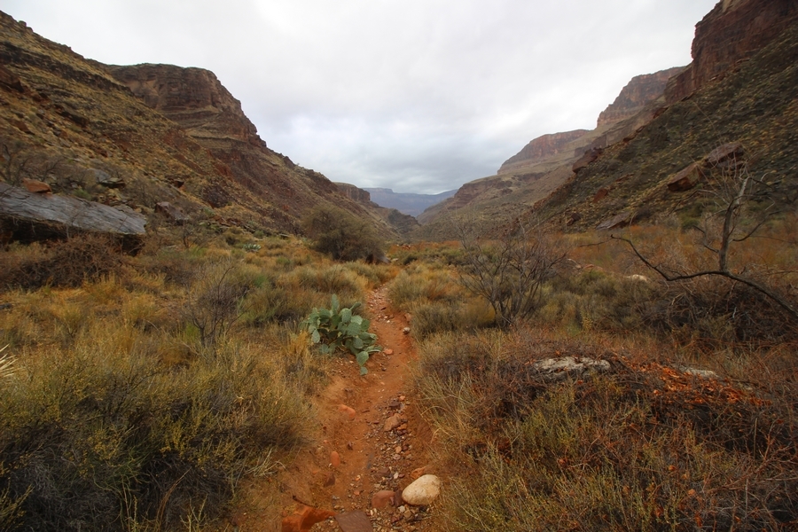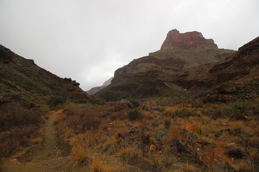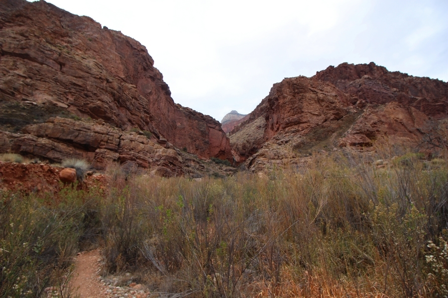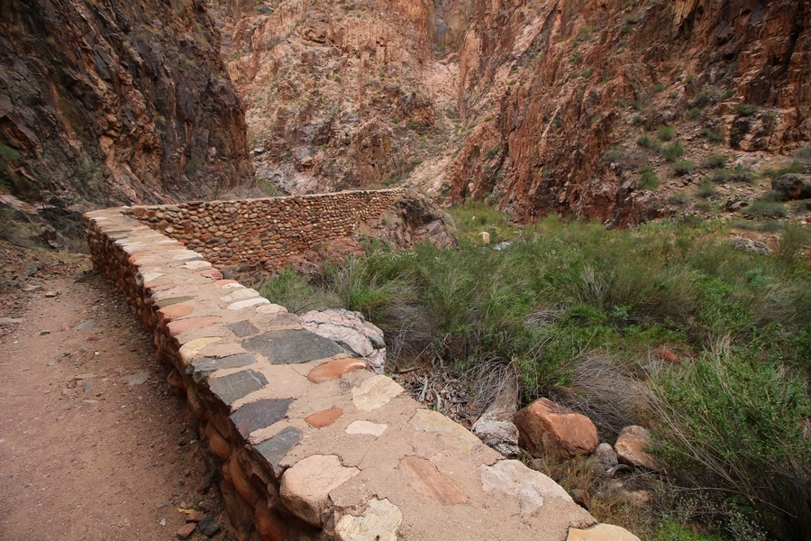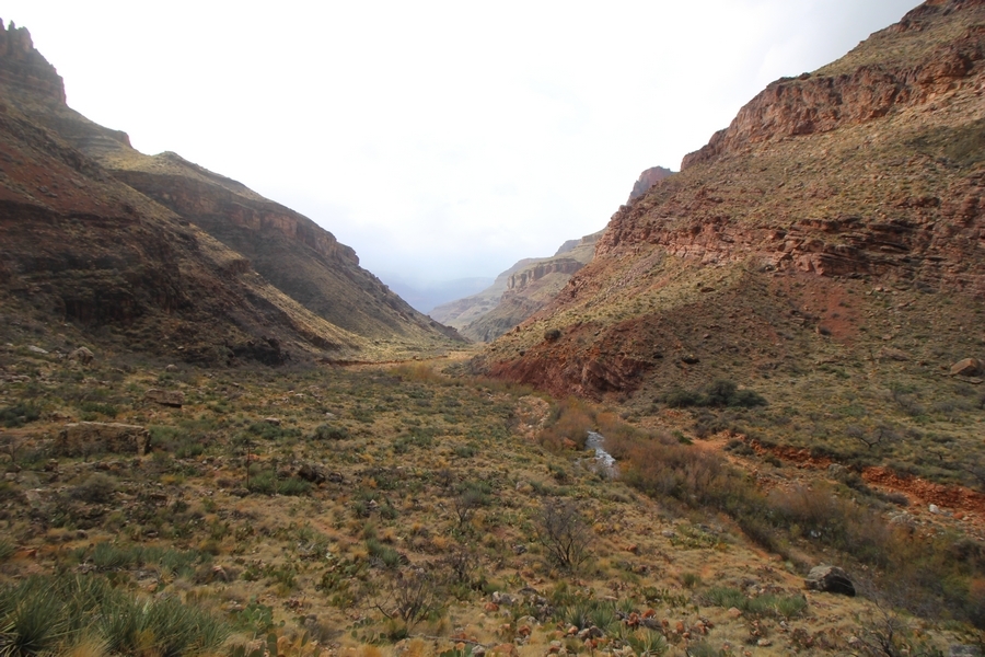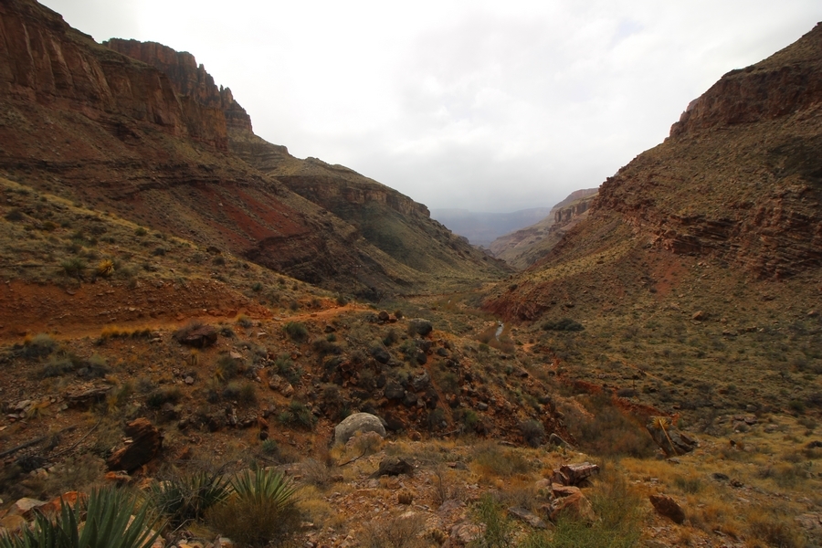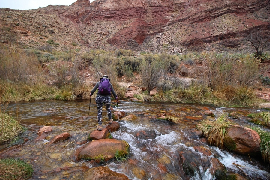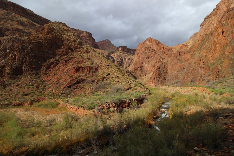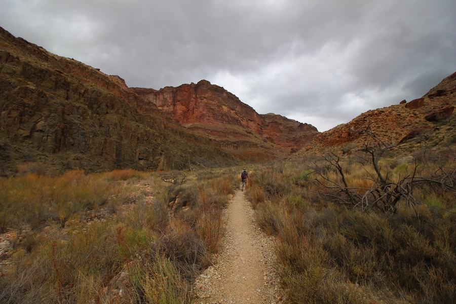 After a mostly-sleepless night in our tent, we showed up for breakfast at Phantom Ranch thinking that we’d perhaps get lucky – we had inquired the night before if any cabin space was available, and they told us it was possible for our second night but they wouldn’t know until morning. So, we were super jazzed when we were told at breakfast we’d have a cabin that night and, oh, would a queen bed be OK? Uh, yeah, that would be fine, and we happily paid another $160 for the privilege – the only catch was that the room wouldn’t be ready until after lunch, so that left us with a handful of choices for what to do with our day. We walked back to the campground to at least pack up our things there, and of course it started to rain just as we did so – just a few sprinkles at this point, but it looked like it could definitely get worse, so we got things ready in a hurry and headed back to Phantom Ranch. Once there, we were told we could stash our stuff in a corner of the dining hall, so we dropped our gear and started discussing where to go on a “short” day hike. We could head east up the Clear Creek Trail for some new views down the river gorge, but a 1,500′ up-and-down over 2.5 one-way miles didn’t sound very appealing – nor did walking back to the river and exploring various use trails there, since we’d be walking out that way tomorrow. That left walking northward up Bright Angel Canyon on the North Kaibab trail, the main route to reach the North Rim some 14 miles away. About six miles upcanyon was the popular destination of Ribbon Falls, one of the few perennial falls in the park, but Chris’ ankles and hips were quite sore from yesterday’s descent, and he didn’t want to walk 12 miles today, even though the hike was described by other guests as “flat”. We were told there was a series of bridges over Bright Angel Creek up that way, and we agreed we’d at least check those out and walk until we felt like heading back – we left under high cloudy skies, Chris knowing in his gut that we’d be walking the full 12 miles today, despite his protests. Immediately north of Phantom Ranch is The Box, a narrow stretch of the canyon that twists and turns, known for its absence of wind and its resulting unbearable heat during the summer. Heat would not be an issue for us today, although it was not too cold that we had to wear jackets – our wool midlayers were fine. The trail was indeed a very mild gradient, and we made good time through The Box and across the first two bridges. About two miles separate the second and third spans, and this stretch of trail was an interesting but repetitive series of cliffs and creek bends, the firm trail winding its way northward never more than a few yards from the creek. Past the third and fourth bridges, the canyon began to widen, offering better views both to the surrounding clifftops and upper terrain features as well as to the North Rim well off in the distance. The high sky also began to give way to rolling cloud cover as the weather indeed took a turn, although the intermittent sprinkles were never constant enough for us to pull out our rain gear. At 5.5 miles out, Chris began to look for the side canyon to the west within which lies Ribbon Falls – the most prominent one held no fall, nor did the one after, and he began to think this would be an even longer outing that he had dreaded. We soon came to a sign indicating that the Ribbon Falls bridge was ahead, but it was also clear that the route to the bridge entailed what looked to be a steep climb up and over a tall shelf extending into the canyon – alternatively, we could see a use trail leading left into the brush, presumably to a bridgeless crossing of Bright Angel Creek. We prudently but reluctantly chose the bridge option – the climb wasn’t bad, but we added at least a mile round trip distance by pushing north, then backtracking south and west over the bridge. At least we could see the fall from the shelf, and we entered the side canyon, picking our way up various use trail threads to the base of the cascades. It was quite the sight – the main fall dropped directly down onto a large rock platform, most of the flow dropping further down the rock face and watering the mossy surface there, while the remainder of the water flowed down the back of the platform and down around the sides into the main pool below. Jane had been told to explore all the way up in back of the fall, so up she went with Chris following – it was very cool, and definitely worth the effort to get here. After some pictures, we made our way out to a rock ledge just southeast of the fall, where we had a full view of the fall from its top to its pool, and ate some lunch that the Ranch had packed for us. The clouds had started to thicken and darken by this time, so we made our way east back into the main canyon, choosing to follow a shortcut use trail that indeed led back to the bridgeless creek crossing we had suspected was there. The creek was more than a little swollen, although it looked possible to get across using some larger rocks – Jane went first, her trekking poles in about 18″ of water as she steadied herself. The crux of her passage came as she had to make two quick and long steps on three successive rocks, which she did in a most precarious fashion – she was saved from a certain dunking when her pole caught up in a tree branch on the far bank, giving her enough stability to fortunately regain her balance. Super lucky. Chris learned a lesson or two from her example on which rocks were more stable, and he was able to get across the rushing water without incident. Now on the east bank, we quickly found the main trail ahead and started the long walk back. The rain got steadily worse over the next 30 minutes, and we ultimately resorted to breaking out the plastic ponchos Jane had insisted on buying when we arrived on the South Rim two days earlier (we both have nice, breathable rain ja