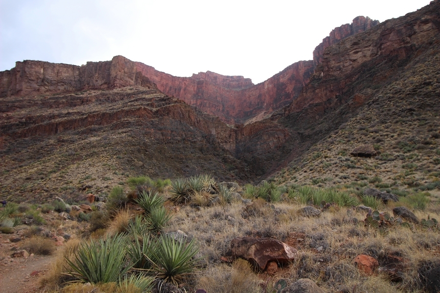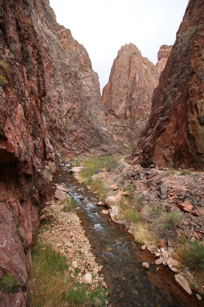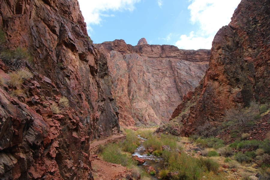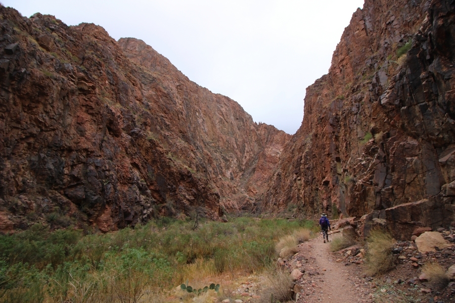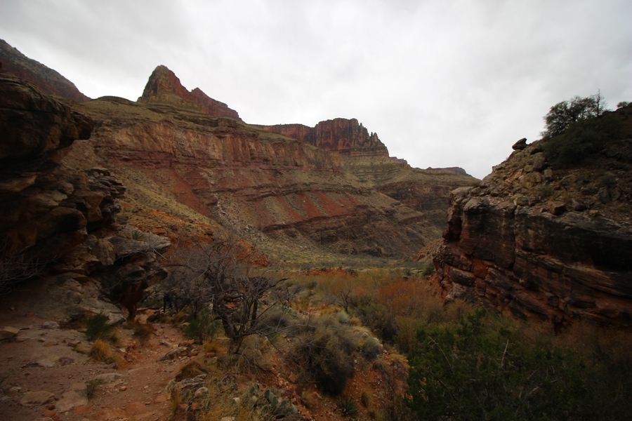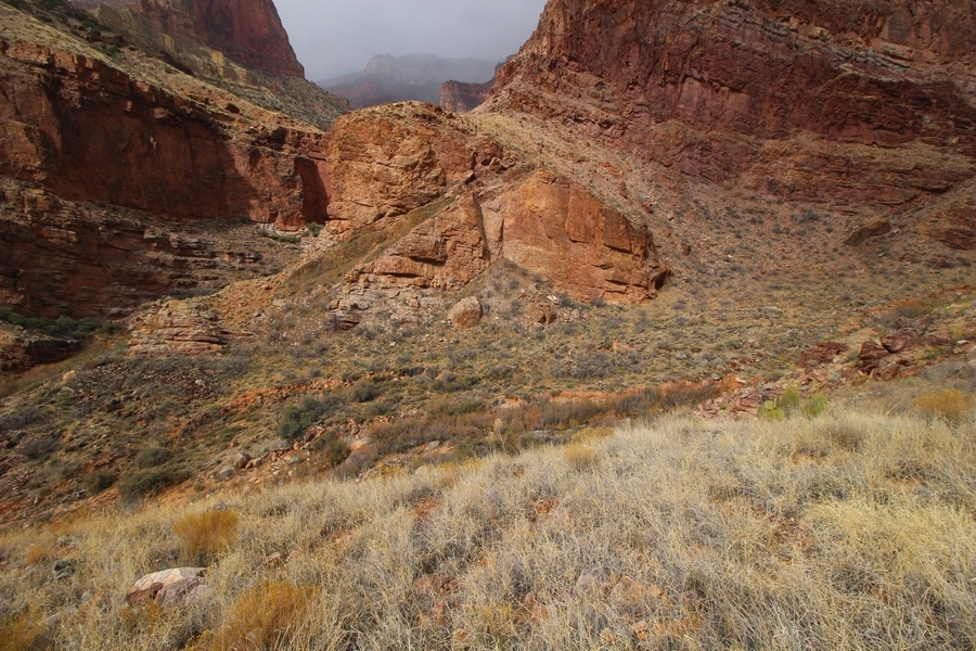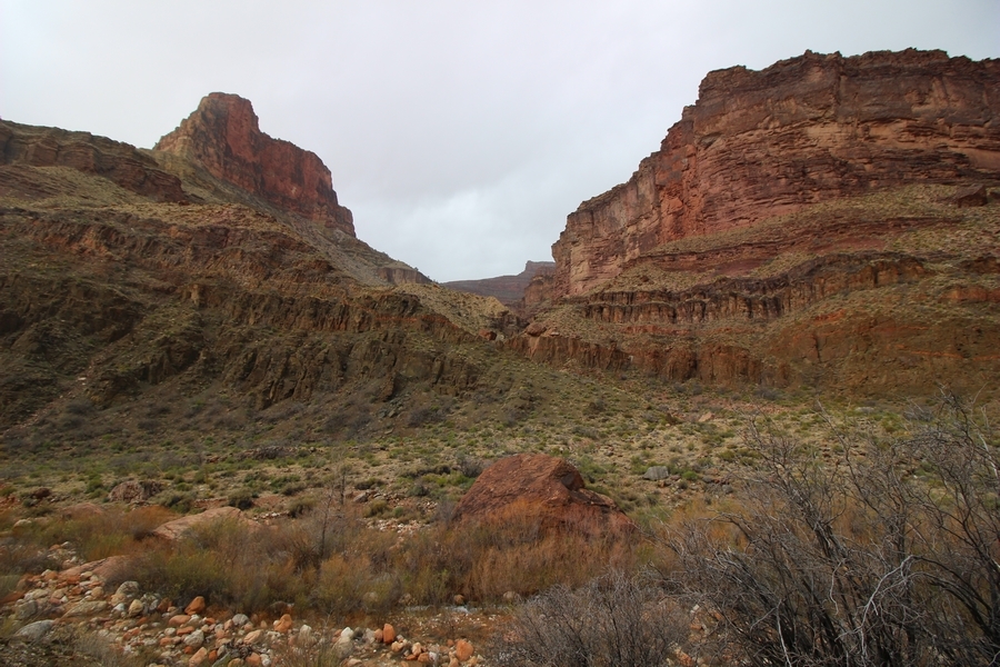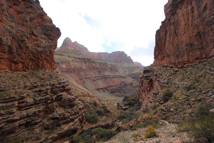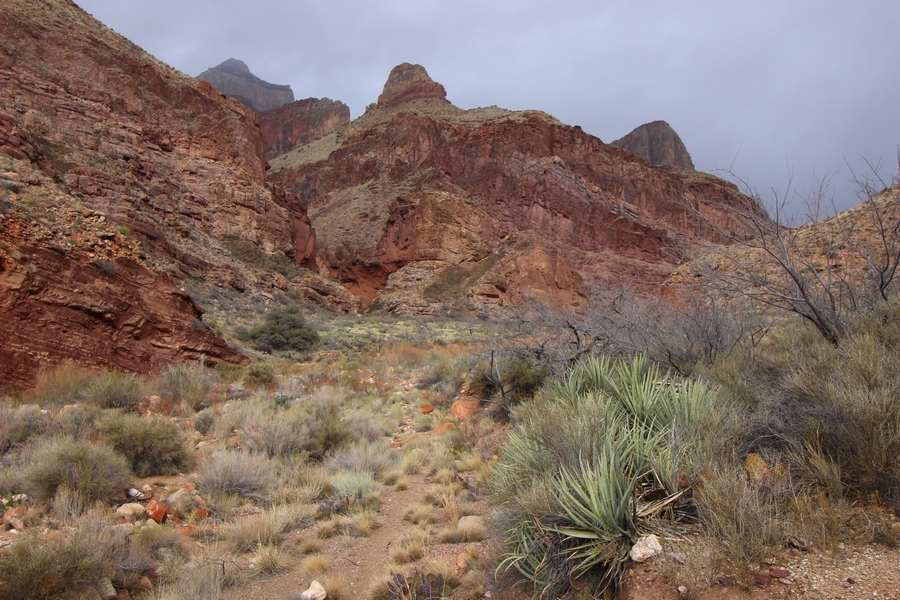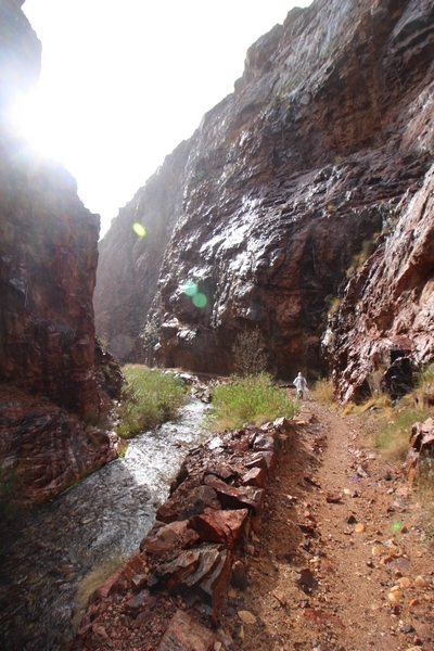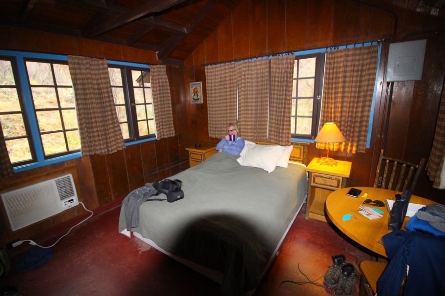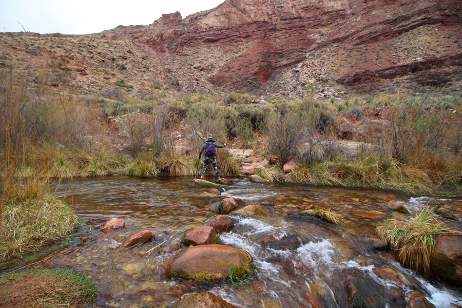 After a mostly-sleepless night in our tent, we showed up for breakfast at Phantom Ranch thinking that we’d perhaps get lucky – we had inquired the night before if any cabin space was available, and they told us it was possible for our second night but they wouldn’t know until morning. So, we were super jazzed when we were told at breakfast we’d have a cabin that night and, oh, would a queen bed be OK? Uh, yeah, that would be fine, and we happily paid another $160 for the privilege – the only catch was that the room wouldn’t be ready until after lunch, so that left us with a handful of choices for what to do with our day. We walked back to the campground to at least pack up our things there, and of course it started to rain just as we did so – just a few sprinkles at this point, but it looked like it could definitely get worse, so we got things ready in a hurry and headed back to Phantom Ranch. Once there, we were told we could stash our stuff in a corner of the dining hall, so we dropped our gear and started discussing where to go on a “short” day hike. We could head east up the Clear Creek Trail for some new views down the river gorge, but a 1,500′ up-and-down over 2.5 one-way miles didn’t sound very appealing – nor did walking back to the river and exploring various use trails there, since we’d be walking out that way tomorrow. That left walking northward up Bright Angel Canyon on the North Kaibab trail, the main route to reach the North Rim some 14 miles away. About six miles upcanyon was the popular destination of Ribbon Falls, one of the few perennial falls in the park, but Chris’ ankles and hips were quite sore from yesterday’s descent, and he didn’t want to walk 12 miles today, even though the hike was described by other guests as “flat”. We were told there was a series of bridges over Bright Angel Creek up that way, and we agreed we’d at least check those out and walk until we felt like heading back – we left under high cloudy skies, Chris knowing in his gut that we’d be walking the full 12 miles today, despite his protests. Immediately north of Phantom Ranch is The Box, a narrow stretch of the canyon that twists and turns, known for its absence of wind and its resulting unbearable heat during the summer. Heat would not be an issue for us today, although it was not too cold that we had to wear jackets – our wool midlayers were fine. The trail was indeed a very mild gradient, and we made good time through The Box and across the first two bridges. About two miles separate the second and third spans, and this stretch of trail was an interesting but repetitive series of cliffs and creek bends, the firm trail winding its way northward never more than a few yards from the creek. Past the third and fourth bridges, the canyon began to widen, offering better views both to the surrounding clifftops and upper terrain features as well as to the North Rim well off in the distance. The high sky also began to give way to rolling cloud cover as the weather indeed took a turn, although the intermittent sprinkles were never constant enough for us to pull out our rain gear. At 5.5 miles out, Chris began to look for the side canyon to the west within which lies Ribbon Falls – the most prominent one held no fall, nor did the one after, and he began to think this would be an even longer outing that he had dreaded. We soon came to a sign indicating that the Ribbon Falls bridge was ahead, but it was also clear that the route to the bridge entailed what looked to be a steep climb up and over a tall shelf extending into the canyon – alternatively, we could see a use trail leading left into the brush, presumably to a bridgeless crossing of Bright Angel Creek. We prudently but reluctantly chose the bridge option – the climb wasn’t bad, but we added at least a mile round trip distance by pushing north, then backtracking south and west over the bridge. At least we could see the fall from the shelf, and we entered the side canyon, picking our way up various use trail threads to the base of the cascades. It was quite the sight – the main fall dropped directly down onto a large rock platform, most of the flow dropping further down the rock face and watering the mossy surface there, while the remainder of the water flowed down the back of the platform and down around the sides into the main pool below. Jane had been told to explore all the way up in back of the fall, so up she went with Chris following – it was very cool, and definitely worth the effort to get here. After some pictures, we made our way out to a rock ledge just southeast of the fall, where we had a full view of the fall from its top to its pool, and ate some lunch that the Ranch had packed for us. The clouds had started to thicken and darken by this time, so we made our way east back into the main canyon, choosing to follow a shortcut use trail that indeed led back to the bridgeless creek crossing we had suspected was there. The creek was more than a little swollen, although it looked possible to get across using some larger rocks – Jane went first, her trekking poles in about 18″ of water as she steadied herself. The crux of her passage came as she had to make two quick and long steps on three successive rocks, which she did in a most precarious fashion – she was saved from a certain dunking when her pole caught up in a tree branch on the far bank, giving her enough stability to fortunately regain her balance. Super lucky. Chris learned a lesson or two from her example on which rocks were more stable, and he was able to get across the rushing water without incident. Now on the east bank, we quickly found the main trail ahead and started the long walk back. The rain got steadily worse over the next 30 minutes, and we ultimately resorted to breaking out the plastic ponchos Jane had insisted on buying when we arrived on the South Rim two days earlier (we both have nice, breathable rain ja