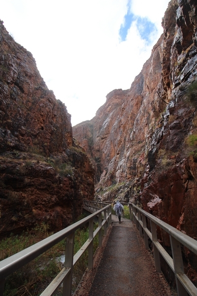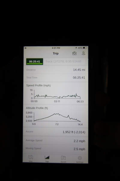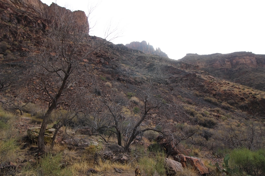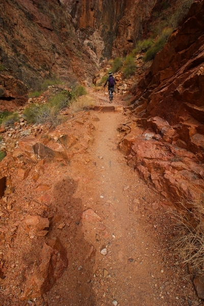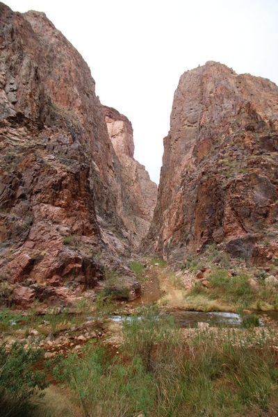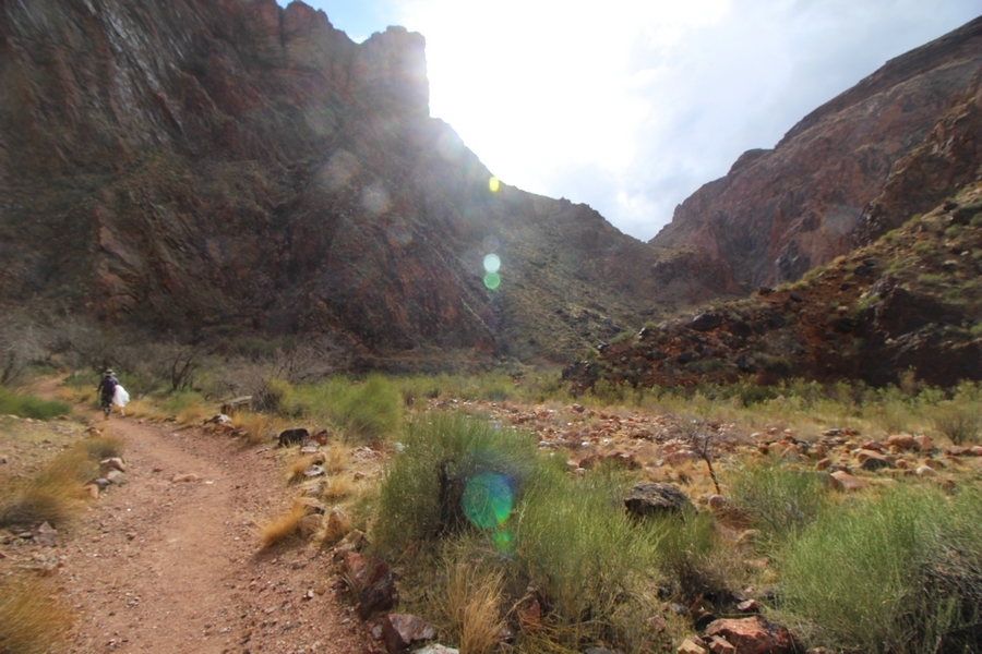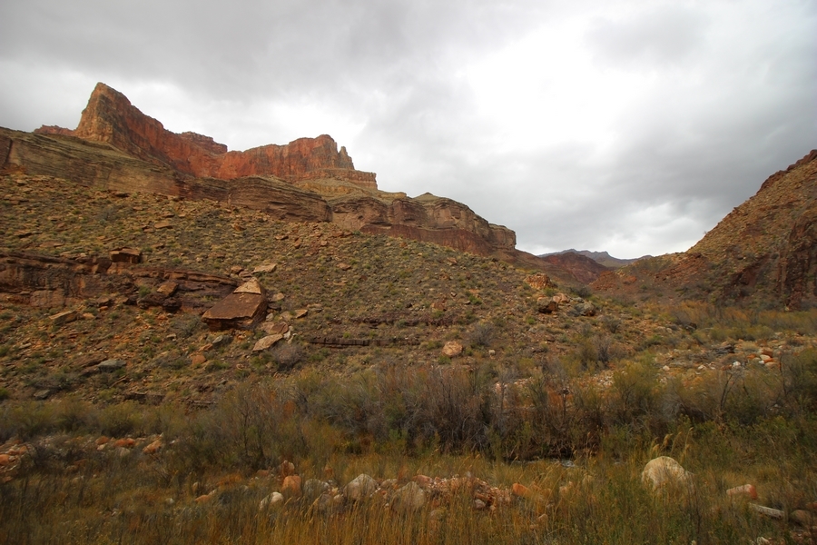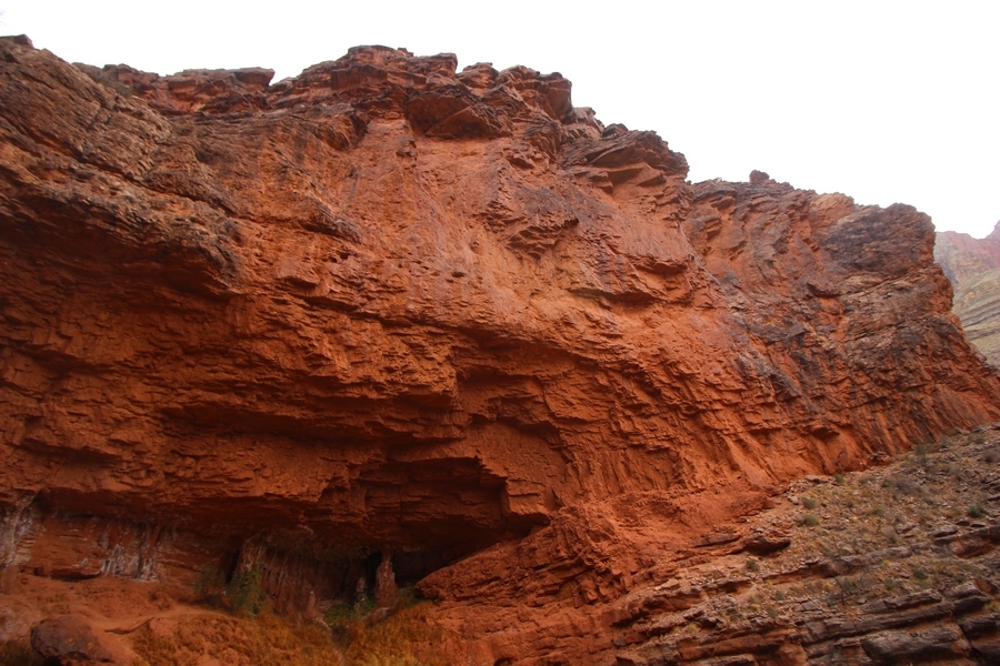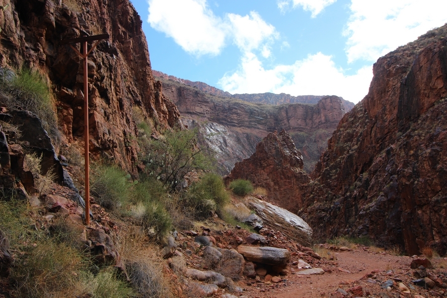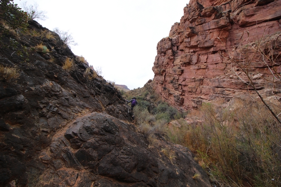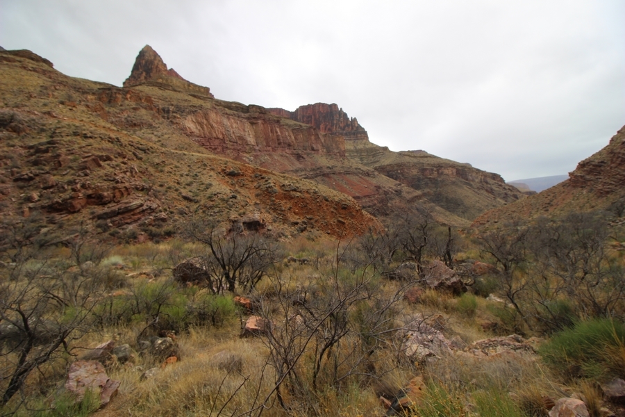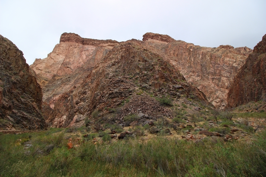 After a mostly-sleepless night in our tent, we showed up for breakfast at Phantom Ranch thinking that we’d perhaps get lucky – we had inquired the night before if any cabin space was available, and they told us it was possible for our second night but they wouldn’t know until morning. So, we were super jazzed when we were told at breakfast we’d have a cabin that night and, oh, would a queen bed be OK? Uh, yeah, that would be fine, and we happily paid another $160 for the privilege – the only catch was that the room wouldn’t be ready until after lunch, so that left us with a handful of choices for what to do with our day. We walked back to the campground to at least pack up our things there, and of course it started to rain just as we did so – just a few sprinkles at this point, but it looked like it could definitely get worse, so we got things ready in a hurry and headed back to Phantom Ranch. Once there, we were told we could stash our stuff in a corner of the dining hall, so we dropped our gear and started discussing where to go on a “short” day hike. We could head east up the Clear Creek Trail for some new views down the river gorge, but a 1,500′ up-and-down over 2.5 one-way miles didn’t sound very appealing – nor did walking back to the river and exploring various use trails there, since we’d be walking out that way tomorrow. That left walking northward up Bright Angel Canyon on the North Kaibab trail, the main route to reach the North Rim some 14 miles away. About six miles upcanyon was the popular destination of Ribbon Falls, one of the few perennial falls in the park, but Chris’ ankles and hips were quite sore from yesterday’s descent, and he didn’t want to walk 12 miles today, even though the hike was described by other guests as “flat”. We were told there was a series of bridges over Bright Angel Creek up that way, and we agreed we’d at least check those out and walk until we felt like heading back – we left under high cloudy skies, Chris knowing in his gut that we’d be walking the full 12 miles today, despite his protests. Immediately north of Phantom Ranch is The Box, a narrow stretch of the canyon that twists and turns, known for its absence of wind and its resulting unbearable heat during the summer. Heat would not be an issue for us today, although it was not too cold that we had to wear jackets – our wool midlayers were fine. The trail was indeed a very mild gradient, and we made good time through The Box and across the first two bridges. About two miles separate the second and third spans, and this stretch of trail was an interesting but repetitive series of cliffs and creek bends, the firm trail winding its way northward never more than a few yards from the creek. Past the third and fourth bridges, the canyon began to widen, offering better views both to the surrounding clifftops and upper terrain features as well as to the North Rim well off in the distance. The high sky also began to give way to rolling cloud cover as the weather indeed took a turn, although the intermittent sprinkles were never constant enough for us to pull out our rain gear. At 5.5 miles out, Chris began to look for the side canyon to the west within which lies Ribbon Falls – the most prominent one held no fall, nor did the one after, and he began to think this would be an even longer outing that he had dreaded. We soon came to a sign indicating that the Ribbon Falls bridge was ahead, but it was also clear that the route to the bridge entailed what looked to be a steep climb up and over a tall shelf extending into the canyon – alternatively, we could see a use trail leading left into the brush, presumably to a bridgeless crossing of Bright Angel Creek. We prudently but reluctantly chose the bridge option – the climb wasn’t bad, but we added at least a mile round trip distance by pushing north, then backtracking south and west over the bridge. At least we could see the fall from the shelf, and we entered the side canyon, picking our way up various use trail threads to the base of the cascades. It was quite the sight – the main fall dropped directly down onto a large rock platform, most of the flow dropping further down the rock face and watering the mossy surface there, while the remainder of the water flowed down the back of the platform and down around the sides into the main pool below. Jane had been told to explore all the way up in back of the fall, so up she went with Chris following – it was very cool, and definitely worth the effort to get here. After some pictures, we made our way out to a rock ledge just southeast of the fall, where we had a full view of the fall from its top to its pool, and ate some lunch that the Ranch had packed for us. The clouds had started to thicken and darken by this time, so we made our way east back into the main canyon, choosing to follow a shortcut use trail that indeed led back to the bridgeless creek crossing we had suspected was there. The creek was more than a little swollen, although it looked possible to get across using some larger rocks – Jane went first, her trekking poles in about 18″ of water as she steadied herself. The crux of her passage came as she had to make two quick and long steps on three successive rocks, which she did in a most precarious fashion – she was saved from a certain dunking when her pole caught up in a tree branch on the far bank, giving her enough stability to fortunately regain her balance. Super lucky. Chris learned a lesson or two from her example on which rocks were more stable, and he was able to get across the rushing water without incident. Now on the east bank, we quickly found the main trail ahead and started the long walk back. The rain got steadily worse over the next 30 minutes, and we ultimately resorted to breaking out the plastic ponchos Jane had insisted on buying when we arrived on the South Rim two days earlier (we both have nice, breathable rain ja