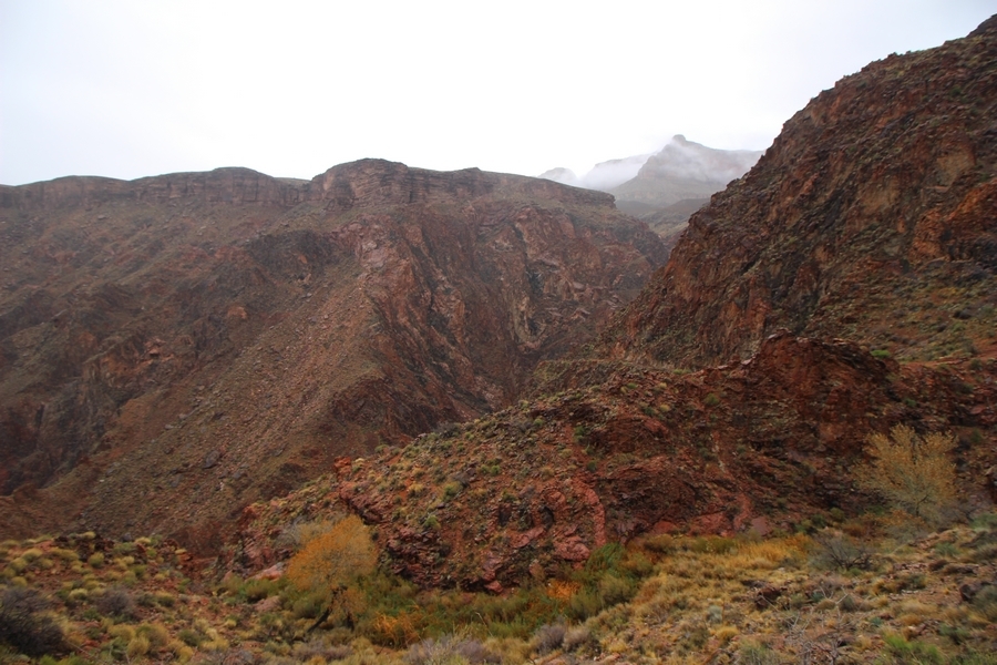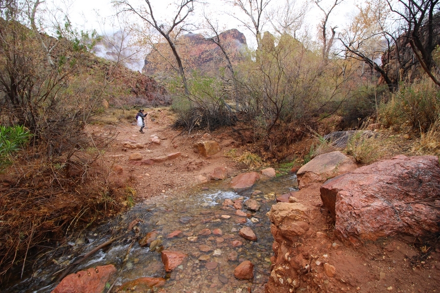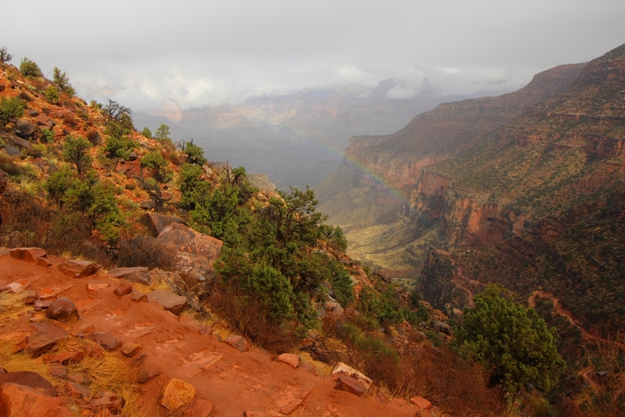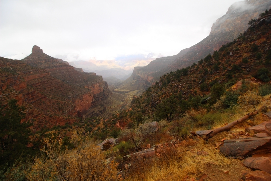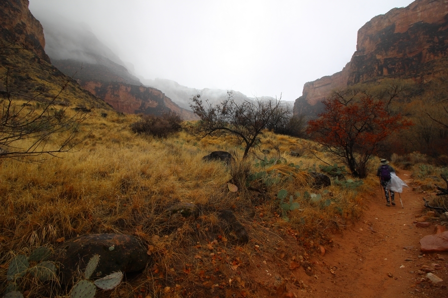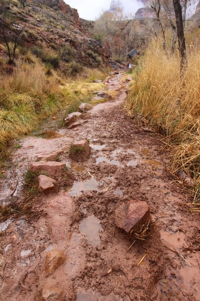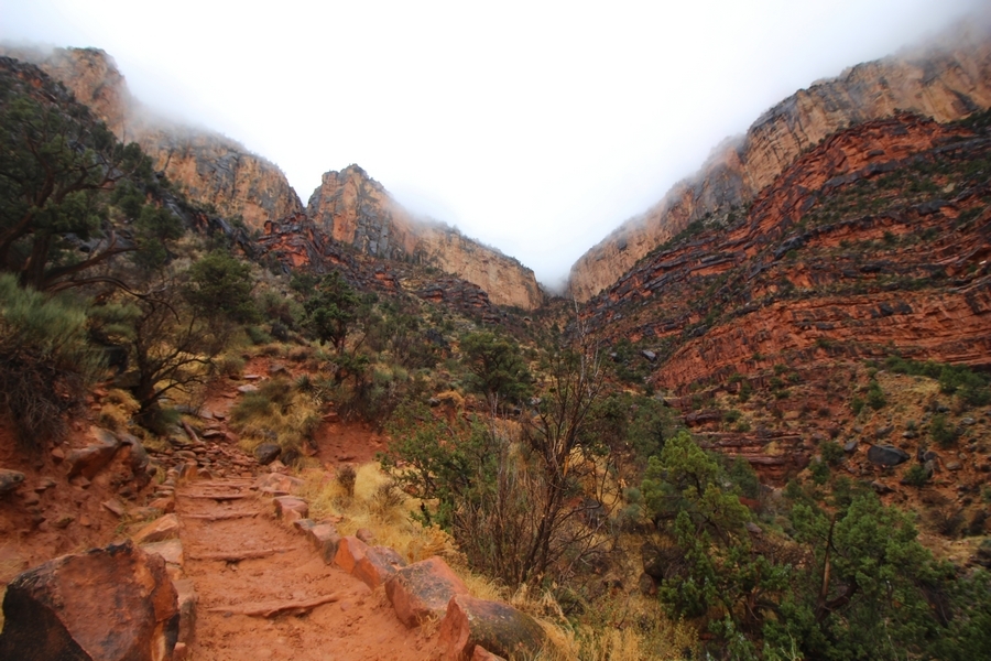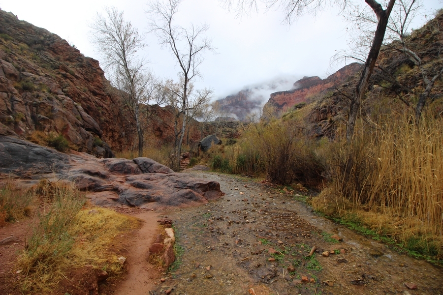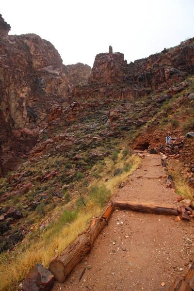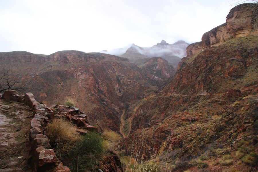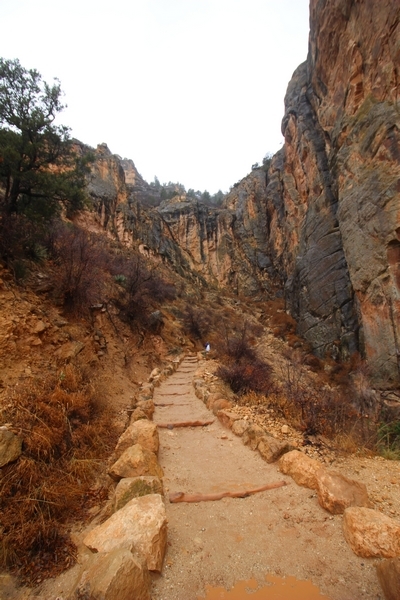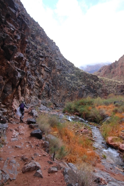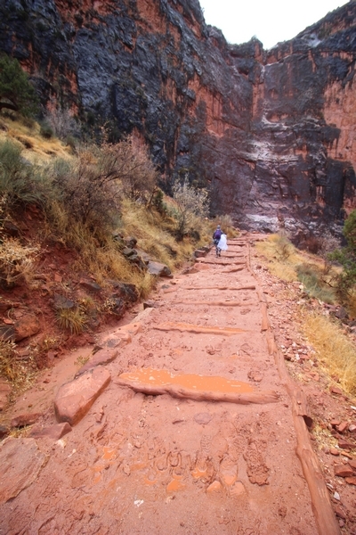 We got up feeling sore, but we were both happy to have worked our tired muscles walking up to Ribbon Falls the day before – even more so were we thankful for our cozy cabin, as the rain had continued to fall steadily through the night. For the second day in a row, ours was the “late” breakfast at 6:30am (the early seating is at 5, desirable in the summer months for those wanting to beat the excessive heat), and just a handful of the guests we had met were heading out up the Bright Angel Trail today – most were exiting the canyon via the South Kaibab route. Having come down that way, we couldn’t imagine going up the steep switchbacks to The Tipoff, much less the steep climb to Skeleton Point – still, we acknowledged the advantages of a shorter walk, even if steeper. Our exit would be some 10 miles and about 4,500′ of gain – we’d walk back to the river, cross on the western Silver Bridge, then walk about a mile downstream where we’d turn south up the Garden Creek drainage and start climbing out. Upon reaching the Tonto Platform, we’d continue south through Indian Garden and resume climbing up through a succession of cliff bands, emerging on the South Rim about a half mile west of our hotel. Chris knew well in advance this would be a slow day for him, but we figured to try and maintain a simple, steady pace – we’d get to the rim soon enough. We left Phantom Ranch just after 8am, walking the familiar path out past the ranger station and down the creek, this time staying on the east side as we passed familiar faces doing their morning thing in the campground on the opposite bank. We crossed the creek at the mouth of Bright Angel Canyon and made our way westward through some NPS facilities to the Silver Bridge – blue skies had been threatening to break through all morning, and, apart from some wispy clouds still hanging around here and there, it looked like the day would turn out to be a nice one. We crossed the bridge to the south bank, turning west on the River Trail, and noted how the previous night’s rain seemed to highlight all the colors in the rocks and vegetation around us – the precipitation also served to pack down the trail surface a bit, much appreciated as we proceeded through a long sandy section that would have been otherwise laborious. The walk along the river was uneventful, the exceptions being the unexpected gain and loss of about 200′ over riverside cliffs and the astonishingly beautiful views of the surrounding terrain features wreathed in clouds. We soon reached the River Rest House where the trail left the river’s edge, just in time for the sprinkles to start falling for the first time today – as we made our way up the easy grade along Garden Creek, we encountered the mud and puddles of water that would become the order of the day. After a couple of creek crossings, the latter of which being where Chris’ foot slipped off a rock and got a good dunking as a result, we ascended further up the canyon on the winding trail, following the eastern Pipe Creek drainage to the base of a steep series of switchbacks known as the Devil’s Corkscrew. The sprinkles had turned to steady rain, so on went the ponchos again as we gained some 500′ over the next half mile – still gaining, we rounded the north end of a ridge and contoured back into the Garden Creek canyon, meeting the creek and turning southward again. The rain now dissipating, the gradient moderated significantly here as we followed the sycamore-filled gully up to the Tonto plateau, although the swollen creek had overflowed its banks in a few spots and was basically washing directly down the trail. We picked our way upward, our pace slowing predictably, until we made a final creek crossing and our path led higher upslope away from the watercourse the rest of the way out of the picturesque little canyon. We passed a junction with the eastbound Tonto Trail and made our way into Indian Garden – we had considered camping for a night here during our initial trip planning when we were still thinking of backpacking – and Chris noted a restroom uphill and away from us along the trail. Jane made a cryptic comment about not wanting to go up the hill and wandered off to the west, Chris thinking she was just exploring a bit – he sat down on a nearby bench to send a satellite text message to the kids on our progress before realizing in a panic that he’d not seen Jane for several minutes. Jane’s propensity to take wrong turns is well known to us both, and the westbound Tonto Trail junction was just opposite from where Chris was sitting – crap, said he, she’s taken the wrong trail, and, leaving his pack on the bench, headed quickly west on the lateral route, shouting Jane’s name. Half running, half walking fast, he came upon a pair of hikers heading east – had they seen a solo woman on the trail? Yes, they said, she’s not more than 5 minutes ahead, so Chris picked up his pace (not an easy task, mind you), and he found Jane another quarter mile west, she having stopped to remove a troublesome pebble from her boot – thank goodness for that, as he might still be chasing her. After a brief argument, er, conversation, we realized her stopping point offered a wide vista northward to clouds and snow on the various north canyon features – Jane takes full credit now for leading Chris to some really nice photo ops. Okay, whatever. We made our way back east to Indian Garden and resumed our trek southward, on the correct trail now, and the rain began again in earnest. And so the grade increased as well, although we were soon energized by the sun breaking through and turning the gloomy canyon into an array of color and light. About a half mile south of Indian Garden, the trail starts to switchback up the initial canyon headwall to the 3-Mile Rest House (so named for its distance from the South Rim trailhead) – Chris’ pace slowed considerably here, not from any cardio issues but bec