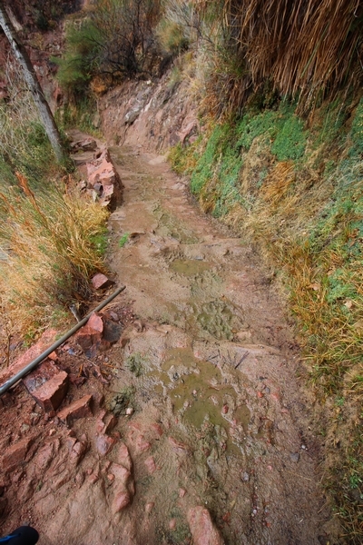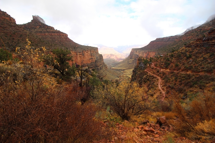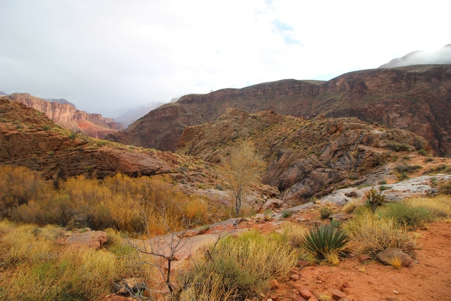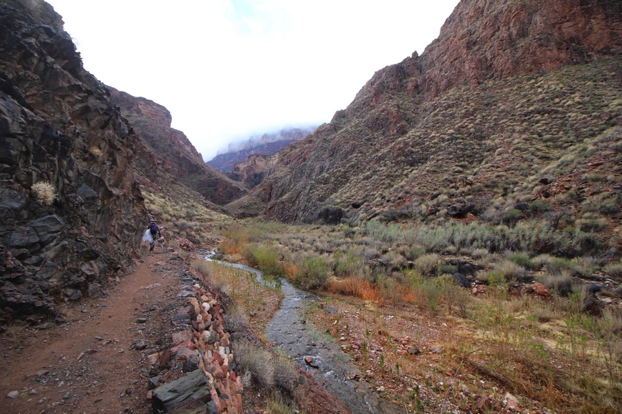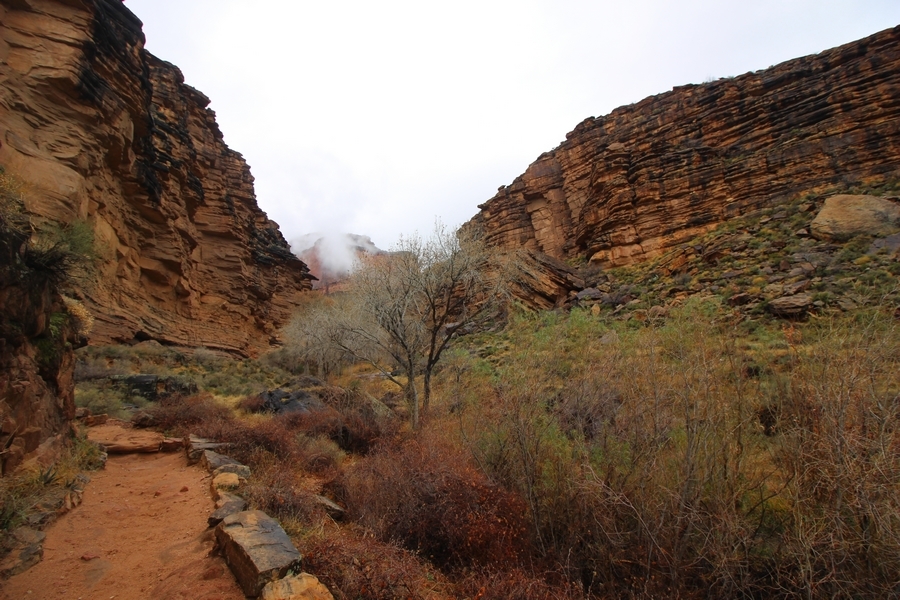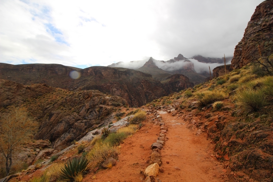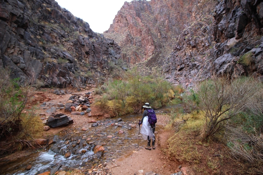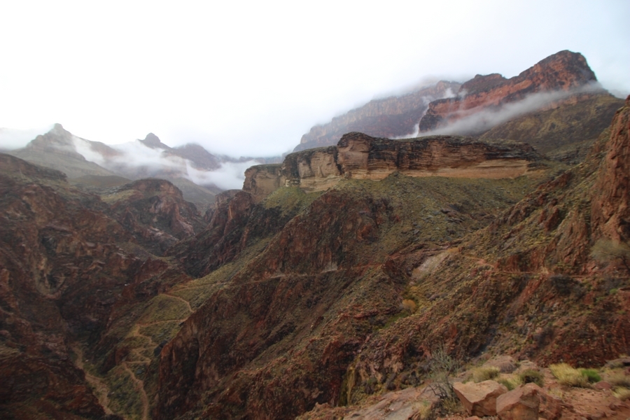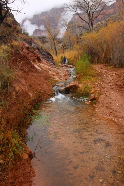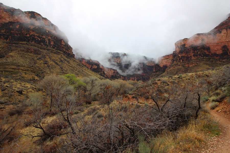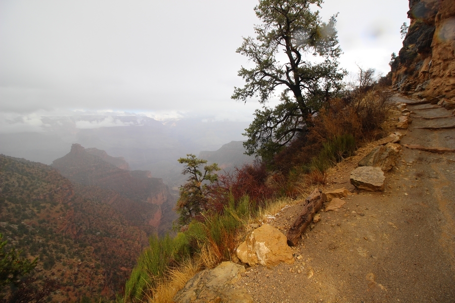 We got up feeling sore, but we were both happy to have worked our tired muscles walking up to Ribbon Falls the day before – even more so were we thankful for our cozy cabin, as the rain had continued to fall steadily through the night. For the second day in a row, ours was the “late” breakfast at 6:30am (the early seating is at 5, desirable in the summer months for those wanting to beat the excessive heat), and just a handful of the guests we had met were heading out up the Bright Angel Trail today – most were exiting the canyon via the South Kaibab route. Having come down that way, we couldn’t imagine going up the steep switchbacks to The Tipoff, much less the steep climb to Skeleton Point – still, we acknowledged the advantages of a shorter walk, even if steeper. Our exit would be some 10 miles and about 4,500′ of gain – we’d walk back to the river, cross on the western Silver Bridge, then walk about a mile downstream where we’d turn south up the Garden Creek drainage and start climbing out. Upon reaching the Tonto Platform, we’d continue south through Indian Garden and resume climbing up through a succession of cliff bands, emerging on the South Rim about a half mile west of our hotel. Chris knew well in advance this would be a slow day for him, but we figured to try and maintain a simple, steady pace – we’d get to the rim soon enough. We left Phantom Ranch just after 8am, walking the familiar path out past the ranger station and down the creek, this time staying on the east side as we passed familiar faces doing their morning thing in the campground on the opposite bank. We crossed the creek at the mouth of Bright Angel Canyon and made our way westward through some NPS facilities to the Silver Bridge – blue skies had been threatening to break through all morning, and, apart from some wispy clouds still hanging around here and there, it looked like the day would turn out to be a nice one. We crossed the bridge to the south bank, turning west on the River Trail, and noted how the previous night’s rain seemed to highlight all the colors in the rocks and vegetation around us – the precipitation also served to pack down the trail surface a bit, much appreciated as we proceeded through a long sandy section that would have been otherwise laborious. The walk along the river was uneventful, the exceptions being the unexpected gain and loss of about 200′ over riverside cliffs and the astonishingly beautiful views of the surrounding terrain features wreathed in clouds. We soon reached the River Rest House where the trail left the river’s edge, just in time for the sprinkles to start falling for the first time today – as we made our way up the easy grade along Garden Creek, we encountered the mud and puddles of water that would become the order of the day. After a couple of creek crossings, the latter of which being where Chris’ foot slipped off a rock and got a good dunking as a result, we ascended further up the canyon on the winding trail, following the eastern Pipe Creek drainage to the base of a steep series of switchbacks known as the Devil’s Corkscrew. The sprinkles had turned to steady rain, so on went the ponchos again as we gained some 500′ over the next half mile – still gaining, we rounded the north end of a ridge and contoured back into the Garden Creek canyon, meeting the creek and turning southward again. The rain now dissipating, the gradient moderated significantly here as we followed the sycamore-filled gully up to the Tonto plateau, although the swollen creek had overflowed its banks in a few spots and was basically washing directly down the trail. We picked our way upward, our pace slowing predictably, until we made a final creek crossing and our path led higher upslope away from the watercourse the rest of the way out of the picturesque little canyon. We passed a junction with the eastbound Tonto Trail and made our way into Indian Garden – we had considered camping for a night here during our initial trip planning when we were still thinking of backpacking – and Chris noted a restroom uphill and away from us along the trail. Jane made a cryptic comment about not wanting to go up the hill and wandered off to the west, Chris thinking she was just exploring a bit – he sat down on a nearby bench to send a satellite text message to the kids on our progress before realizing in a panic that he’d not seen Jane for several minutes. Jane’s propensity to take wrong turns is well known to us both, and the westbound Tonto Trail junction was just opposite from where Chris was sitting – crap, said he, she’s taken the wrong trail, and, leaving his pack on the bench, headed quickly west on the lateral route, shouting Jane’s name. Half running, half walking fast, he came upon a pair of hikers heading east – had they seen a solo woman on the trail? Yes, they said, she’s not more than 5 minutes ahead, so Chris picked up his pace (not an easy task, mind you), and he found Jane another quarter mile west, she having stopped to remove a troublesome pebble from her boot – thank goodness for that, as he might still be chasing her. After a brief argument, er, conversation, we realized her stopping point offered a wide vista northward to clouds and snow on the various north canyon features – Jane takes full credit now for leading Chris to some really nice photo ops. Okay, whatever. We made our way back east to Indian Garden and resumed our trek southward, on the correct trail now, and the rain began again in earnest. And so the grade increased as well, although we were soon energized by the sun breaking through and turning the gloomy canyon into an array of color and light. About a half mile south of Indian Garden, the trail starts to switchback up the initial canyon headwall to the 3-Mile Rest House (so named for its distance from the South Rim trailhead) – Chris’ pace slowed considerably here, not from any cardio issues but bec