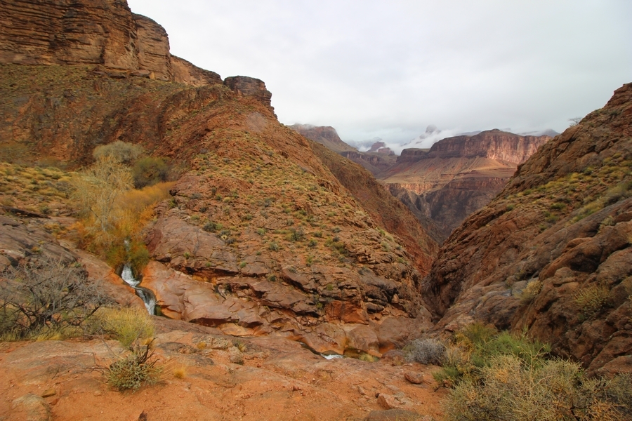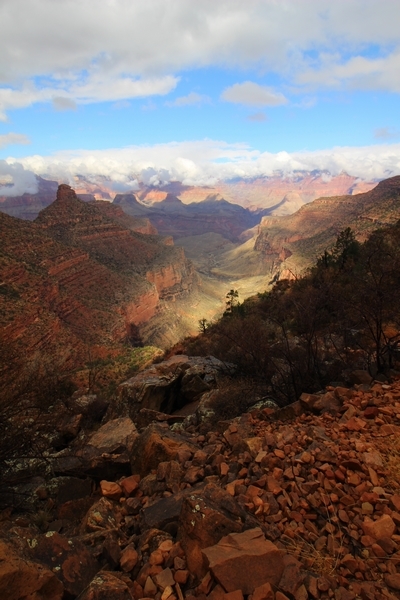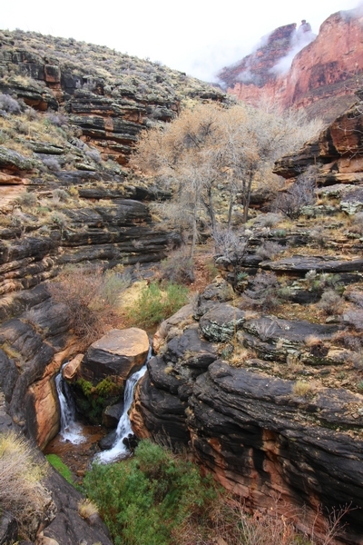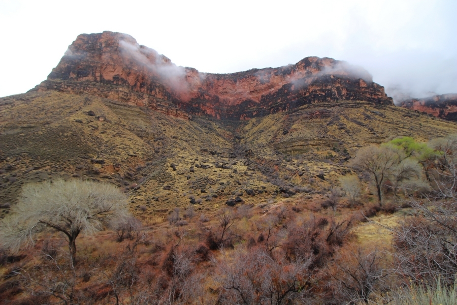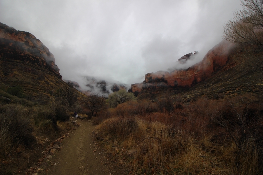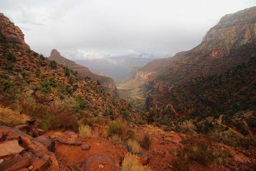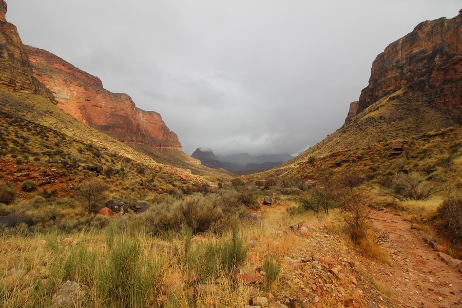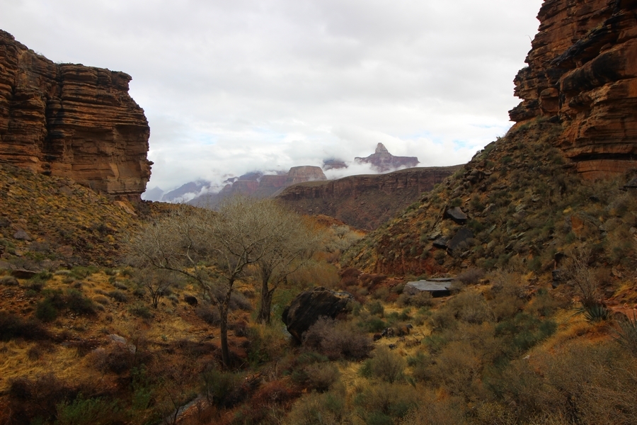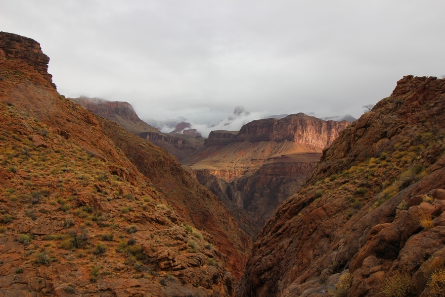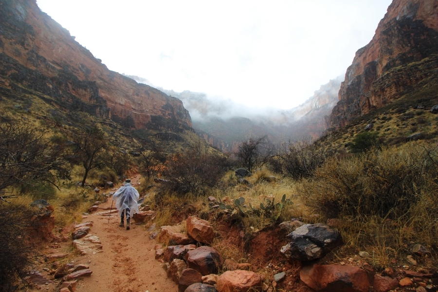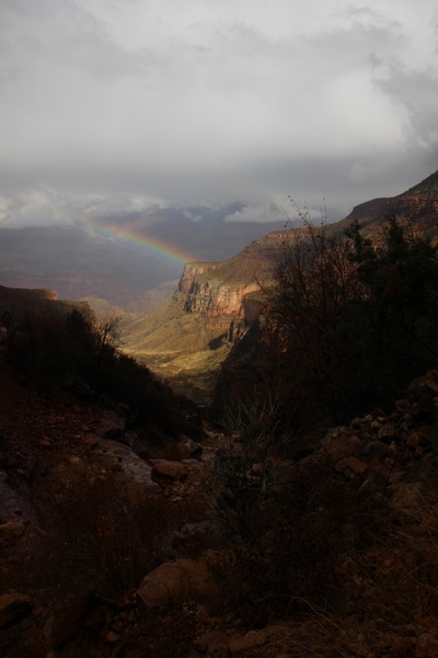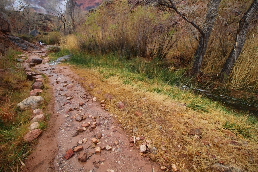 We got up feeling sore, but we were both happy to have worked our tired muscles walking up to Ribbon Falls the day before – even more so were we thankful for our cozy cabin, as the rain had continued to fall steadily through the night. For the second day in a row, ours was the “late” breakfast at 6:30am (the early seating is at 5, desirable in the summer months for those wanting to beat the excessive heat), and just a handful of the guests we had met were heading out up the Bright Angel Trail today – most were exiting the canyon via the South Kaibab route. Having come down that way, we couldn’t imagine going up the steep switchbacks to The Tipoff, much less the steep climb to Skeleton Point – still, we acknowledged the advantages of a shorter walk, even if steeper. Our exit would be some 10 miles and about 4,500′ of gain – we’d walk back to the river, cross on the western Silver Bridge, then walk about a mile downstream where we’d turn south up the Garden Creek drainage and start climbing out. Upon reaching the Tonto Platform, we’d continue south through Indian Garden and resume climbing up through a succession of cliff bands, emerging on the South Rim about a half mile west of our hotel. Chris knew well in advance this would be a slow day for him, but we figured to try and maintain a simple, steady pace – we’d get to the rim soon enough. We left Phantom Ranch just after 8am, walking the familiar path out past the ranger station and down the creek, this time staying on the east side as we passed familiar faces doing their morning thing in the campground on the opposite bank. We crossed the creek at the mouth of Bright Angel Canyon and made our way westward through some NPS facilities to the Silver Bridge – blue skies had been threatening to break through all morning, and, apart from some wispy clouds still hanging around here and there, it looked like the day would turn out to be a nice one. We crossed the bridge to the south bank, turning west on the River Trail, and noted how the previous night’s rain seemed to highlight all the colors in the rocks and vegetation around us – the precipitation also served to pack down the trail surface a bit, much appreciated as we proceeded through a long sandy section that would have been otherwise laborious. The walk along the river was uneventful, the exceptions being the unexpected gain and loss of about 200′ over riverside cliffs and the astonishingly beautiful views of the surrounding terrain features wreathed in clouds. We soon reached the River Rest House where the trail left the river’s edge, just in time for the sprinkles to start falling for the first time today – as we made our way up the easy grade along Garden Creek, we encountered the mud and puddles of water that would become the order of the day. After a couple of creek crossings, the latter of which being where Chris’ foot slipped off a rock and got a good dunking as a result, we ascended further up the canyon on the winding trail, following the eastern Pipe Creek drainage to the base of a steep series of switchbacks known as the Devil’s Corkscrew. The sprinkles had turned to steady rain, so on went the ponchos again as we gained some 500′ over the next half mile – still gaining, we rounded the north end of a ridge and contoured back into the Garden Creek canyon, meeting the creek and turning southward again. The rain now dissipating, the gradient moderated significantly here as we followed the sycamore-filled gully up to the Tonto plateau, although the swollen creek had overflowed its banks in a few spots and was basically washing directly down the trail. We picked our way upward, our pace slowing predictably, until we made a final creek crossing and our path led higher upslope away from the watercourse the rest of the way out of the picturesque little canyon. We passed a junction with the eastbound Tonto Trail and made our way into Indian Garden – we had considered camping for a night here during our initial trip planning when we were still thinking of backpacking – and Chris noted a restroom uphill and away from us along the trail. Jane made a cryptic comment about not wanting to go up the hill and wandered off to the west, Chris thinking she was just exploring a bit – he sat down on a nearby bench to send a satellite text message to the kids on our progress before realizing in a panic that he’d not seen Jane for several minutes. Jane’s propensity to take wrong turns is well known to us both, and the westbound Tonto Trail junction was just opposite from where Chris was sitting – crap, said he, she’s taken the wrong trail, and, leaving his pack on the bench, headed quickly west on the lateral route, shouting Jane’s name. Half running, half walking fast, he came upon a pair of hikers heading east – had they seen a solo woman on the trail? Yes, they said, she’s not more than 5 minutes ahead, so Chris picked up his pace (not an easy task, mind you), and he found Jane another quarter mile west, she having stopped to remove a troublesome pebble from her boot – thank goodness for that, as he might still be chasing her. After a brief argument, er, conversation, we realized her stopping point offered a wide vista northward to clouds and snow on the various north canyon features – Jane takes full credit now for leading Chris to some really nice photo ops. Okay, whatever. We made our way back east to Indian Garden and resumed our trek southward, on the correct trail now, and the rain began again in earnest. And so the grade increased as well, although we were soon energized by the sun breaking through and turning the gloomy canyon into an array of color and light. About a half mile south of Indian Garden, the trail starts to switchback up the initial canyon headwall to the 3-Mile Rest House (so named for its distance from the South Rim trailhead) – Chris’ pace slowed considerably here, not from any cardio issues but bec
