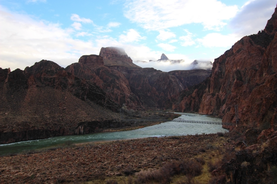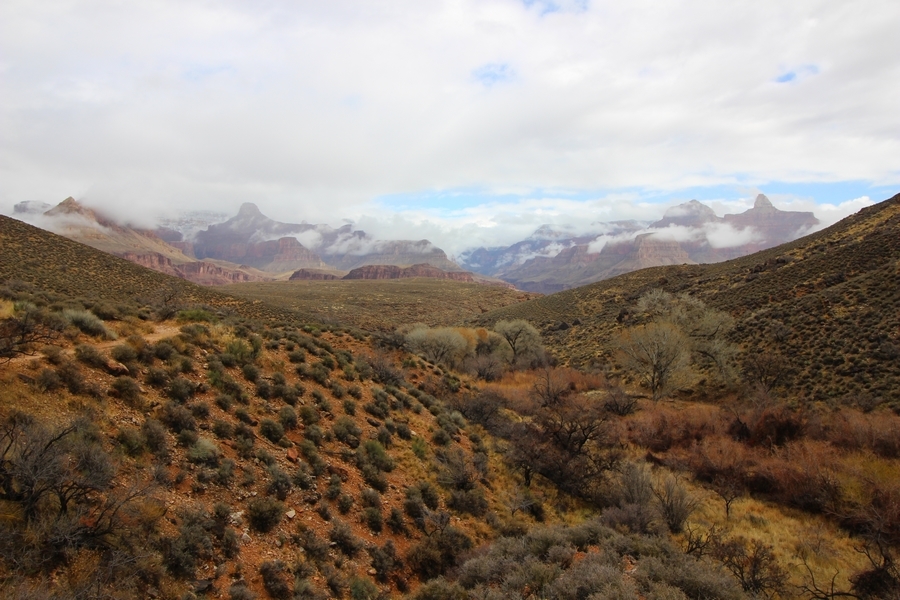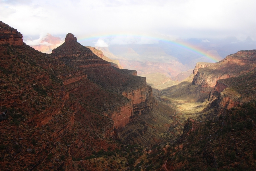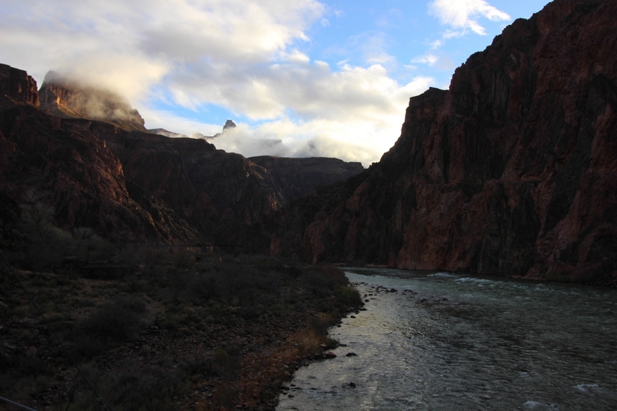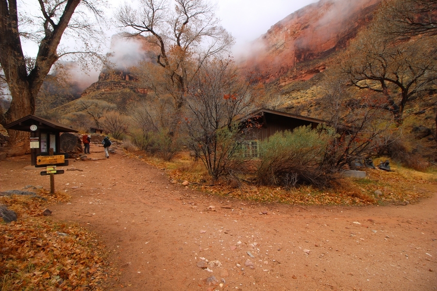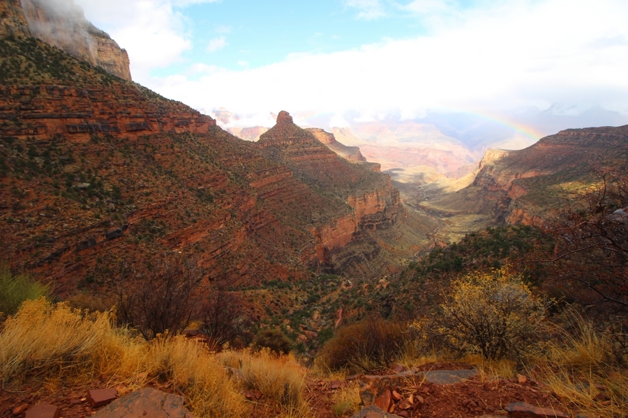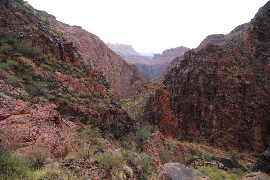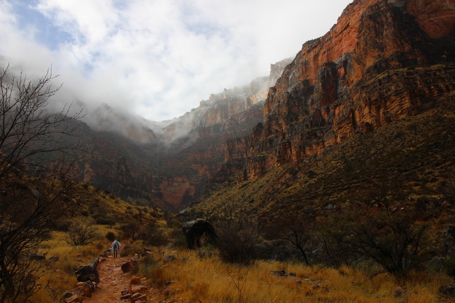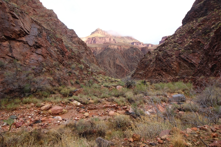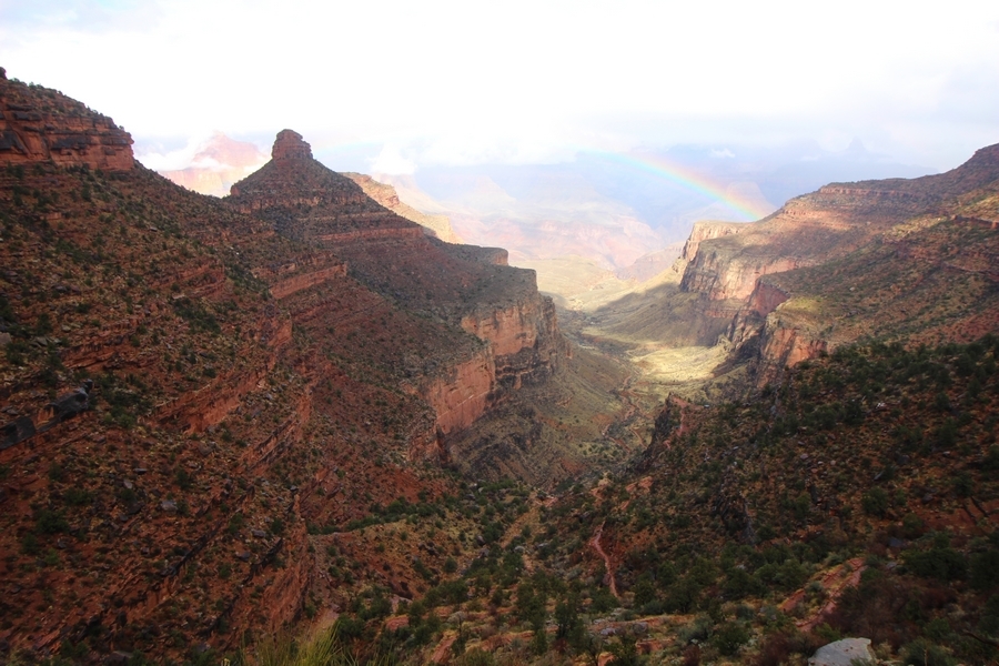 We got up feeling sore, but we were both happy to have worked our tired muscles walking up to Ribbon Falls the day before – even more so were we thankful for our cozy cabin, as the rain had continued to fall steadily through the night. For the second day in a row, ours was the “late” breakfast at 6:30am (the early seating is at 5, desirable in the summer months for those wanting to beat the excessive heat), and just a handful of the guests we had met were heading out up the Bright Angel Trail today – most were exiting the canyon via the South Kaibab route. Having come down that way, we couldn’t imagine going up the steep switchbacks to The Tipoff, much less the steep climb to Skeleton Point – still, we acknowledged the advantages of a shorter walk, even if steeper. Our exit would be some 10 miles and about 4,500′ of gain – we’d walk back to the river, cross on the western Silver Bridge, then walk about a mile downstream where we’d turn south up the Garden Creek drainage and start climbing out. Upon reaching the Tonto Platform, we’d continue south through Indian Garden and resume climbing up through a succession of cliff bands, emerging on the South Rim about a half mile west of our hotel. Chris knew well in advance this would be a slow day for him, but we figured to try and maintain a simple, steady pace – we’d get to the rim soon enough. We left Phantom Ranch just after 8am, walking the familiar path out past the ranger station and down the creek, this time staying on the east side as we passed familiar faces doing their morning thing in the campground on the opposite bank. We crossed the creek at the mouth of Bright Angel Canyon and made our way westward through some NPS facilities to the Silver Bridge – blue skies had been threatening to break through all morning, and, apart from some wispy clouds still hanging around here and there, it looked like the day would turn out to be a nice one. We crossed the bridge to the south bank, turning west on the River Trail, and noted how the previous night’s rain seemed to highlight all the colors in the rocks and vegetation around us – the precipitation also served to pack down the trail surface a bit, much appreciated as we proceeded through a long sandy section that would have been otherwise laborious. The walk along the river was uneventful, the exceptions being the unexpected gain and loss of about 200′ over riverside cliffs and the astonishingly beautiful views of the surrounding terrain features wreathed in clouds. We soon reached the River Rest House where the trail left the river’s edge, just in time for the sprinkles to start falling for the first time today – as we made our way up the easy grade along Garden Creek, we encountered the mud and puddles of water that would become the order of the day. After a couple of creek crossings, the latter of which being where Chris’ foot slipped off a rock and got a good dunking as a result, we ascended further up the canyon on the winding trail, following the eastern Pipe Creek drainage to the base of a steep series of switchbacks known as the Devil’s Corkscrew. The sprinkles had turned to steady rain, so on went the ponchos again as we gained some 500′ over the next half mile – still gaining, we rounded the north end of a ridge and contoured back into the Garden Creek canyon, meeting the creek and turning southward again. The rain now dissipating, the gradient moderated significantly here as we followed the sycamore-filled gully up to the Tonto plateau, although the swollen creek had overflowed its banks in a few spots and was basically washing directly down the trail. We picked our way upward, our pace slowing predictably, until we made a final creek crossing and our path led higher upslope away from the watercourse the rest of the way out of the picturesque little canyon. We passed a junction with the eastbound Tonto Trail and made our way into Indian Garden – we had considered camping for a night here during our initial trip planning when we were still thinking of backpacking – and Chris noted a restroom uphill and away from us along the trail. Jane made a cryptic comment about not wanting to go up the hill and wandered off to the west, Chris thinking she was just exploring a bit – he sat down on a nearby bench to send a satellite text message to the kids on our progress before realizing in a panic that he’d not seen Jane for several minutes. Jane’s propensity to take wrong turns is well known to us both, and the westbound Tonto Trail junction was just opposite from where Chris was sitting – crap, said he, she’s taken the wrong trail, and, leaving his pack on the bench, headed quickly west on the lateral route, shouting Jane’s name. Half running, half walking fast, he came upon a pair of hikers heading east – had they seen a solo woman on the trail? Yes, they said, she’s not more than 5 minutes ahead, so Chris picked up his pace (not an easy task, mind you), and he found Jane another quarter mile west, she having stopped to remove a troublesome pebble from her boot – thank goodness for that, as he might still be chasing her. After a brief argument, er, conversation, we realized her stopping point offered a wide vista northward to clouds and snow on the various north canyon features – Jane takes full credit now for leading Chris to some really nice photo ops. Okay, whatever. We made our way back east to Indian Garden and resumed our trek southward, on the correct trail now, and the rain began again in earnest. And so the grade increased as well, although we were soon energized by the sun breaking through and turning the gloomy canyon into an array of color and light. About a half mile south of Indian Garden, the trail starts to switchback up the initial canyon headwall to the 3-Mile Rest House (so named for its distance from the South Rim trailhead) – Chris’ pace slowed considerably here, not from any cardio issues but bec
