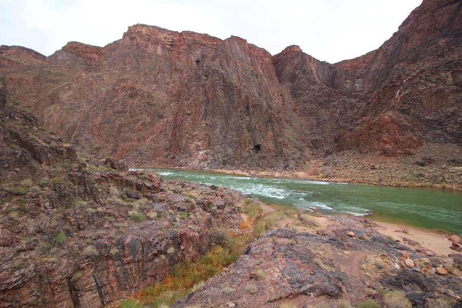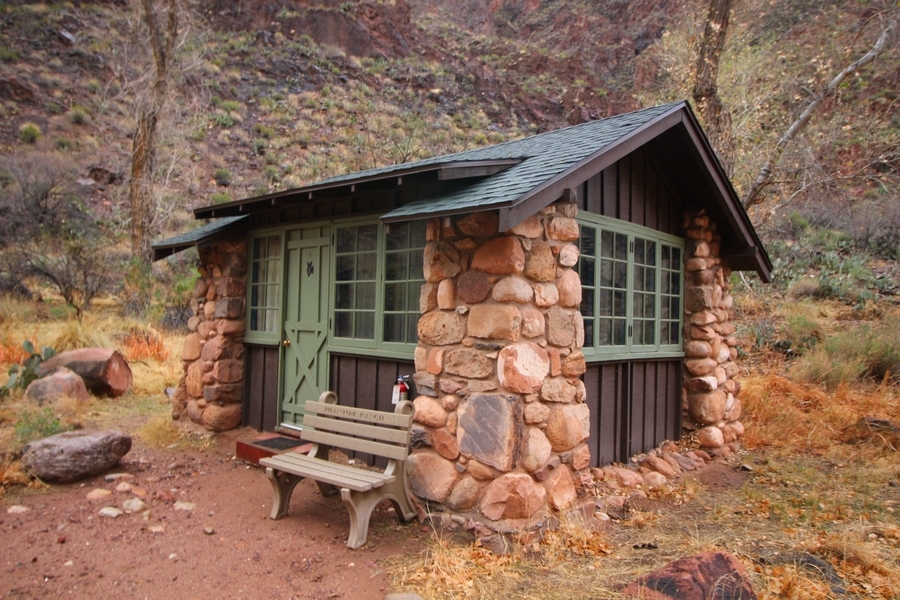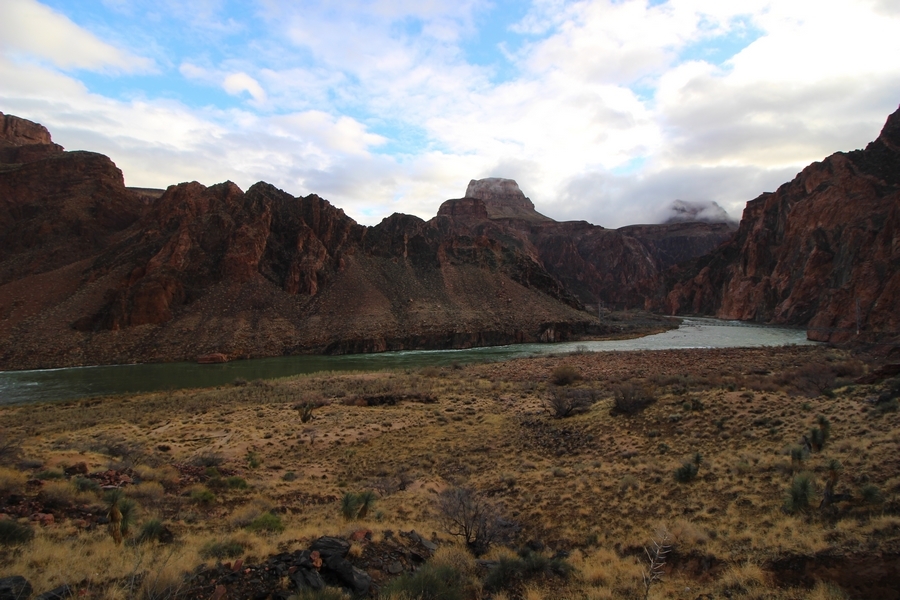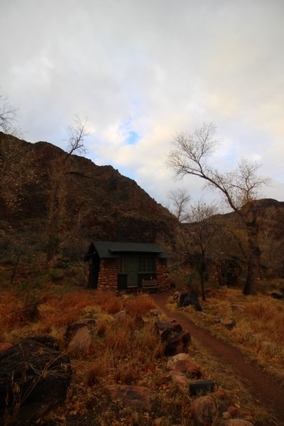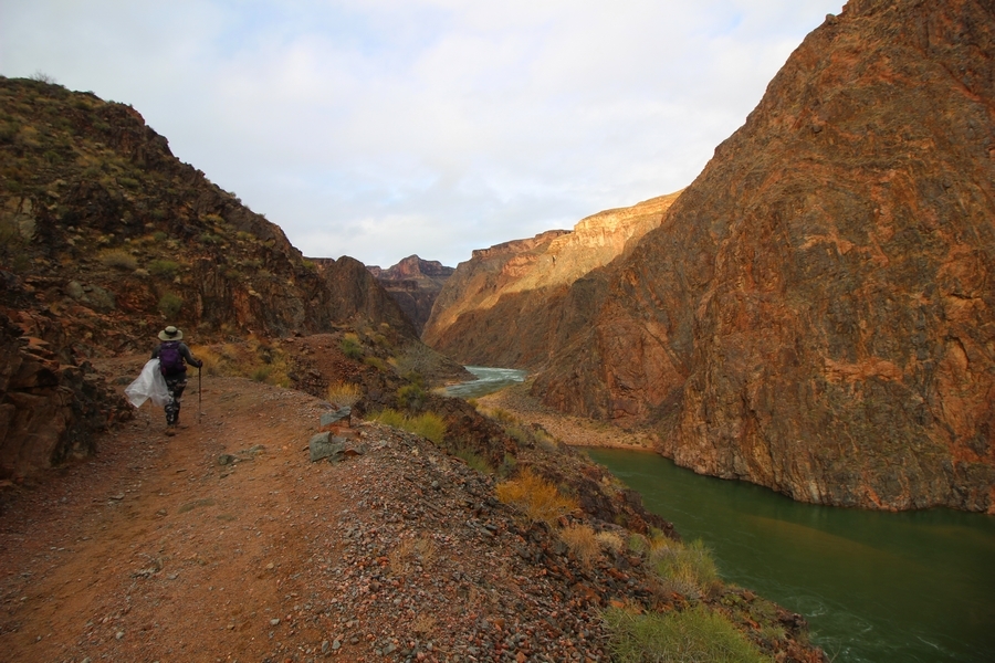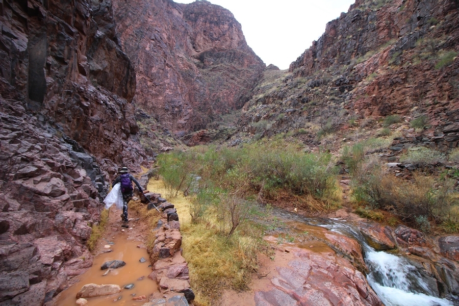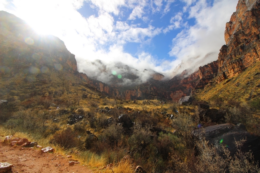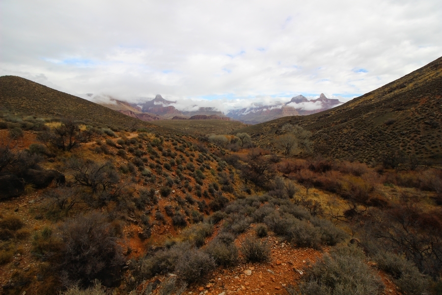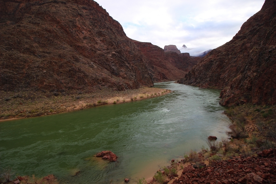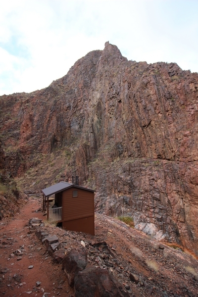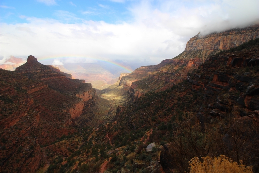 We got up feeling sore, but we were both happy to have worked our tired muscles walking up to Ribbon Falls the day before – even more so were we thankful for our cozy cabin, as the rain had continued to fall steadily through the night. For the second day in a row, ours was the “late” breakfast at 6:30am (the early seating is at 5, desirable in the summer months for those wanting to beat the excessive heat), and just a handful of the guests we had met were heading out up the Bright Angel Trail today – most were exiting the canyon via the South Kaibab route. Having come down that way, we couldn’t imagine going up the steep switchbacks to The Tipoff, much less the steep climb to Skeleton Point – still, we acknowledged the advantages of a shorter walk, even if steeper. Our exit would be some 10 miles and about 4,500′ of gain – we’d walk back to the river, cross on the western Silver Bridge, then walk about a mile downstream where we’d turn south up the Garden Creek drainage and start climbing out. Upon reaching the Tonto Platform, we’d continue south through Indian Garden and resume climbing up through a succession of cliff bands, emerging on the South Rim about a half mile west of our hotel. Chris knew well in advance this would be a slow day for him, but we figured to try and maintain a simple, steady pace – we’d get to the rim soon enough. We left Phantom Ranch just after 8am, walking the familiar path out past the ranger station and down the creek, this time staying on the east side as we passed familiar faces doing their morning thing in the campground on the opposite bank. We crossed the creek at the mouth of Bright Angel Canyon and made our way westward through some NPS facilities to the Silver Bridge – blue skies had been threatening to break through all morning, and, apart from some wispy clouds still hanging around here and there, it looked like the day would turn out to be a nice one. We crossed the bridge to the south bank, turning west on the River Trail, and noted how the previous night’s rain seemed to highlight all the colors in the rocks and vegetation around us – the precipitation also served to pack down the trail surface a bit, much appreciated as we proceeded through a long sandy section that would have been otherwise laborious. The walk along the river was uneventful, the exceptions being the unexpected gain and loss of about 200′ over riverside cliffs and the astonishingly beautiful views of the surrounding terrain features wreathed in clouds. We soon reached the River Rest House where the trail left the river’s edge, just in time for the sprinkles to start falling for the first time today – as we made our way up the easy grade along Garden Creek, we encountered the mud and puddles of water that would become the order of the day. After a couple of creek crossings, the latter of which being where Chris’ foot slipped off a rock and got a good dunking as a result, we ascended further up the canyon on the winding trail, following the eastern Pipe Creek drainage to the base of a steep series of switchbacks known as the Devil’s Corkscrew. The sprinkles had turned to steady rain, so on went the ponchos again as we gained some 500′ over the next half mile – still gaining, we rounded the north end of a ridge and contoured back into the Garden Creek canyon, meeting the creek and turning southward again. The rain now dissipating, the gradient moderated significantly here as we followed the sycamore-filled gully up to the Tonto plateau, although the swollen creek had overflowed its banks in a few spots and was basically washing directly down the trail. We picked our way upward, our pace slowing predictably, until we made a final creek crossing and our path led higher upslope away from the watercourse the rest of the way out of the picturesque little canyon. We passed a junction with the eastbound Tonto Trail and made our way into Indian Garden – we had considered camping for a night here during our initial trip planning when we were still thinking of backpacking – and Chris noted a restroom uphill and away from us along the trail. Jane made a cryptic comment about not wanting to go up the hill and wandered off to the west, Chris thinking she was just exploring a bit – he sat down on a nearby bench to send a satellite text message to the kids on our progress before realizing in a panic that he’d not seen Jane for several minutes. Jane’s propensity to take wrong turns is well known to us both, and the westbound Tonto Trail junction was just opposite from where Chris was sitting – crap, said he, she’s taken the wrong trail, and, leaving his pack on the bench, headed quickly west on the lateral route, shouting Jane’s name. Half running, half walking fast, he came upon a pair of hikers heading east – had they seen a solo woman on the trail? Yes, they said, she’s not more than 5 minutes ahead, so Chris picked up his pace (not an easy task, mind you), and he found Jane another quarter mile west, she having stopped to remove a troublesome pebble from her boot – thank goodness for that, as he might still be chasing her. After a brief argument, er, conversation, we realized her stopping point offered a wide vista northward to clouds and snow on the various north canyon features – Jane takes full credit now for leading Chris to some really nice photo ops. Okay, whatever. We made our way back east to Indian Garden and resumed our trek southward, on the correct trail now, and the rain began again in earnest. And so the grade increased as well, although we were soon energized by the sun breaking through and turning the gloomy canyon into an array of color and light. About a half mile south of Indian Garden, the trail starts to switchback up the initial canyon headwall to the 3-Mile Rest House (so named for its distance from the South Rim trailhead) – Chris’ pace slowed considerably here, not from any cardio issues but bec