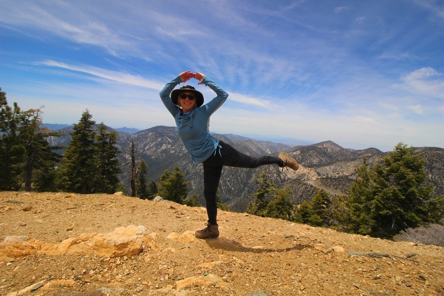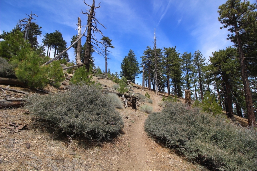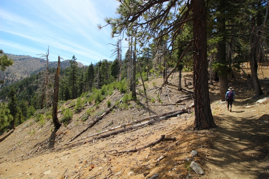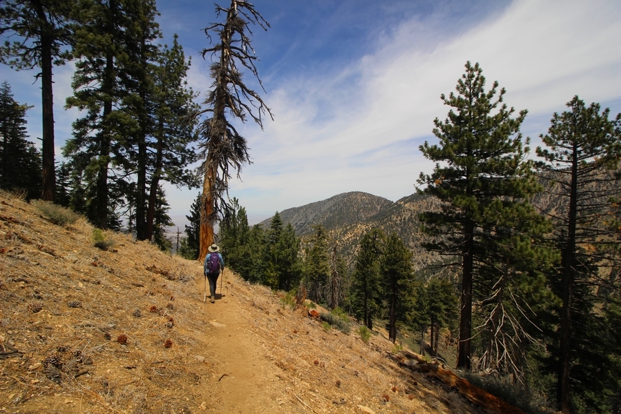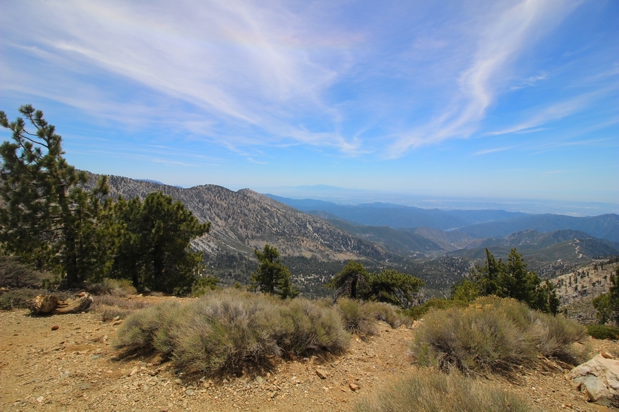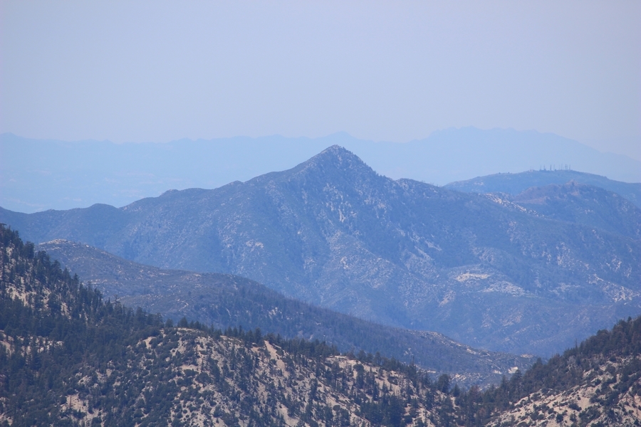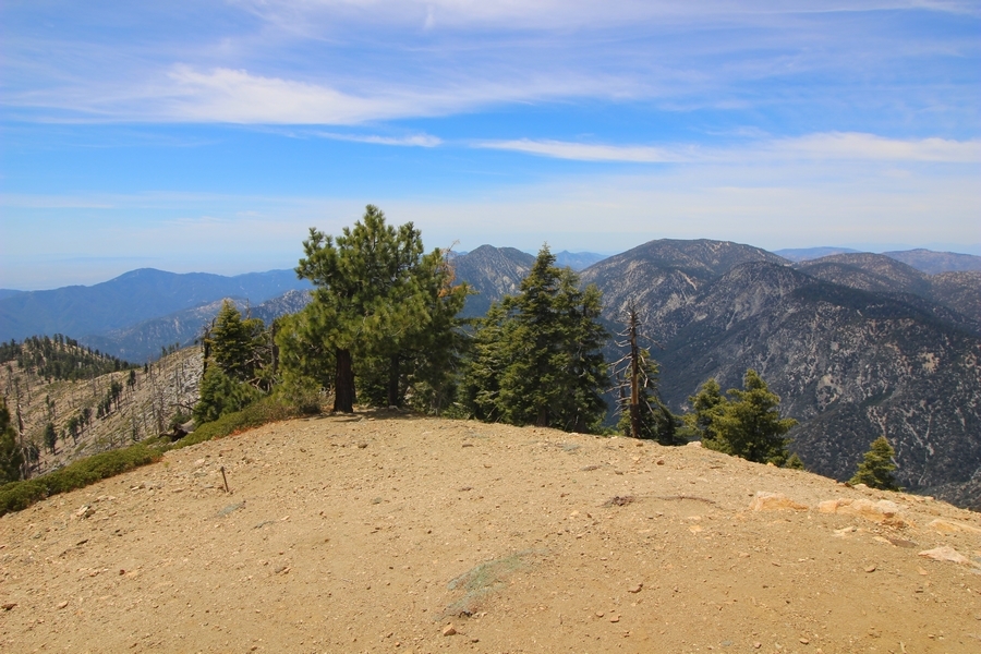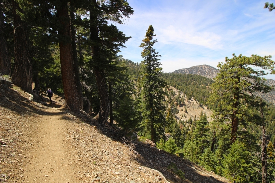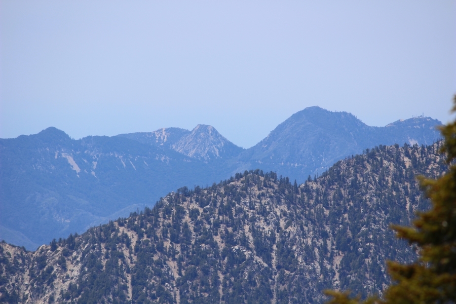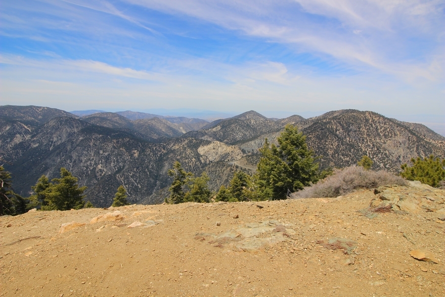 It was Cinco de Mayo, and we had that rare combination – or so it seems anymore – of a desire for exercise and a free day in which to do it. Of our various options, we settled on a repeat of our 2014 hike to Mt. Islip, elev. 8,261′, which we remembered to be about 7-ish roundtrip miles with manageable elevation gain for our lately-atrophied muscles. Plus, it would get us out on the PCT, the first thru-hiker waves of whom have been passing through Wrightwood over the recent weeks. We got to the trailhead at Islip Saddle a little after 10am, hitting the trail shortly thereafter – the initial grade seemed very easy, especially after no appreciable exertion for either of us since our Arizona trip in February. We continued to make decent time up the 800′ gain over the first mile, then transitioning to a mile-plus of flat ground on the eastward traverse to Little Jimmy Campground, the walk-in-only facility popular with both weekenders and PCTers this time of year. We were quite surprised to find a relatively empty camping area as we passed – perhaps it was a little early still on Saturday for newcomers, and of course the thru-hikers would have been several miles further west at this late hour. A short while later, we finished the mild climb up to Windy Gap where, not surprisingly, there was a fresh, cool breeze blowing northward – despite wispy clouds high overhead, the sun was at its zenith and it felt quite warm, even in the shade of the forest, but the breeze here made it feel 15 degrees cooler. After a brief pause for some photos, we started west from the gap up the Mt. Islip trail, through a moderately steep section at first that gradually eased into a mild gradient up the peak’s east ridge. Chris stopped a few times for photos (and, admittedly, to catch his breath) while Jane surged ahead, which is usually a recipe for disaster. He had spotted her once or twice in this section a couple of hundred yards above, so he knew she wasn’t far away. The trail traverses about 100′ below the summit across the south face of the mountain – here, there’s a junction with the Big Cienaga trail that leads up from Crystal Lake. Chris reached the junction and took the right-hand fork, following the uphill arrow and ignoring the downhill arrow for Big Cienaga to the left. As he climbed higher, he spotted Jane on the other trail about 300 yards below to the west – he hollered several times before she turned around, confused, and she yelled back she had followed the arrow. Apparently, she hadn’t seen the uphill arrow at all, and was quite proud of herself that she had correctly followed the signs. Sigh. (On our way back, Chris found a fallen sign at the Big Cienaga junction that would have certainly indicated more clearly the correct way up had it been standing – Jane felt vindicated, which is always a good thing.) Reunited after her backtrack up to the summit trail, we reached the summit just under two hours after we started. We ate our lunch of protein bars and shakes (Jane had an apple as well) and enjoyed the sights – Catalina was just visible through the marine haze. Leaving the summit after about 30 minutes, we followed the trail eastward down the ridge to a junction with an alternate trail above Windy Gap, one leading directly back down to the campground. We took this fork just to go somewhere new, and it was entirely unexciting save for running across a slender tower in the middle of nowhere that served no apparent purpose – hmmm. Back through the campground we went, then back westward down the PCT to Islip Saddle – we made much better time on the way down, summit-to-saddle in 1:15. This is one of our favorite hikes – we of course saw many hikers, most of them going the distance to Canada, but it’s the views from Windy Gap up to the top that make this hike so appealing, a very high reward-to-effort ratio. The weather helped greatly – warm enough that it was never chilly, even in the wind, but not so warm as to be uncomfortably hot. A great day.