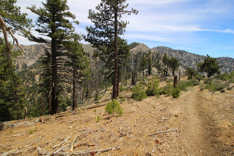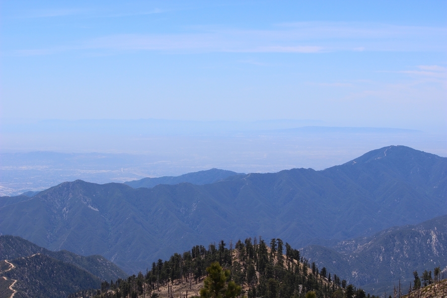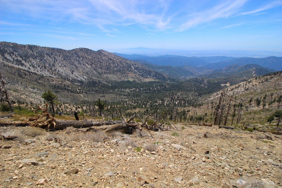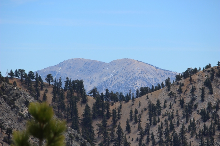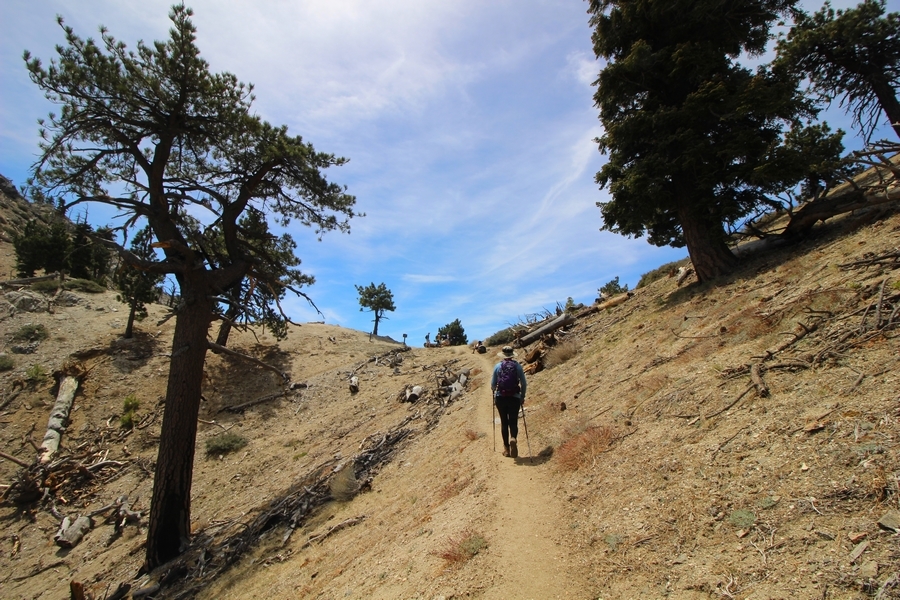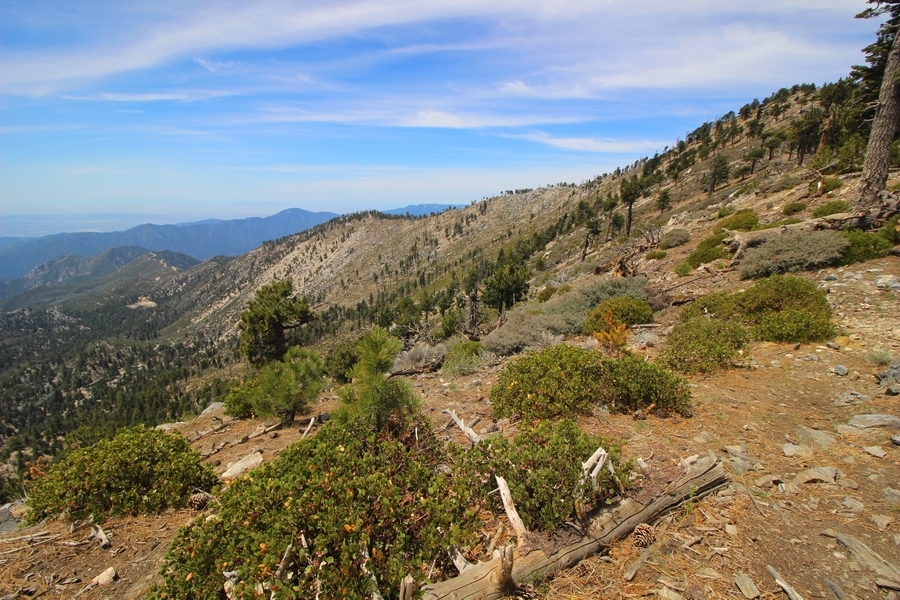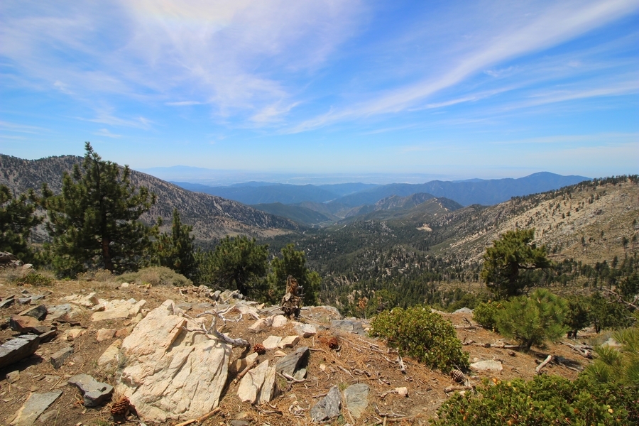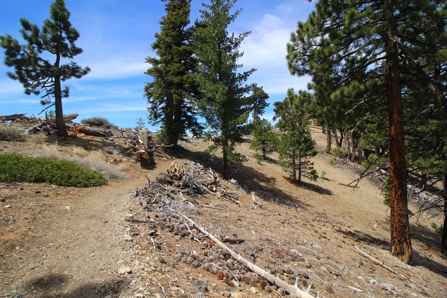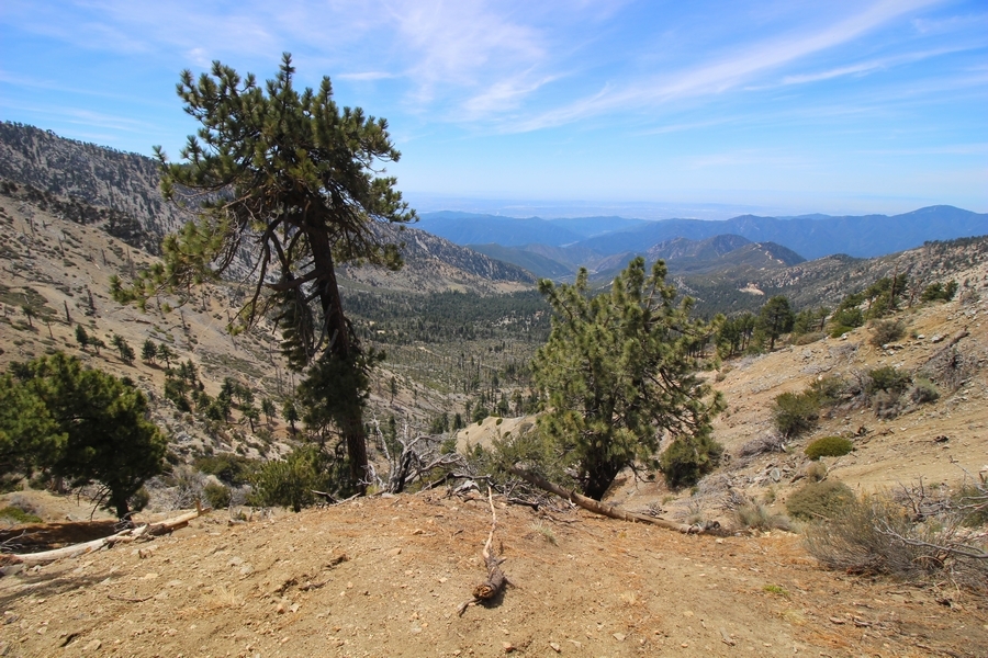 It was Cinco de Mayo, and we had that rare combination – or so it seems anymore – of a desire for exercise and a free day in which to do it. Of our various options, we settled on a repeat of our 2014 hike to Mt. Islip, elev. 8,261′, which we remembered to be about 7-ish roundtrip miles with manageable elevation gain for our lately-atrophied muscles. Plus, it would get us out on the PCT, the first thru-hiker waves of whom have been passing through Wrightwood over the recent weeks. We got to the trailhead at Islip Saddle a little after 10am, hitting the trail shortly thereafter – the initial grade seemed very easy, especially after no appreciable exertion for either of us since our Arizona trip in February. We continued to make decent time up the 800′ gain over the first mile, then transitioning to a mile-plus of flat ground on the eastward traverse to Little Jimmy Campground, the walk-in-only facility popular with both weekenders and PCTers this time of year. We were quite surprised to find a relatively empty camping area as we passed – perhaps it was a little early still on Saturday for newcomers, and of course the thru-hikers would have been several miles further west at this late hour. A short while later, we finished the mild climb up to Windy Gap where, not surprisingly, there was a fresh, cool breeze blowing northward – despite wispy clouds high overhead, the sun was at its zenith and it felt quite warm, even in the shade of the forest, but the breeze here made it feel 15 degrees cooler. After a brief pause for some photos, we started west from the gap up the Mt. Islip trail, through a moderately steep section at first that gradually eased into a mild gradient up the peak’s east ridge. Chris stopped a few times for photos (and, admittedly, to catch his breath) while Jane surged ahead, which is usually a recipe for disaster. He had spotted her once or twice in this section a couple of hundred yards above, so he knew she wasn’t far away. The trail traverses about 100′ below the summit across the south face of the mountain – here, there’s a junction with the Big Cienaga trail that leads up from Crystal Lake. Chris reached the junction and took the right-hand fork, following the uphill arrow and ignoring the downhill arrow for Big Cienaga to the left. As he climbed higher, he spotted Jane on the other trail about 300 yards below to the west – he hollered several times before she turned around, confused, and she yelled back she had followed the arrow. Apparently, she hadn’t seen the uphill arrow at all, and was quite proud of herself that she had correctly followed the signs. Sigh. (On our way back, Chris found a fallen sign at the Big Cienaga junction that would have certainly indicated more clearly the correct way up had it been standing – Jane felt vindicated, which is always a good thing.) Reunited after her backtrack up to the summit trail, we reached the summit just under two hours after we started. We ate our lunch of protein bars and shakes (Jane had an apple as well) and enjoyed the sights – Catalina was just visible through the marine haze. Leaving the summit after about 30 minutes, we followed the trail eastward down the ridge to a junction with an alternate trail above Windy Gap, one leading directly back down to the campground. We took this fork just to go somewhere new, and it was entirely unexciting save for running across a slender tower in the middle of nowhere that served no apparent purpose – hmmm. Back through the campground we went, then back westward down the PCT to Islip Saddle – we made much better time on the way down, summit-to-saddle in 1:15. This is one of our favorite hikes – we of course saw many hikers, most of them going the distance to Canada, but it’s the views from Windy Gap up to the top that make this hike so appealing, a very high reward-to-effort ratio. The weather helped greatly – warm enough that it was never chilly, even in the wind, but not so warm as to be uncomfortably hot. A great day.
