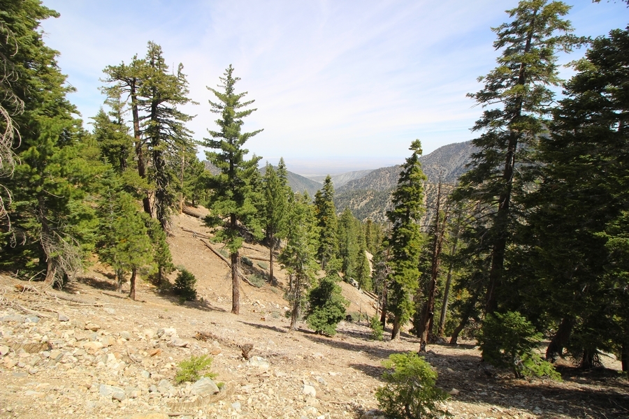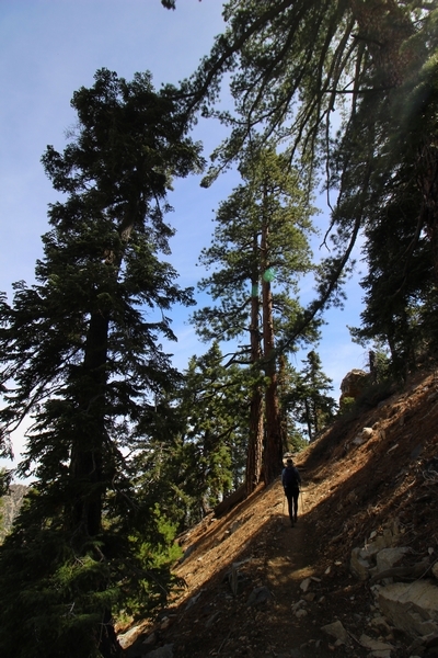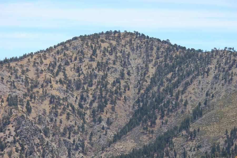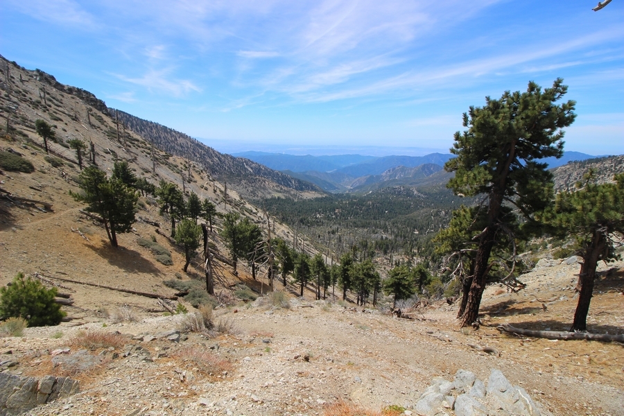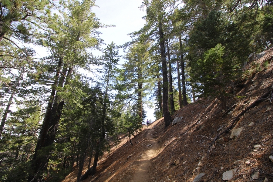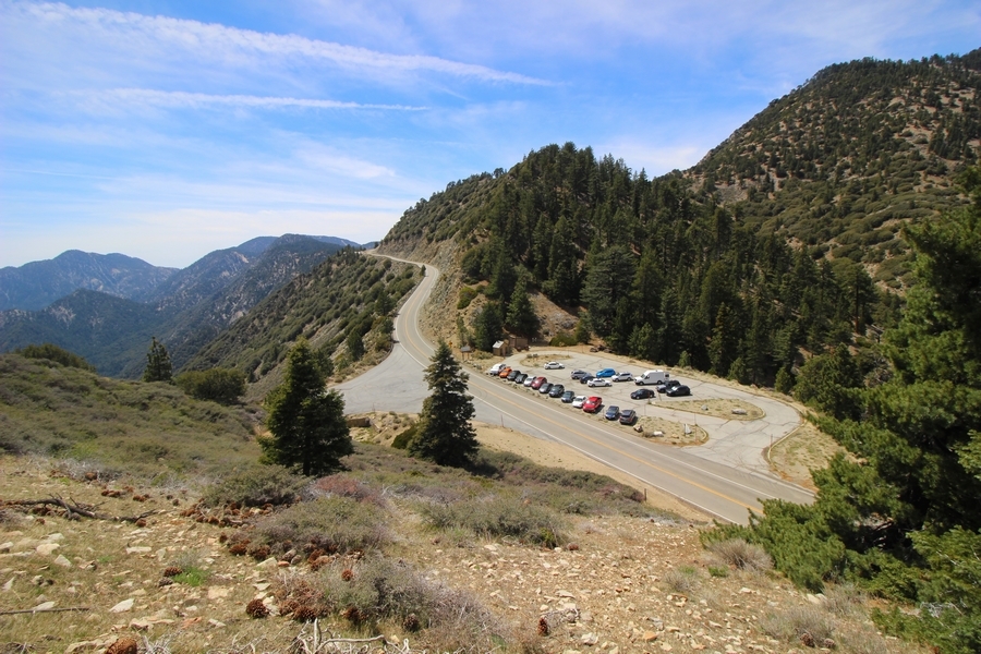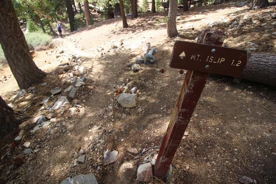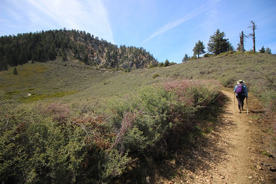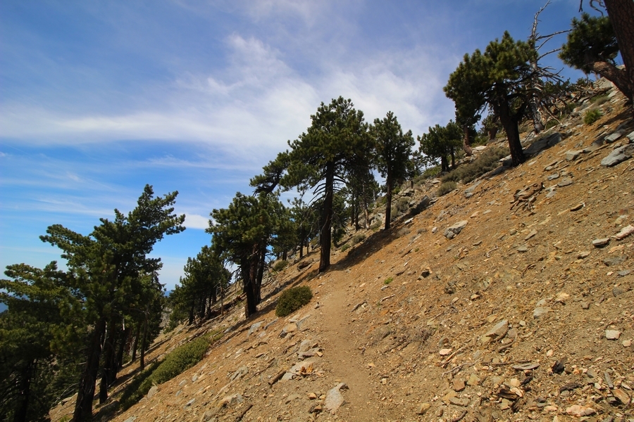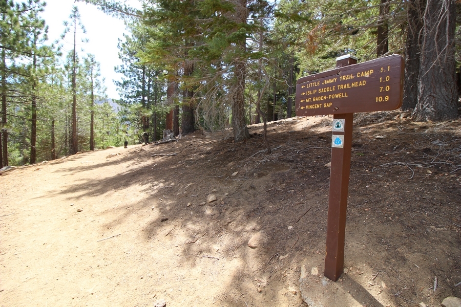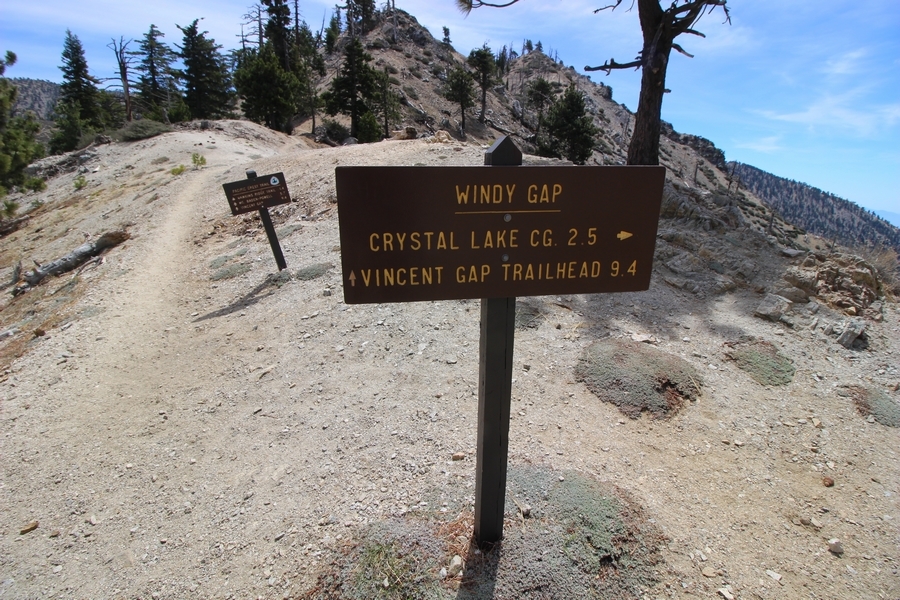 It was Cinco de Mayo, and we had that rare combination – or so it seems anymore – of a desire for exercise and a free day in which to do it. Of our various options, we settled on a repeat of our 2014 hike to Mt. Islip, elev. 8,261′, which we remembered to be about 7-ish roundtrip miles with manageable elevation gain for our lately-atrophied muscles. Plus, it would get us out on the PCT, the first thru-hiker waves of whom have been passing through Wrightwood over the recent weeks. We got to the trailhead at Islip Saddle a little after 10am, hitting the trail shortly thereafter – the initial grade seemed very easy, especially after no appreciable exertion for either of us since our Arizona trip in February. We continued to make decent time up the 800′ gain over the first mile, then transitioning to a mile-plus of flat ground on the eastward traverse to Little Jimmy Campground, the walk-in-only facility popular with both weekenders and PCTers this time of year. We were quite surprised to find a relatively empty camping area as we passed – perhaps it was a little early still on Saturday for newcomers, and of course the thru-hikers would have been several miles further west at this late hour. A short while later, we finished the mild climb up to Windy Gap where, not surprisingly, there was a fresh, cool breeze blowing northward – despite wispy clouds high overhead, the sun was at its zenith and it felt quite warm, even in the shade of the forest, but the breeze here made it feel 15 degrees cooler. After a brief pause for some photos, we started west from the gap up the Mt. Islip trail, through a moderately steep section at first that gradually eased into a mild gradient up the peak’s east ridge. Chris stopped a few times for photos (and, admittedly, to catch his breath) while Jane surged ahead, which is usually a recipe for disaster. He had spotted her once or twice in this section a couple of hundred yards above, so he knew she wasn’t far away. The trail traverses about 100′ below the summit across the south face of the mountain – here, there’s a junction with the Big Cienaga trail that leads up from Crystal Lake. Chris reached the junction and took the right-hand fork, following the uphill arrow and ignoring the downhill arrow for Big Cienaga to the left. As he climbed higher, he spotted Jane on the other trail about 300 yards below to the west – he hollered several times before she turned around, confused, and she yelled back she had followed the arrow. Apparently, she hadn’t seen the uphill arrow at all, and was quite proud of herself that she had correctly followed the signs. Sigh. (On our way back, Chris found a fallen sign at the Big Cienaga junction that would have certainly indicated more clearly the correct way up had it been standing – Jane felt vindicated, which is always a good thing.) Reunited after her backtrack up to the summit trail, we reached the summit just under two hours after we started. We ate our lunch of protein bars and shakes (Jane had an apple as well) and enjoyed the sights – Catalina was just visible through the marine haze. Leaving the summit after about 30 minutes, we followed the trail eastward down the ridge to a junction with an alternate trail above Windy Gap, one leading directly back down to the campground. We took this fork just to go somewhere new, and it was entirely unexciting save for running across a slender tower in the middle of nowhere that served no apparent purpose – hmmm. Back through the campground we went, then back westward down the PCT to Islip Saddle – we made much better time on the way down, summit-to-saddle in 1:15. This is one of our favorite hikes – we of course saw many hikers, most of them going the distance to Canada, but it’s the views from Windy Gap up to the top that make this hike so appealing, a very high reward-to-effort ratio. The weather helped greatly – warm enough that it was never chilly, even in the wind, but not so warm as to be uncomfortably hot. A great day.