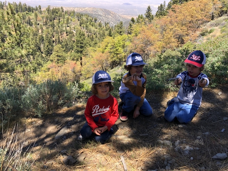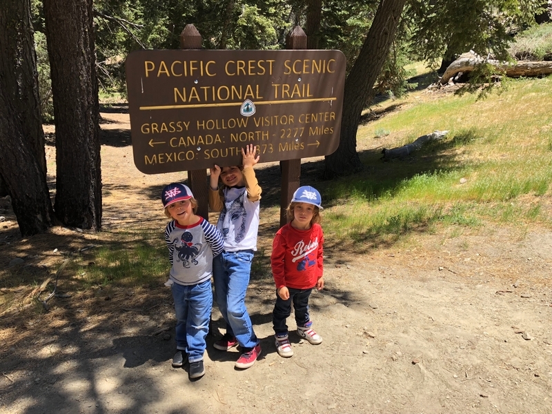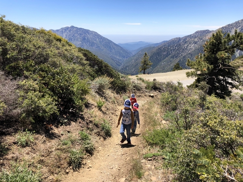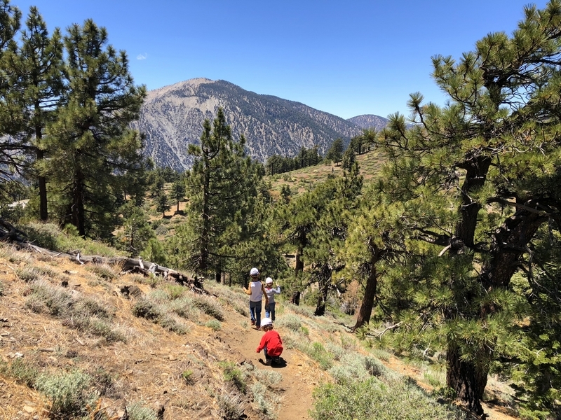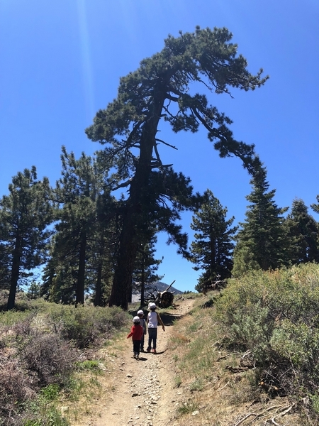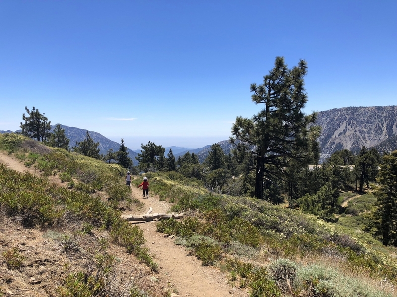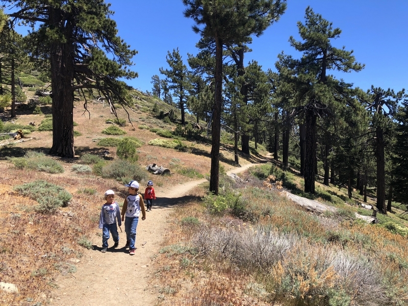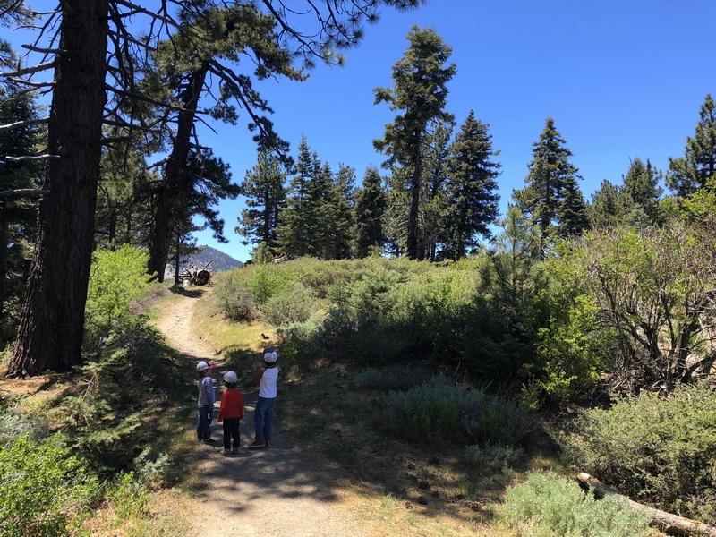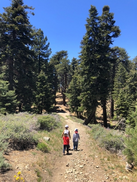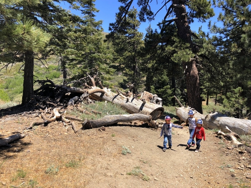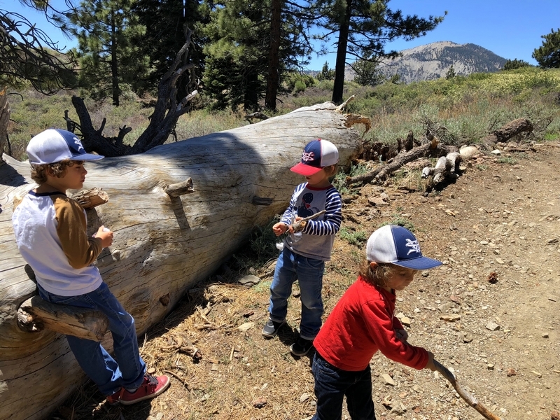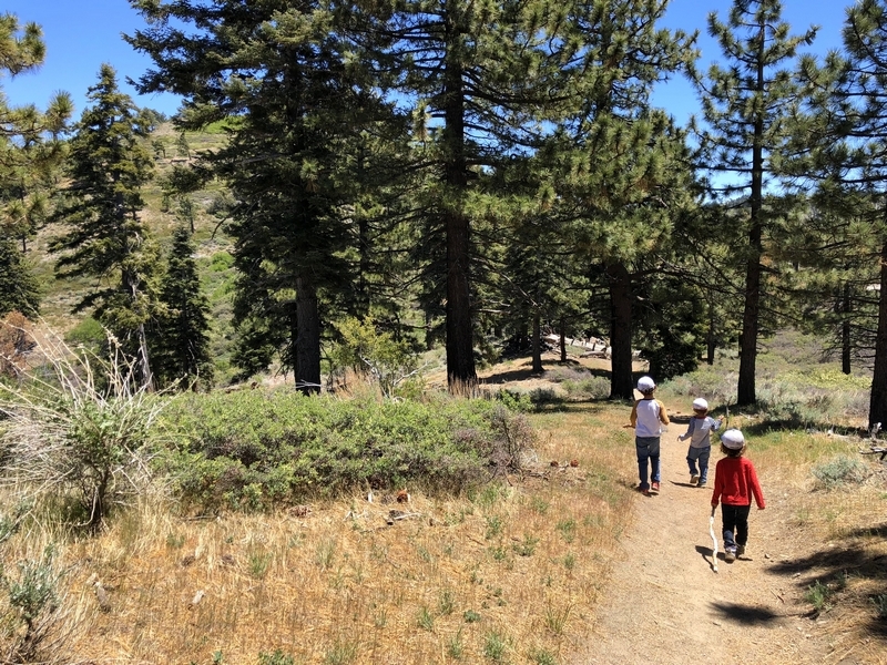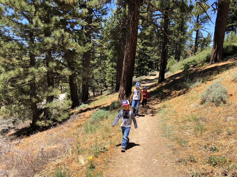 We were in Wrightwood once again for the garage-sale-crazy Memorial Day weekend, and by Monday afternoon the boys were surprisingly ready for a hike with Pop. One place Chris has been interested to visit is a blocked-off trail on the west slope of Lightning Ridge – from the satellite image, the trail appears to be an extension of the Lightning Ridge nature trail above Inspiration Point, looping around the north side of the ridge and reconnecting with the PCT west of the mountaintop. So, after a brief visit to the Grassy Hollow Visitor Center, Chris and the guys started hiking eastward up the PCT under beautiful clear skies and a cool breeze. Our pace was moderate this trip, and we covered the 0.6+ miles to Lightning Ridge in a little more than 30 minutes. At the top of the grade, we found the small log blocking our intended spur trail (someone has scrawled “Danger!” on its surface – there’s no danger whatsoever, the intent being to keep PCTers on the correct route), which we stepped over northward into now-unknown territory. The trail was initially in good shape, gently ascending for about 100 yards north and east into a shallow swale NW of the ridgetop – here, though, the path became overgrown with waist-high buckthorn. Although it looked clear maybe 50 yards ahead, Chris had little enthusiasm for portaging the kids one by one through the brush, so we turned around after a short break – enjoying the expansive desert views from this spot – and headed back to Grassy Hollow. Ollie, always inclined to issue forth profound statements, noted on our way back that, “I like hiking downhill better than I like hiking uphill” – don’t we all. We completed the 1.34-mile round trip in just over an hour, returning to the cabin a little sooner than Jane and Chelsea would have preferred, the two of them just having settled down for some whine, er, wine time when we pulled up. It will be worth a trip back to perhaps start at the Inspiration Point end of this little trail, bringing some clippers next time, and explore what’s clearly a little-used but very scenic route.