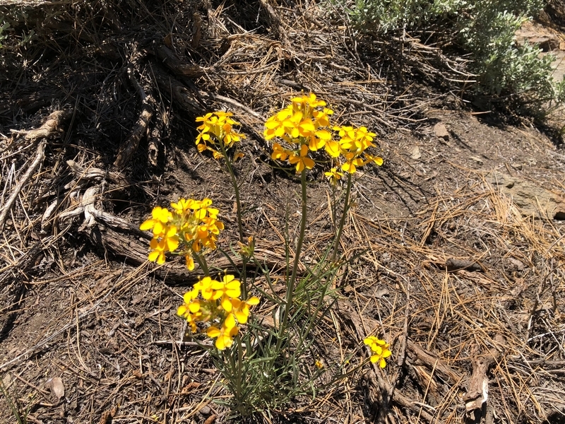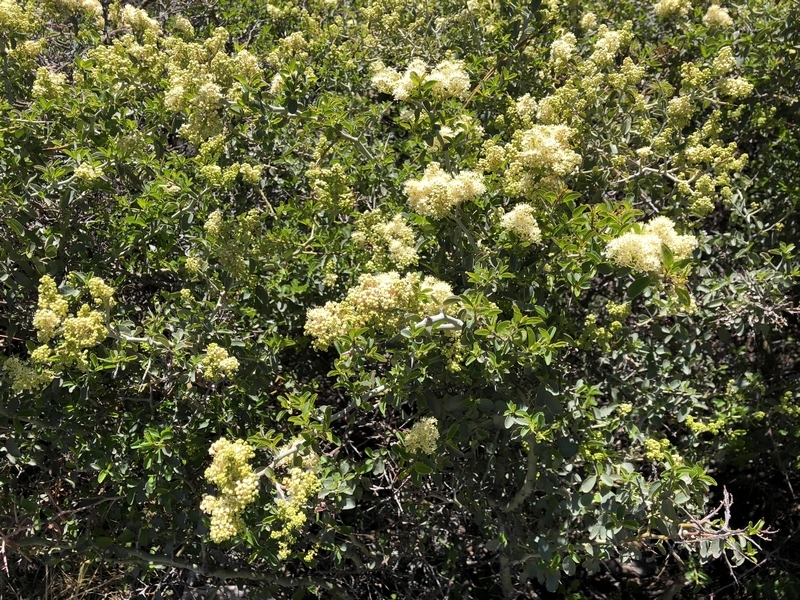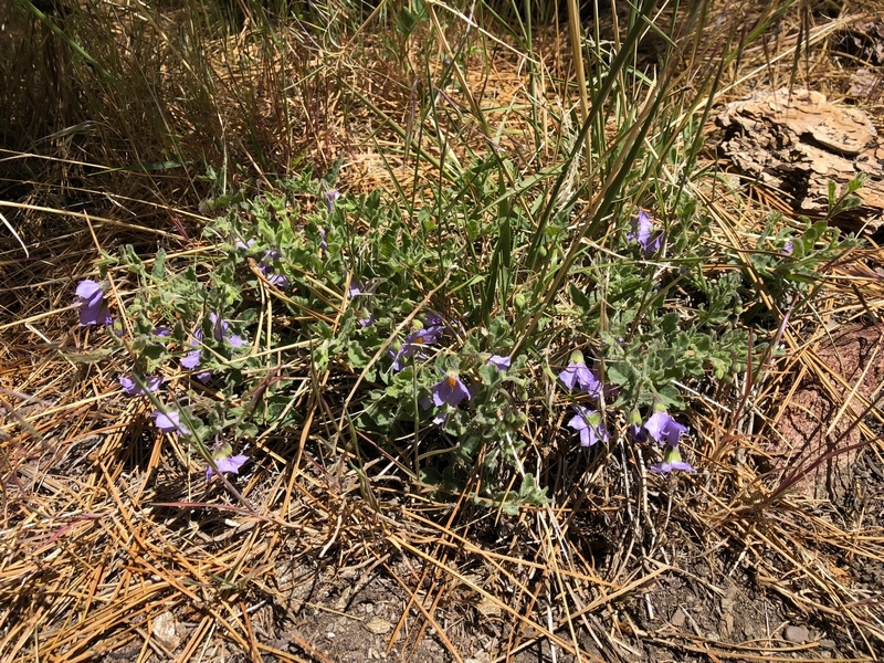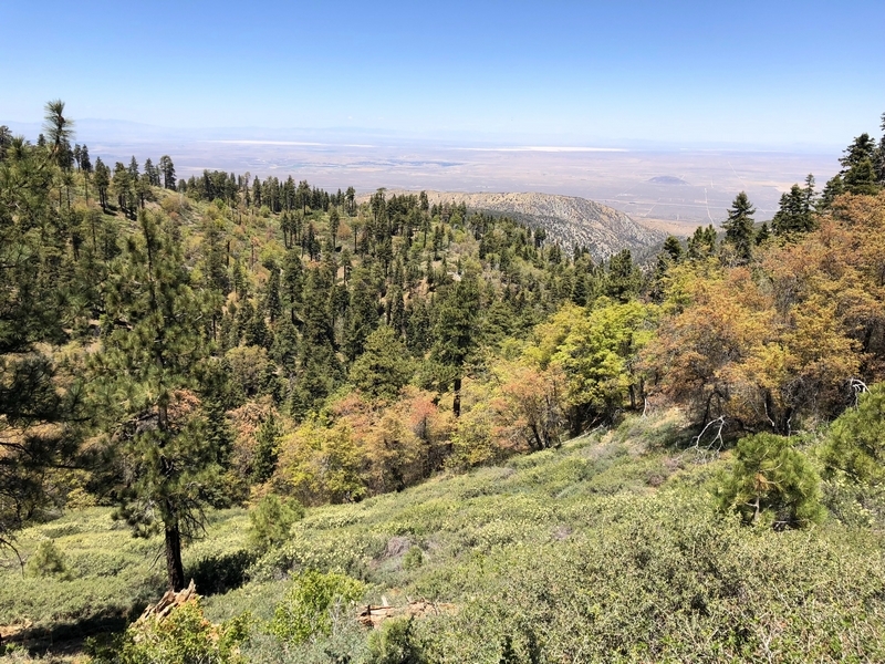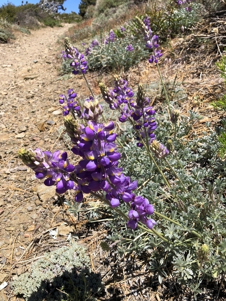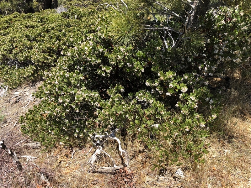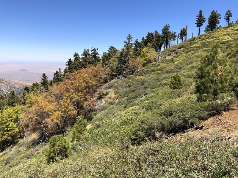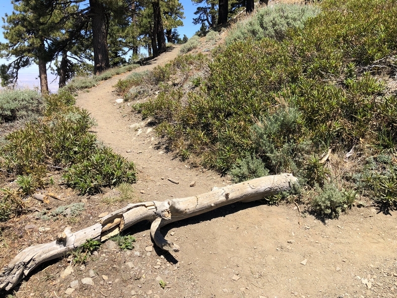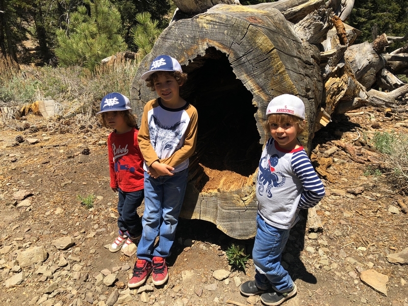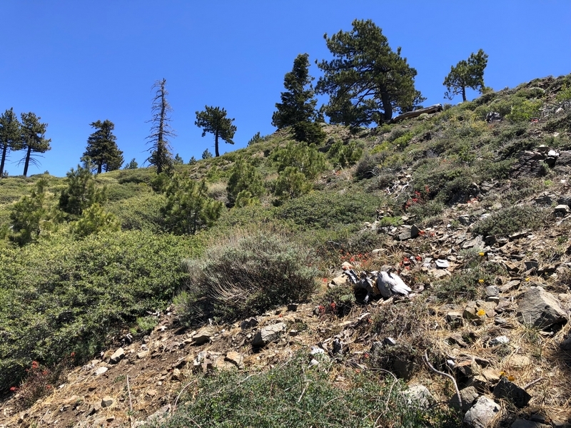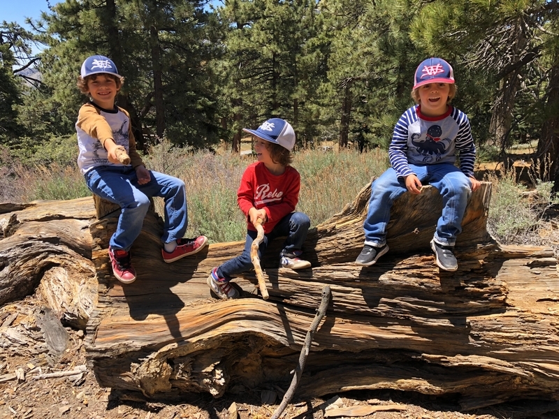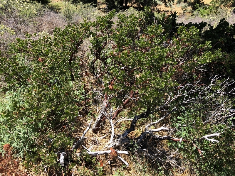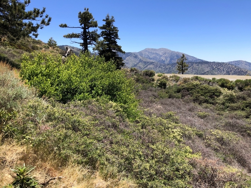 We were in Wrightwood once again for the garage-sale-crazy Memorial Day weekend, and by Monday afternoon the boys were surprisingly ready for a hike with Pop. One place Chris has been interested to visit is a blocked-off trail on the west slope of Lightning Ridge – from the satellite image, the trail appears to be an extension of the Lightning Ridge nature trail above Inspiration Point, looping around the north side of the ridge and reconnecting with the PCT west of the mountaintop. So, after a brief visit to the Grassy Hollow Visitor Center, Chris and the guys started hiking eastward up the PCT under beautiful clear skies and a cool breeze. Our pace was moderate this trip, and we covered the 0.6+ miles to Lightning Ridge in a little more than 30 minutes. At the top of the grade, we found the small log blocking our intended spur trail (someone has scrawled “Danger!” on its surface – there’s no danger whatsoever, the intent being to keep PCTers on the correct route), which we stepped over northward into now-unknown territory. The trail was initially in good shape, gently ascending for about 100 yards north and east into a shallow swale NW of the ridgetop – here, though, the path became overgrown with waist-high buckthorn. Although it looked clear maybe 50 yards ahead, Chris had little enthusiasm for portaging the kids one by one through the brush, so we turned around after a short break – enjoying the expansive desert views from this spot – and headed back to Grassy Hollow. Ollie, always inclined to issue forth profound statements, noted on our way back that, “I like hiking downhill better than I like hiking uphill” – don’t we all. We completed the 1.34-mile round trip in just over an hour, returning to the cabin a little sooner than Jane and Chelsea would have preferred, the two of them just having settled down for some whine, er, wine time when we pulled up. It will be worth a trip back to perhaps start at the Inspiration Point end of this little trail, bringing some clippers next time, and explore what’s clearly a little-used but very scenic route.
