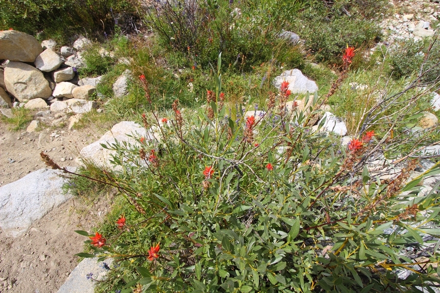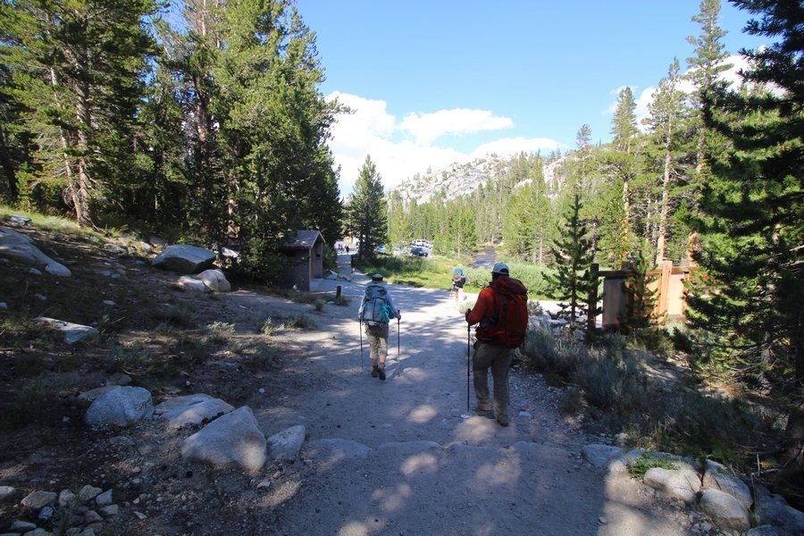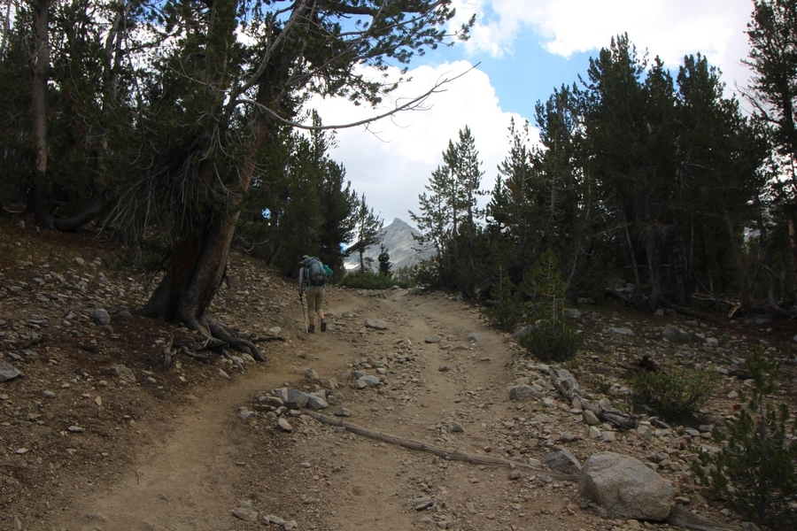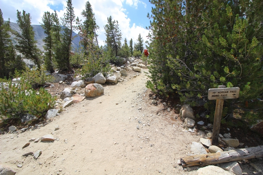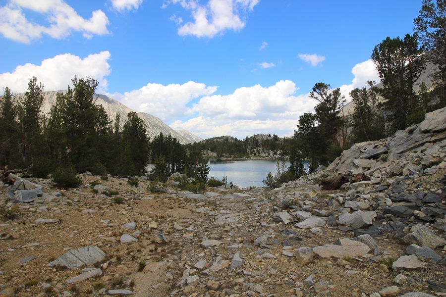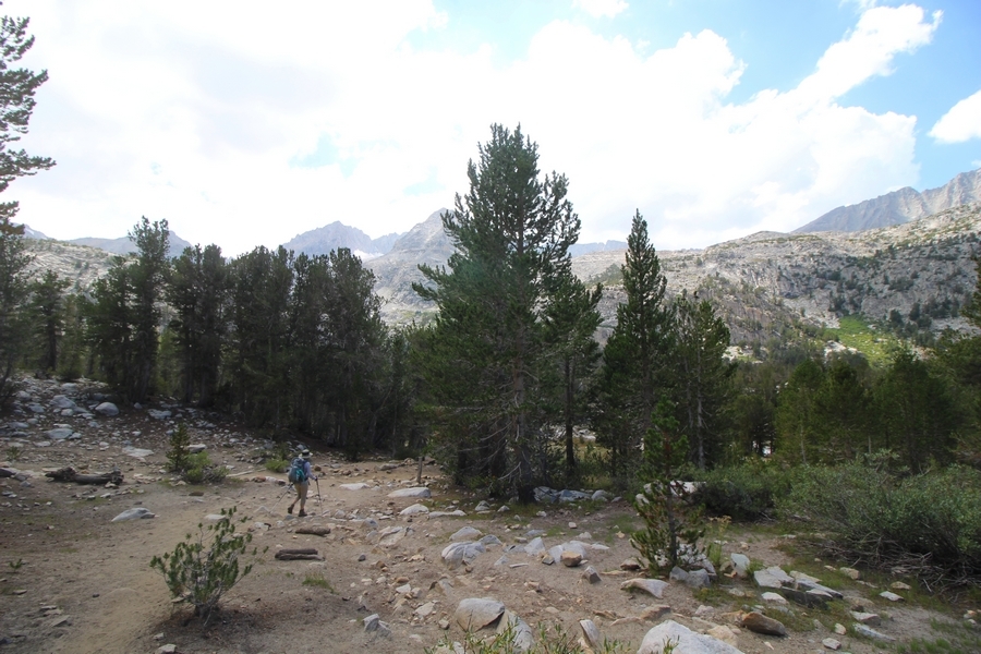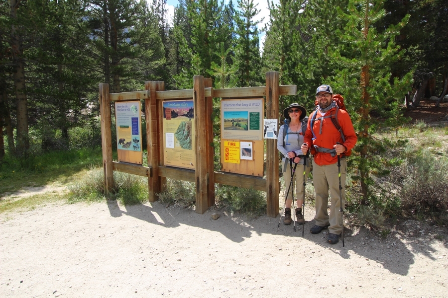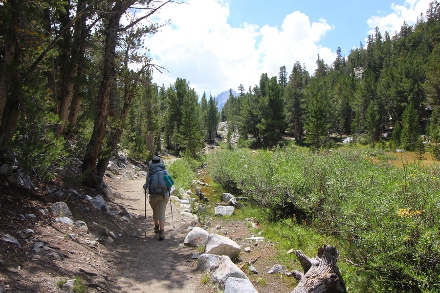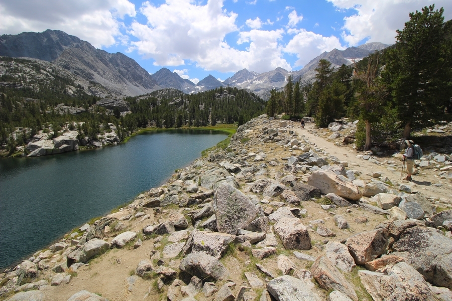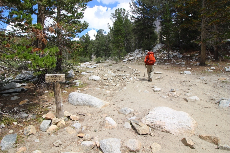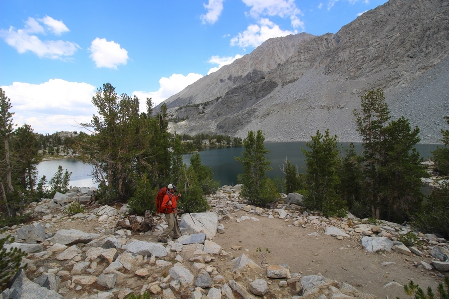 For three years in a row now, we’ve had a backcountry permit to visit Gem Lakes in Little Lakes Valley, and for three years straight we’ve had to cancel because of lingering snow (the lesson here is to not book a LLV permit for June dates). Needless to say, the place has been on our radar for a while, and, since we were heading north to spend the night in Bishop before starting our Yosemite trip, we decided to acclimate by lugging our full packs on a Little Lakes Valley tour. Leaving home by 6:30am, we stopped in Bishop to grab some sandwiches at Schat’s Bakery before continuing north another 50 minutes to the Mosquito Flat trailhead above Rock Creek Lake – waiting a few minutes for a parking place in the full upper lot, we headed out a little after 11:30. Moving easily southward up the level trail, after about a half-mile we started climbing up the first of several short inclines before Chris realized he hadn’t packed his or Jane’s lunch. Jane quickly dropped her pack and headed back to the car, neither Chris or Pedro arguing with her initiative – she was back after about 30 minutes, stating flatly that she was to be given credit for literally going the extra mile, which was duly noted. The appeal of Little Lakes Valley, apart from its stunning beauty, is the gentleness of the trail – the parking lot is above 10,200′, and the 3-1/2 miles to the head of the valley only gains about 800′ over that distance. On the other side of the first hill, we successively passed Mack, Marsh, and Heart Lakes before climbing again a short distance to a glacial moraine forming the western limit of Box Lake. Continuing south, we again climbed up another level to Long Lake, crossing Rock Creek for the first time and walking along the lake’s east side. All the way, we talked about backpacking the valley with a larger of group of family and friends on a return trip – we thus decided to not follow the trail all the way to Gem Lakes, our someday-later camping location, and instead turn around at Chickenfoot Lake, located a few hundred yards east of the main trail at 10,800′. Climbing up the steepest grade of the day so far, we turned left at the signed junction and followed the lateral trail up through open forest and pretty meadows, eventually circling northward to the lake itself – the western shore was alternately rocky and marshy, but we picked our way along it for 100 yards or so to a suitable lunch spot on the water. Clouds had begun to thicken, and we ate our sandwiches under largely overcast skies, but the sun started to break through about the time we were ready to head back. We headed west cross country over a low hilltop and through two shallow gullies back to the trail, discovering some wonderful campsites atop the hill in the process, and retraced our steps northward. The closer we got to the trailhead, the more people we encountered, eventually finding ourselves in a knot of about 15 hikers descending the final slope back to the parking area – not necessarily a great location for those seeking solitude, especially at the start of a summer weekend. Still, this was a beautiful place for an easy 6+-mile hike, and the thin air wound up being a great warm-up for our four days in Yosemite that followed. We’ll no doubt be back.
