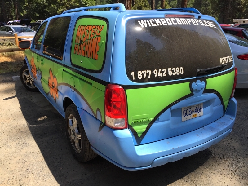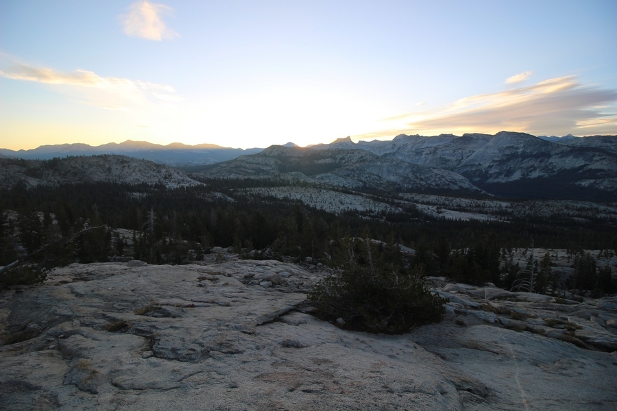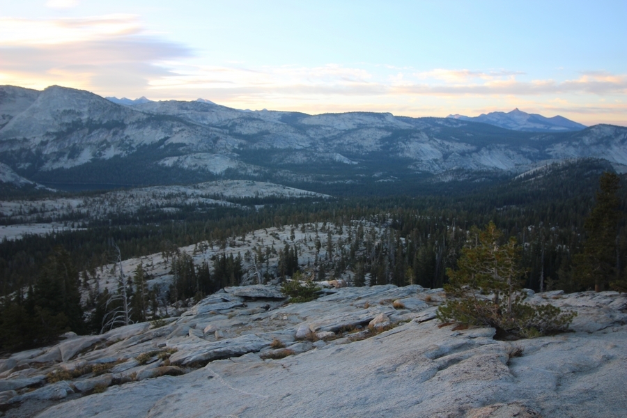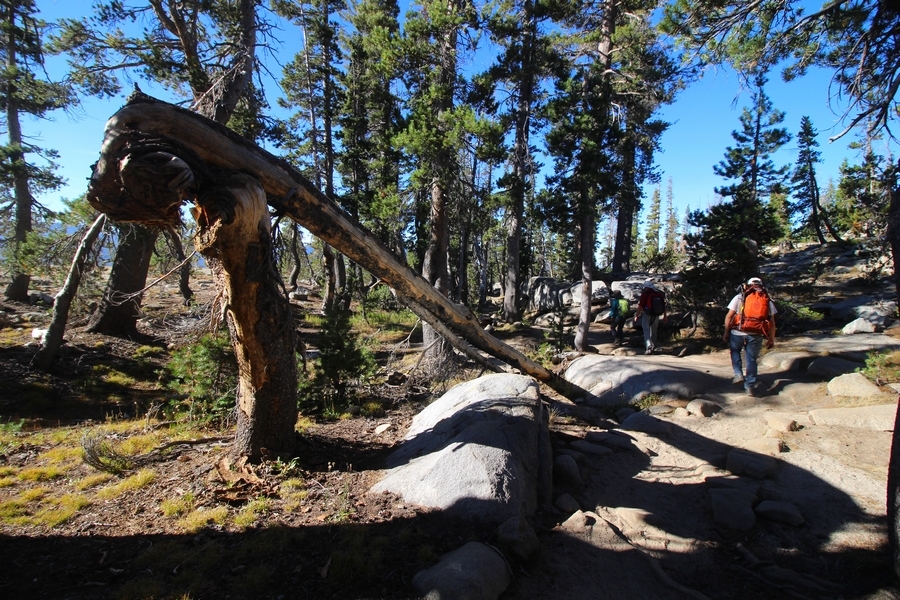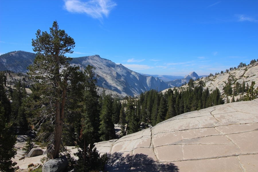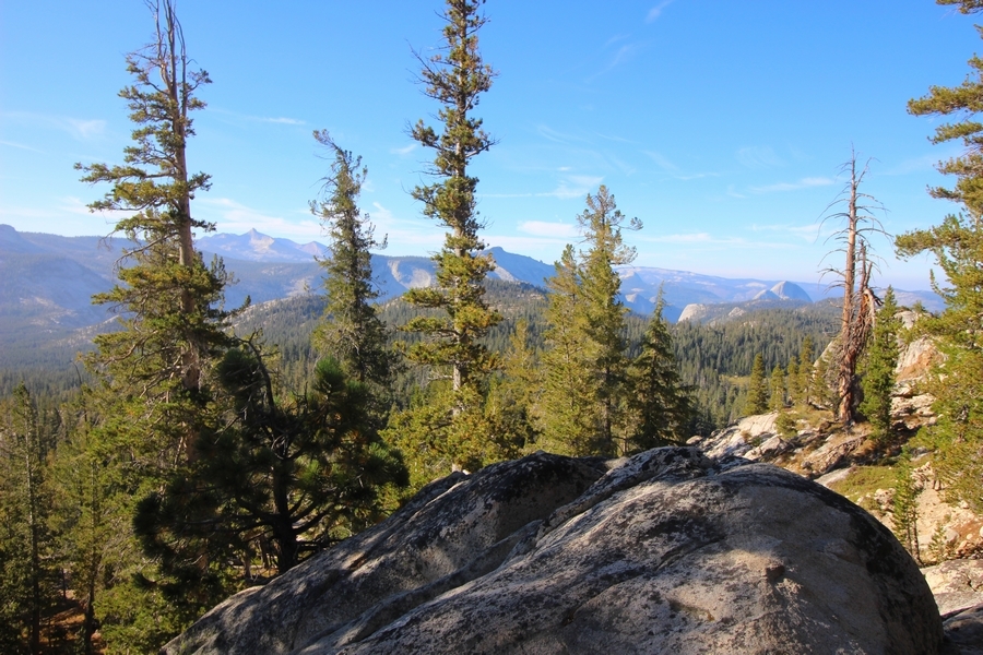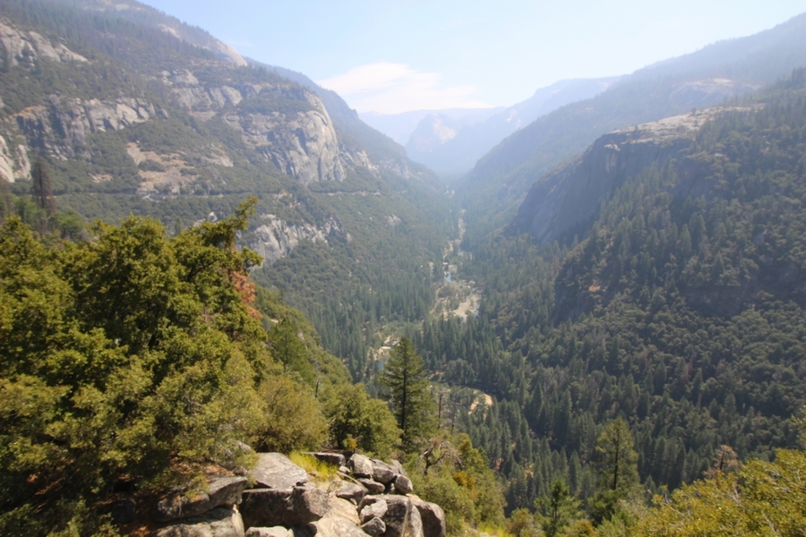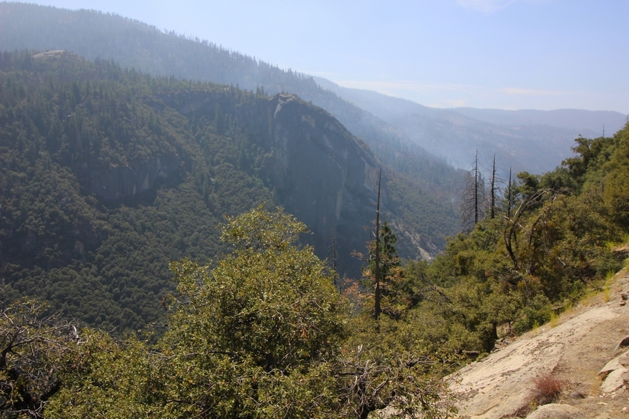 Today became an exercise in logistics. From the start, our plan was to hike out from May Lake some 3 miles down to the Tioga Road where we could catch the daily shuttle bus at Tenaya Lake to get back to the car at Tuolumne Meadows. The shuttle, which originates in Yosemite Valley, passes Tenaya Lake at 10:10am, and, since breakfast doesn’t usually end until about 8:30, we thought it would be a tight squeeze to make it to the bus stop at the appointed time. At any rate, Yosemite Valley ended up being closed by the Ferguson wildfire for a couple of weeks before our trip started, and the daily shuttle service was discontinued as a result. Well, the Valley reopened on August 10th with “limited services” – when Chris called the day before we left, the park told him the shuttle would resume service on Saturday, and we wouldn’t need it until the following Tuesday, so all good, right? We were then surprised upon arriving at May Lake that no shuttles at all were operating in the high country, leaving us with three options for getting back to the car: 1) walk 13 miles from May Lake to Tuolumne Meadows (least preferred), 2) hitchhike along the Tioga Road (none of us had ever hitchhiked before – hmmm), or 3) find someone going from May Lake up to Tuolumne Meadows and get a ride. As it turned out, Fred and Julia had a car 1.2 miles below May Lake at the nearest parking area, and they needed it moved to Tuolumne Meadows since they were continuing on to hike the full loop and had planned on taking the shuttle in the reverse direction as us back to their car at May Lake. So, it all worked out – the five of us left the camp about 9am and sauntered down the easy trail to Fred and Julia’s car (a Mazda 3), stuffed ourselves into the back seat (Chris’ and Pedro’s packs fit into the back, Jane held hers on her lap), and we drove together about 20 minutes up to our car at the Wilderness Center – we then transferred all the gear to our Pathfinder and took Fred and Julia back west to the Cathedral Pass trailhead on the Tioga Road so they could continue their hike south to Sunrise. Ah, the universe was aligned once again. We had talked about driving home through Yosemite Valley instead of back down the east side of the Sierras – we wanted to hit the big gift shop at Yosemite Village for some souvenirs for the grandkids, and we also wanted to see what devastation the Ferguson Fire had wrought outside the Valley’s west end. So, we continued down the Tioga Road and around to a hazy Yosemite Valley, stopping to snap a photo of smoke still rising from smoldering hot spots in the Merced River gorge. Surprisingly, the Valley was quite crowded, despite low water flows in all the falls (Yosemite Falls was completely dry). Also surprising was how Google Maps routed us home – Hwy 41 was still closed, so we drove a circuitous route west down Hwy 140, then east on Hwy 49 to Oakhurst and south down the 41 to Fresno. Still about 7 hours in the car today, not arriving in Bako until nearly 6pm. With all the uncertainty involved with the fire, this was still a great adventure – we’re now planning a trip for next year in the reverse direction with Vogelsang, Merced Lake, and Sunrise on the itinerary, so stay tuned…
