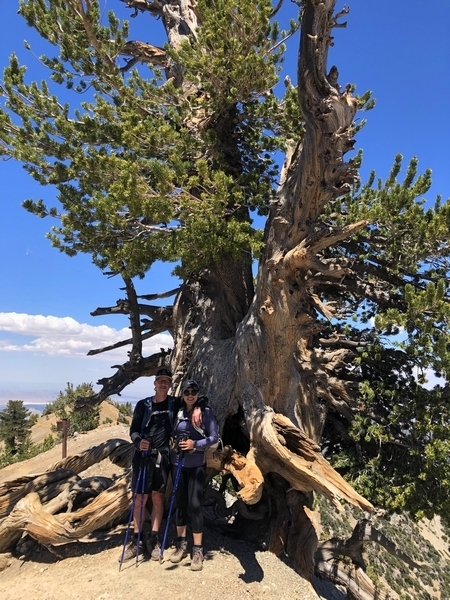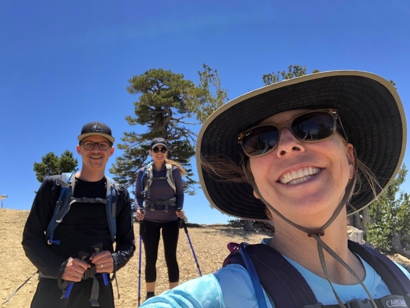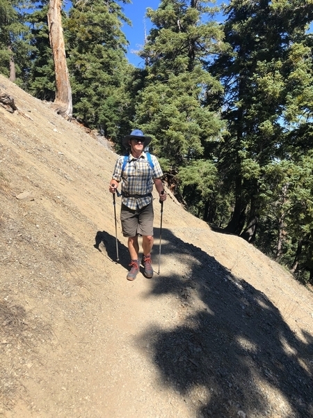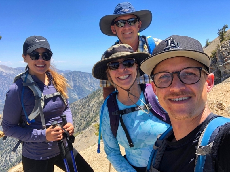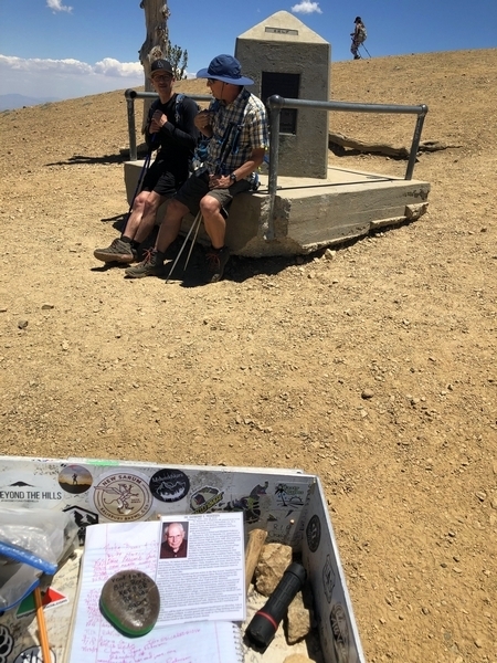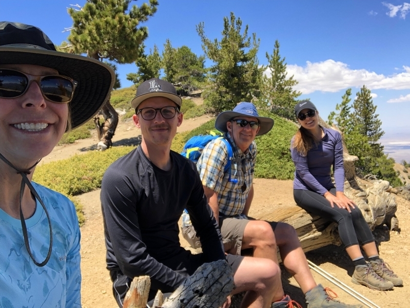 Chris’ dad, Ray, passed away on June 28th at age 88, and, as Ray had been very active in the Boy Scouts for many years when he was younger, we thought it only fitting to hike Mt. Baden-Powell in his memory. Carter and Dani drove up from Pasadena to join us in Wrightwood, and we got to the Vincent Gap trailhead shortly before 9:30am – we right away discovered that Chris’ camera battery was dead, meaning that all of today’s photos would be collected from our respective phones. Chris had suspected he’d be very slow today, and he wasn’t disappointed – this was our first hike at elevation since Yosemite last summer, and Chris was breathing hard after the first couple of hundred yards. To refresh the reader’s memory, the PCT climbs up the northeast shoulder of the peak via 42 switchbacks, gaining about 2,800 vertical feet over four miles from Vincent Gap to the summit at 9,383′. Apart from a handful of short flattish spots, the gradient is consistent, and Chris’ lack of cardio conditioning was obvious as we only covered a mile in the first 45 minutes. Jane had been patiently hanging back waiting for him, but the young newlyweds Carter and Dani were clearly being held back by the slow pace. They decided to forge ahead on their own, and Jane and Chris spent the next 2+ miles working a slow routine of walk 100 yds, rest, walk another 100, rest, etc. The weather was clear and warm in the high 70s, but we did get a cool breeze now and again to keep the temperature pleasant. However, Chris’ legs began to jello out at 8,500′, and Jane could wait no longer – she went ahead on her own, reaching the summit a half hour behind the youngsters and 30 minutes ahead of her slowpoke husband. Once reunited at the top, we signed in at the summit register box, leaving in addition to our usual information a short memorial note and a laminated copy of Ray’s obituary. Another hiker snapped a few pictures of us before we retired to a shady place on the mountain’s south shoulder where we ate our sandwiches, enjoyed the wonderful views, and treated an enormous blister that had raised and burst on the back of Dani’s heel. We bid adieu to the summit about 2pm and began heading down, Jane, Carter, and Dani in a fast-moving group with Chris choosing a more leisurely pace – the descent was uneventful other than Chris having hot spots under all his toes by the time he arrived at the trailhead (two large blisters were his reward for the careful downhill hike, although new boots and 4 non-stop miles were probably the culprit here). The months off had an obvious effect as we were all quite sore by early evening (although well-earned cold drinks at the Wrightwood Brewing Company took away some of the sting once we got back to town), but we were all happy to honor Ray like this – Chris’ postscript in the summit register reads, “Life of Service, Peace at Last”, a phrase which will not only be engraved on Ray’s military headstone but also speaks volumes about the gifts, time, and talents he shared with the community throughout his long life.