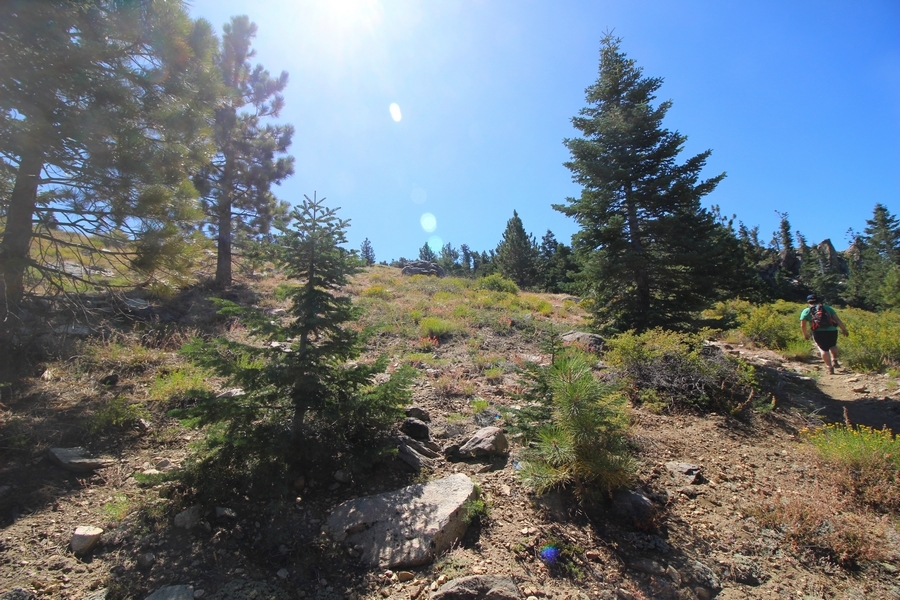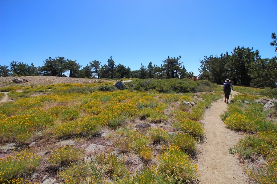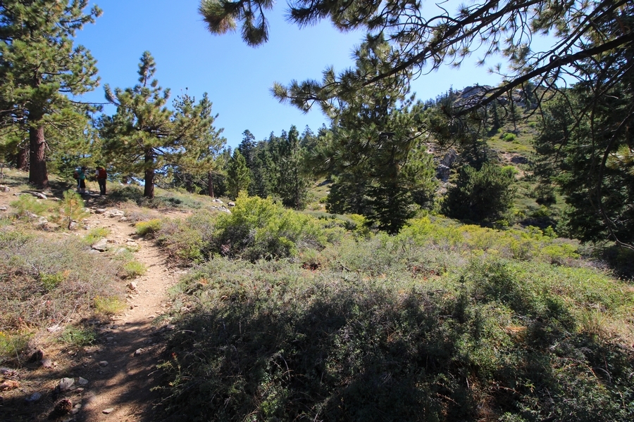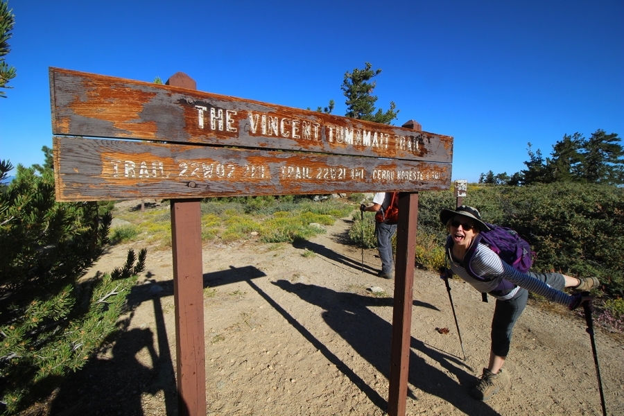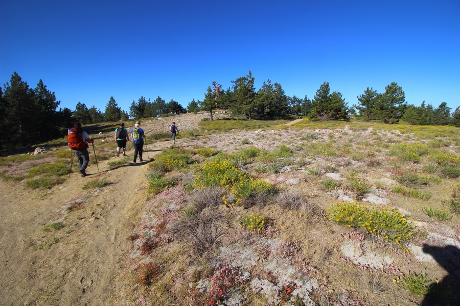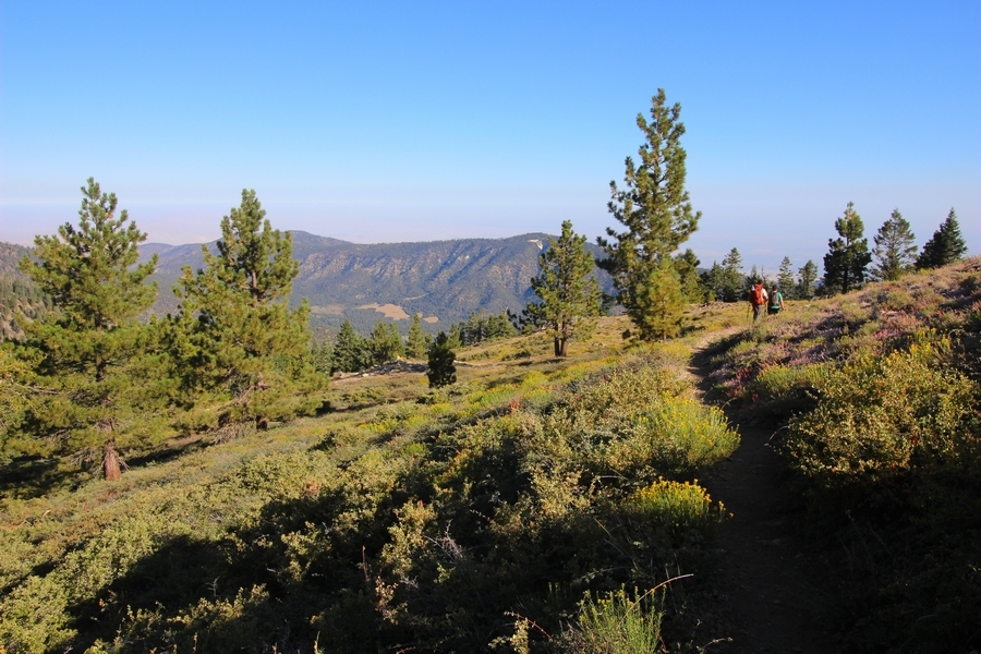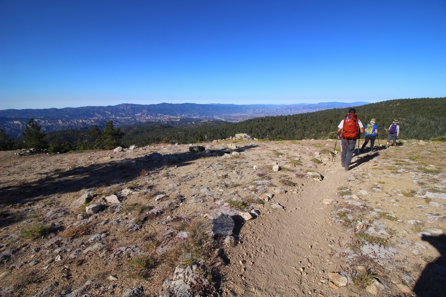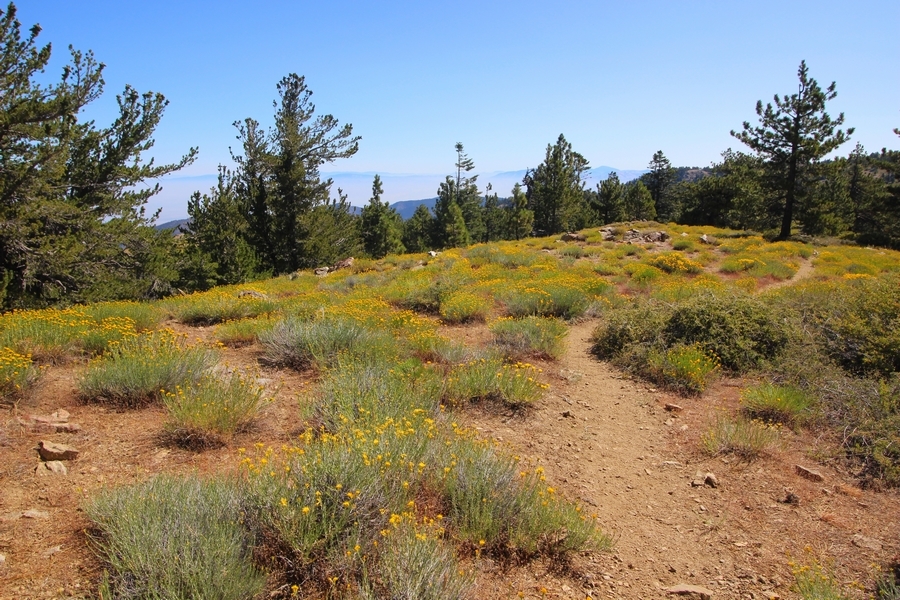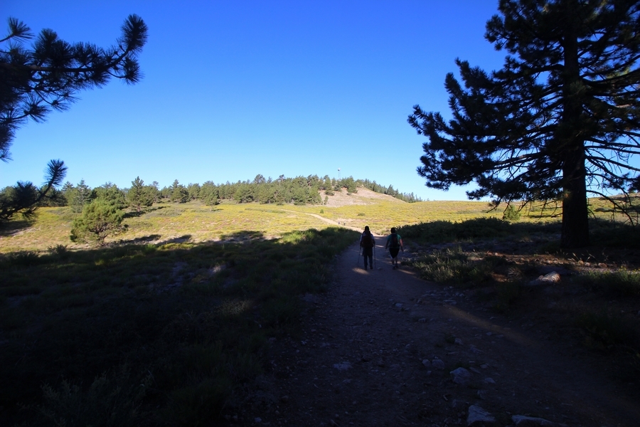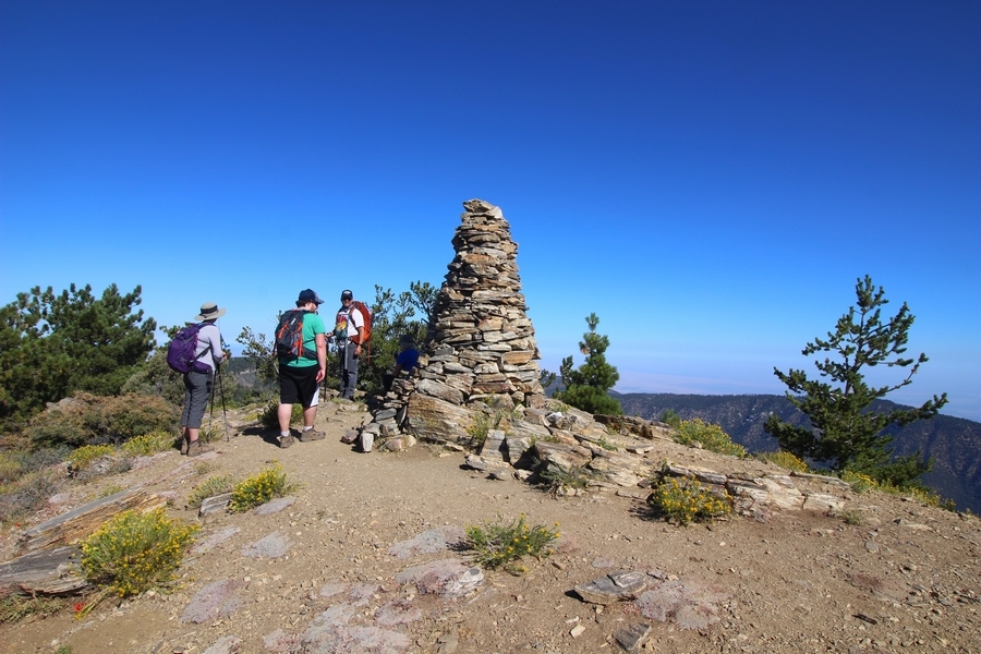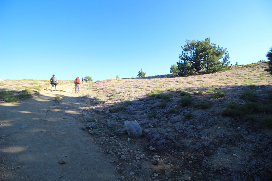 As a final tune-up before our backpack trip in the High Sierra near Mammoth next weekend, Pedro organized a hike to Mt. Pinos and Sawmill Mountain with some friends from work, Shane and Michelle, and we tagged along since we’re all about the fun – the reader may remember that Mt. Pinos is the high point of Ventura County, just as Sawmill Mountain is the high point of Kern County. We left early from Pedro’s house, reaching the trailhead at the end of the Mt. Pinos road by 7:30am. We’ve done this hike three times before, twice westbound like today and once eastbound from the other end of the trail at Cerro Noroeste, but all those visits took place in 2013, so it’s been a while since we’d made the trip. From the trailhead at 8,300′, we walked up the wide Mt. Pinos access road, moderately gaining elevation over the first mile until reaching the broad summit plateau where the gradient eases through open sagebrush meadows as it passes over the rolling terrain. We took the side road up a few hundred yards to the proper summit, where we found an unmounted sign noting the elevation as 8,848′, a few feet higher than we recall from our previous visits – some trail runners passing through took our group photo. The views here were very pretty in the morning sun – it was clear enough that we could spy Mts. Baden-Powell and Baldy some 100 miles away to the southeast. However, the normally clear views northward were blocked by valley haze, and we could see virtually nothing of the Sierras. After a bit, we headed west off the summit and over to the Vincent Tumamait trailhead – from here, the trail descends gently down the west slopes of Mt. Pinos for half a mile until dropping steeply into the level saddle 400′ deep between Pinos and Sawmill. We made our way into and across the saddle before ascending up the other side, regaining the same 400′ to the similarly broad and level Sawmill Mtn. summit, elev. 8,806′. As expected, we found the Chumash spirit tower where we last left it, but gone were the Himalayan-style prayer flags and the summit register can – we looked around for the latter but could not locate it anywhere, and we spent about 30 minutes here eating an early lunch before turning back. We had seen a handful of folks on our way west, but now we met more than 30 people on our way east – day hikers, backpackers, runners, mountain bikers, definitely a popular Sunday spot in the late summer. The GPS logged 7.36 round-trip miles with over 2,600′ of combined elevation change, all over 8,000′, so it’s a good workout when conditioning for higher mountain activities.