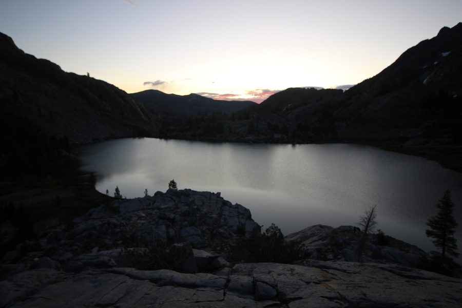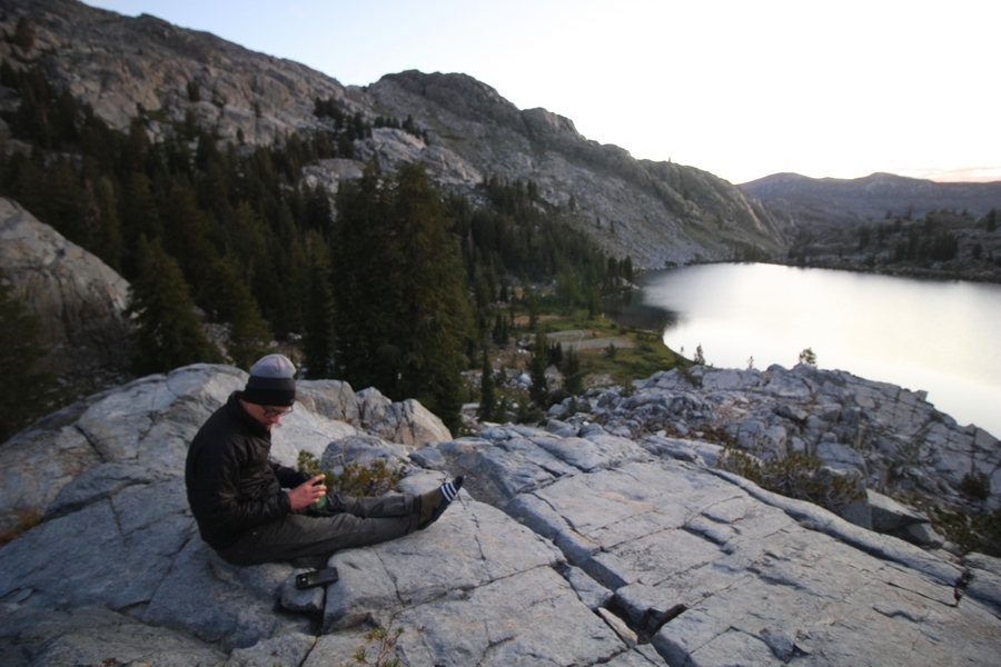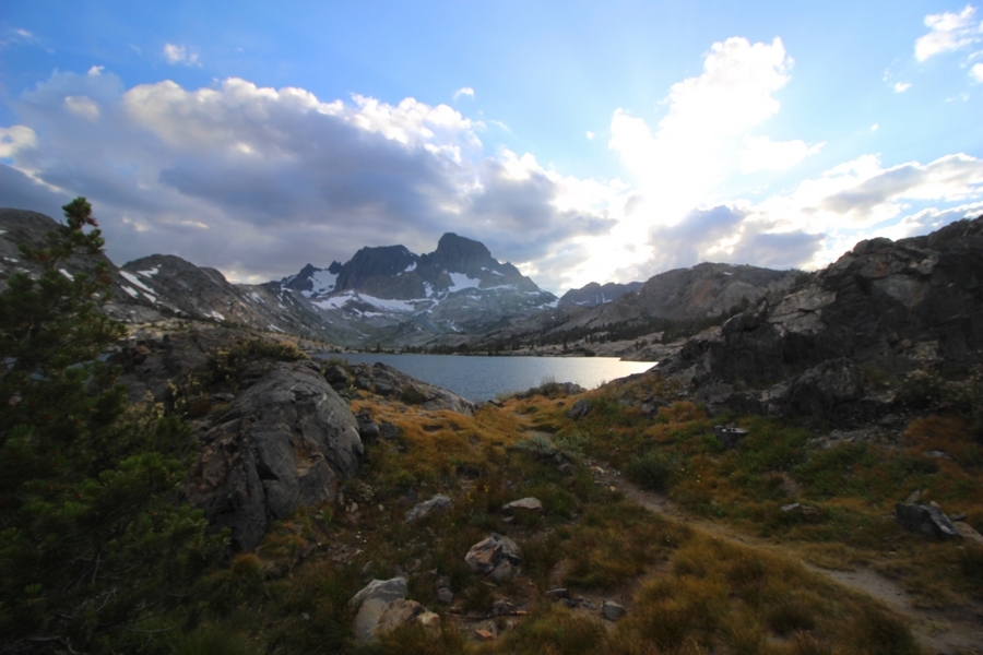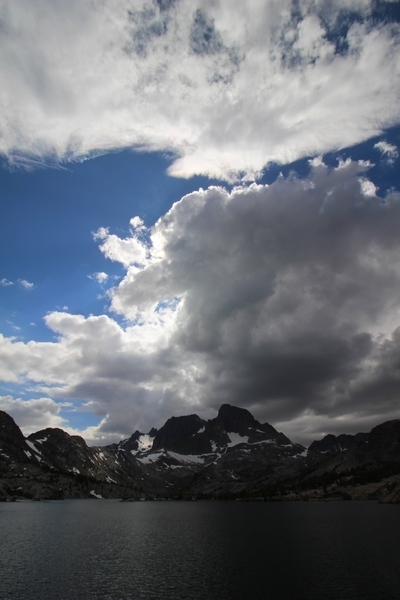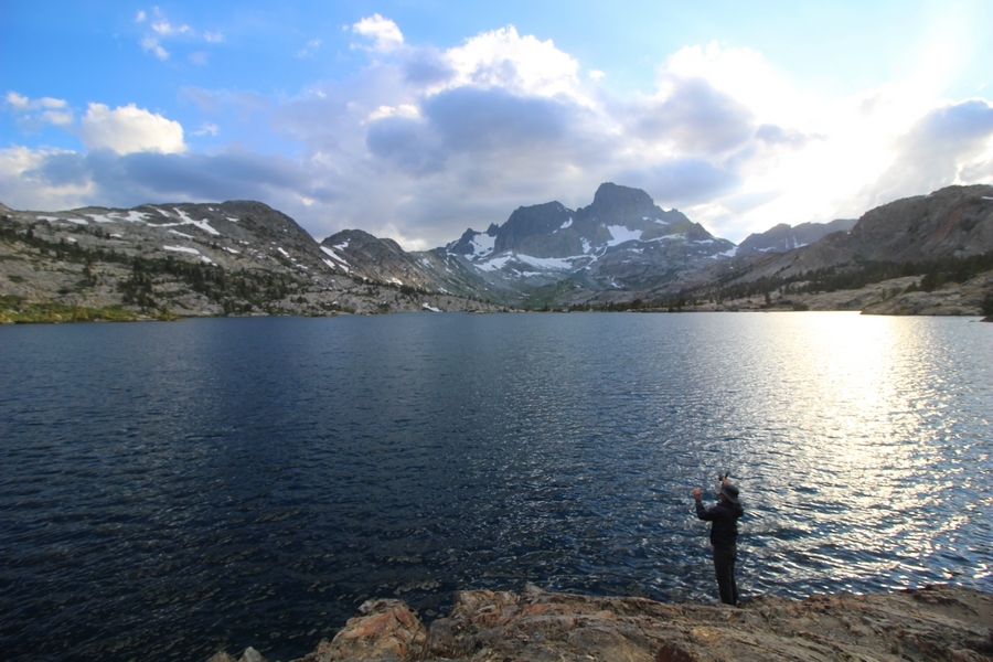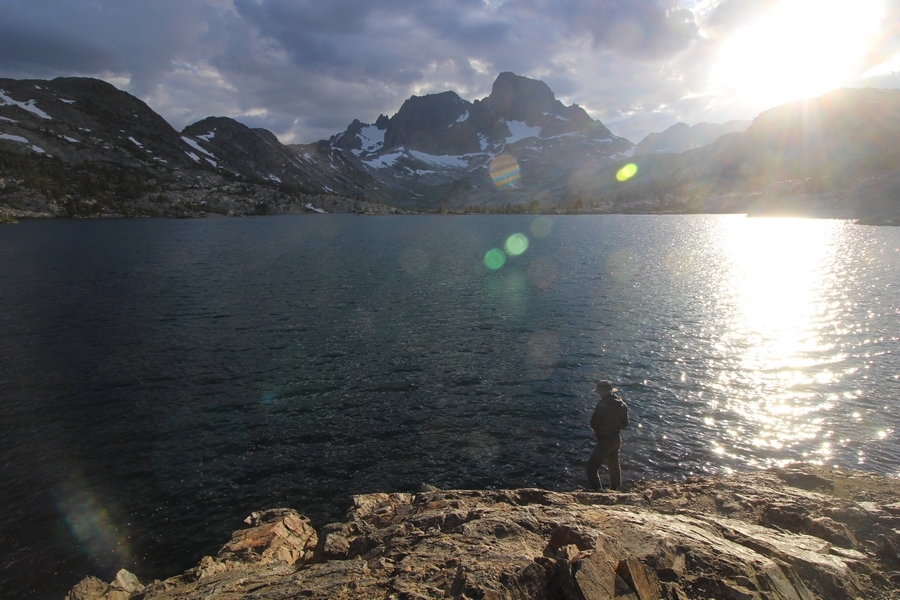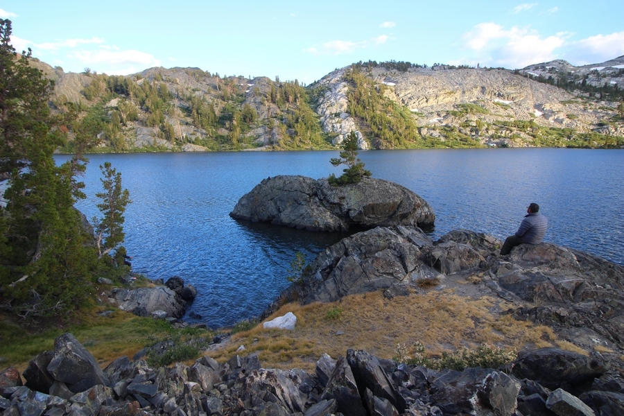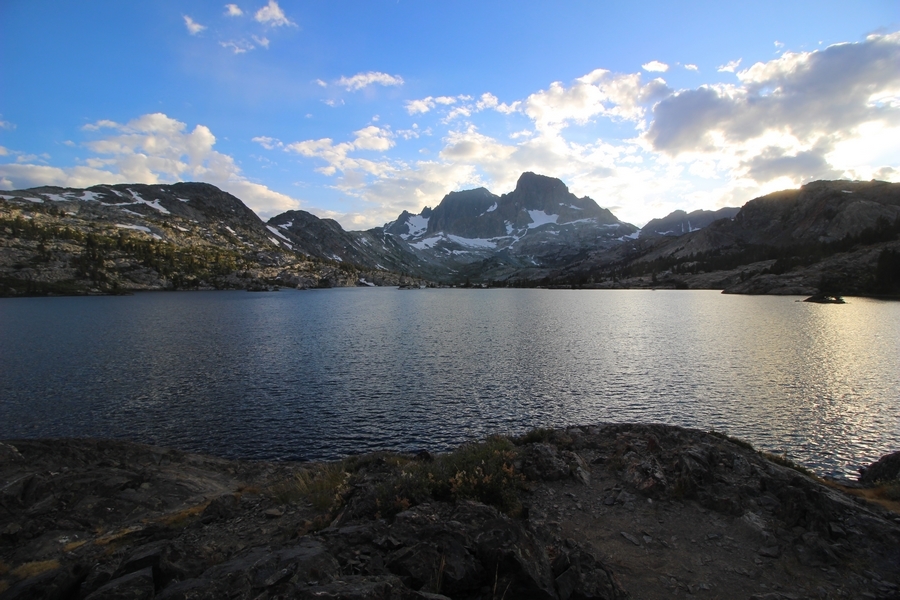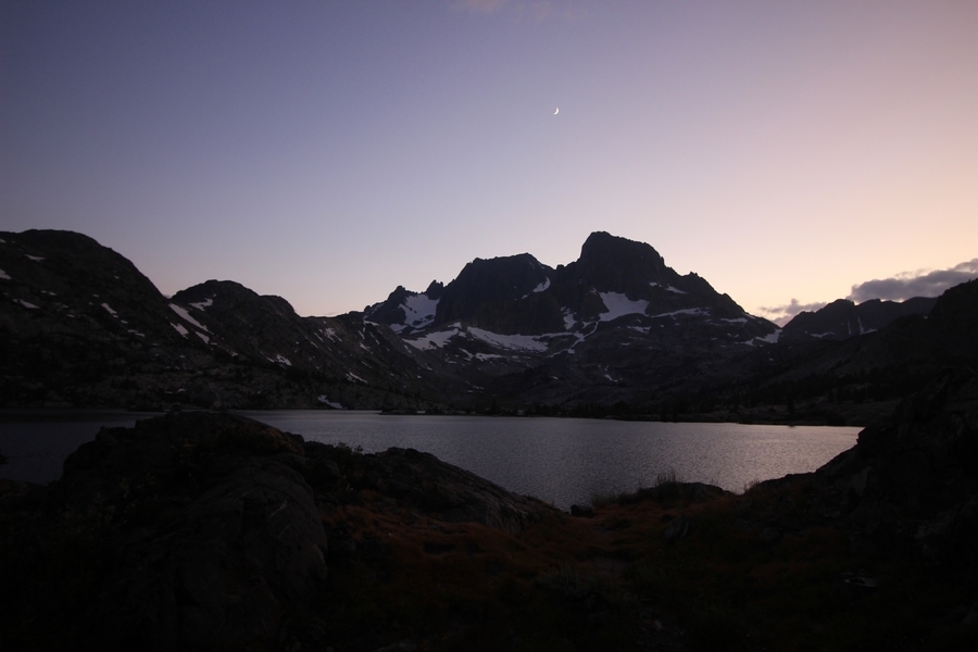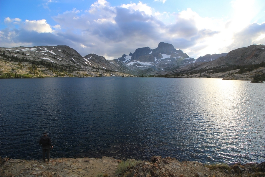 Today was expected to be our toughest of the four days in the Ritter Range, about 8 miles east and then north up to Thousand Island Lake – this more than any other of our destinations was important to Chris, recalling years before hearing his dad’s stories of backpacking here in the early 60’s with his old Kelty pack, then a high-tech wonder with its external aluminum frame. Our route would take us about 2-1/2 miles back down along Shadow Creek to the JMT where we’d turn left and follow the trail about 3 miles up and over a 1,200′-high ridge and down 300′ to Garnet Lake, followed by another 2-1/2 miles and 400′ up and over a second ridge and down to Thousand Island Lake. Pedro’s knee had started hurting during our cross-country jaunt the day before, and he expected to be slow – Chris woke up feeling a little queasy and took some time packing up, so Pedro decided to hit the trail first and let us catch up to him. Chris and Carter were thus about an hour behind him when they started out at 8:45am. Once on the trail, Chris was feeling much better, and we made good time exiting Ediza Lake and starting eastward down the valley – really easy hiking here through pretty meadows with the morning sun filtering through the trees. By 10am we were at the JMT junction, half expecting Pedro to be waiting here for us for a possible bail-out back to Agnew Meadows given the condition of his knee (to be honest, all three of us would have been fine with that, as two nights at Ediza and the previous day’s stunning hike had already been so fulfilling in the way of experience). But, Pedro was nowhere to be seen, so we turned northward and started up – right away, Carter sped ahead out of sight, and Chris wouldn’t see him again for about two hours. The climb was not as bad as advertised – it looked like an 800′-per-mile gradient on the map but in reality seemed much more gentle than that. It was, however, relentless in its pursuit up the ridge, and Chris took more than a few breaks, especially as the day had gotten quite warm. The route trends northeastward as it winds its way up the slope, eventually reaching the end of a rocky spur off the main ridgeline and turning northward up to a pass at 10,100′. Just after rounding the end of this spur, Chris started off again after a break to find Carter sitting in his chair beside the trail just a few yards ahead – neither of us had seen the other in the woods. Carter had caught up with Pedro 30-45 minutes before, the latter choosing to continue his walk up to the pass while the former waited for his slowpoke dad. Now reunited, Chris and Carter walked together up through timberline and into a very pretty little gully/canyon/hanging valley carpeted along its bottom by a grassy meadow – quite a lovely scene. At the end of the small canyon rose a rocky headwall, and we followed some short switchbacks up to the top of the pass while enjoying views southward to Volcanic Ridge and points much further beyond. Over the north side of the pass, the JMT makes what is considered to be one of the classic Sierra descents, a moderate grade into the Garnet Lake basin with views west to Mt. Ritter and Banner Peak – the trail did not at all disappoint. We caught up to Pedro about halfway down the descent, and we hiked in a 1/4-mile long caravan the rest of the way down to Garnet Lake’s outlet and the log bridge across it. We had talked over breakfast about possibly camping here for the night instead of going up to Thousand Island Lake, and, once here, we quickly decided to do just that – Carter’s knee had started bothering him with an ailment exactly like Pedro’s and further mileage sounded quite unappealing, plus the high clouds that had been forming in the west since the morning had begun to darken and consolidate over Banner Peak. We passed a few nice campsites along the north shore that were already occupied, opting to explore down a use trail leading west from where the JMT started its climb up and away from Garnet Lake. Carter scouted ahead (something that had become a trend) and found a nice site on the water that was big enough for our two tents. We got camp set up and watched Carter fish as the clouds thickened overhead – about 3:30pm, the skies opened up, the rain lasting off and on for a couple of hours. In typical Sierra fashion, everything dried up right away and the rest of the day was really pleasant, a cool breeze off the lake and beautiful views west to the peaks, clouds, and setting sun. It was Pedro’s turn to split mac ‘n’ cheese with Carter, while Chris opted for a cold dinner of beef jerky, pita bread, and peanut butter. We hit the hay not long after the moon rose above Banner Peak, the range silhouetted against the last glow of daylight – a magical view.