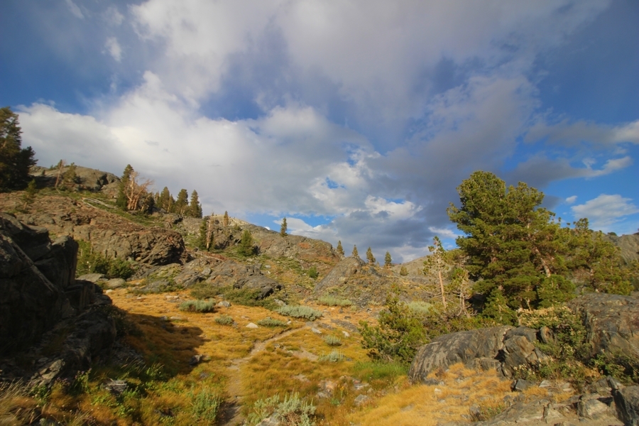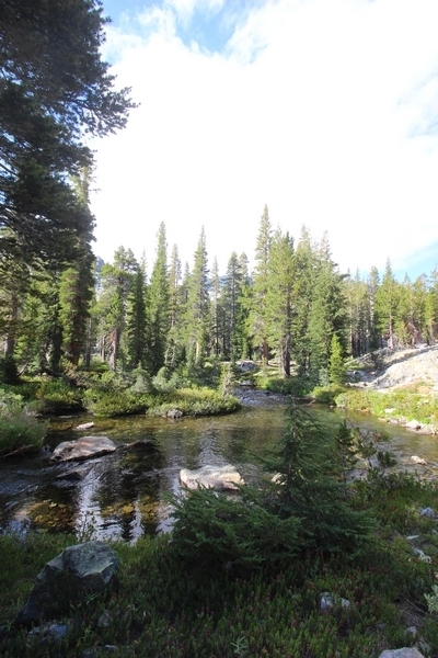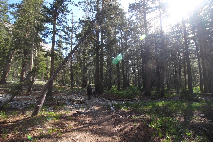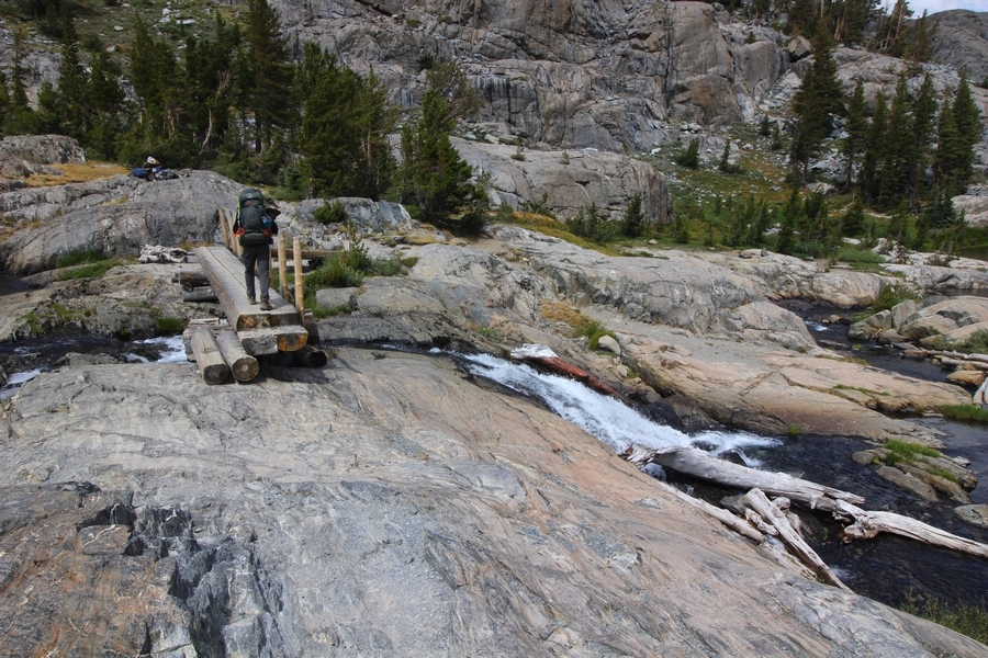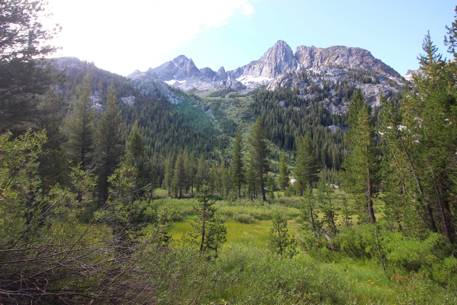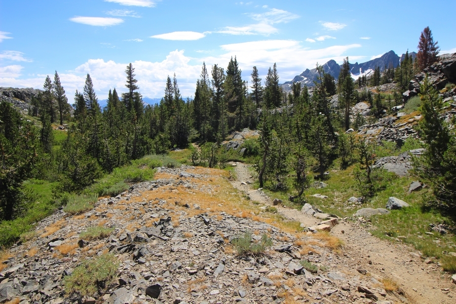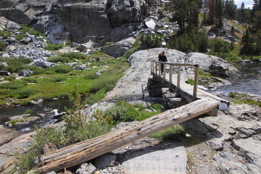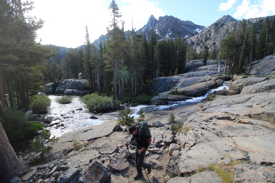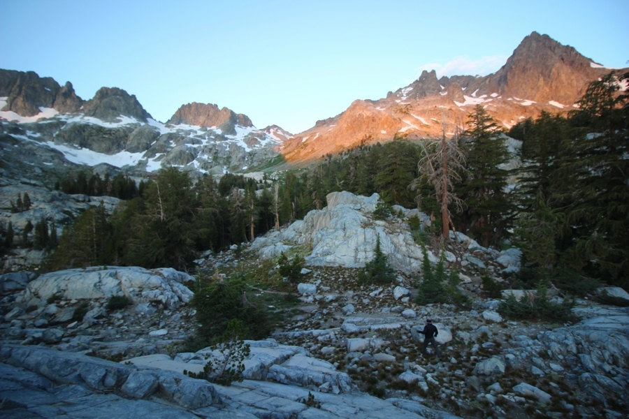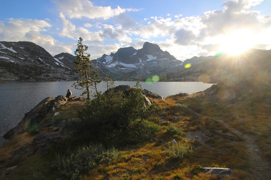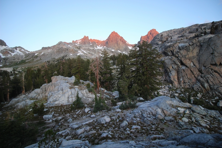 Today was expected to be our toughest of the four days in the Ritter Range, about 8 miles east and then north up to Thousand Island Lake – this more than any other of our destinations was important to Chris, recalling years before hearing his dad’s stories of backpacking here in the early 60’s with his old Kelty pack, then a high-tech wonder with its external aluminum frame. Our route would take us about 2-1/2 miles back down along Shadow Creek to the JMT where we’d turn left and follow the trail about 3 miles up and over a 1,200′-high ridge and down 300′ to Garnet Lake, followed by another 2-1/2 miles and 400′ up and over a second ridge and down to Thousand Island Lake. Pedro’s knee had started hurting during our cross-country jaunt the day before, and he expected to be slow – Chris woke up feeling a little queasy and took some time packing up, so Pedro decided to hit the trail first and let us catch up to him. Chris and Carter were thus about an hour behind him when they started out at 8:45am. Once on the trail, Chris was feeling much better, and we made good time exiting Ediza Lake and starting eastward down the valley – really easy hiking here through pretty meadows with the morning sun filtering through the trees. By 10am we were at the JMT junction, half expecting Pedro to be waiting here for us for a possible bail-out back to Agnew Meadows given the condition of his knee (to be honest, all three of us would have been fine with that, as two nights at Ediza and the previous day’s stunning hike had already been so fulfilling in the way of experience). But, Pedro was nowhere to be seen, so we turned northward and started up – right away, Carter sped ahead out of sight, and Chris wouldn’t see him again for about two hours. The climb was not as bad as advertised – it looked like an 800′-per-mile gradient on the map but in reality seemed much more gentle than that. It was, however, relentless in its pursuit up the ridge, and Chris took more than a few breaks, especially as the day had gotten quite warm. The route trends northeastward as it winds its way up the slope, eventually reaching the end of a rocky spur off the main ridgeline and turning northward up to a pass at 10,100′. Just after rounding the end of this spur, Chris started off again after a break to find Carter sitting in his chair beside the trail just a few yards ahead – neither of us had seen the other in the woods. Carter had caught up with Pedro 30-45 minutes before, the latter choosing to continue his walk up to the pass while the former waited for his slowpoke dad. Now reunited, Chris and Carter walked together up through timberline and into a very pretty little gully/canyon/hanging valley carpeted along its bottom by a grassy meadow – quite a lovely scene. At the end of the small canyon rose a rocky headwall, and we followed some short switchbacks up to the top of the pass while enjoying views southward to Volcanic Ridge and points much further beyond. Over the north side of the pass, the JMT makes what is considered to be one of the classic Sierra descents, a moderate grade into the Garnet Lake basin with views west to Mt. Ritter and Banner Peak – the trail did not at all disappoint. We caught up to Pedro about halfway down the descent, and we hiked in a 1/4-mile long caravan the rest of the way down to Garnet Lake’s outlet and the log bridge across it. We had talked over breakfast about possibly camping here for the night instead of going up to Thousand Island Lake, and, once here, we quickly decided to do just that – Carter’s knee had started bothering him with an ailment exactly like Pedro’s and further mileage sounded quite unappealing, plus the high clouds that had been forming in the west since the morning had begun to darken and consolidate over Banner Peak. We passed a few nice campsites along the north shore that were already occupied, opting to explore down a use trail leading west from where the JMT started its climb up and away from Garnet Lake. Carter scouted ahead (something that had become a trend) and found a nice site on the water that was big enough for our two tents. We got camp set up and watched Carter fish as the clouds thickened overhead – about 3:30pm, the skies opened up, the rain lasting off and on for a couple of hours. In typical Sierra fashion, everything dried up right away and the rest of the day was really pleasant, a cool breeze off the lake and beautiful views west to the peaks, clouds, and setting sun. It was Pedro’s turn to split mac ‘n’ cheese with Carter, while Chris opted for a cold dinner of beef jerky, pita bread, and peanut butter. We hit the hay not long after the moon rose above Banner Peak, the range silhouetted against the last glow of daylight – a magical view.