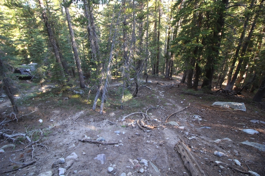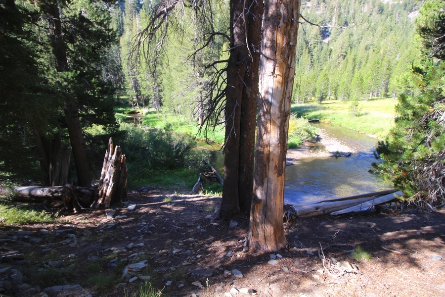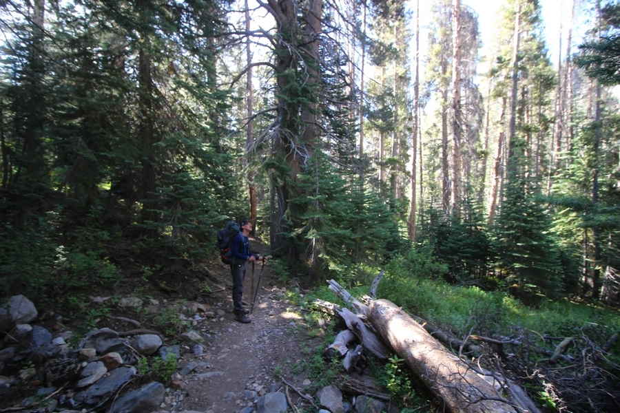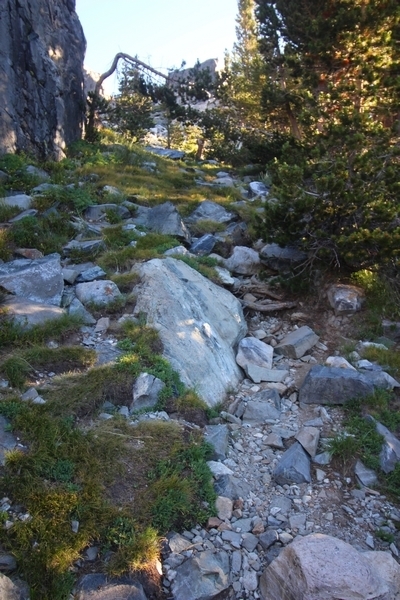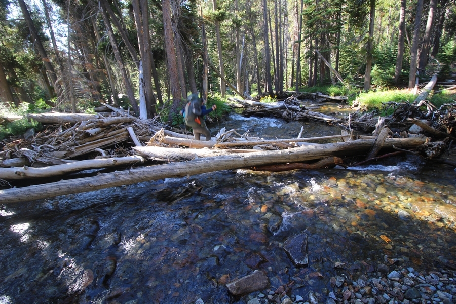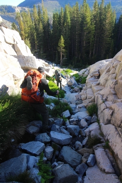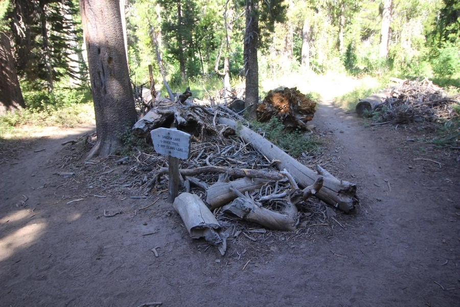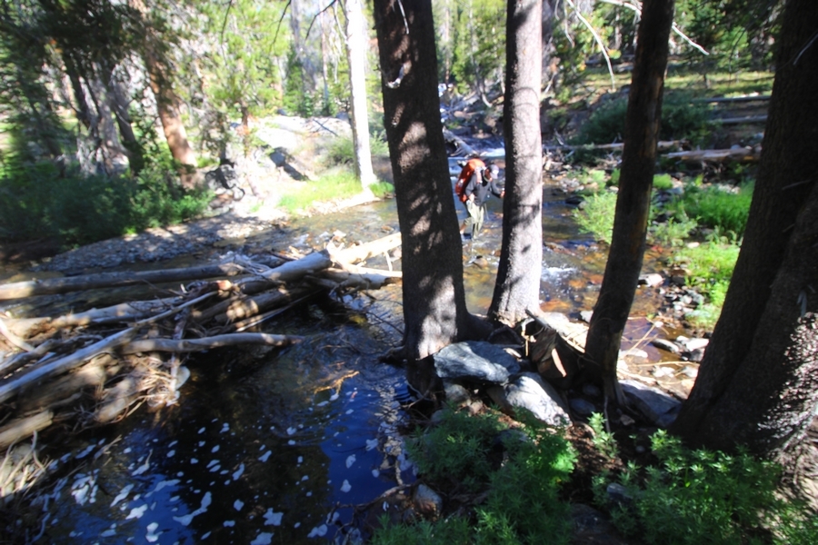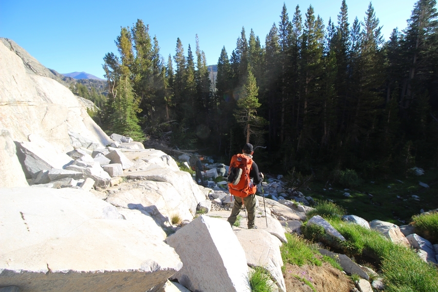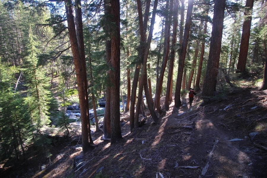 We had several different options on how to get back to the car at Agnew Meadows today, and we talked them all through the night before. We could walk the 2-1/2 miles north up to Thousand Island Lake, but the shortest trail back from there would be over 8 additional miles down the San Joaquin River. We could retrace our steps south down the JMT and back to Shadow Lake, but that route would total 7-8 miles and involve climbing over the ridge we’d descended yesterday. None of us had researched the third option, a steep trail that drops eastward from Garnet Lake’s outlet to a camping area below, from which we’d rejoin the River Trail – the cutoff looked to lose over 500′ in half a mile, but it would make the total hike out something less than 6-1/2 miles with virtually no gain except the easy grade back up to Agnew Meadows from the river. In the end, we opted to save sore knees by minimizing distance and chose Door Number 3, the steep cutoff. The morning was gorgeous, a little colder here at 9,800′ but wonderfully clear – a light breeze rippled the lake surface and marred Banner Peak’s reflection, but it looked like it would be a beautiful day. We got ready much earlier than the day before and left camp at 7:30am, first walking along the lakeshore until reaching the steep use trail leading back uphill to the JMT – once there, we followed the trail about 1/4-mile east to the log bridge, crossing to where we’d seen a narrow trail leading eastward yesterday. This trail led through some rocks and over a couple of large slabs before dropping into a tight, shallow gully – this ravine emptied like the top of a roller coaster into a steep chute filled with small boulders and filled at its top with a snow field. We made our way over/around the snow without much drama, and the two-hundred-yard rock hop down the chute was not too difficult – very little in the way of loose rocks. At the bottom of the chute, we found a ramp system leading down to a worn trail heading into the trees, all of this following the general route we had expected. Once into the trees, the trail forked, the left path leading out to a point overlooking the cascades tumbling down the face of the mountain – we couldn’t see the path continuing below, so we headed back to the fork and went right, following this trail through some dense but pretty forest and then more steeply down the hillside. Again, we seemed to be moving in the right direction, even passing a “No Fires” sign that should signify an official trail, but we had expected to stay closer to the cascades on the way down. After about 30 minutes, Chris reached a stream which he took to be Garnet Lake’s creek, and, following it downstream, he caught up with Carter in another quarter mile. We waited here for Pedro to catch up, did a health check (yes, knees were sore but still functional), and continued tracing our way downstream. We passed several tent sites on the opposite bank, and we quickly realized we were walking along the west bank of the San Joaquin River, and the River Trail we were supposed to be on was on the other side – somehow, we had missed a turn. We started looking for a crossing, but the river was moving fast in this area through a series of narrow gorges. So, we ended up walking another half-mile on the faint use trail, scrambling over various obstacles along the way, until reaching a wider area of the canyon where our path seemed to lead further away from the river – here, Carter took off eastward into the forest, determined to find a crossing. We had brought a pair of small, ultralight walkie-talkies, which had so far seen limited usefulness in the forest and mountains, but Carter had left before Chris could remind him to take one. We waited a few minutes before heading down the trail another 200 yards, figuring Carter would be doing the same along the river. Sure enough, we soon heard Carter hollering from the bottom of a draw below us, so we bushwhacked our own route eastward, eventually finding Carter proudly waving us toward a jumble of logs that bridged the river from bank to bank. Carter made his way across without incident, but Chris had more of an adventurous time, slipping and dunking a boot but at least not falling in completely. Watching all this, Pedro quickly traded his boots for water shoes, and he comfortably waded across the calf-deep water. It took us about 15 minutes to bushwhack up the slope on the other side, eventually finding the River Trail about 100 yards uphill from our crossing. Chris waited for Pedro to put his boots back on while Carter took off again, this time taking a radio with him. We quickly got strung out again along the trail, but the walking was easy and we each chose our own pace. After about a mile and a half, Carter called Chris’ radio saying he was at the Shadow Creek trail junction, but that he was moving on since he didn’t want his knee to cool down and lock up – he said he’d left a message in the dirt in case the radio didn’t work. Chris got to the junction about 10 minutes later and decided to wait there for Pedro, looking for Carter’s message which he assumed was scrawled into the dusty trail – what he found instead was sticks arranged with the message, which Chris had walked right past not even noticing moments before. Pedro showed up in another ten minutes, and we proceeded to walk together through familiar ground, past Olaine Lake, and up the long incline to the meadow plateau. Here, Chris picked up his pace a bit, knowing the trail was nearly level over this last mile. Carter called on the radio again saying he’d made it to the car (he’d taken the car keys with him when we got to the River Trail), and Chris again was about 10 minutes behind him when he arrived back at the trailhead. Pedro’s knee, like Carter’s, had held up long enough for him to amble in another 10 minutes after Chris – we cleaned up a bit and put on some fresh clothes before dri