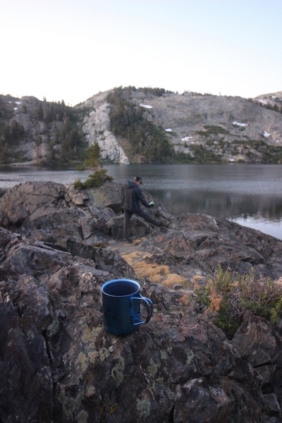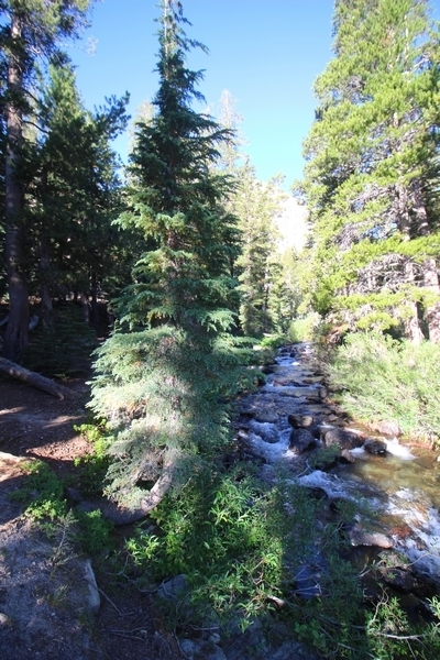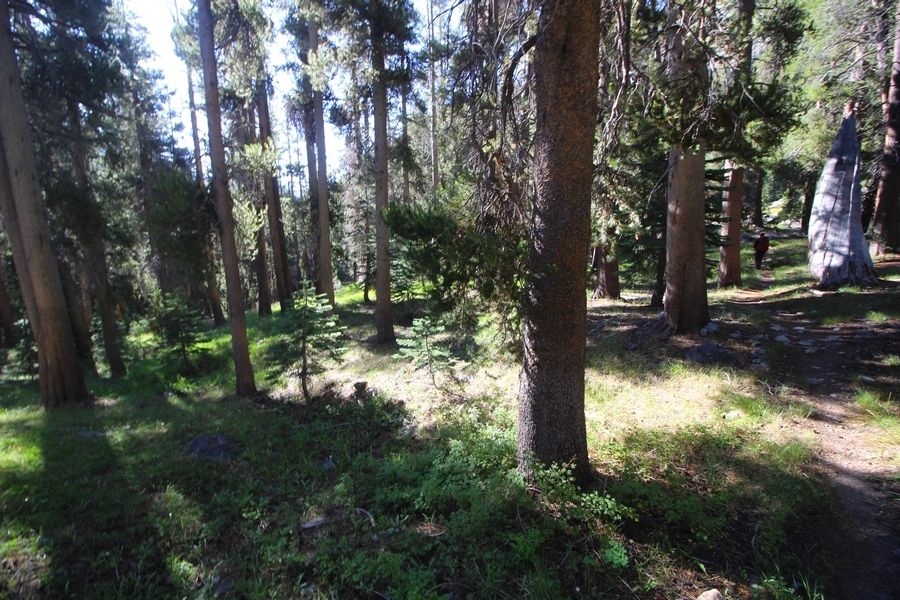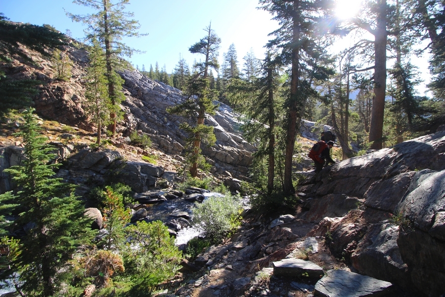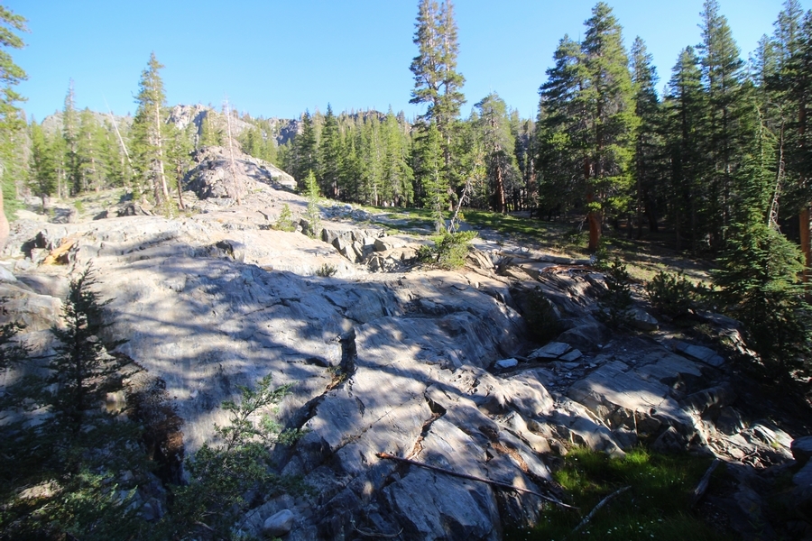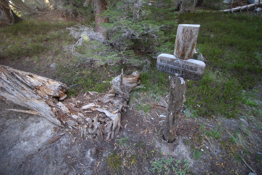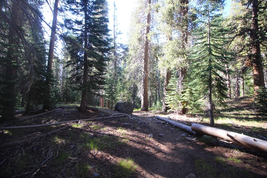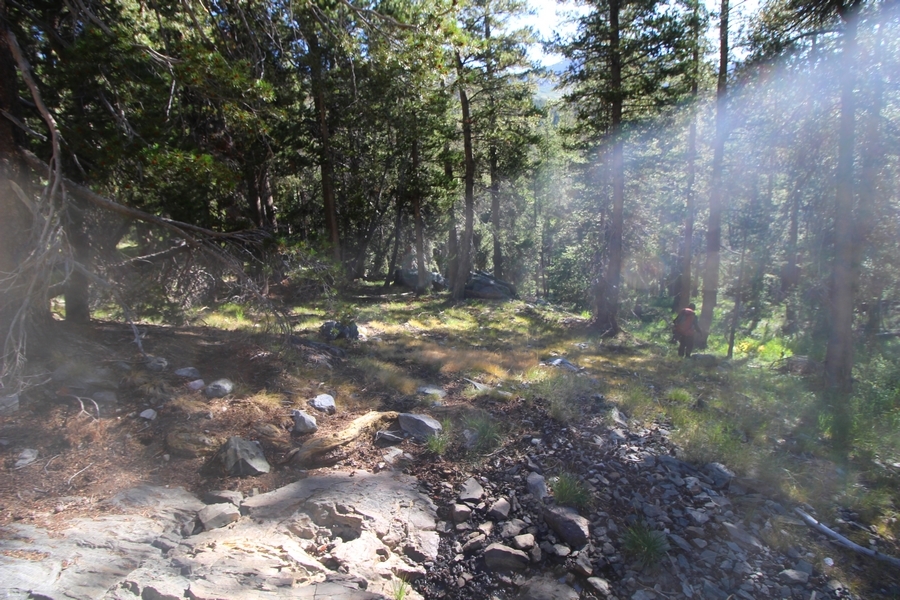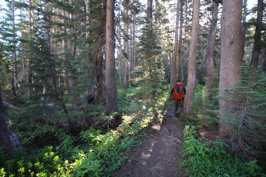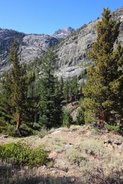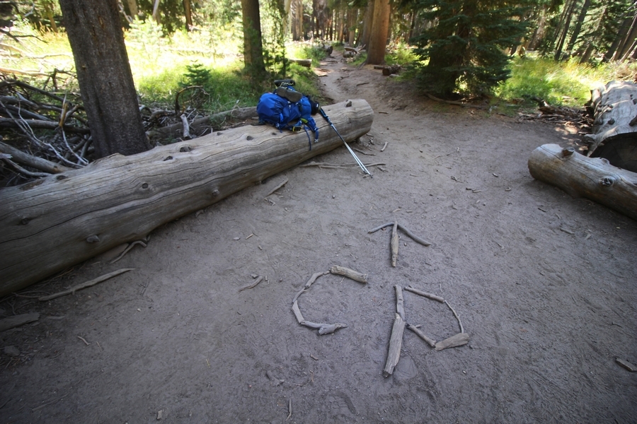 We had several different options on how to get back to the car at Agnew Meadows today, and we talked them all through the night before. We could walk the 2-1/2 miles north up to Thousand Island Lake, but the shortest trail back from there would be over 8 additional miles down the San Joaquin River. We could retrace our steps south down the JMT and back to Shadow Lake, but that route would total 7-8 miles and involve climbing over the ridge we’d descended yesterday. None of us had researched the third option, a steep trail that drops eastward from Garnet Lake’s outlet to a camping area below, from which we’d rejoin the River Trail – the cutoff looked to lose over 500′ in half a mile, but it would make the total hike out something less than 6-1/2 miles with virtually no gain except the easy grade back up to Agnew Meadows from the river. In the end, we opted to save sore knees by minimizing distance and chose Door Number 3, the steep cutoff. The morning was gorgeous, a little colder here at 9,800′ but wonderfully clear – a light breeze rippled the lake surface and marred Banner Peak’s reflection, but it looked like it would be a beautiful day. We got ready much earlier than the day before and left camp at 7:30am, first walking along the lakeshore until reaching the steep use trail leading back uphill to the JMT – once there, we followed the trail about 1/4-mile east to the log bridge, crossing to where we’d seen a narrow trail leading eastward yesterday. This trail led through some rocks and over a couple of large slabs before dropping into a tight, shallow gully – this ravine emptied like the top of a roller coaster into a steep chute filled with small boulders and filled at its top with a snow field. We made our way over/around the snow without much drama, and the two-hundred-yard rock hop down the chute was not too difficult – very little in the way of loose rocks. At the bottom of the chute, we found a ramp system leading down to a worn trail heading into the trees, all of this following the general route we had expected. Once into the trees, the trail forked, the left path leading out to a point overlooking the cascades tumbling down the face of the mountain – we couldn’t see the path continuing below, so we headed back to the fork and went right, following this trail through some dense but pretty forest and then more steeply down the hillside. Again, we seemed to be moving in the right direction, even passing a “No Fires” sign that should signify an official trail, but we had expected to stay closer to the cascades on the way down. After about 30 minutes, Chris reached a stream which he took to be Garnet Lake’s creek, and, following it downstream, he caught up with Carter in another quarter mile. We waited here for Pedro to catch up, did a health check (yes, knees were sore but still functional), and continued tracing our way downstream. We passed several tent sites on the opposite bank, and we quickly realized we were walking along the west bank of the San Joaquin River, and the River Trail we were supposed to be on was on the other side – somehow, we had missed a turn. We started looking for a crossing, but the river was moving fast in this area through a series of narrow gorges. So, we ended up walking another half-mile on the faint use trail, scrambling over various obstacles along the way, until reaching a wider area of the canyon where our path seemed to lead further away from the river – here, Carter took off eastward into the forest, determined to find a crossing. We had brought a pair of small, ultralight walkie-talkies, which had so far seen limited usefulness in the forest and mountains, but Carter had left before Chris could remind him to take one. We waited a few minutes before heading down the trail another 200 yards, figuring Carter would be doing the same along the river. Sure enough, we soon heard Carter hollering from the bottom of a draw below us, so we bushwhacked our own route eastward, eventually finding Carter proudly waving us toward a jumble of logs that bridged the river from bank to bank. Carter made his way across without incident, but Chris had more of an adventurous time, slipping and dunking a boot but at least not falling in completely. Watching all this, Pedro quickly traded his boots for water shoes, and he comfortably waded across the calf-deep water. It took us about 15 minutes to bushwhack up the slope on the other side, eventually finding the River Trail about 100 yards uphill from our crossing. Chris waited for Pedro to put his boots back on while Carter took off again, this time taking a radio with him. We quickly got strung out again along the trail, but the walking was easy and we each chose our own pace. After about a mile and a half, Carter called Chris’ radio saying he was at the Shadow Creek trail junction, but that he was moving on since he didn’t want his knee to cool down and lock up – he said he’d left a message in the dirt in case the radio didn’t work. Chris got to the junction about 10 minutes later and decided to wait there for Pedro, looking for Carter’s message which he assumed was scrawled into the dusty trail – what he found instead was sticks arranged with the message, which Chris had walked right past not even noticing moments before. Pedro showed up in another ten minutes, and we proceeded to walk together through familiar ground, past Olaine Lake, and up the long incline to the meadow plateau. Here, Chris picked up his pace a bit, knowing the trail was nearly level over this last mile. Carter called on the radio again saying he’d made it to the car (he’d taken the car keys with him when we got to the River Trail), and Chris again was about 10 minutes behind him when he arrived back at the trailhead. Pedro’s knee, like Carter’s, had held up long enough for him to amble in another 10 minutes after Chris – we cleaned up a bit and put on some fresh clothes before dri