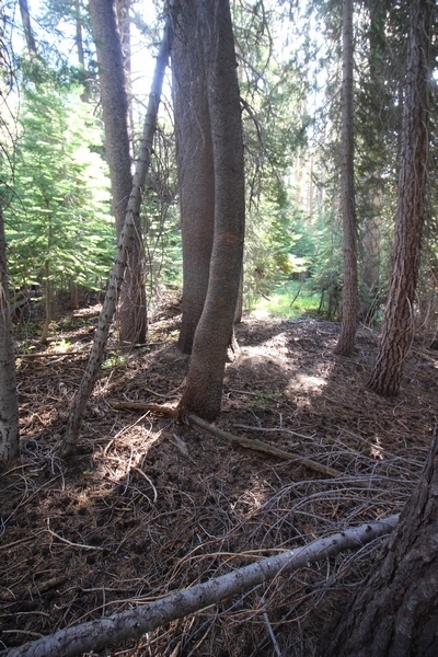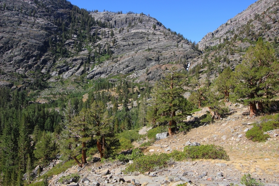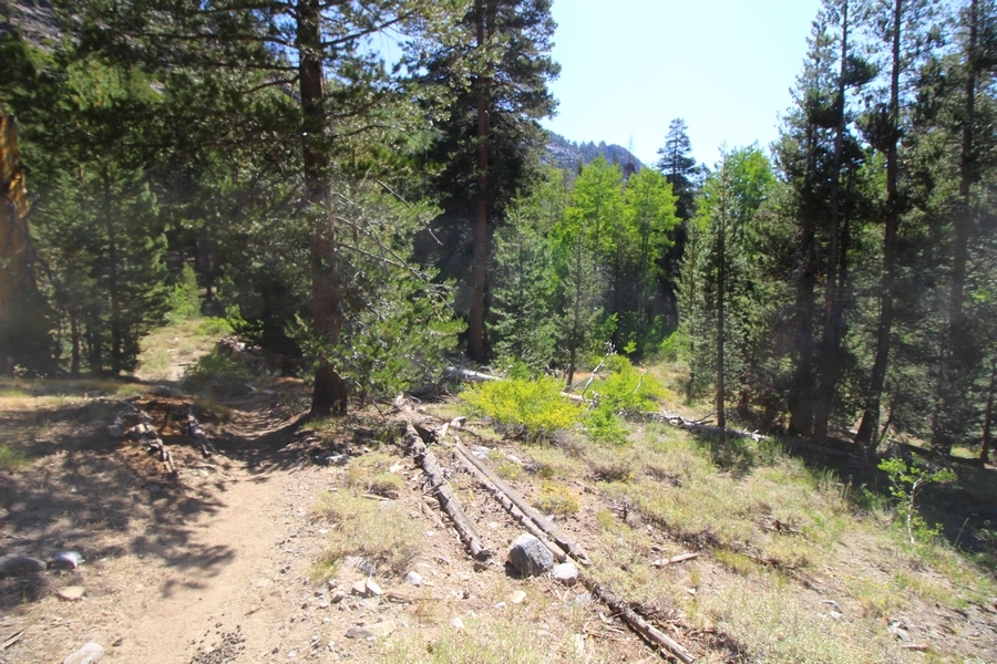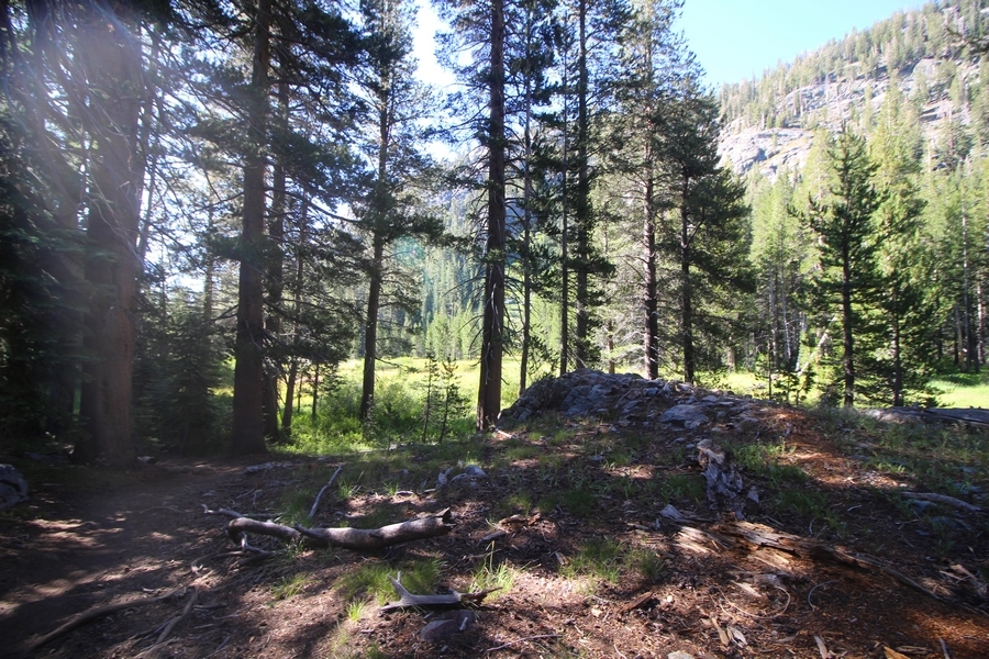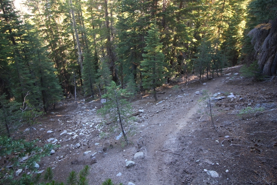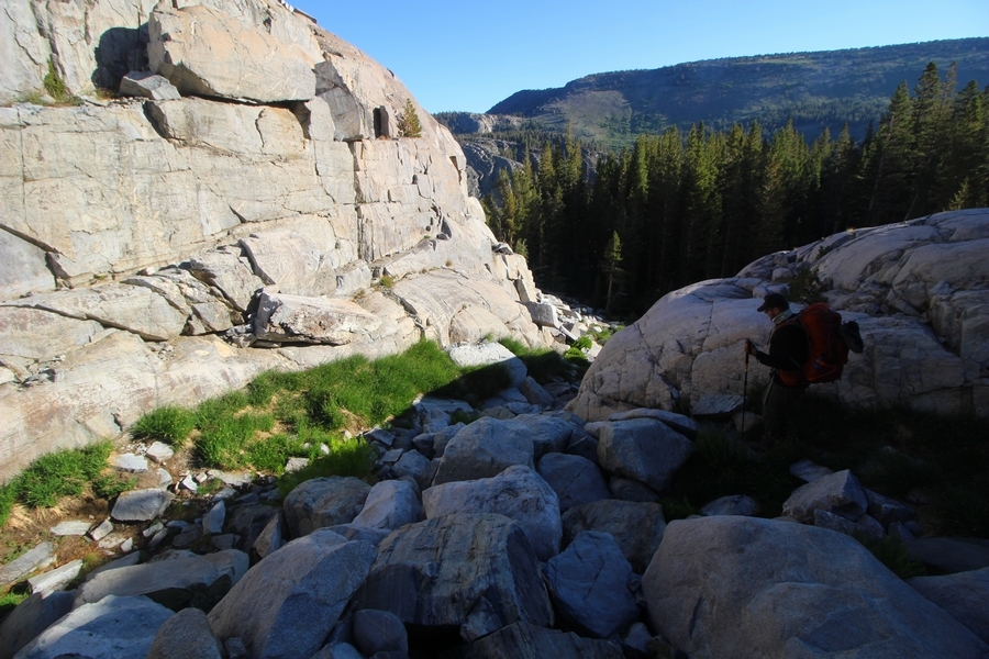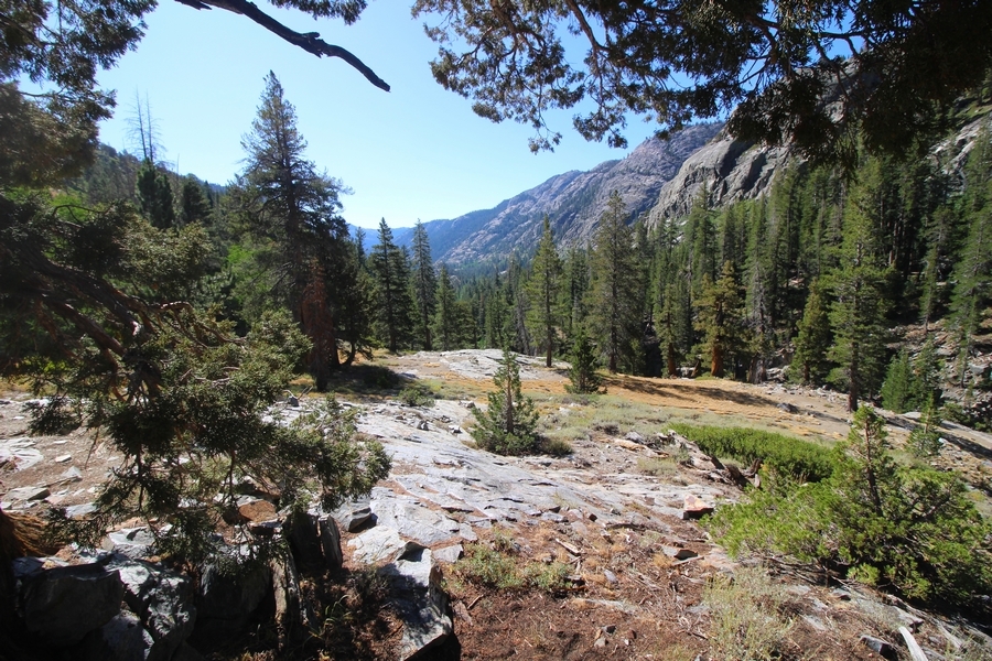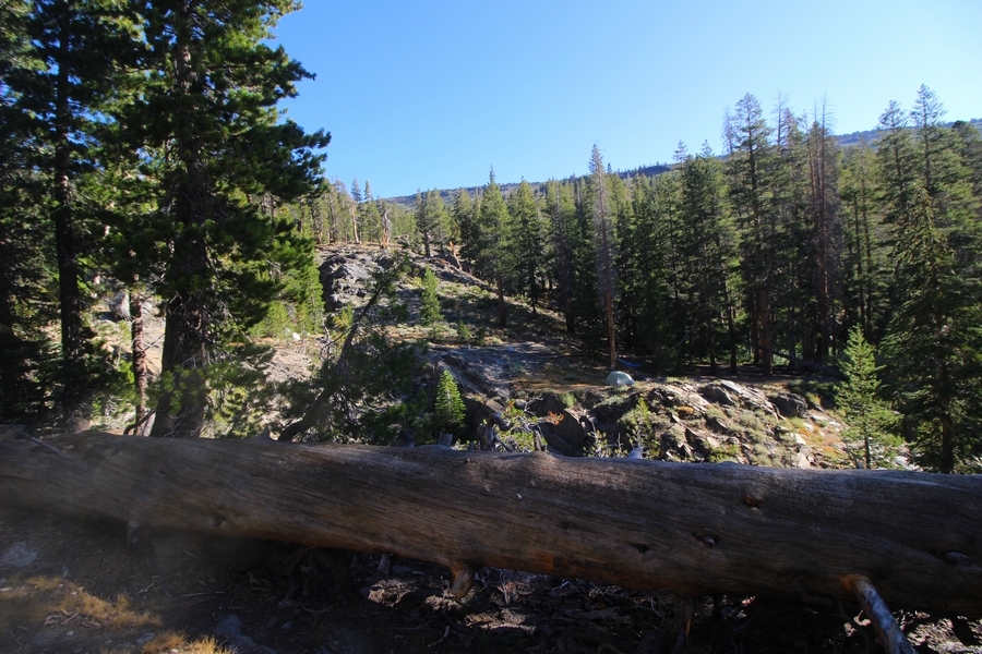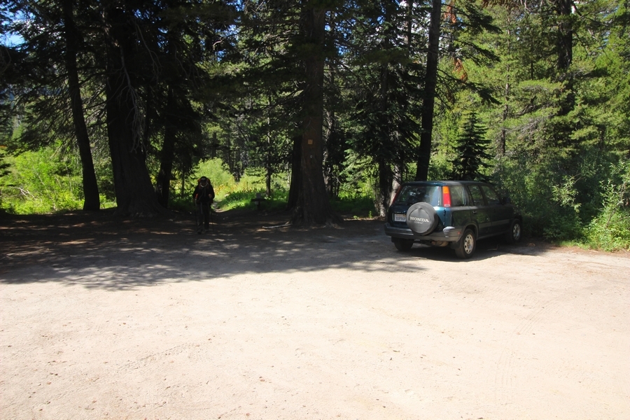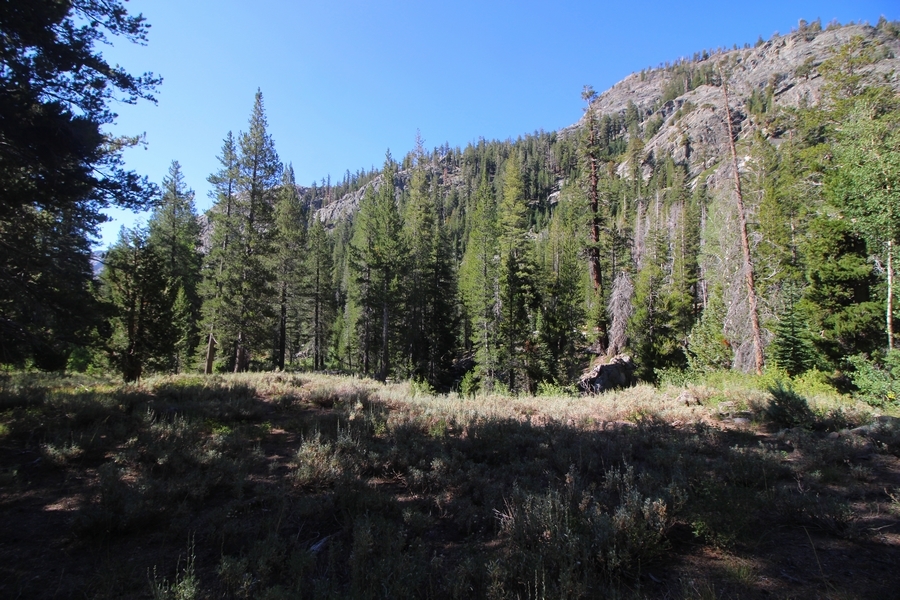 We had several different options on how to get back to the car at Agnew Meadows today, and we talked them all through the night before. We could walk the 2-1/2 miles north up to Thousand Island Lake, but the shortest trail back from there would be over 8 additional miles down the San Joaquin River. We could retrace our steps south down the JMT and back to Shadow Lake, but that route would total 7-8 miles and involve climbing over the ridge we’d descended yesterday. None of us had researched the third option, a steep trail that drops eastward from Garnet Lake’s outlet to a camping area below, from which we’d rejoin the River Trail – the cutoff looked to lose over 500′ in half a mile, but it would make the total hike out something less than 6-1/2 miles with virtually no gain except the easy grade back up to Agnew Meadows from the river. In the end, we opted to save sore knees by minimizing distance and chose Door Number 3, the steep cutoff. The morning was gorgeous, a little colder here at 9,800′ but wonderfully clear – a light breeze rippled the lake surface and marred Banner Peak’s reflection, but it looked like it would be a beautiful day. We got ready much earlier than the day before and left camp at 7:30am, first walking along the lakeshore until reaching the steep use trail leading back uphill to the JMT – once there, we followed the trail about 1/4-mile east to the log bridge, crossing to where we’d seen a narrow trail leading eastward yesterday. This trail led through some rocks and over a couple of large slabs before dropping into a tight, shallow gully – this ravine emptied like the top of a roller coaster into a steep chute filled with small boulders and filled at its top with a snow field. We made our way over/around the snow without much drama, and the two-hundred-yard rock hop down the chute was not too difficult – very little in the way of loose rocks. At the bottom of the chute, we found a ramp system leading down to a worn trail heading into the trees, all of this following the general route we had expected. Once into the trees, the trail forked, the left path leading out to a point overlooking the cascades tumbling down the face of the mountain – we couldn’t see the path continuing below, so we headed back to the fork and went right, following this trail through some dense but pretty forest and then more steeply down the hillside. Again, we seemed to be moving in the right direction, even passing a “No Fires” sign that should signify an official trail, but we had expected to stay closer to the cascades on the way down. After about 30 minutes, Chris reached a stream which he took to be Garnet Lake’s creek, and, following it downstream, he caught up with Carter in another quarter mile. We waited here for Pedro to catch up, did a health check (yes, knees were sore but still functional), and continued tracing our way downstream. We passed several tent sites on the opposite bank, and we quickly realized we were walking along the west bank of the San Joaquin River, and the River Trail we were supposed to be on was on the other side – somehow, we had missed a turn. We started looking for a crossing, but the river was moving fast in this area through a series of narrow gorges. So, we ended up walking another half-mile on the faint use trail, scrambling over various obstacles along the way, until reaching a wider area of the canyon where our path seemed to lead further away from the river – here, Carter took off eastward into the forest, determined to find a crossing. We had brought a pair of small, ultralight walkie-talkies, which had so far seen limited usefulness in the forest and mountains, but Carter had left before Chris could remind him to take one. We waited a few minutes before heading down the trail another 200 yards, figuring Carter would be doing the same along the river. Sure enough, we soon heard Carter hollering from the bottom of a draw below us, so we bushwhacked our own route eastward, eventually finding Carter proudly waving us toward a jumble of logs that bridged the river from bank to bank. Carter made his way across without incident, but Chris had more of an adventurous time, slipping and dunking a boot but at least not falling in completely. Watching all this, Pedro quickly traded his boots for water shoes, and he comfortably waded across the calf-deep water. It took us about 15 minutes to bushwhack up the slope on the other side, eventually finding the River Trail about 100 yards uphill from our crossing. Chris waited for Pedro to put his boots back on while Carter took off again, this time taking a radio with him. We quickly got strung out again along the trail, but the walking was easy and we each chose our own pace. After about a mile and a half, Carter called Chris’ radio saying he was at the Shadow Creek trail junction, but that he was moving on since he didn’t want his knee to cool down and lock up – he said he’d left a message in the dirt in case the radio didn’t work. Chris got to the junction about 10 minutes later and decided to wait there for Pedro, looking for Carter’s message which he assumed was scrawled into the dusty trail – what he found instead was sticks arranged with the message, which Chris had walked right past not even noticing moments before. Pedro showed up in another ten minutes, and we proceeded to walk together through familiar ground, past Olaine Lake, and up the long incline to the meadow plateau. Here, Chris picked up his pace a bit, knowing the trail was nearly level over this last mile. Carter called on the radio again saying he’d made it to the car (he’d taken the car keys with him when we got to the River Trail), and Chris again was about 10 minutes behind him when he arrived back at the trailhead. Pedro’s knee, like Carter’s, had held up long enough for him to amble in another 10 minutes after Chris – we cleaned up a bit and put on some fresh clothes before dri