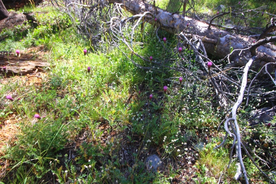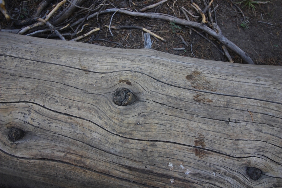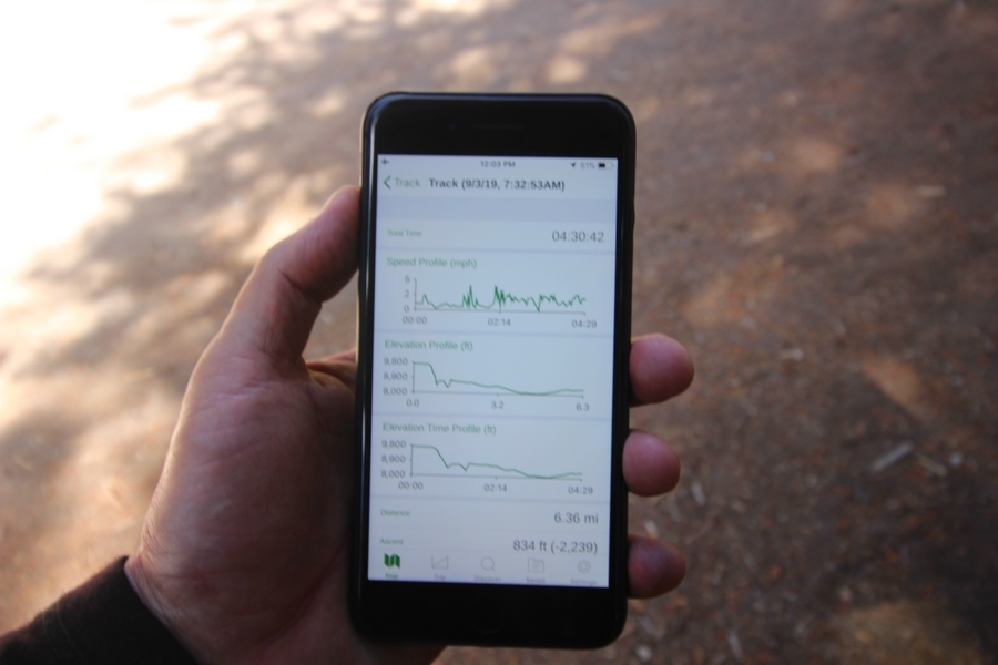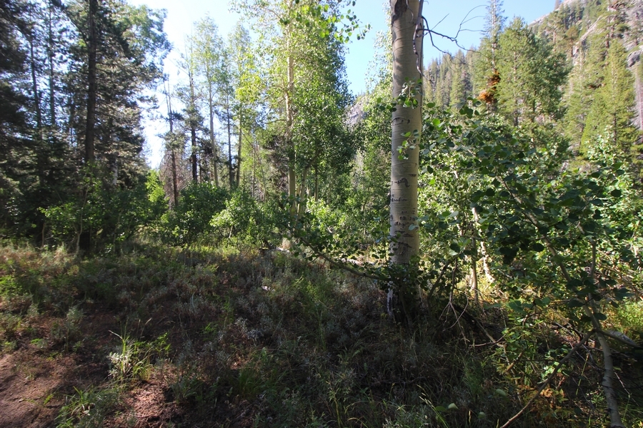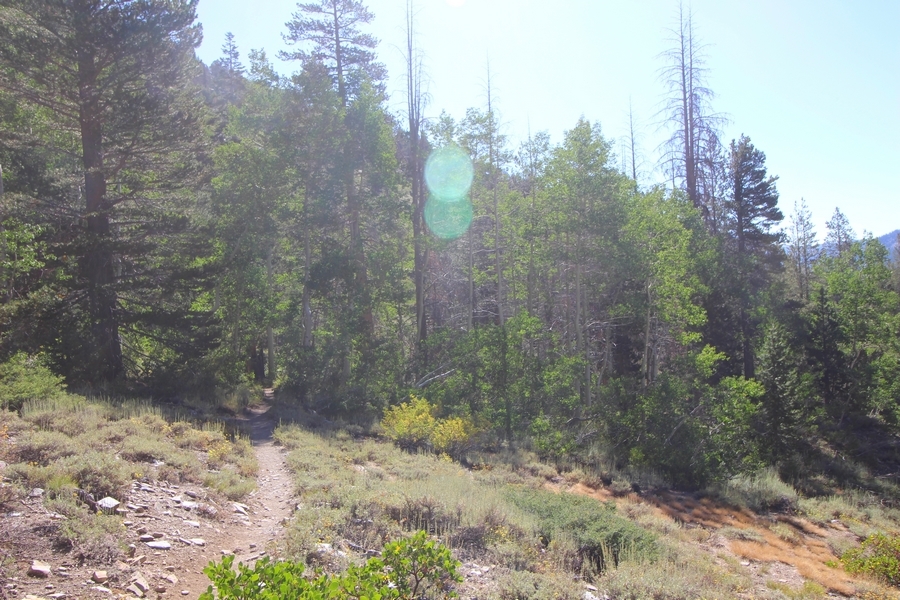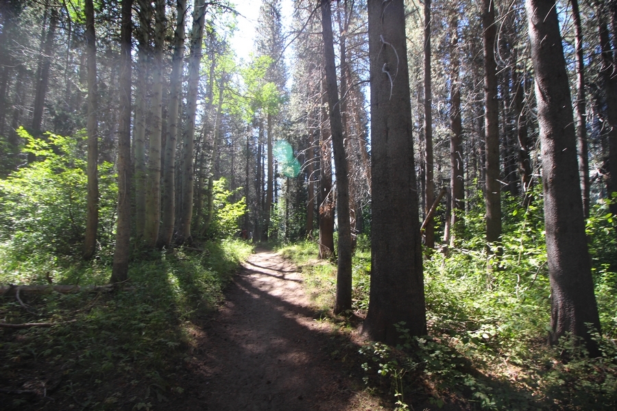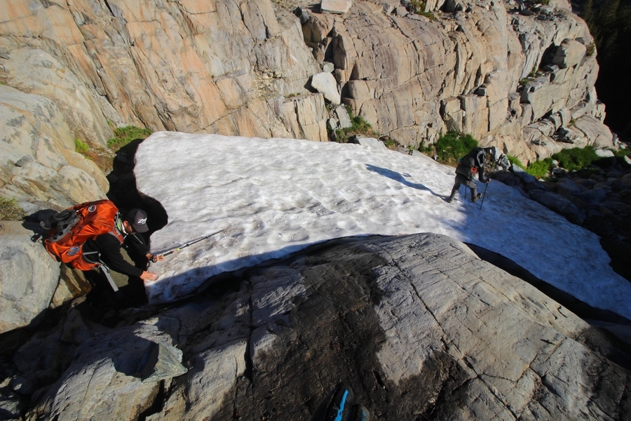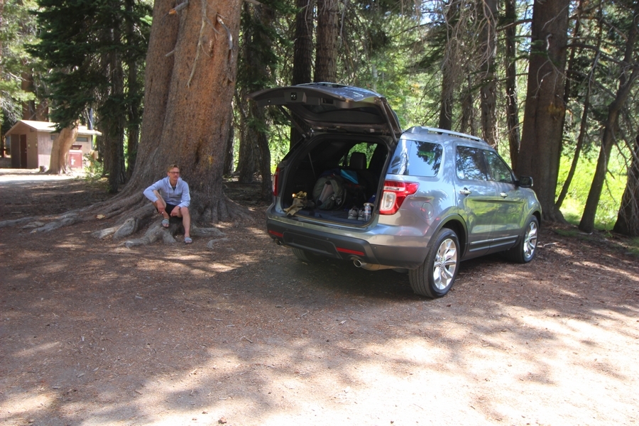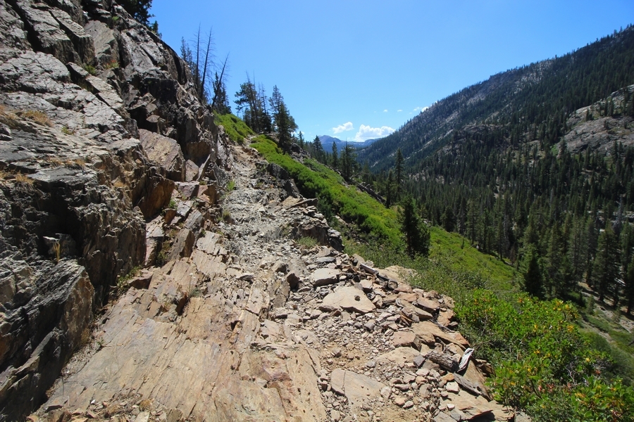 We had several different options on how to get back to the car at Agnew Meadows today, and we talked them all through the night before. We could walk the 2-1/2 miles north up to Thousand Island Lake, but the shortest trail back from there would be over 8 additional miles down the San Joaquin River. We could retrace our steps south down the JMT and back to Shadow Lake, but that route would total 7-8 miles and involve climbing over the ridge we’d descended yesterday. None of us had researched the third option, a steep trail that drops eastward from Garnet Lake’s outlet to a camping area below, from which we’d rejoin the River Trail – the cutoff looked to lose over 500′ in half a mile, but it would make the total hike out something less than 6-1/2 miles with virtually no gain except the easy grade back up to Agnew Meadows from the river. In the end, we opted to save sore knees by minimizing distance and chose Door Number 3, the steep cutoff. The morning was gorgeous, a little colder here at 9,800′ but wonderfully clear – a light breeze rippled the lake surface and marred Banner Peak’s reflection, but it looked like it would be a beautiful day. We got ready much earlier than the day before and left camp at 7:30am, first walking along the lakeshore until reaching the steep use trail leading back uphill to the JMT – once there, we followed the trail about 1/4-mile east to the log bridge, crossing to where we’d seen a narrow trail leading eastward yesterday. This trail led through some rocks and over a couple of large slabs before dropping into a tight, shallow gully – this ravine emptied like the top of a roller coaster into a steep chute filled with small boulders and filled at its top with a snow field. We made our way over/around the snow without much drama, and the two-hundred-yard rock hop down the chute was not too difficult – very little in the way of loose rocks. At the bottom of the chute, we found a ramp system leading down to a worn trail heading into the trees, all of this following the general route we had expected. Once into the trees, the trail forked, the left path leading out to a point overlooking the cascades tumbling down the face of the mountain – we couldn’t see the path continuing below, so we headed back to the fork and went right, following this trail through some dense but pretty forest and then more steeply down the hillside. Again, we seemed to be moving in the right direction, even passing a “No Fires” sign that should signify an official trail, but we had expected to stay closer to the cascades on the way down. After about 30 minutes, Chris reached a stream which he took to be Garnet Lake’s creek, and, following it downstream, he caught up with Carter in another quarter mile. We waited here for Pedro to catch up, did a health check (yes, knees were sore but still functional), and continued tracing our way downstream. We passed several tent sites on the opposite bank, and we quickly realized we were walking along the west bank of the San Joaquin River, and the River Trail we were supposed to be on was on the other side – somehow, we had missed a turn. We started looking for a crossing, but the river was moving fast in this area through a series of narrow gorges. So, we ended up walking another half-mile on the faint use trail, scrambling over various obstacles along the way, until reaching a wider area of the canyon where our path seemed to lead further away from the river – here, Carter took off eastward into the forest, determined to find a crossing. We had brought a pair of small, ultralight walkie-talkies, which had so far seen limited usefulness in the forest and mountains, but Carter had left before Chris could remind him to take one. We waited a few minutes before heading down the trail another 200 yards, figuring Carter would be doing the same along the river. Sure enough, we soon heard Carter hollering from the bottom of a draw below us, so we bushwhacked our own route eastward, eventually finding Carter proudly waving us toward a jumble of logs that bridged the river from bank to bank. Carter made his way across without incident, but Chris had more of an adventurous time, slipping and dunking a boot but at least not falling in completely. Watching all this, Pedro quickly traded his boots for water shoes, and he comfortably waded across the calf-deep water. It took us about 15 minutes to bushwhack up the slope on the other side, eventually finding the River Trail about 100 yards uphill from our crossing. Chris waited for Pedro to put his boots back on while Carter took off again, this time taking a radio with him. We quickly got strung out again along the trail, but the walking was easy and we each chose our own pace. After about a mile and a half, Carter called Chris’ radio saying he was at the Shadow Creek trail junction, but that he was moving on since he didn’t want his knee to cool down and lock up – he said he’d left a message in the dirt in case the radio didn’t work. Chris got to the junction about 10 minutes later and decided to wait there for Pedro, looking for Carter’s message which he assumed was scrawled into the dusty trail – what he found instead was sticks arranged with the message, which Chris had walked right past not even noticing moments before. Pedro showed up in another ten minutes, and we proceeded to walk together through familiar ground, past Olaine Lake, and up the long incline to the meadow plateau. Here, Chris picked up his pace a bit, knowing the trail was nearly level over this last mile. Carter called on the radio again saying he’d made it to the car (he’d taken the car keys with him when we got to the River Trail), and Chris again was about 10 minutes behind him when he arrived back at the trailhead. Pedro’s knee, like Carter’s, had held up long enough for him to amble in another 10 minutes after Chris – we cleaned up a bit and put on some fresh clothes before dri