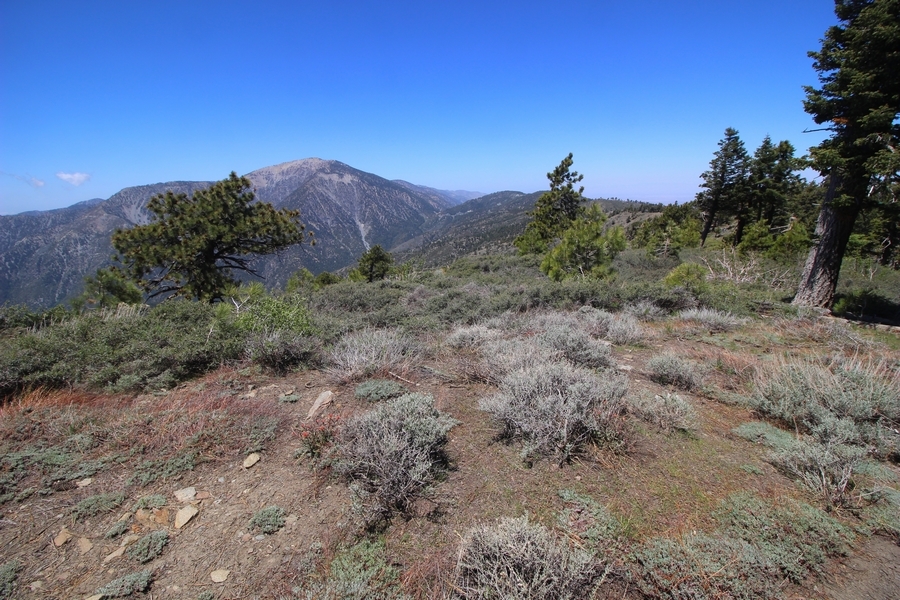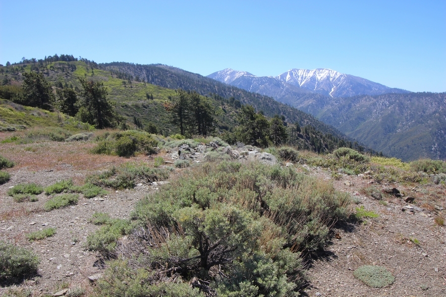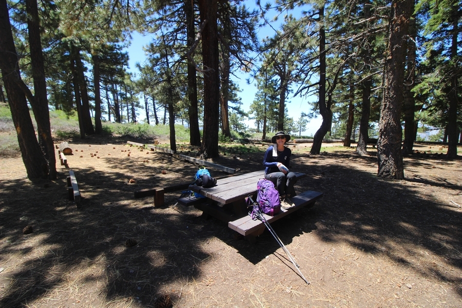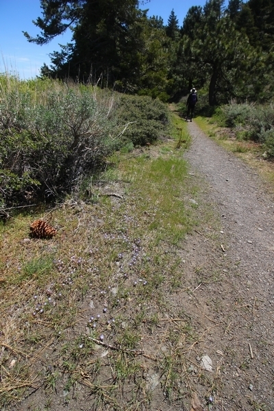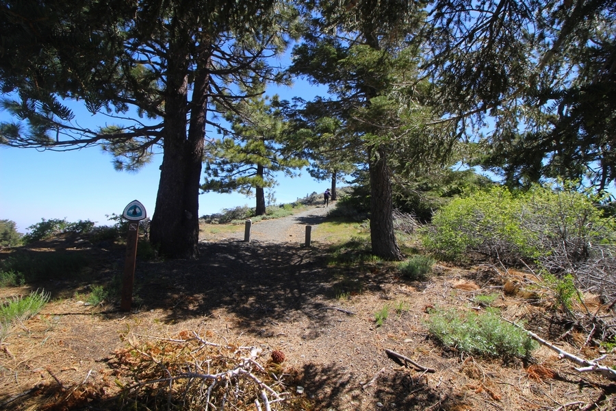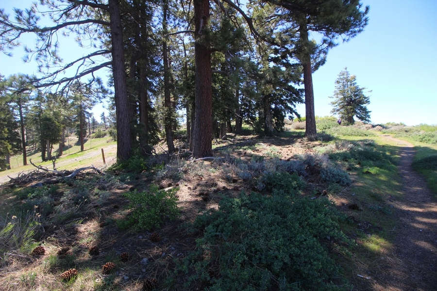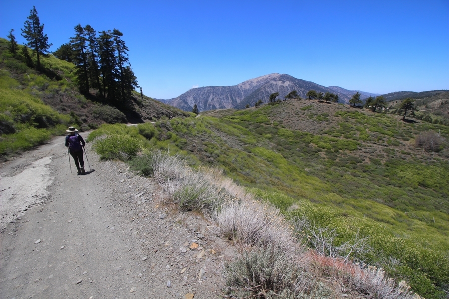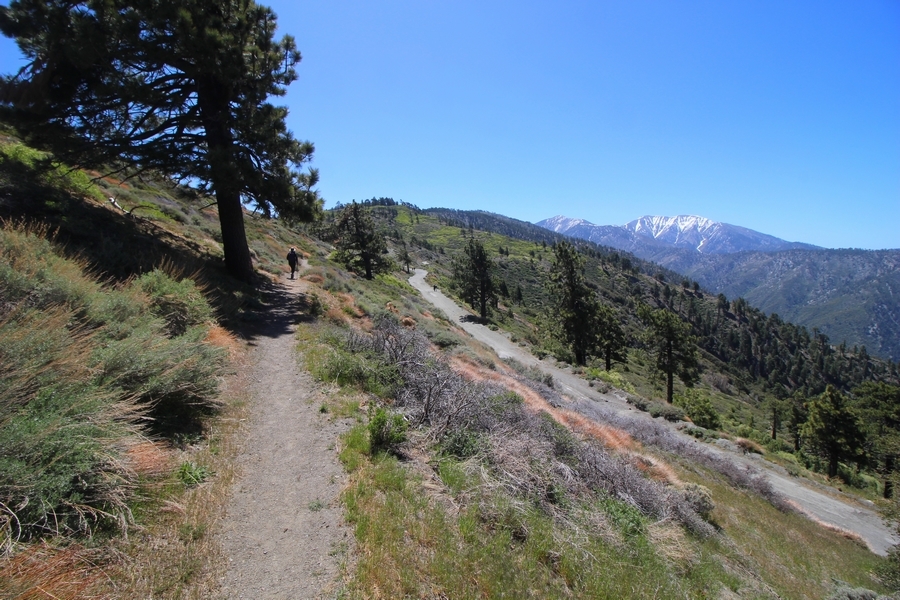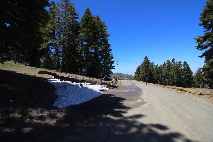 We both woke up a bit sore from our outing yesterday, but we wanted to get a hike in anyway, if for no other reason than to get stiff muscles loosened up. We settled on going up the Blue Ridge trail near Mountain High, but by the time we got to the trailhead, it was full of cars and there was a large group get organized to start up the trail. We drove up Hwy 2, hoping that the road was open down to Vincent Gap so we could walk out to the Bighorn gold mine – no such luck, as the highway was gated at Grassy Hollow. So, we turned around and parked at Inspiration Point – there were several cars in the lot servicing the PCT westbound but only a couple more parked on the east side. We quickly determined to repeat another hike from 2015, a walk up the PCT to Blue Ridge campground, a little over two miles distant with 700′ of gain. We headed out right away, first breezing through a level section for about half a mile before starting a moderate climb through a shady grove of mountain oaks, followed by an open climb that got steeper the further we went – the open part in particular would have been quite warm were it not for a cool breeze that actually had us bundled up a bit despite the sunny day. The trail leveled off for a bit as we passed along the southern boundary of Mountain High’s west resort, after which we dropped into a shallow saddle followed by a significantly steeper slog up the ridge to the top of the resort. One more short descent followed by a longer uphill pitch brought us to the high point of the day, a softly rounded knob just west of the campground at 2 miles in. Here, we started seeing more people, having had the trail mostly to ourselves on the way up – while those on the PCT had kept their distance, folks here seemed less conscientious about social distancing and most had no masks. We kept our distance from the larger knots of hikers and found an unoccupied table somewhat removed on the east edge of the camping area, where we sat for about 15 minutes and ate a couple of Lenny and Larry’s Complete Cookies – good stuff. After we recrossed the high knob on the way back, we came to the Blue Ridge road – we could see another large, slower group ahead of us uphill on the trail, so we opted to walk the road back (actually a longer option than the trail, but more consistently graded – weird for us to prefer the road, though it turned out to be pleasant and largely vacant). We followed the road westward, meandering through the ski area (where some sizable snow patches remained) before dropping down to the last and very flat half mile, ultimately reaching Inspiration Point. The return walk verified for us that some brush we had found encroaching on the road a couple of summers ago has been cut back, such that we may try and drive up some time this summer to the road’s end at Guffy campground in order to hike some other remote locations at that end of the ridge.